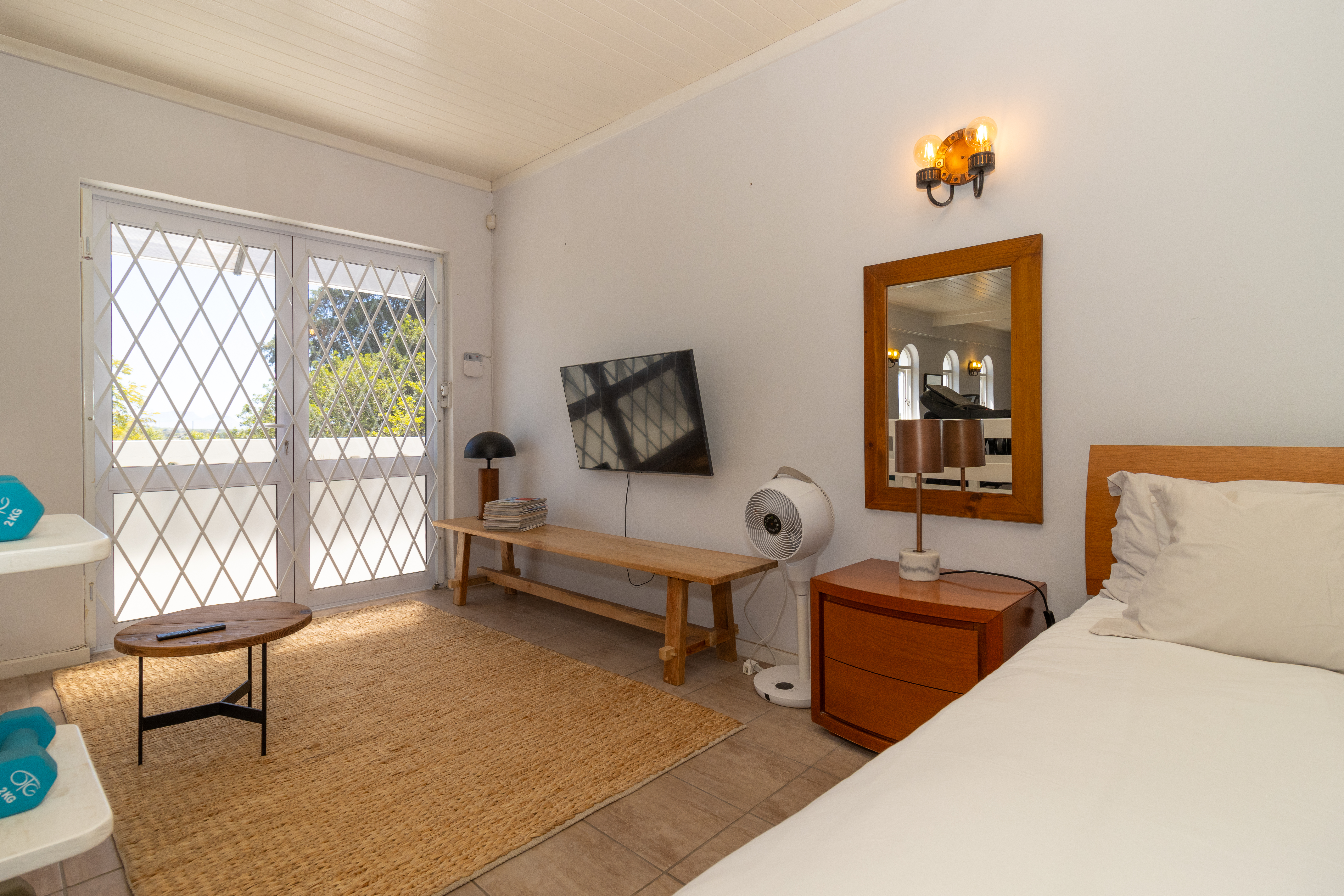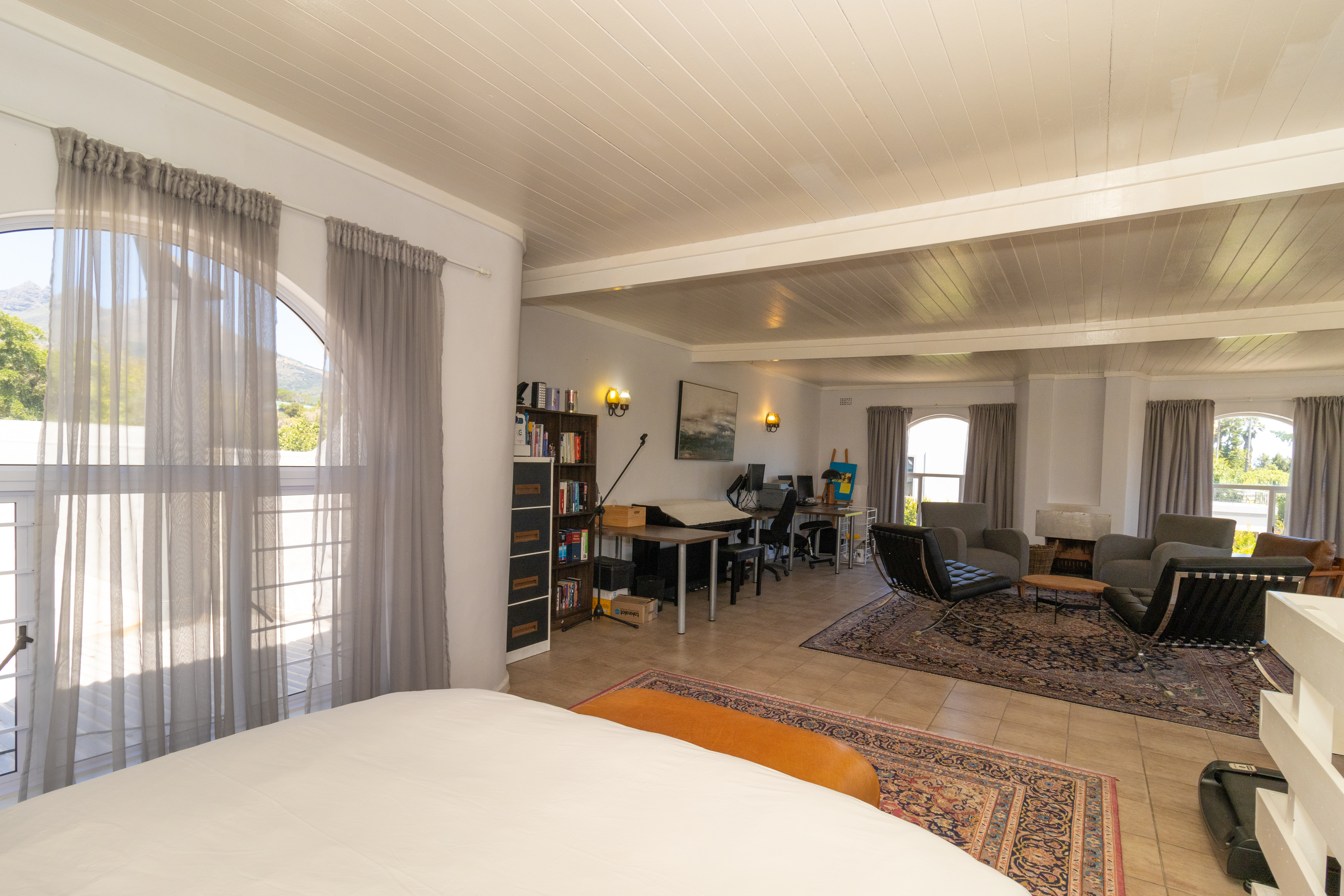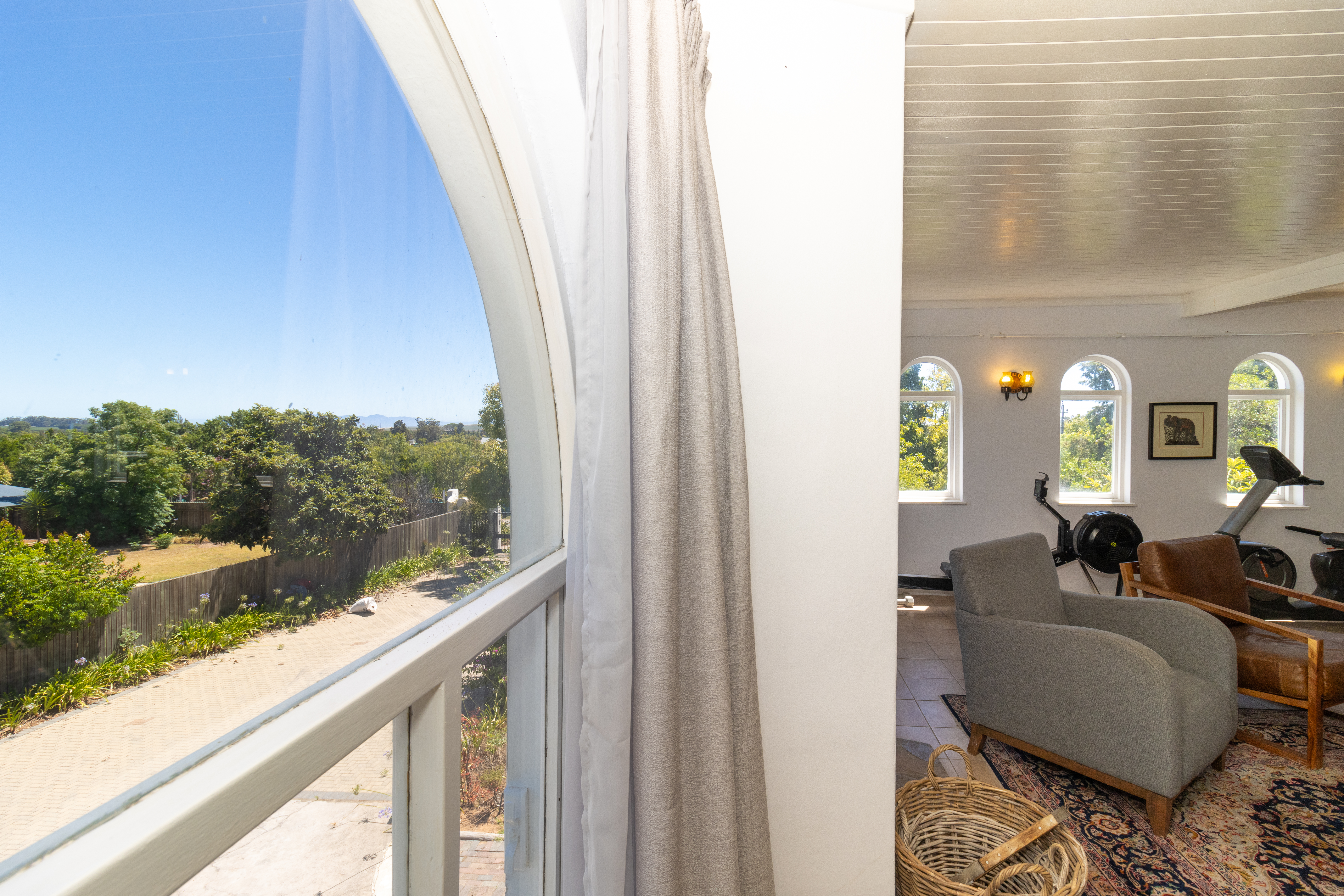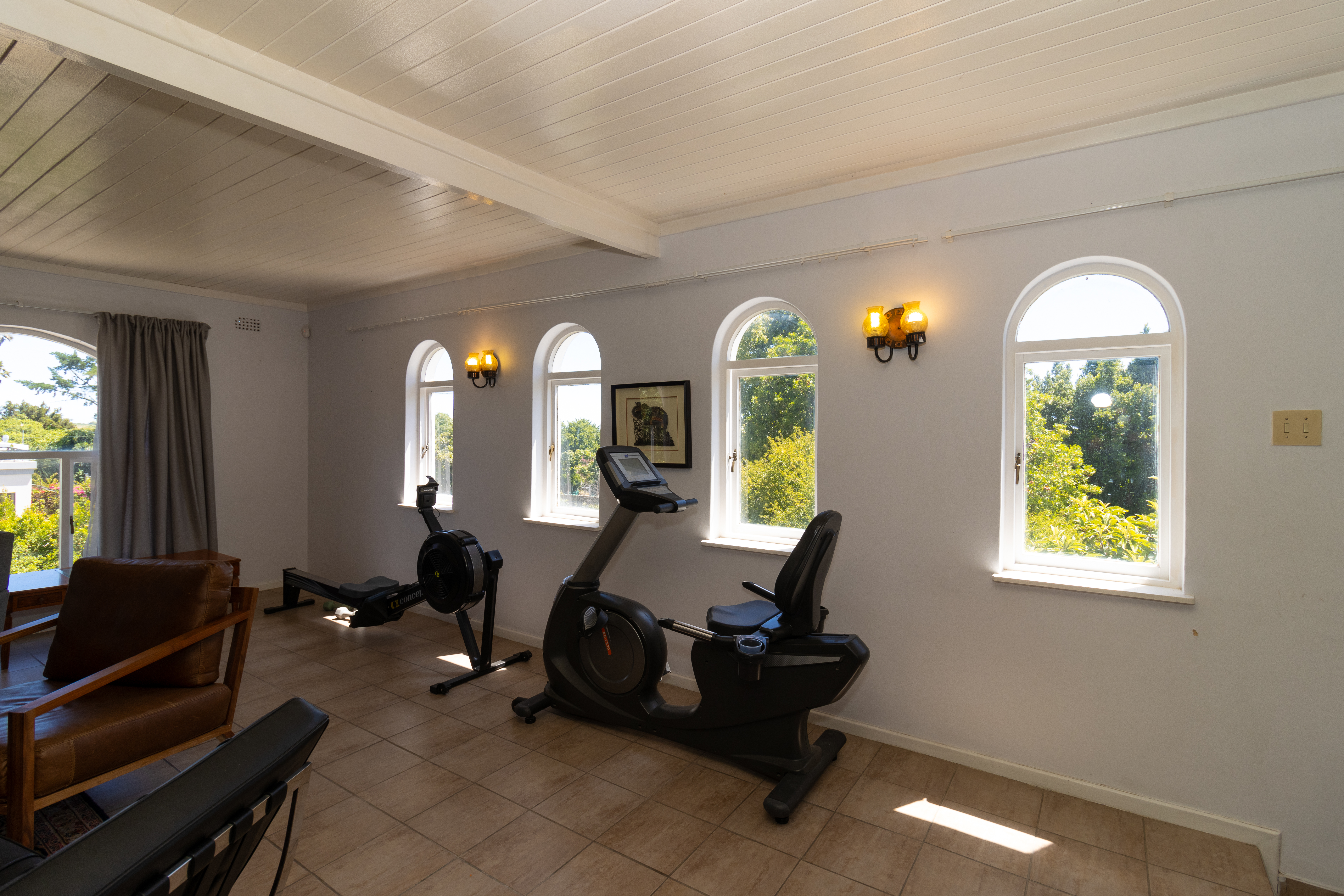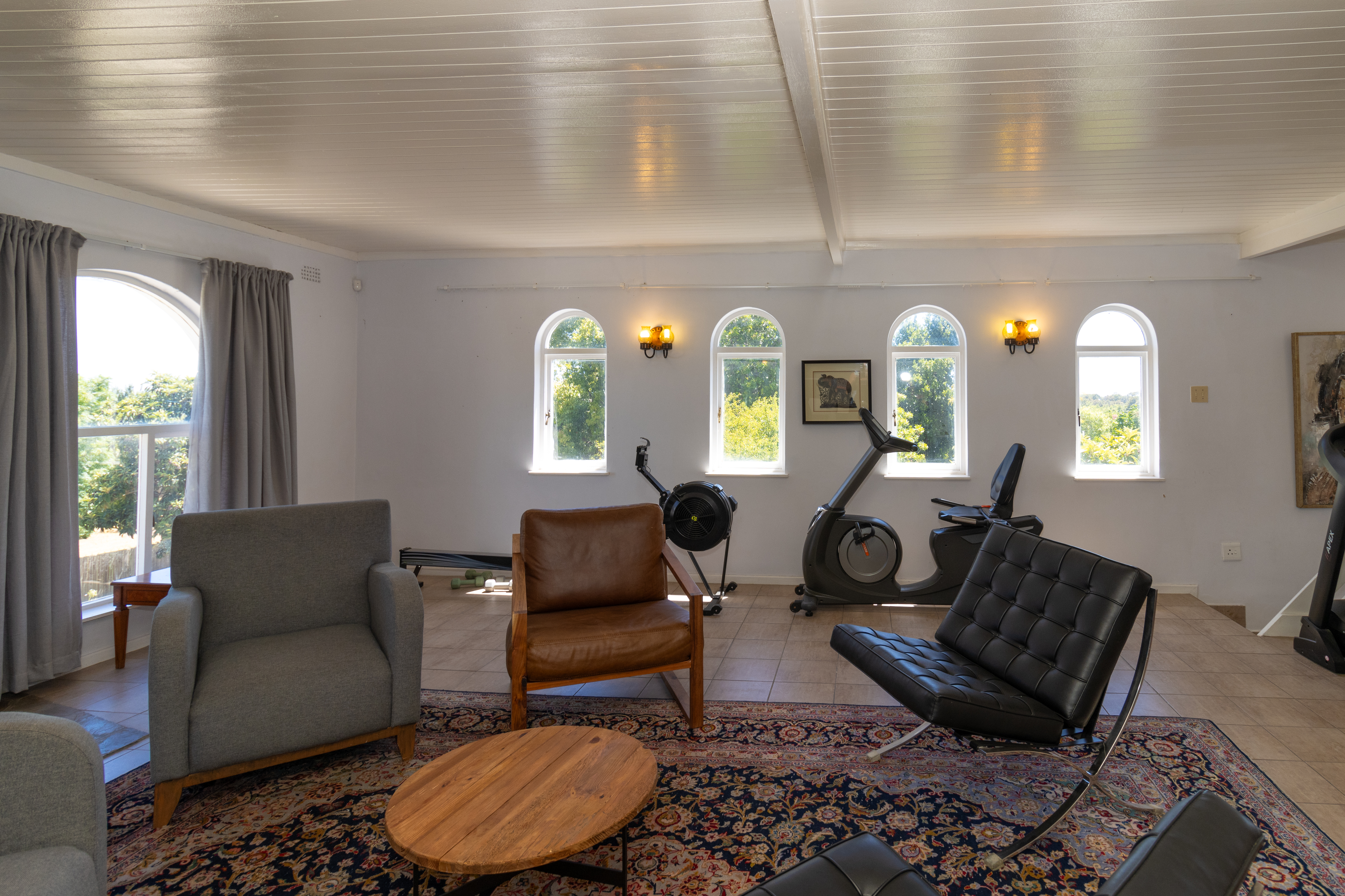Upstairs gym with a separate open-plan bedroom