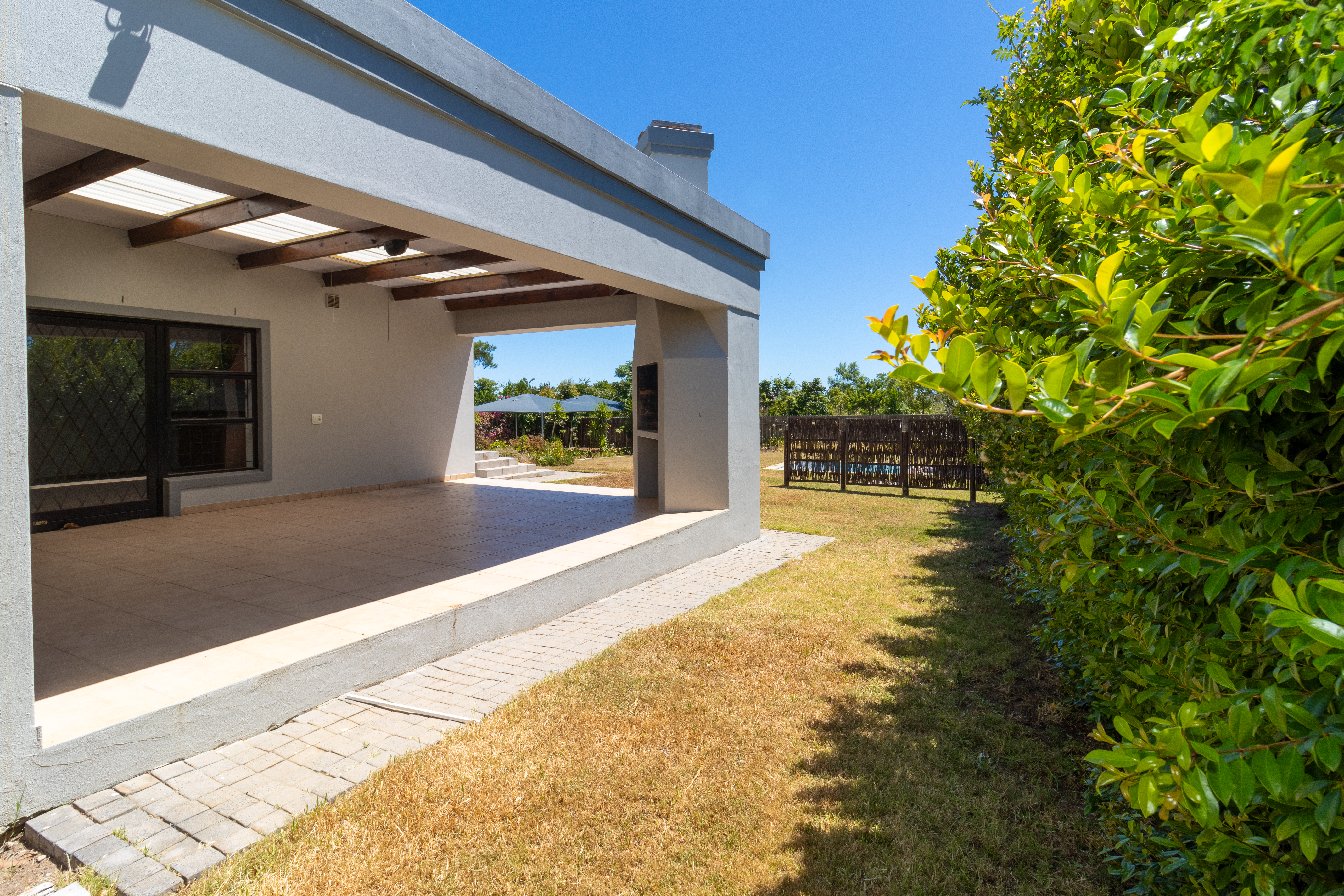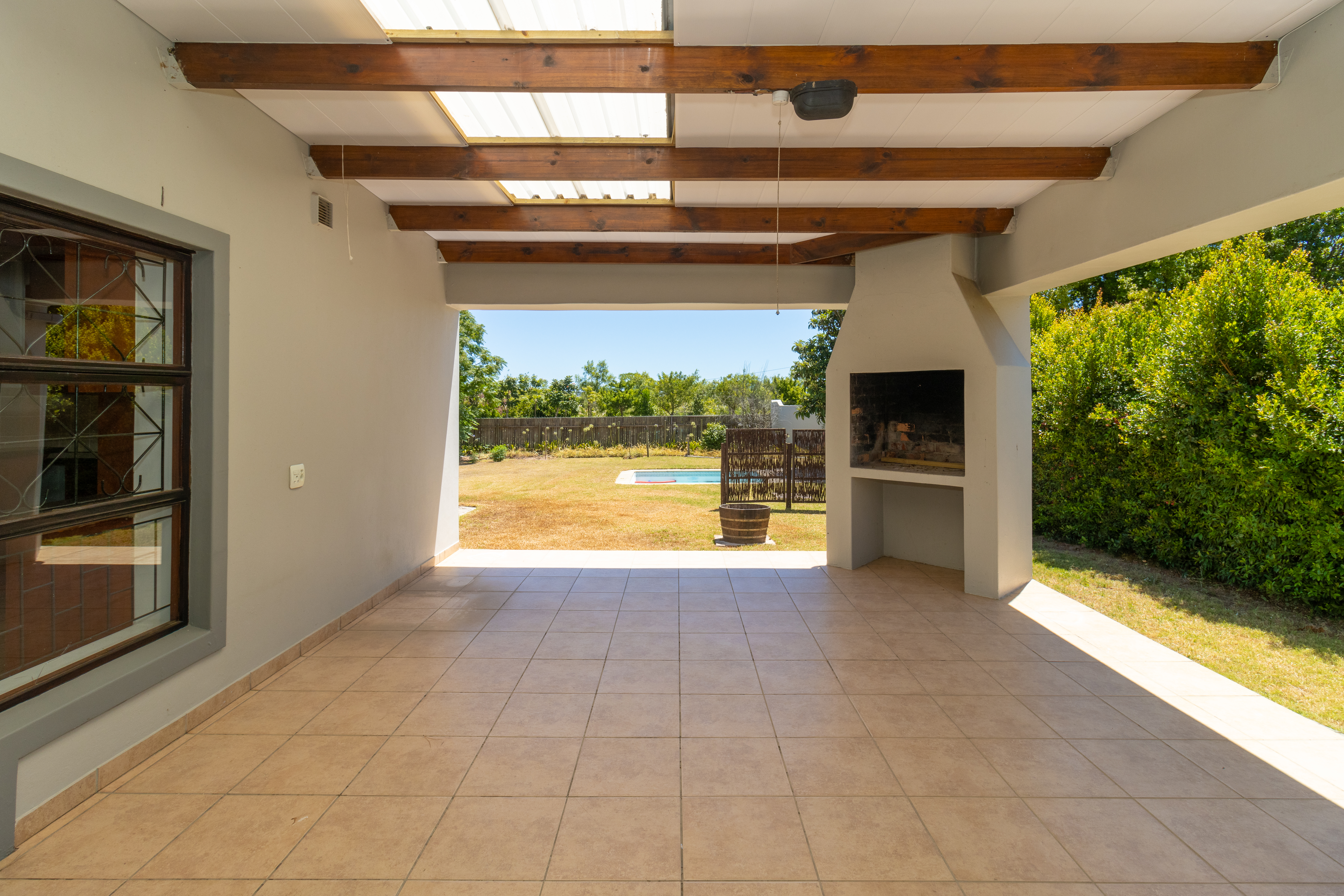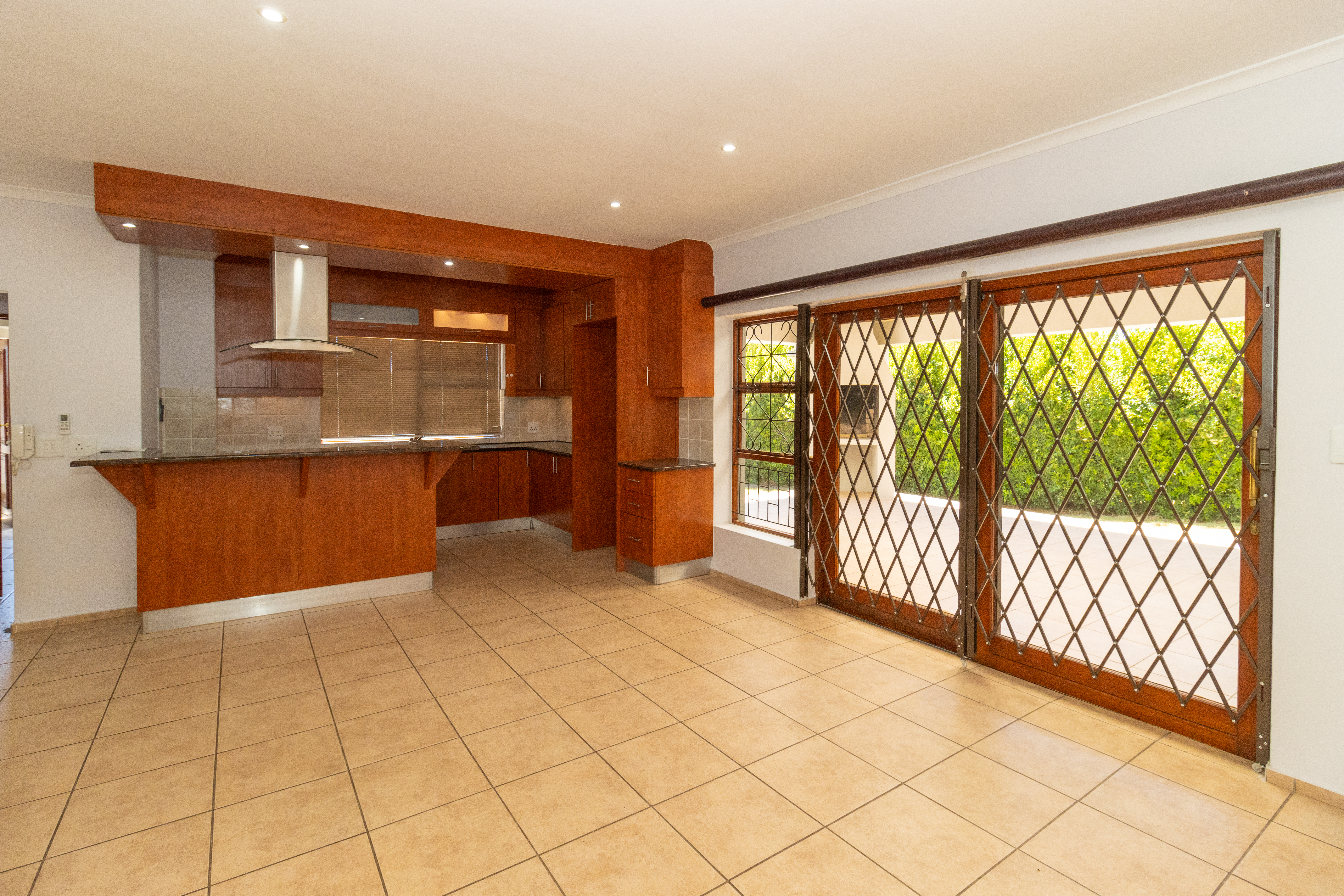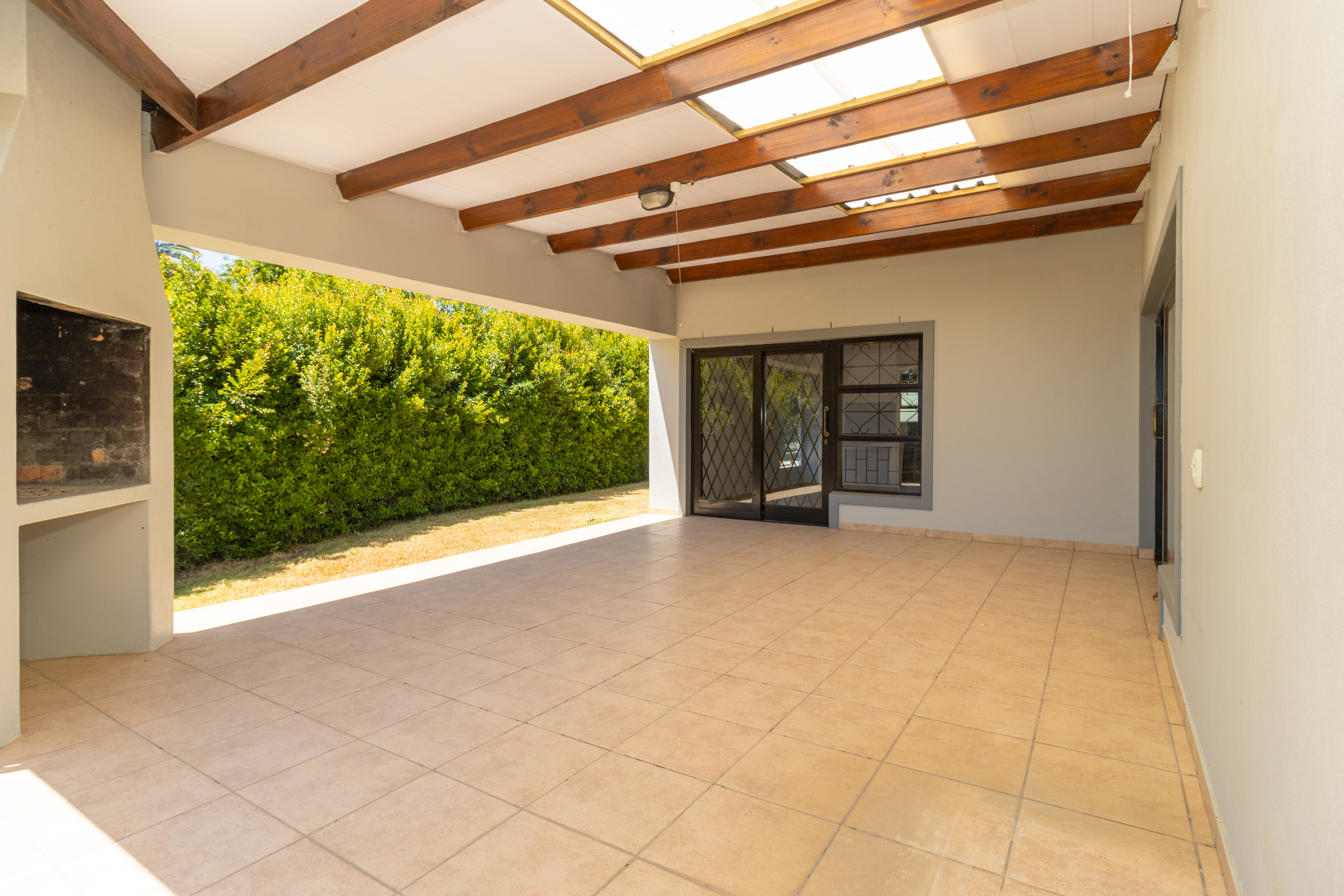 The home features a stylish open-plan kitchen and lounge that flows out to an enclosed braai area, perfect for entertaining.