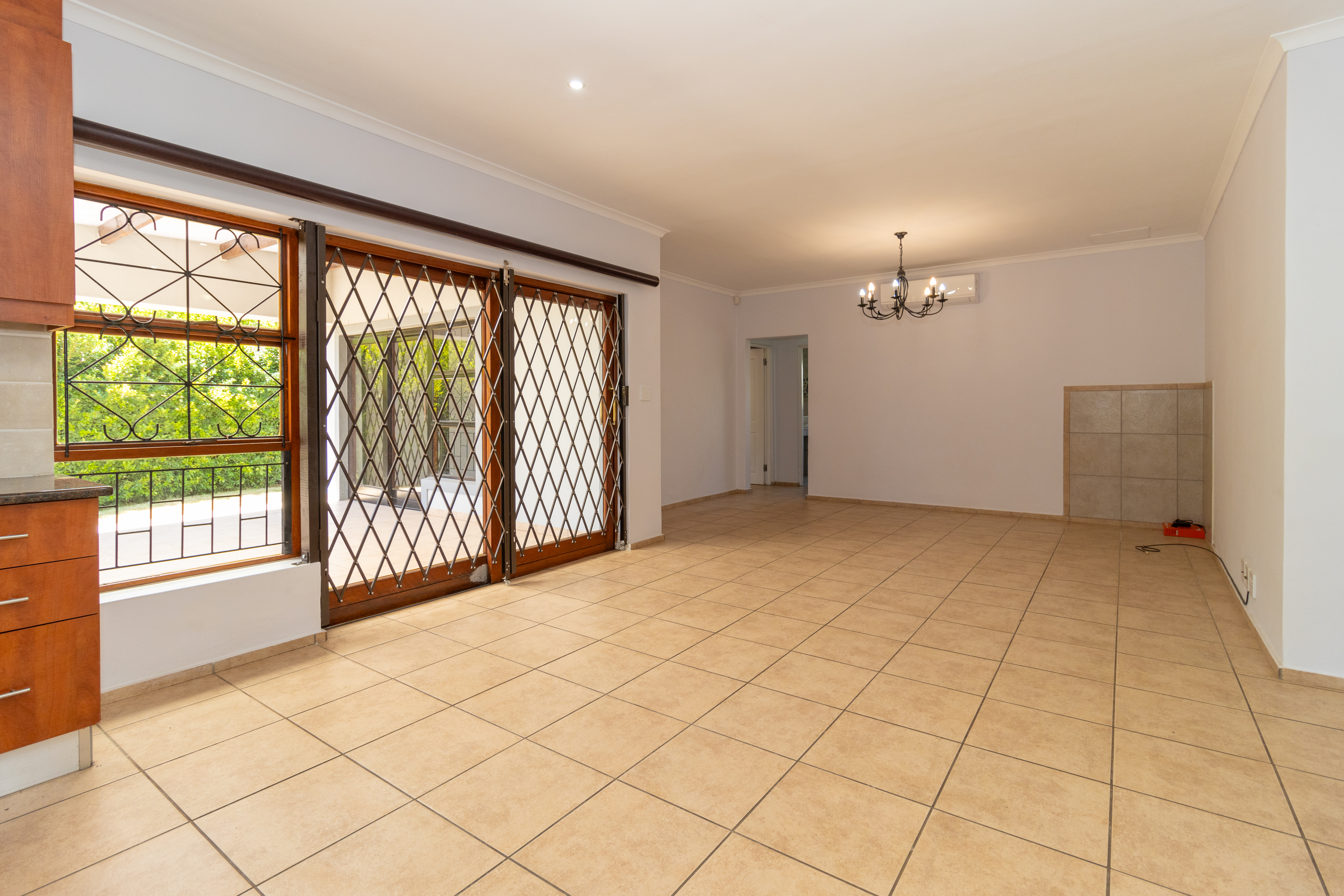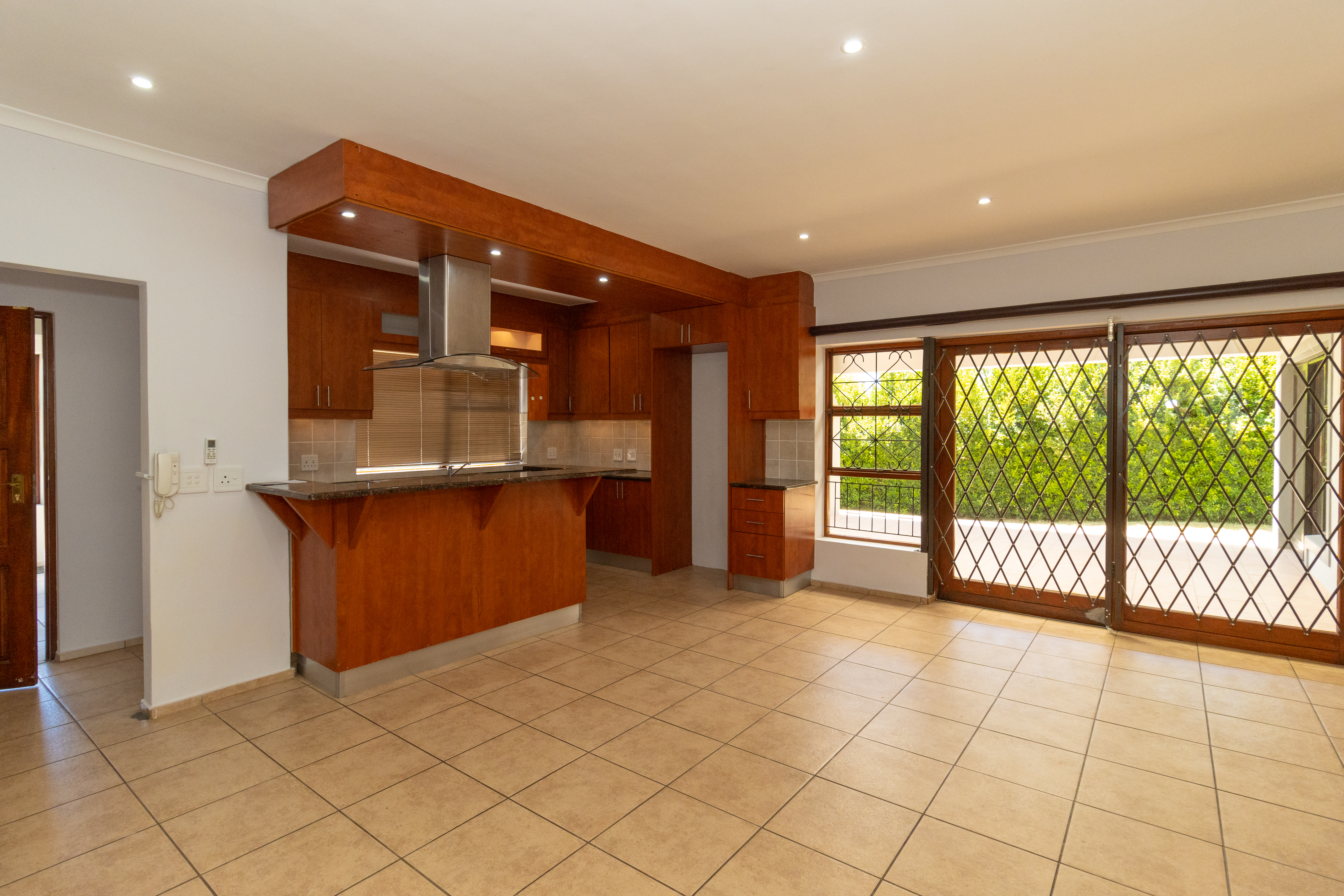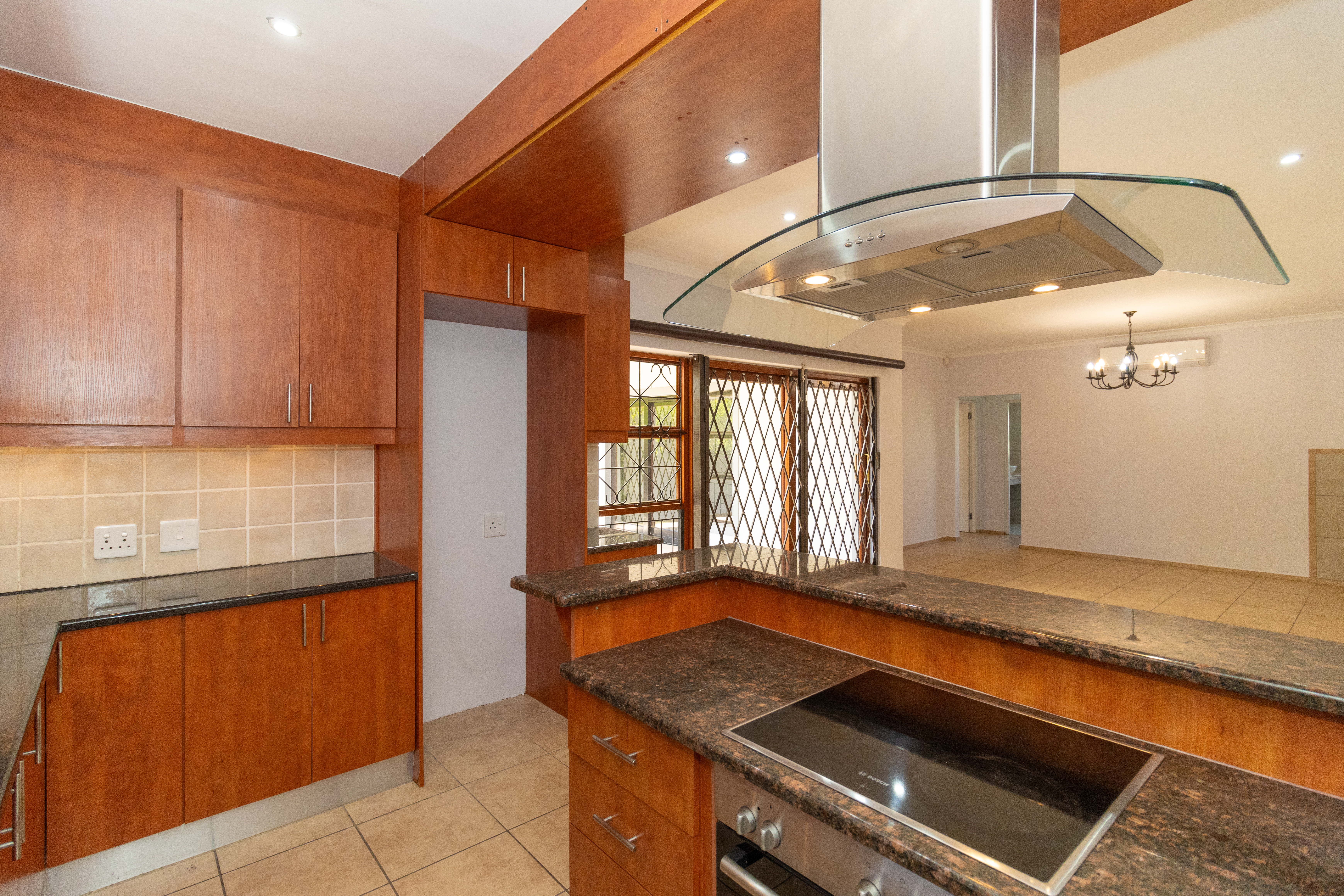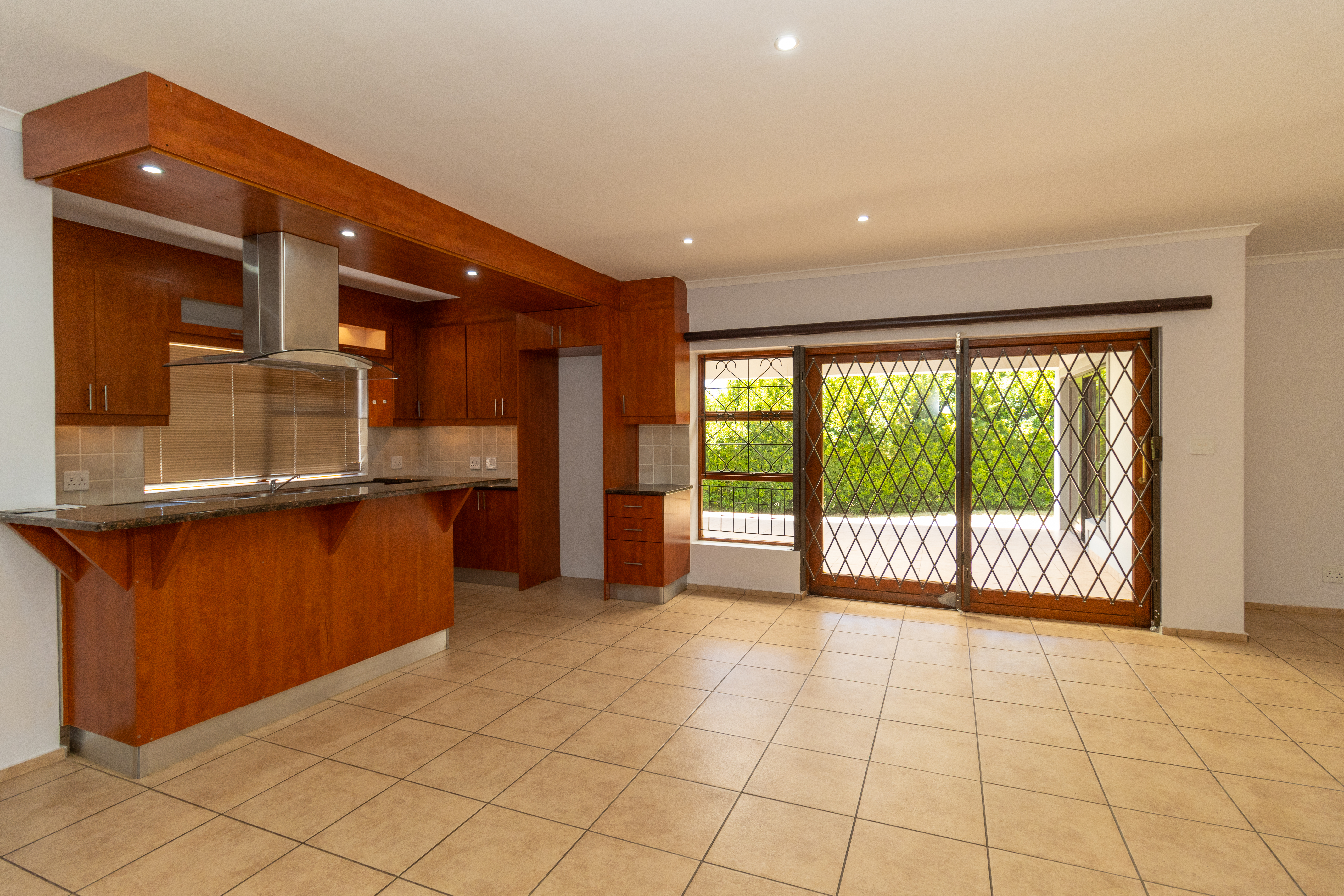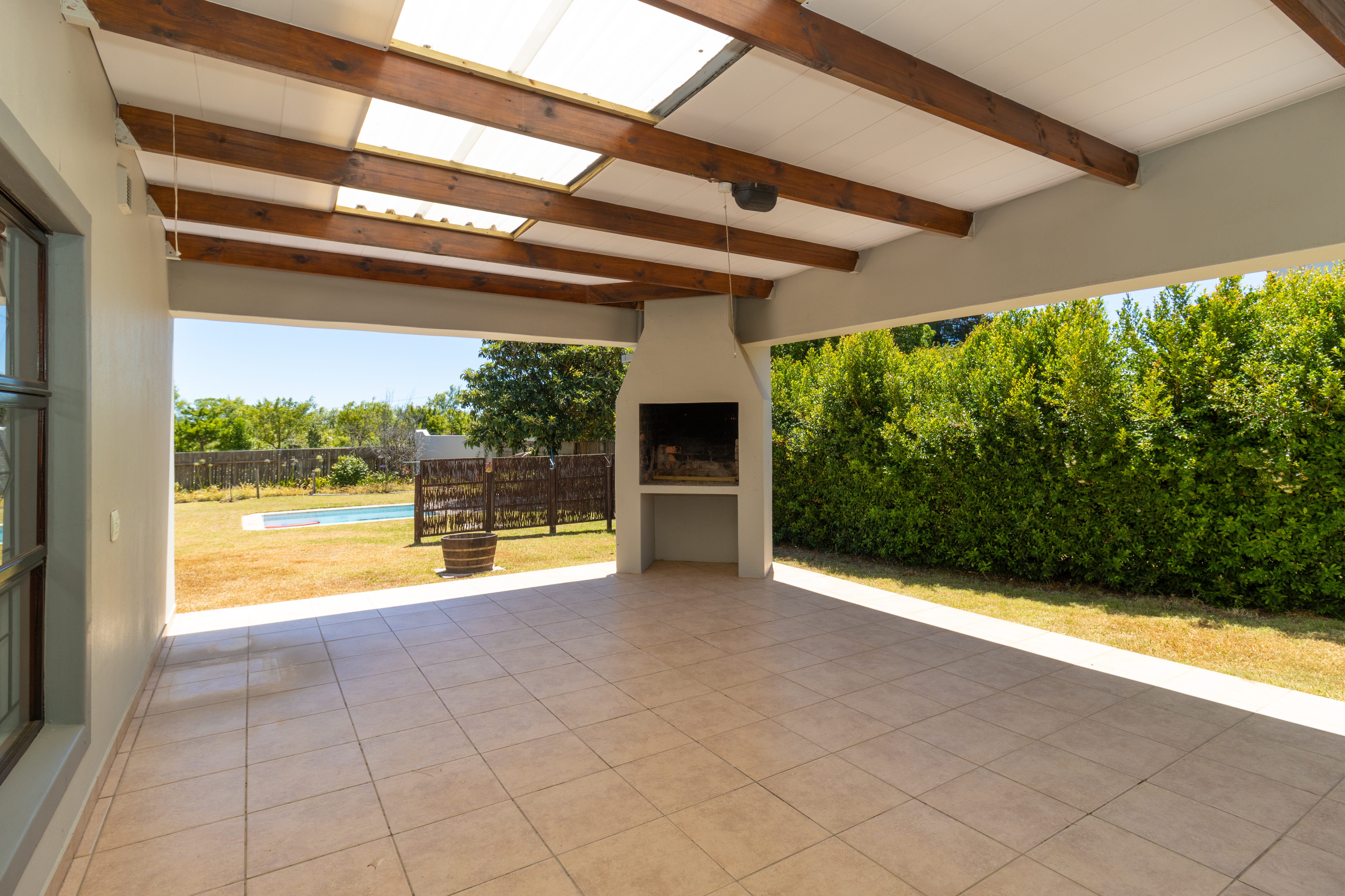 The home features a stylish open-plan kitchen and lounge that flows out to an enclosed braai area, perfect for entertaining.