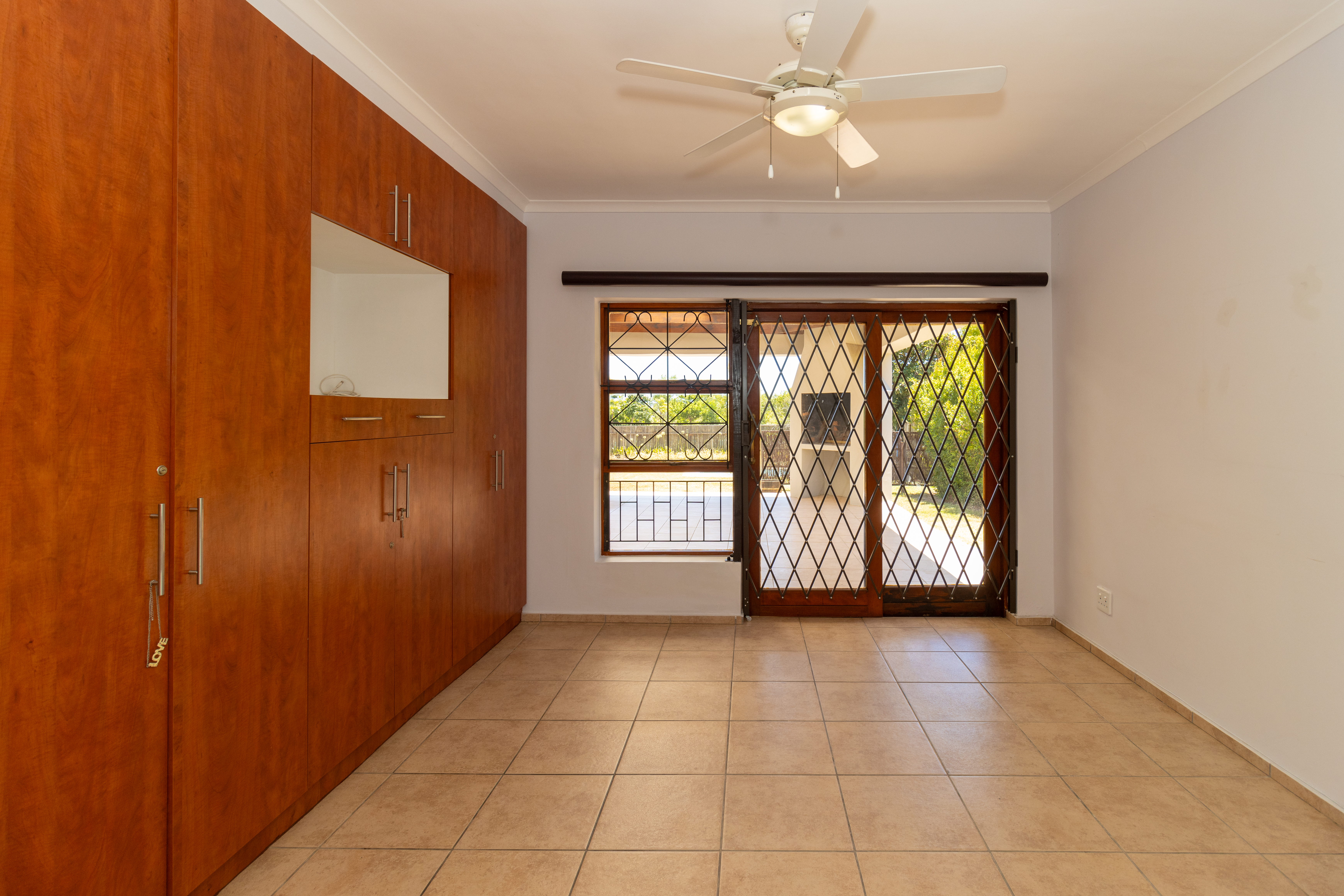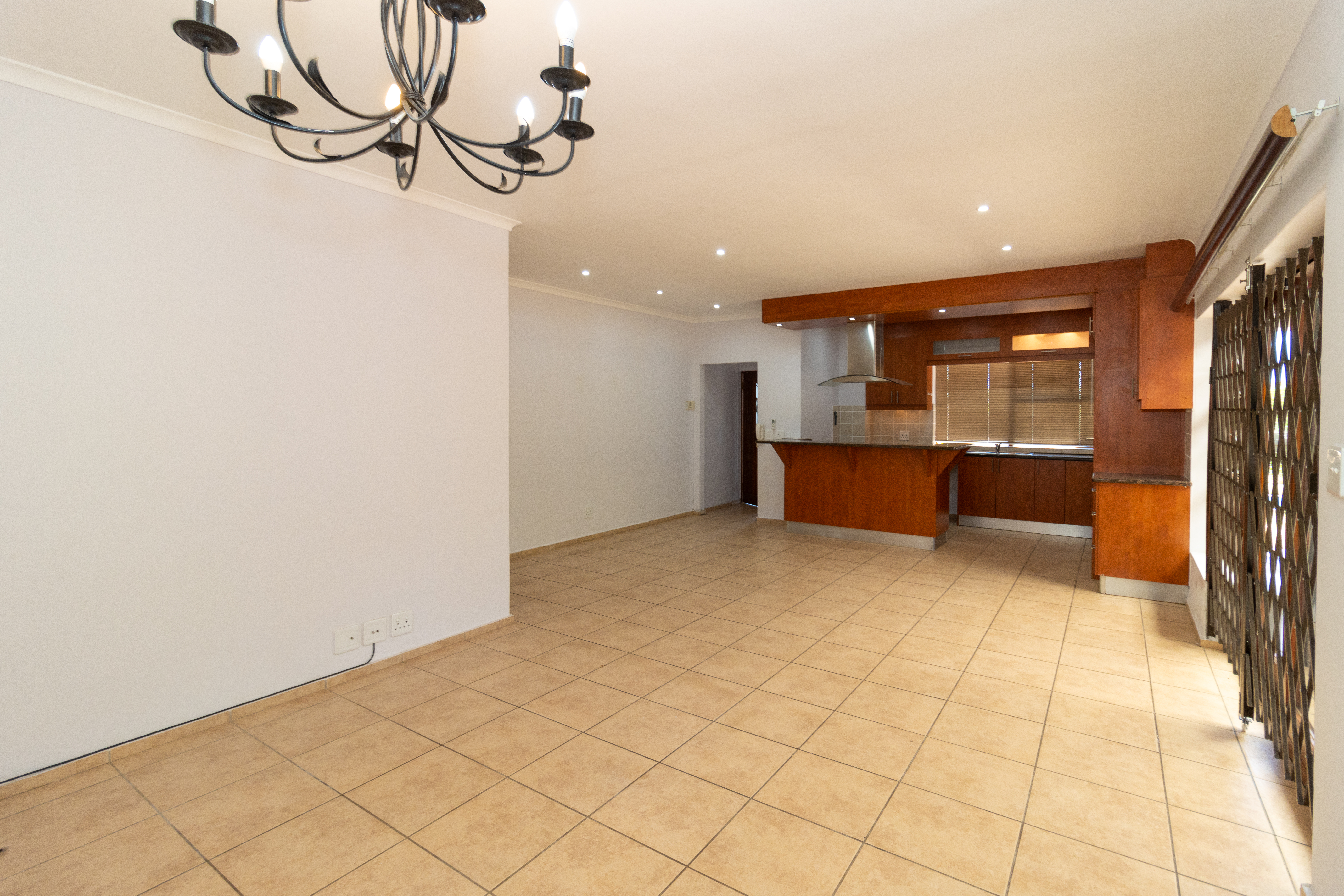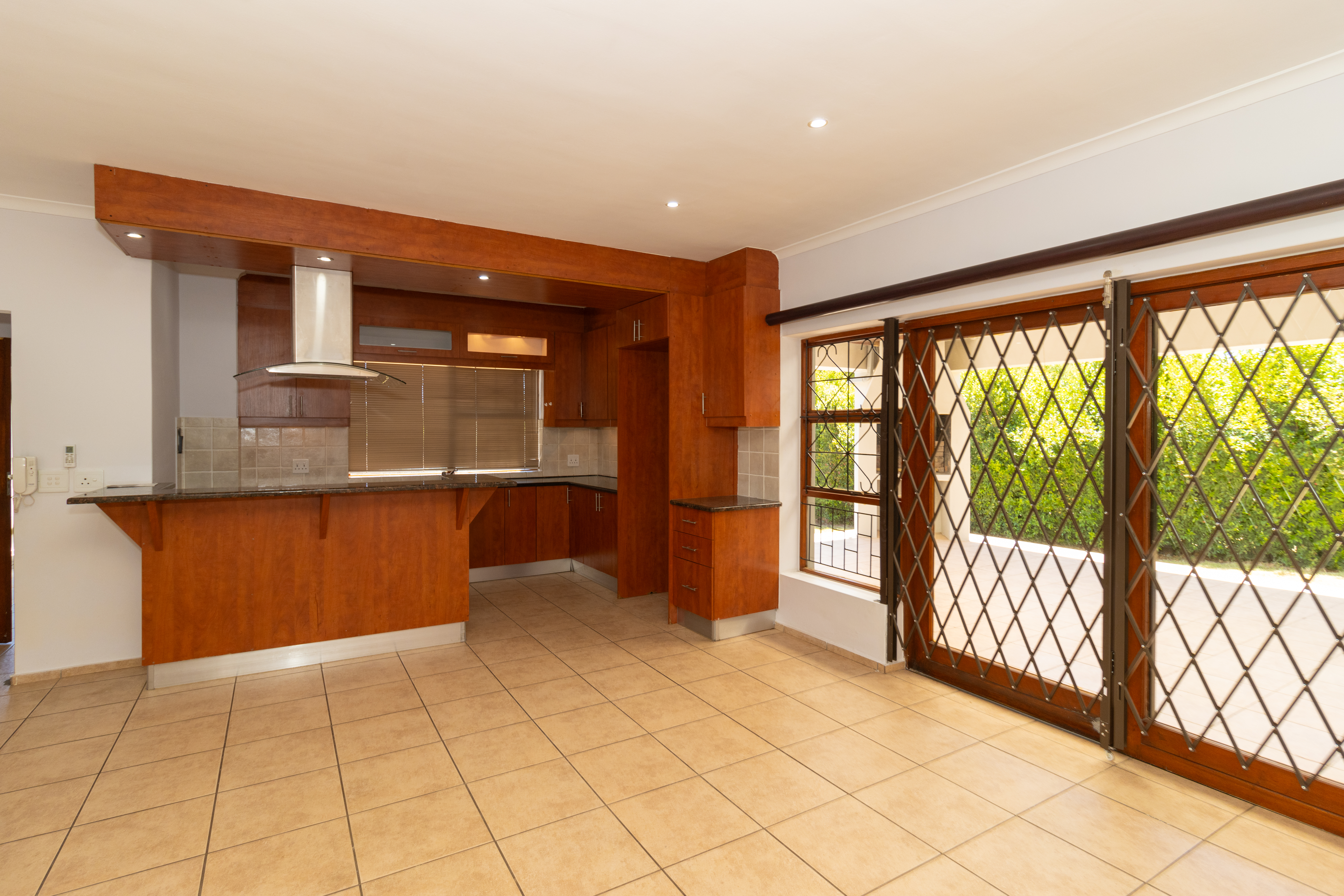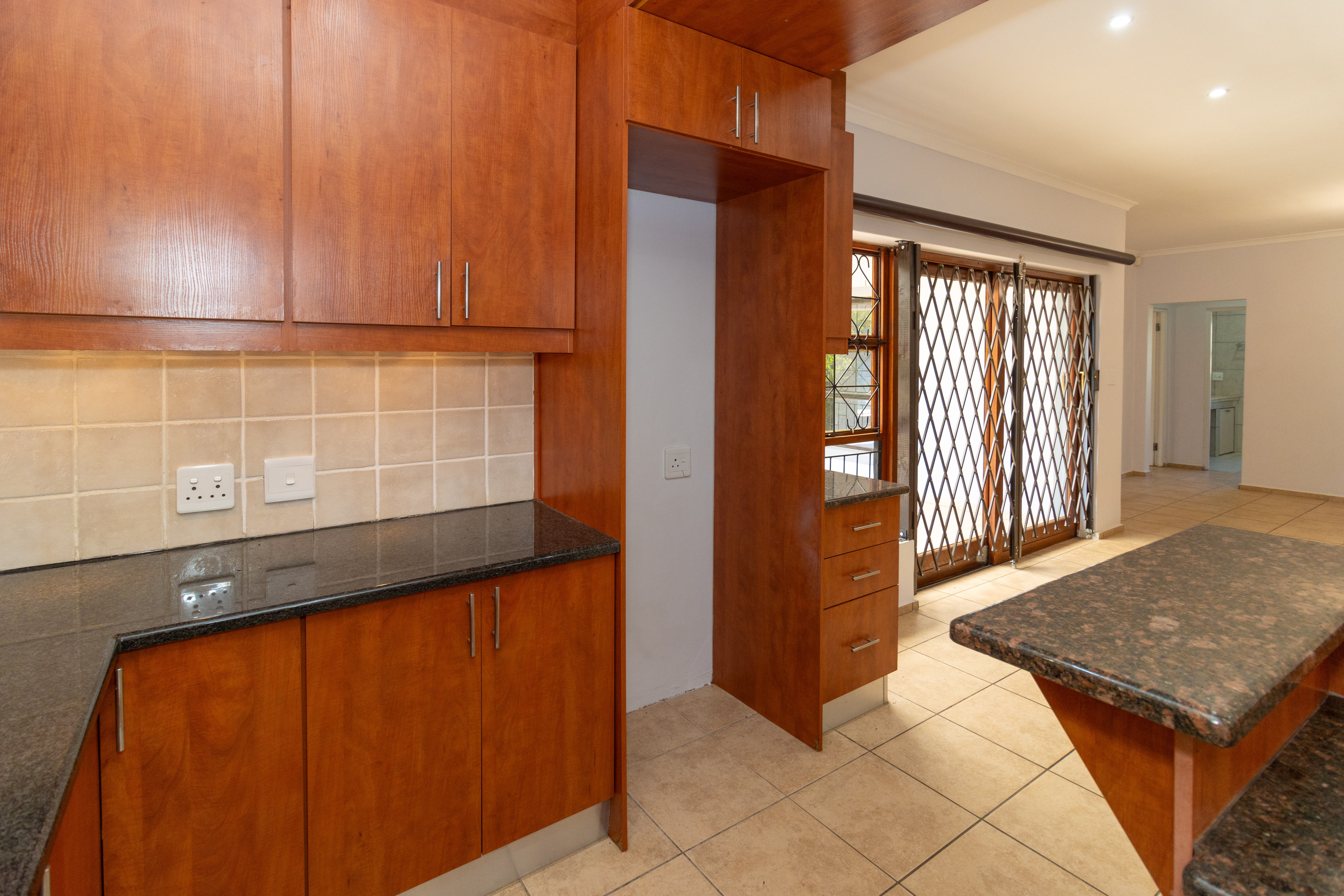 The home features a stylish open-plan kitchen and lounge that flows out to an enclosed braai area, perfect for entertaining.