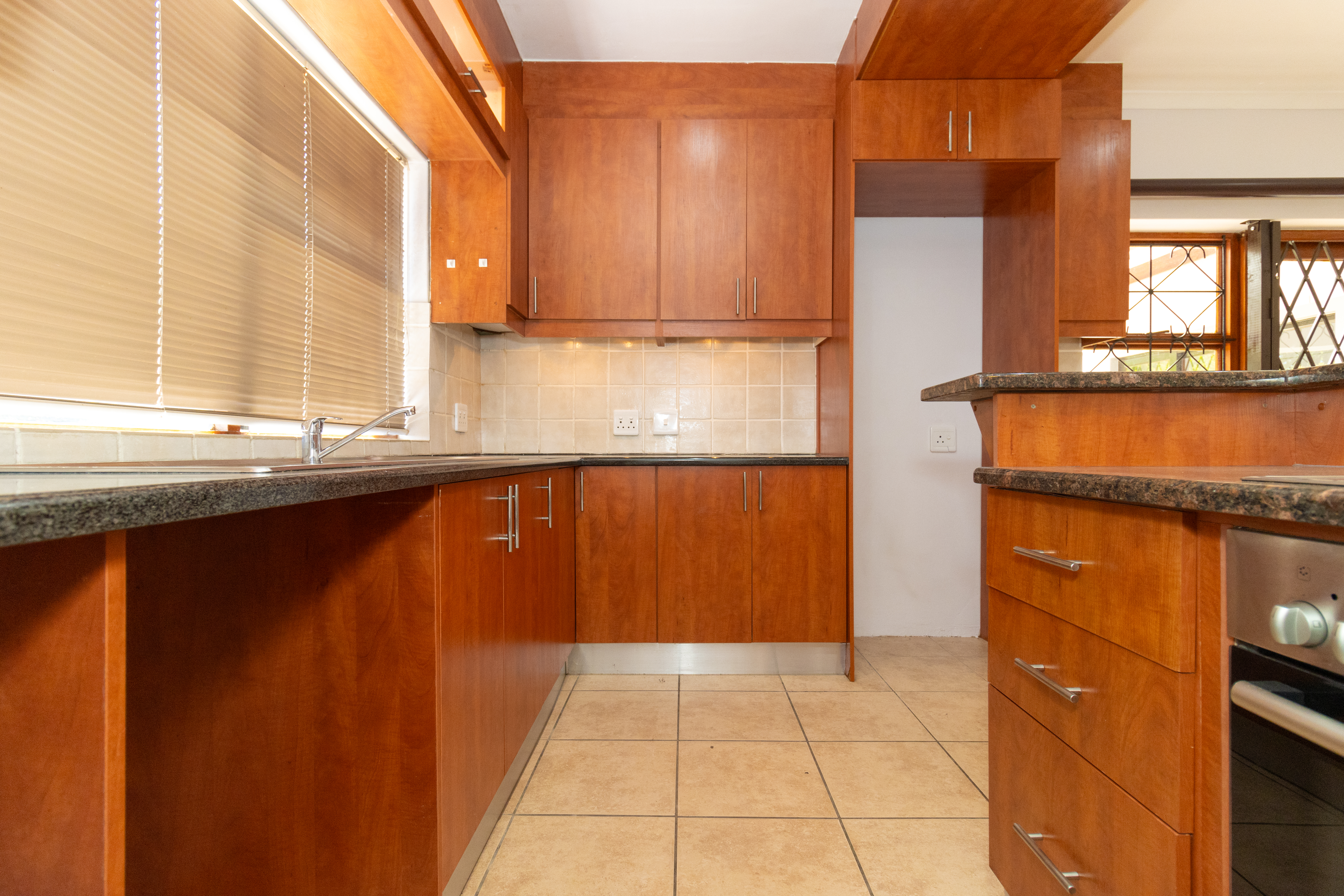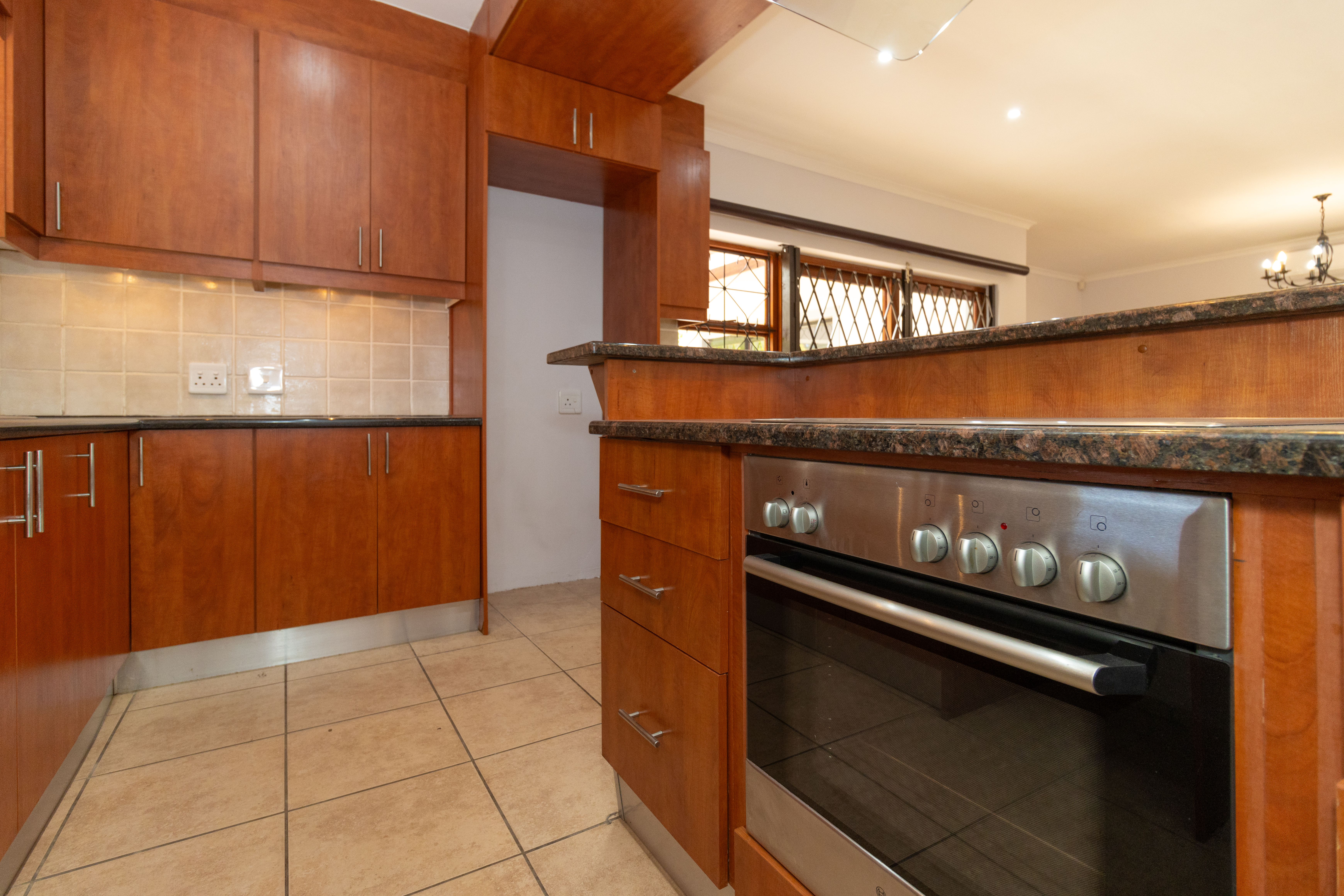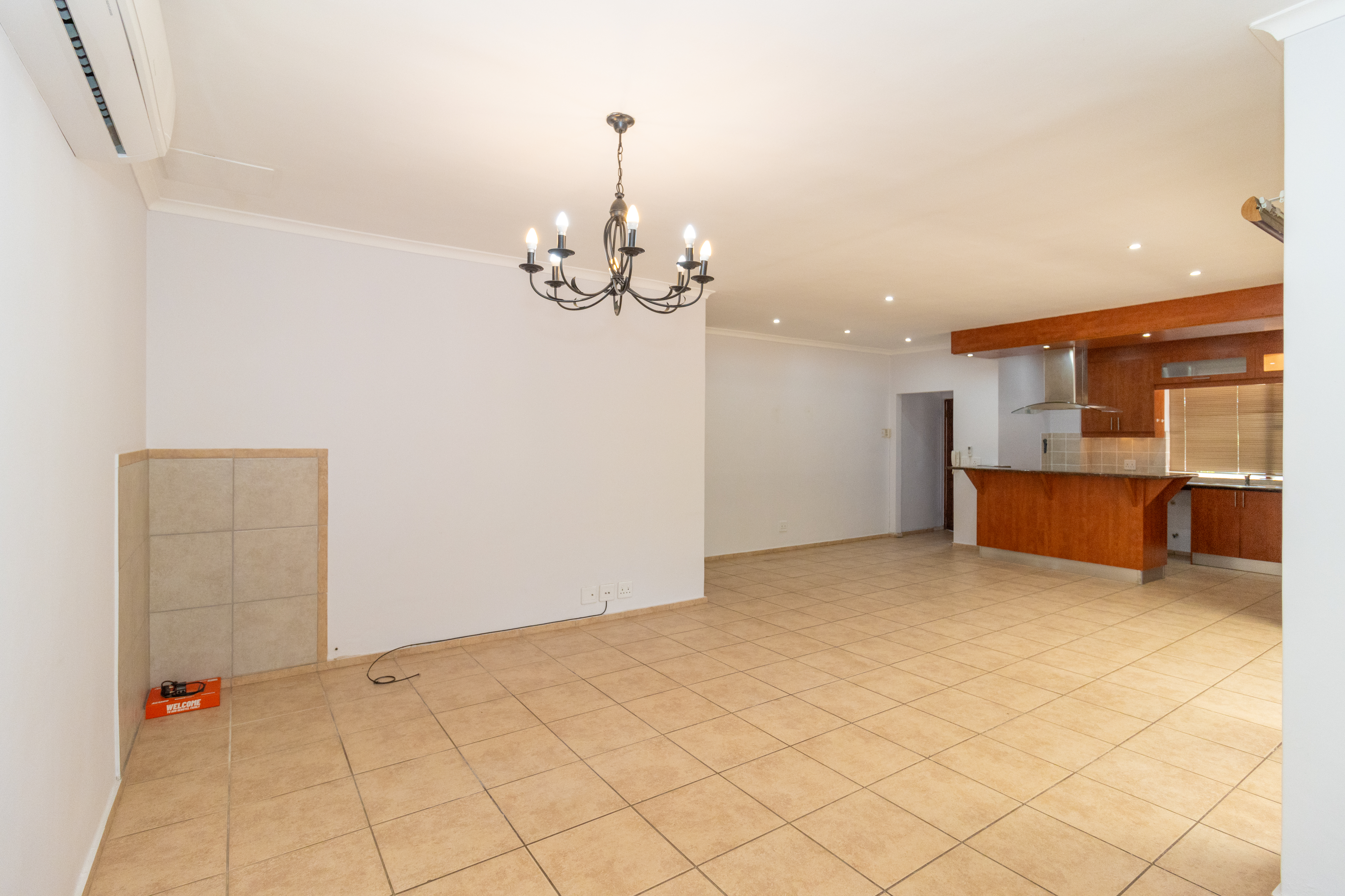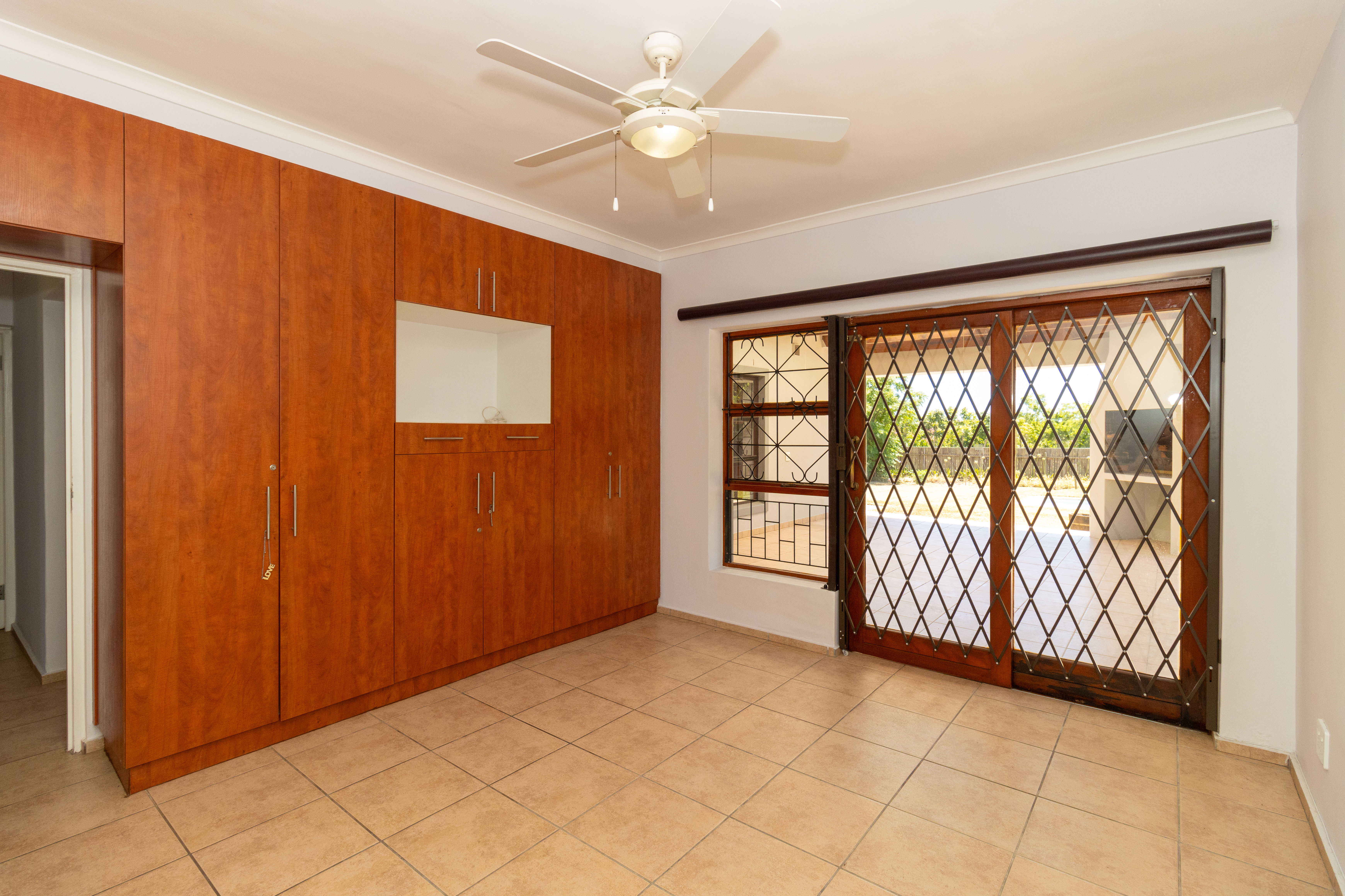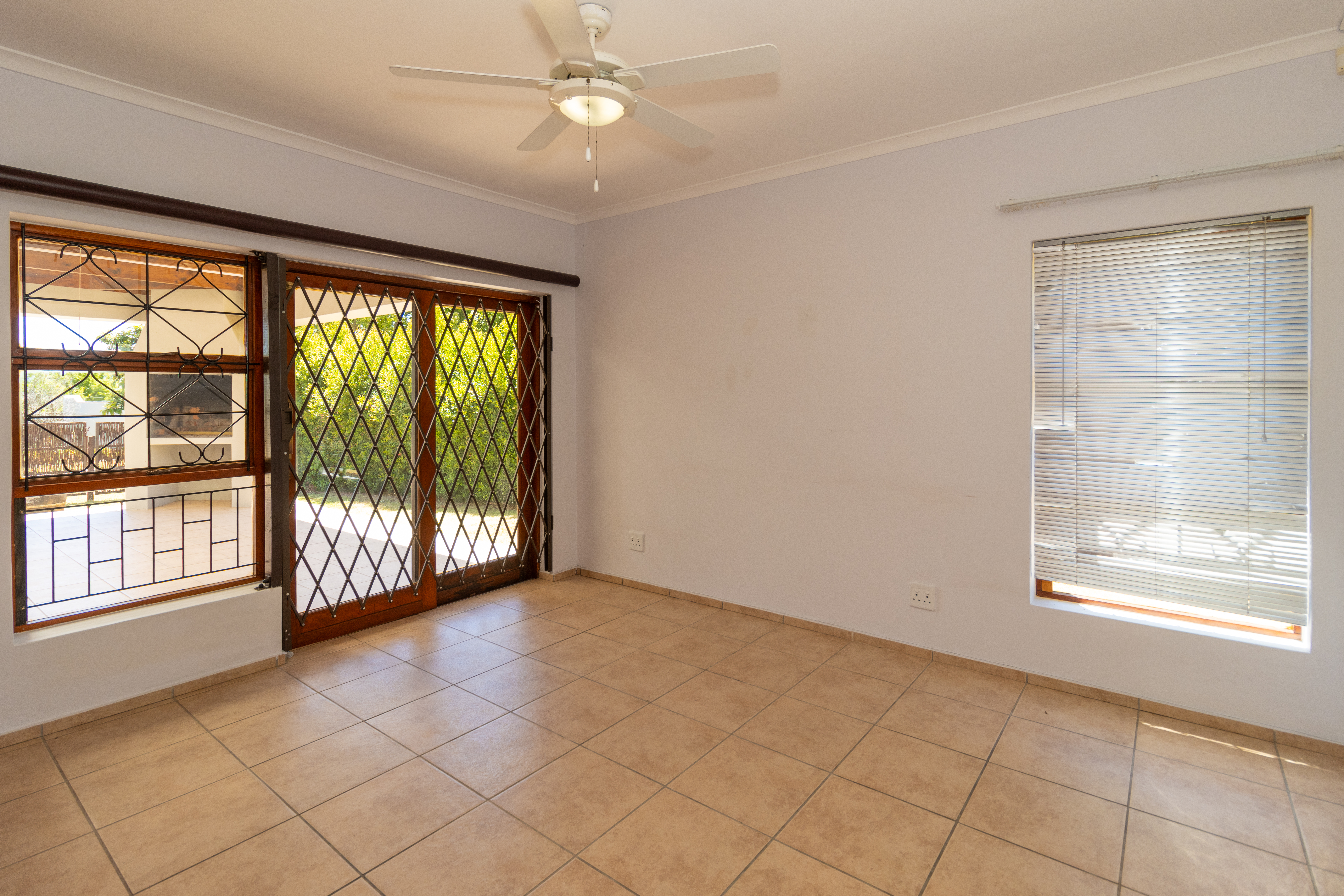 The home features a stylish open-plan kitchen and lounge that flows out to an enclosed braai area, perfect for entertaining.