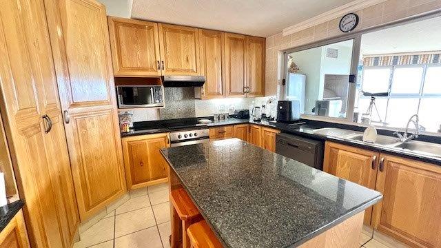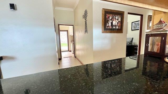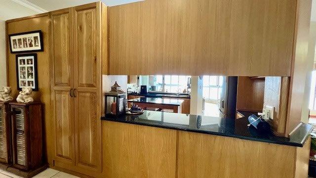 The spacious lounge flows effortlessly into a stylish, well-equipped kitchen featuring a service hatch, sleek granite countertops, and ample cabinetry. The dining area, framed by full-length stacker windows, allows you to take in the spectacular views while enjoying meals or entertaining guests. This space also includes a built-in braai area with a chimney, designed for a gas braai, making indoor entertaining effortless no matter the weather.