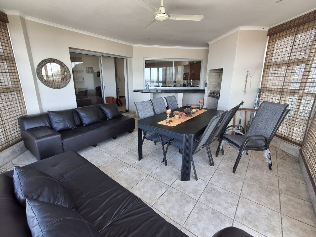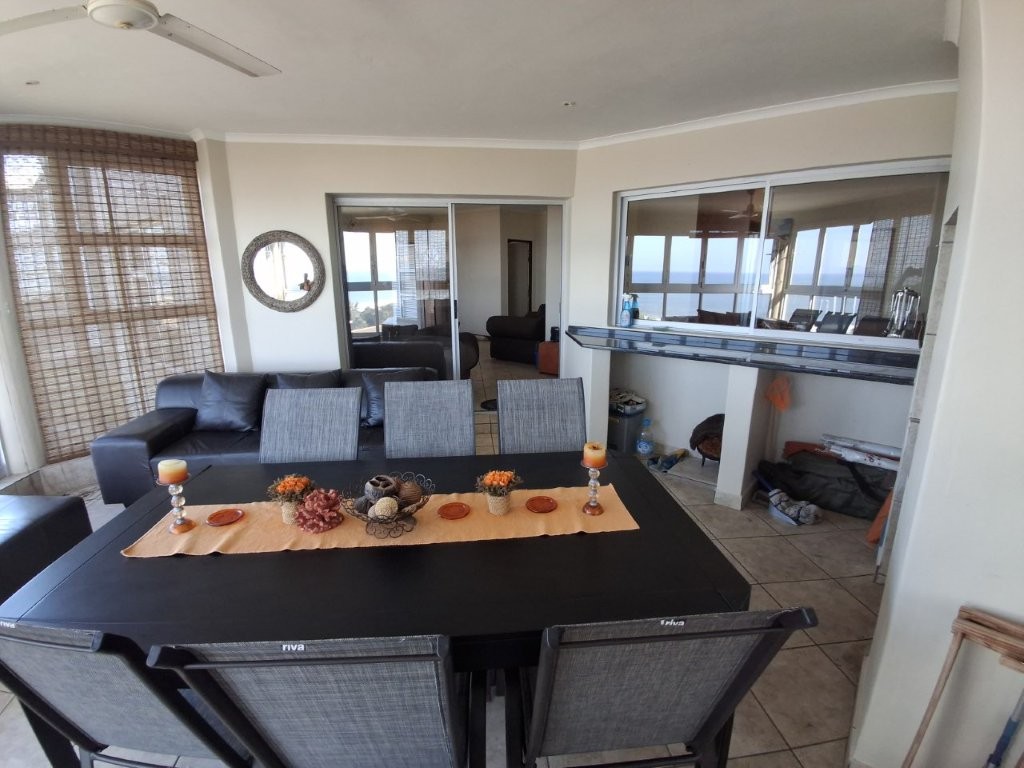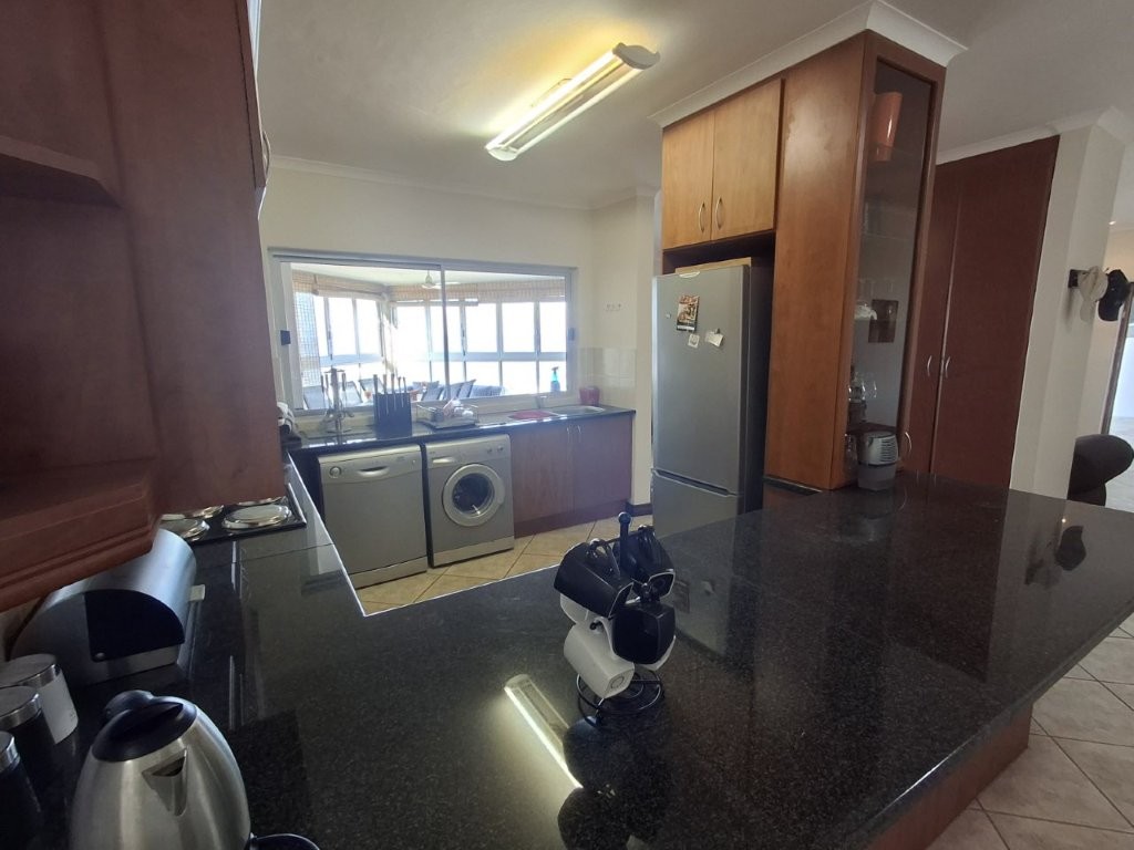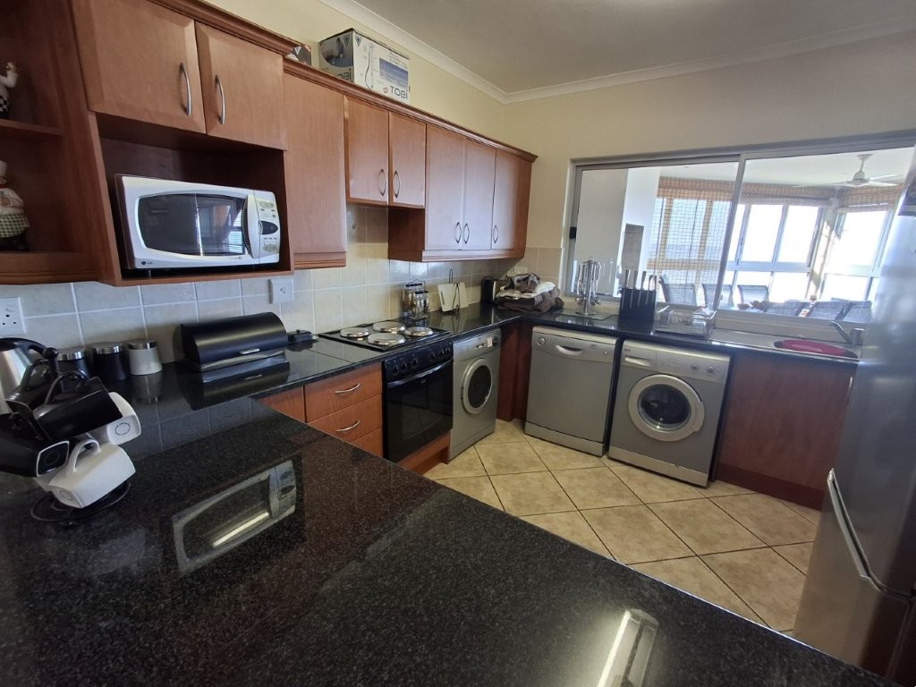 This beautiful upmarket apartment will capture your heart !! the feeling of well-being envelops you as you are met with bright spacious, open plan, living areas with the vast Indian ocean as your backdrop. The living areas are very versatile. An under-cover entrance will lead you into the spacious lounge with glass sliders leading into a dining area of note, with built in braai, this can be utilized as a formal entertaining area or a laid-back braai evening. With the entire area having stack sliding windows you will have the Ocean as a permanent dinner guest.
