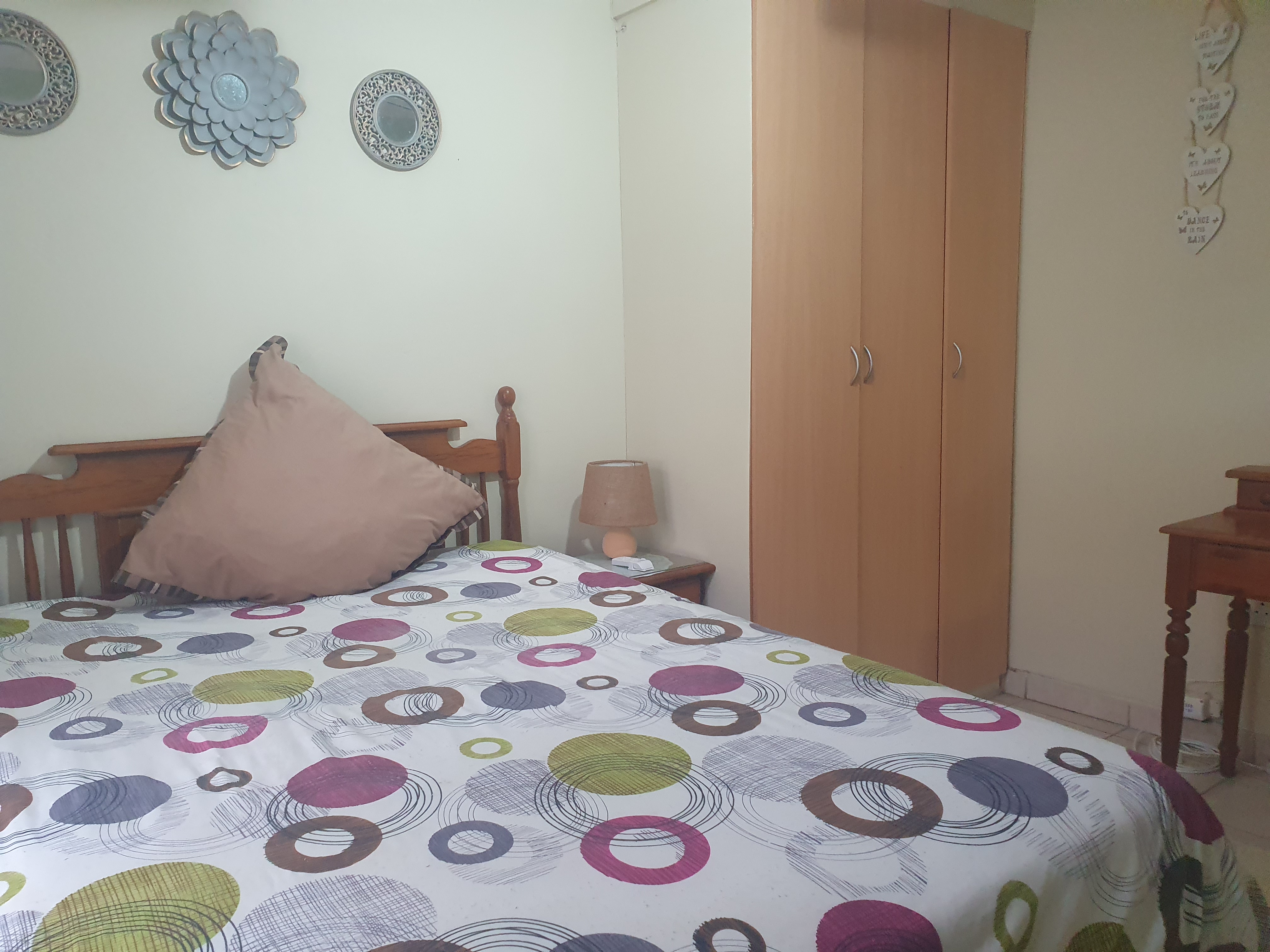 The apartment features two bedrooms, one bathroom, and a spacious open plan living room and kitchen area.
