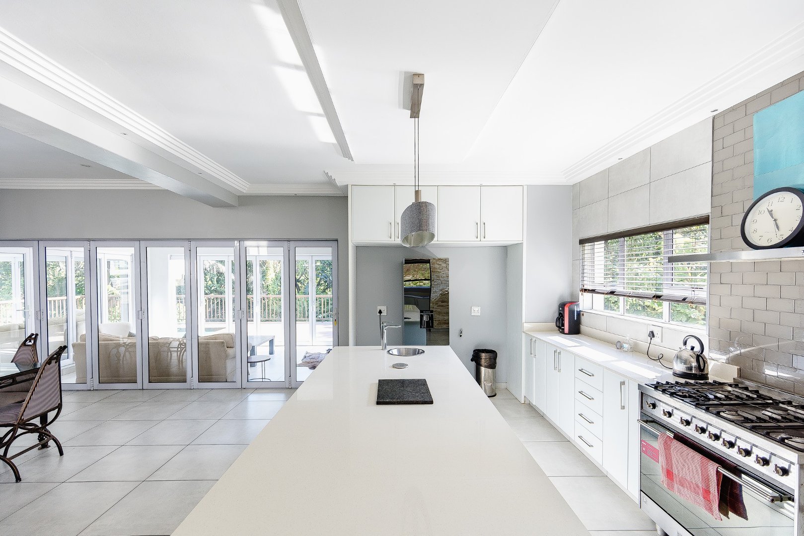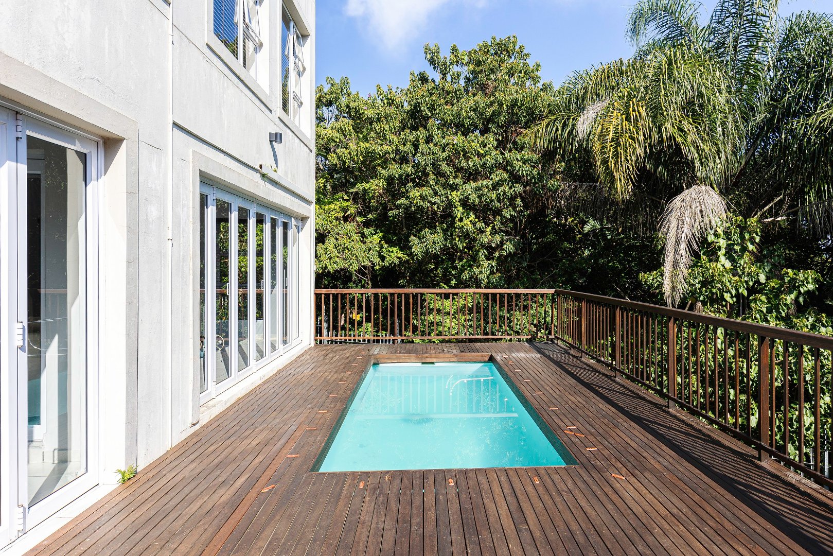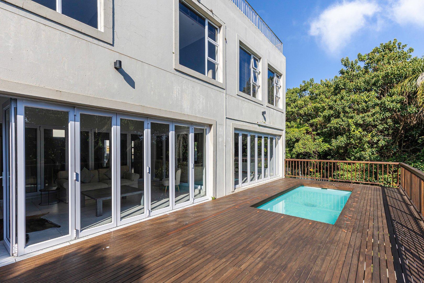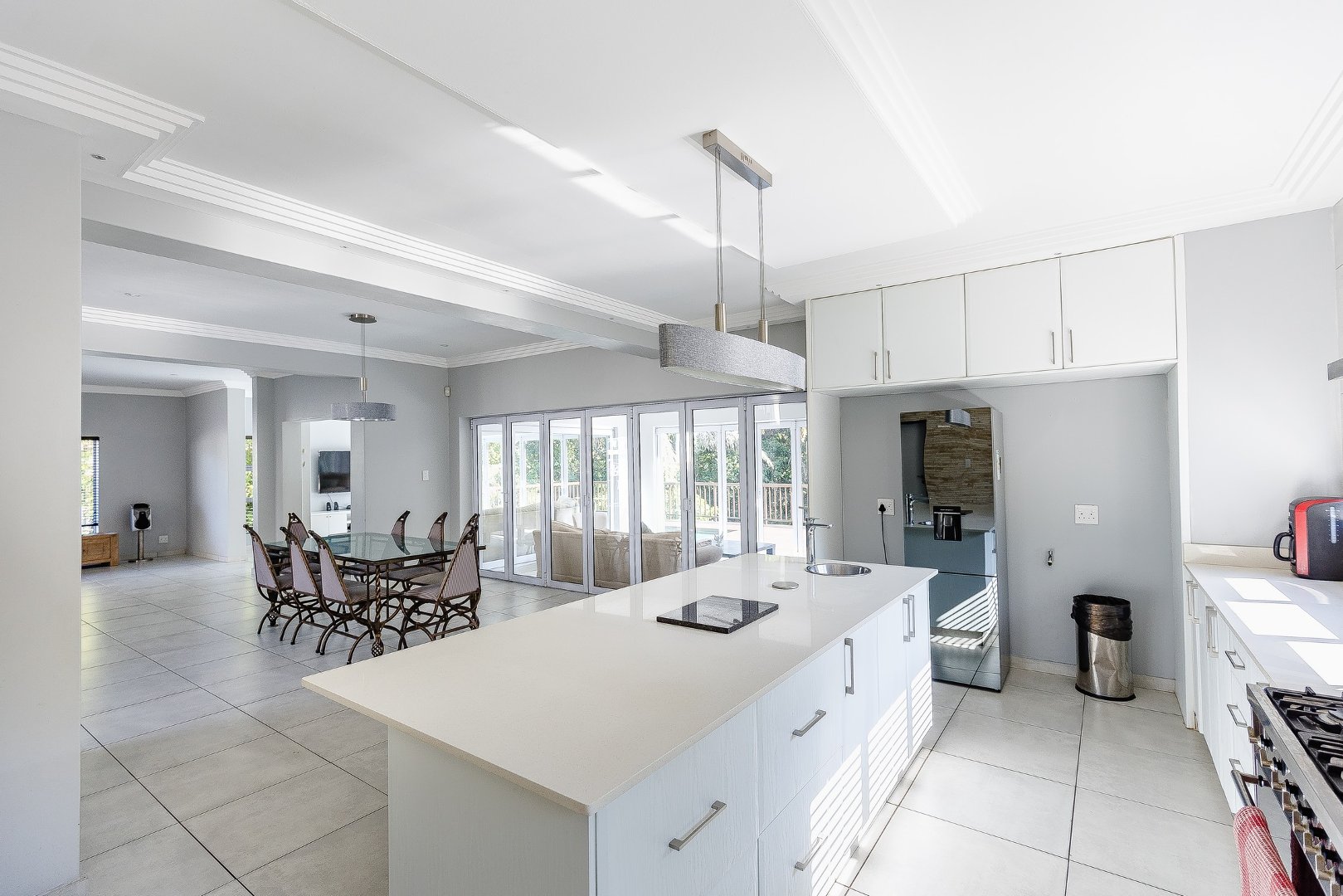 This freestanding house is perfect for a big family, offering ample space and luxurious features. The first level boasts an open-plan design, seamlessly connecting the living spaces for a spacious and airy feel. Enjoy a modern kitchen with a centre island, plenty of cupboard space, a scullery, and a pantry—ideal for culinary enthusiasts. The dining room opens via stack doors to an enclosed patio, leading to a wooden deck with a sparkling pool, perfect for entertaining. Two lounge areas provide versatile living spaces, with one opening directly to the patio and pool area.