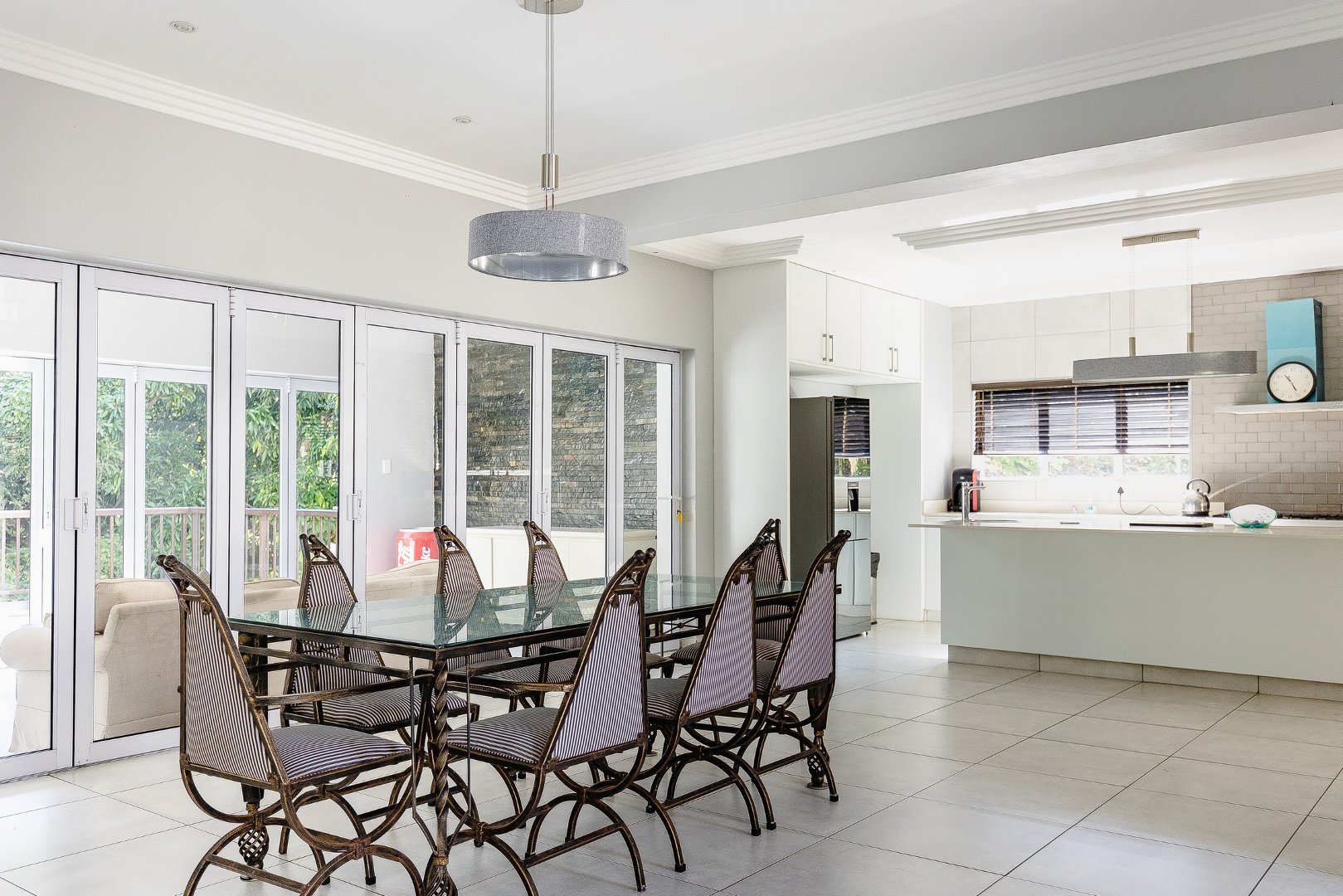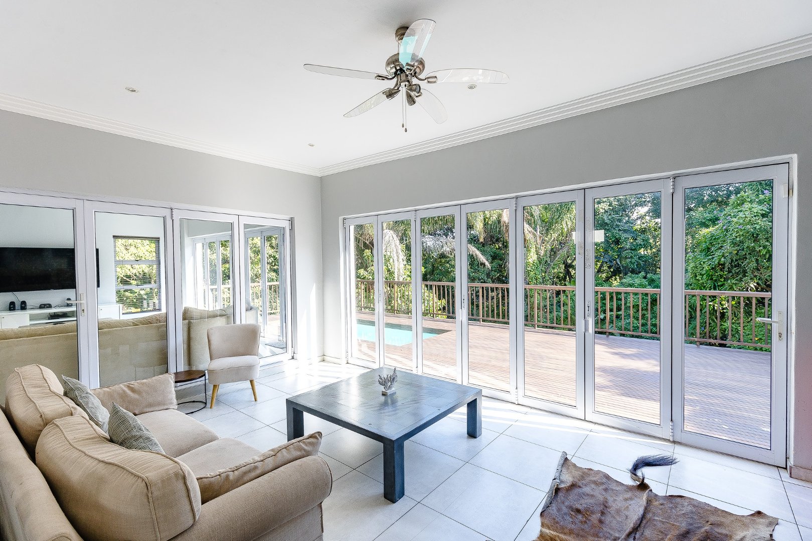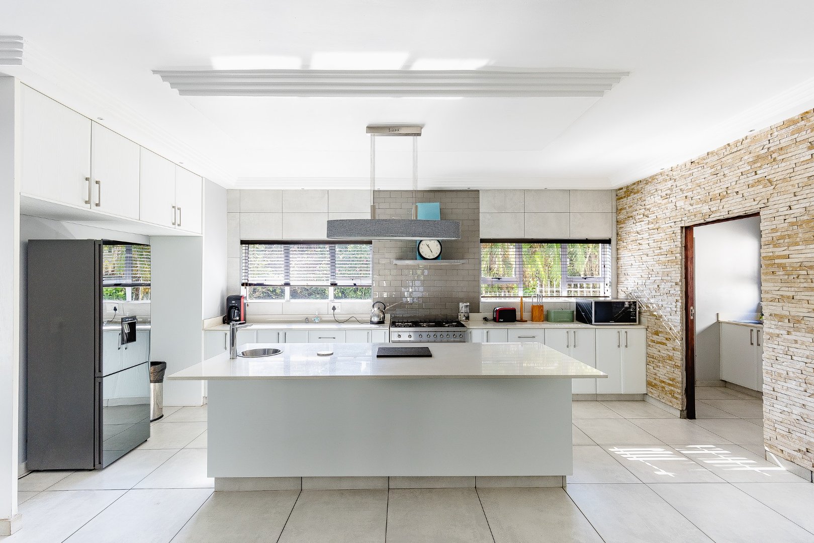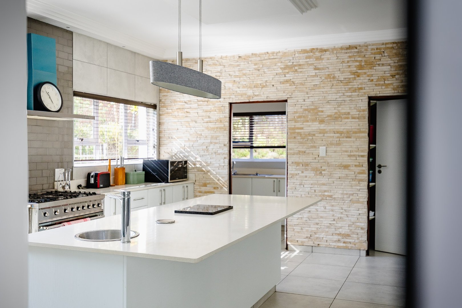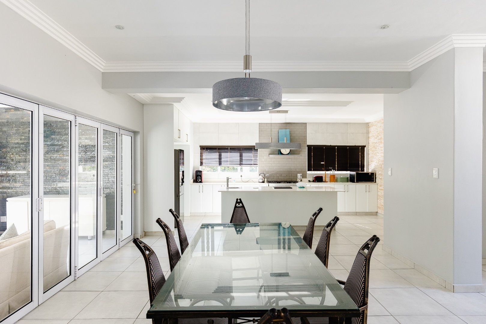 This freestanding house is perfect for a big family, offering ample space and luxurious features. The first level boasts an open-plan design, seamlessly connecting the living spaces for a spacious and airy feel. Enjoy a modern kitchen with a centre island, plenty of cupboard space, a scullery, and a pantry—ideal for culinary enthusiasts. The dining room opens via stack doors to an enclosed patio, leading to a wooden deck with a sparkling pool, perfect for entertaining. Two lounge areas provide versatile living spaces, with one opening directly to the patio and pool area.