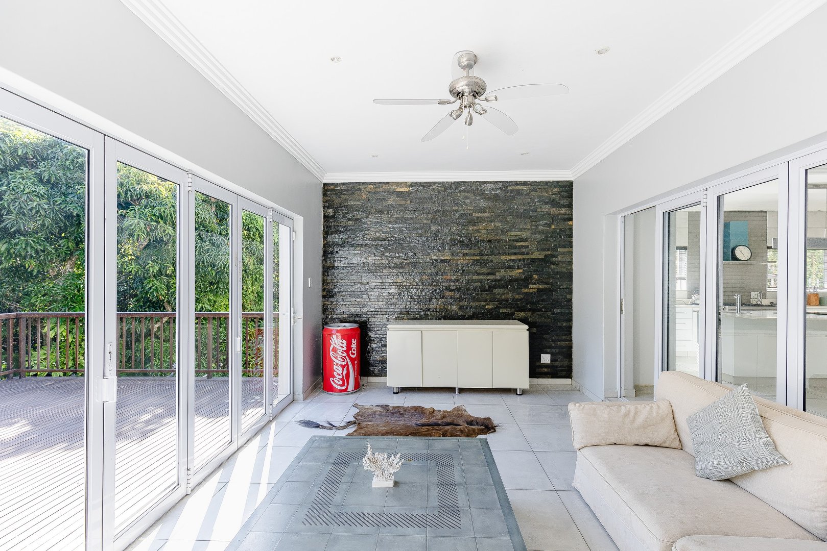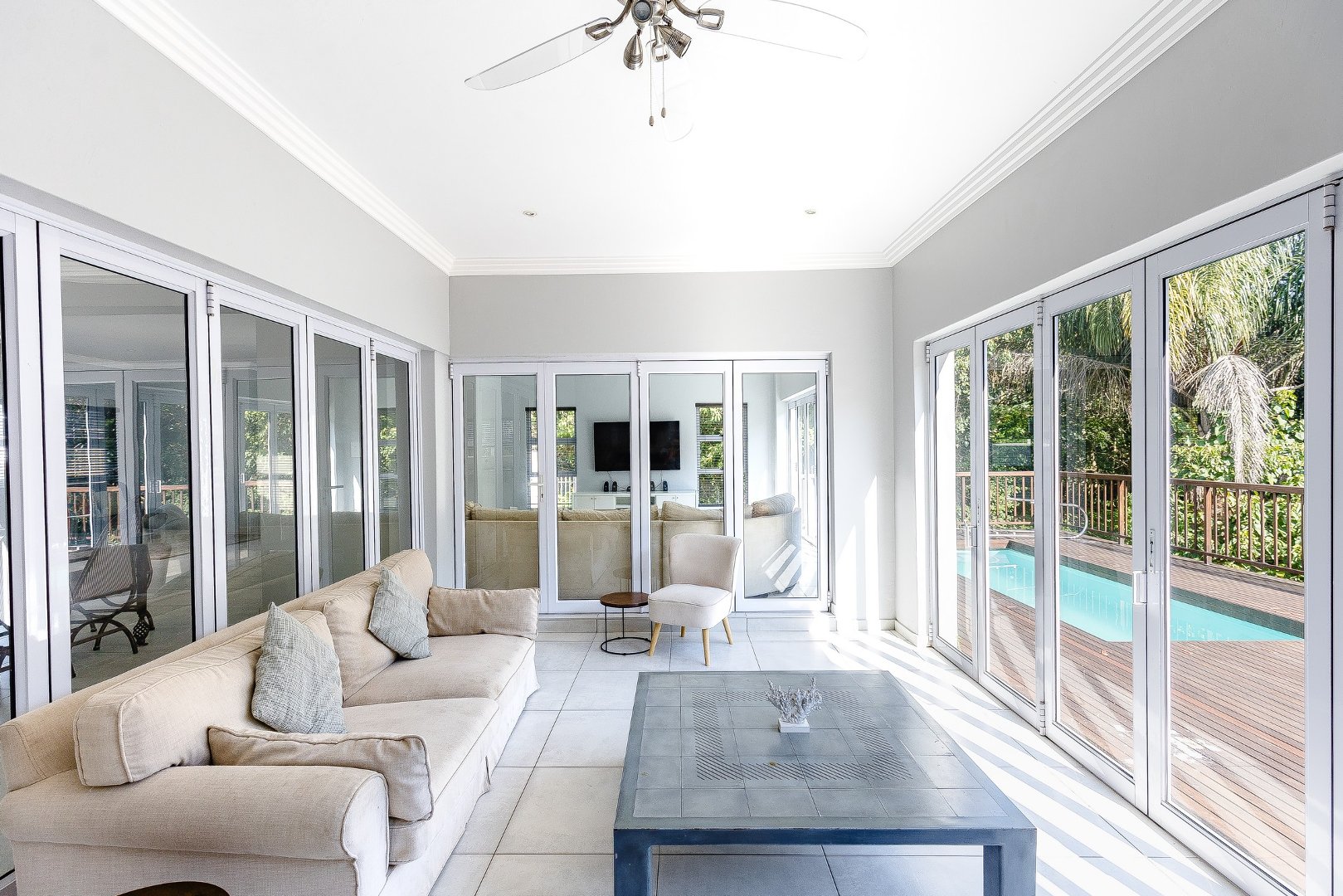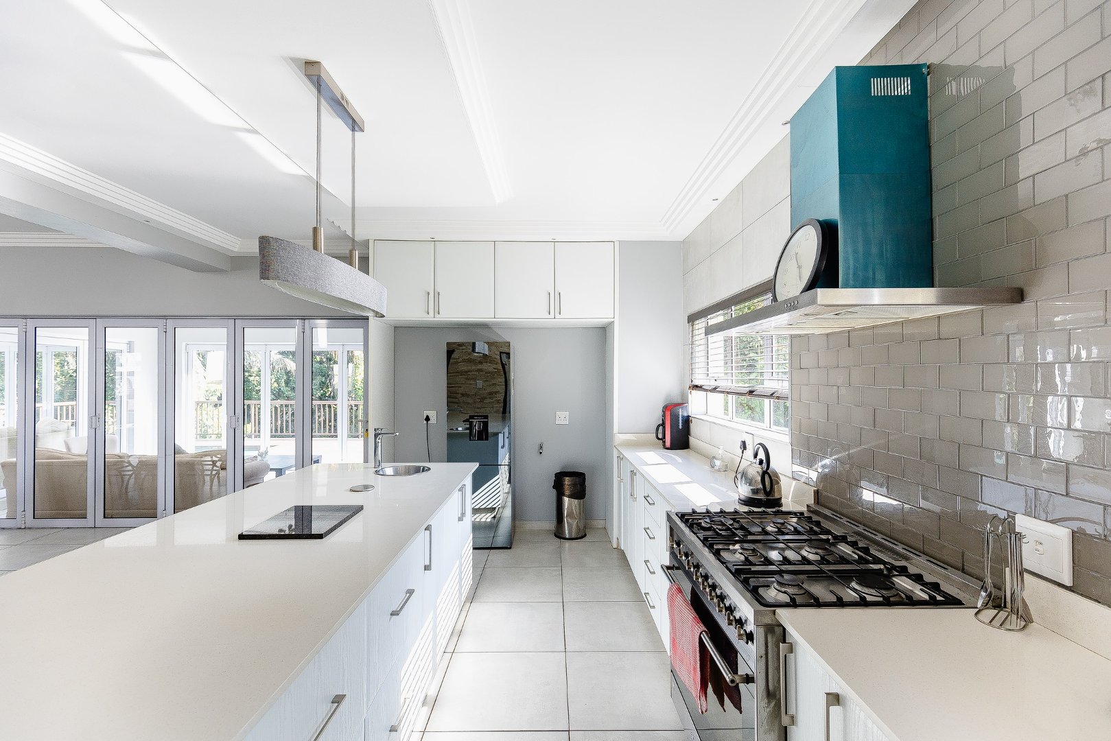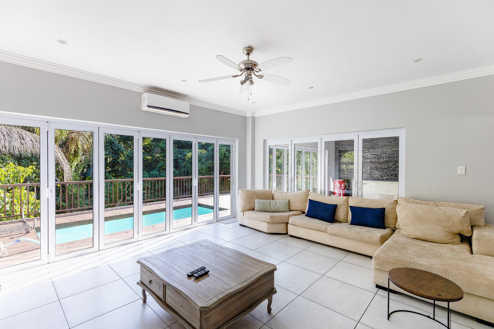 This freestanding house is perfect for a big family, offering ample space and luxurious features. The first level boasts an open-plan design, seamlessly connecting the living spaces for a spacious and airy feel. Enjoy a modern kitchen with a centre island, plenty of cupboard space, a scullery, and a pantry—ideal for culinary enthusiasts. The dining room opens via stack doors to an enclosed patio, leading to a wooden deck with a sparkling pool, perfect for entertaining. Two lounge areas provide versatile living spaces, with one opening directly to the patio and pool area.