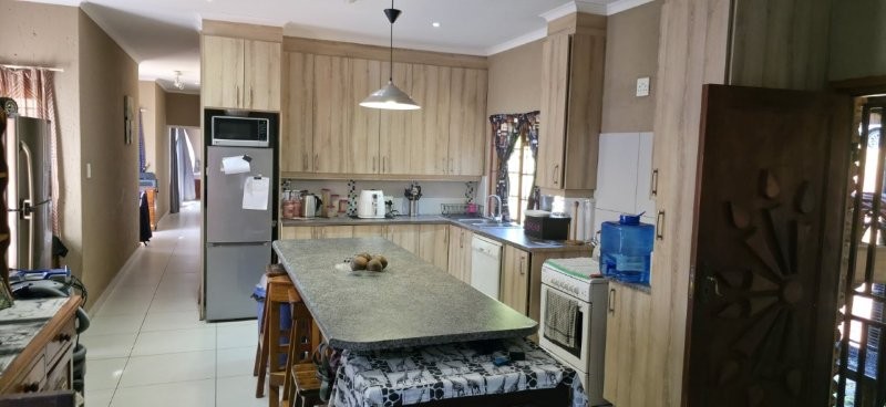 The kitchen is both functional and spacious, featuring ample counter space, generous cupboard storage, and a separate laundry room. Just off the kitchen, the comfortable lounge area includes a cozy fireplace and opens out onto the expansive, landscaped garden with the swimming pool — perfect for relaxing or entertaining.