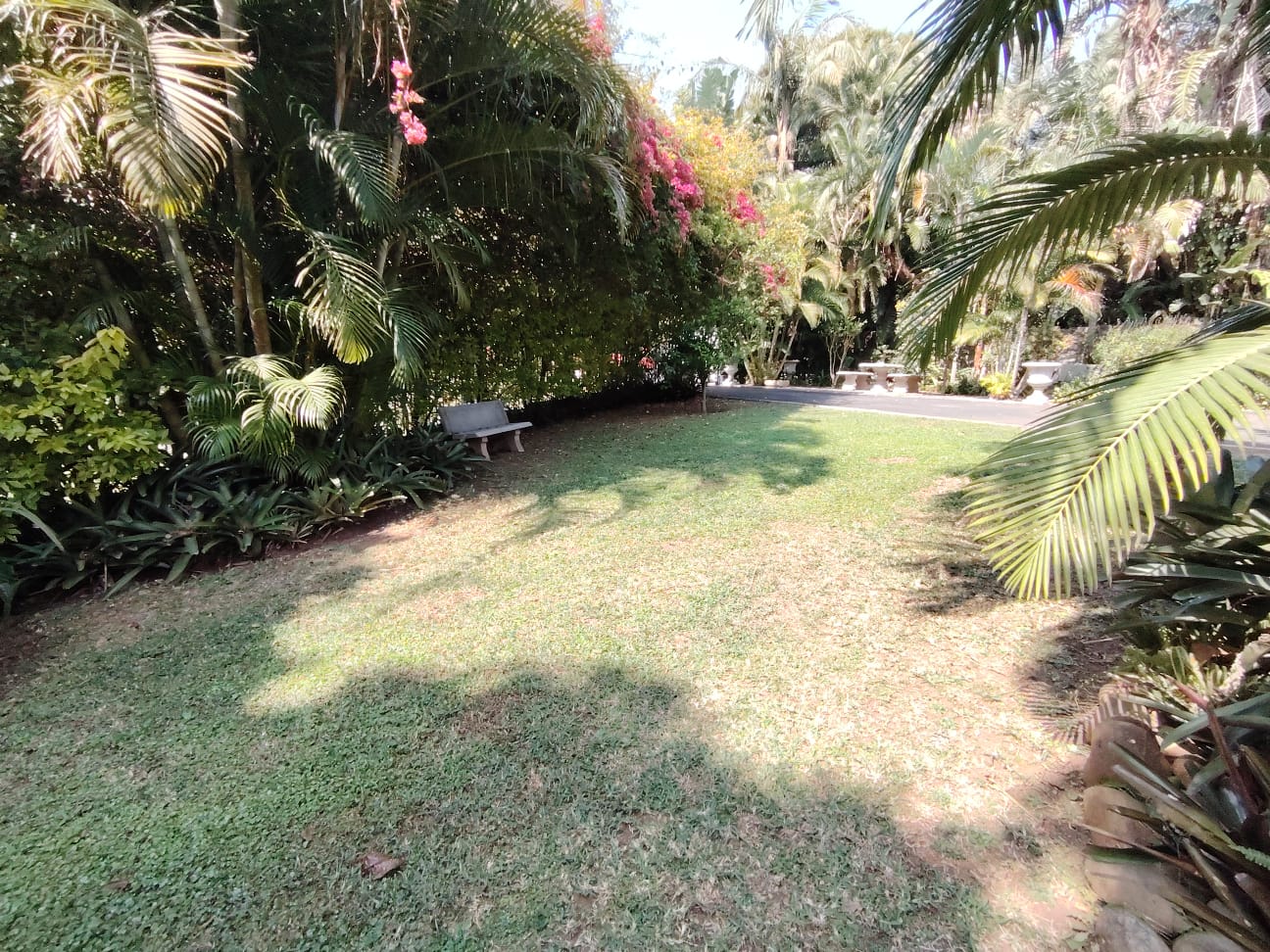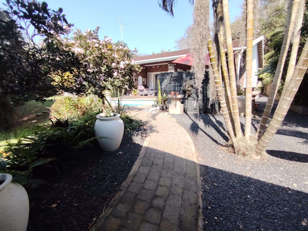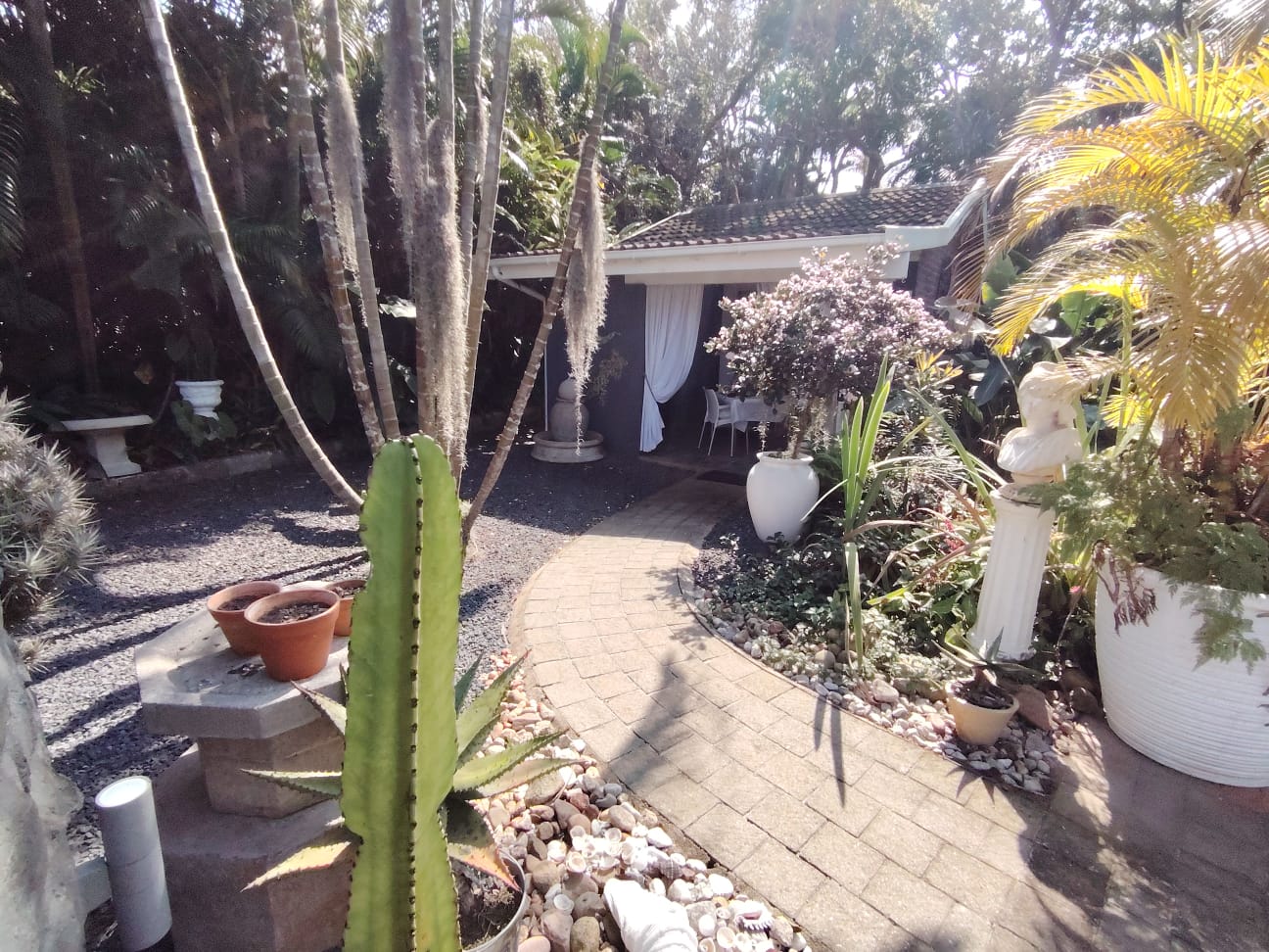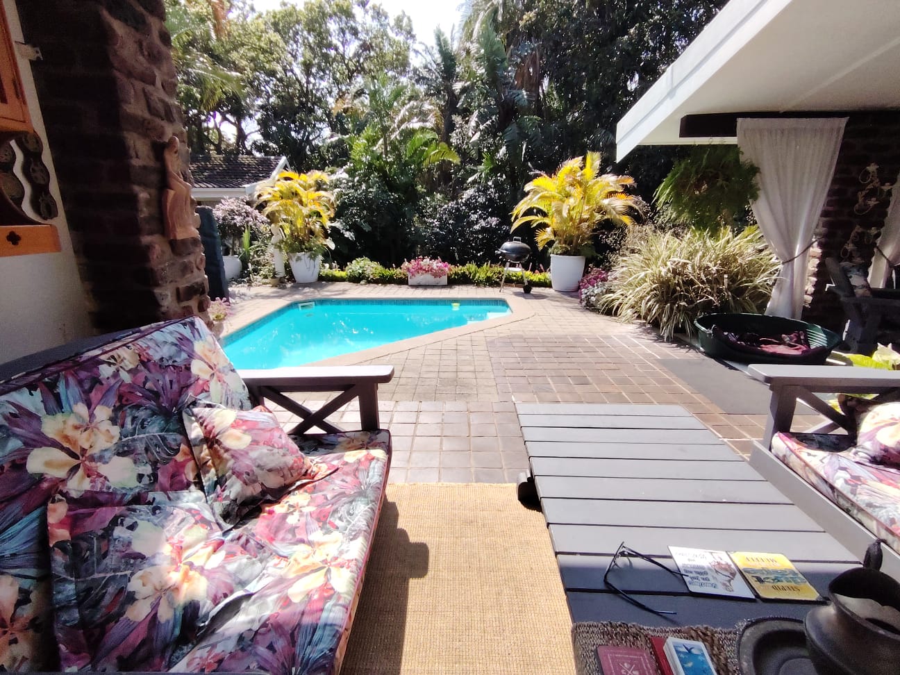 The living areas have been thoughtfully designed to embrace the South Coast lifestyle. Large doors and windows open the home to the outdoors, with two of the bedrooms leading directly onto private patios that overlook the sparkling swimming pool and entertainment area. This seamless indoor-outdoor flow makes the home perfect for hosting, entertaining, or simply enjoying quiet afternoons in the sunshine. The well-manicured garden adds another layer of beauty, with tropical palm trees, vibrant plants, and charming seating nooks spread throughout, creating little corners of privacy and tranquillity.