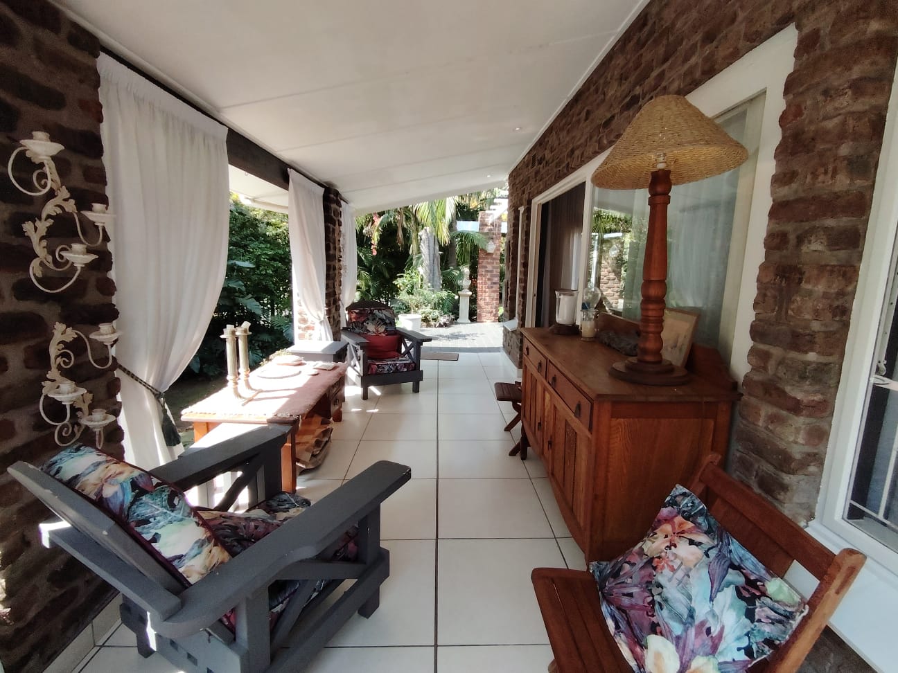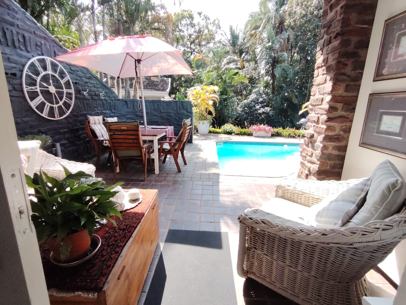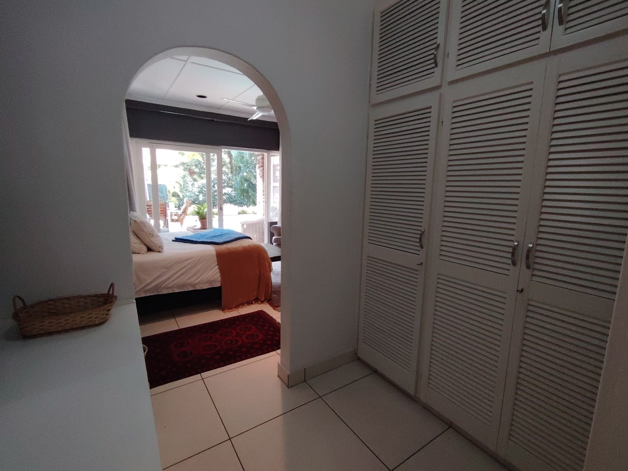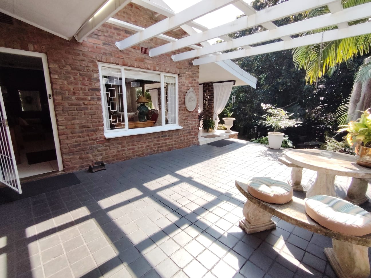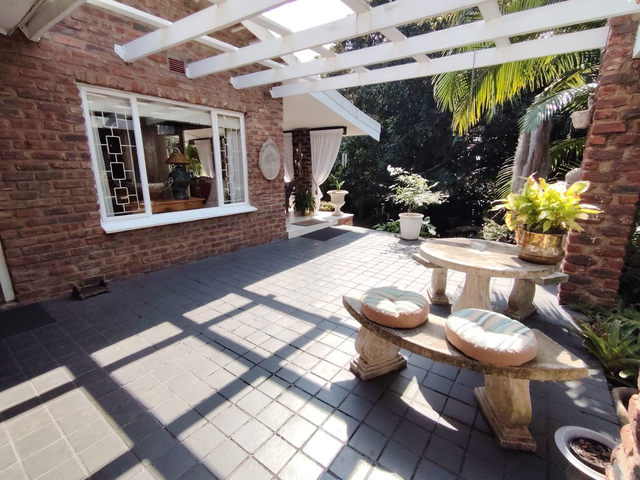The living areas have been thoughtfully designed to embrace the South Coast lifestyle. Large doors and windows open the home to the outdoors, with two of the bedrooms leading directly onto private patios that overlook the sparkling swimming pool and entertainment area. This seamless indoor-outdoor flow makes the home perfect for hosting, entertaining, or simply enjoying quiet afternoons in the sunshine. The well-manicured garden adds another layer of beauty, with tropical palm trees, vibrant plants, and charming seating nooks spread throughout, creating little corners of privacy and tranquillity.