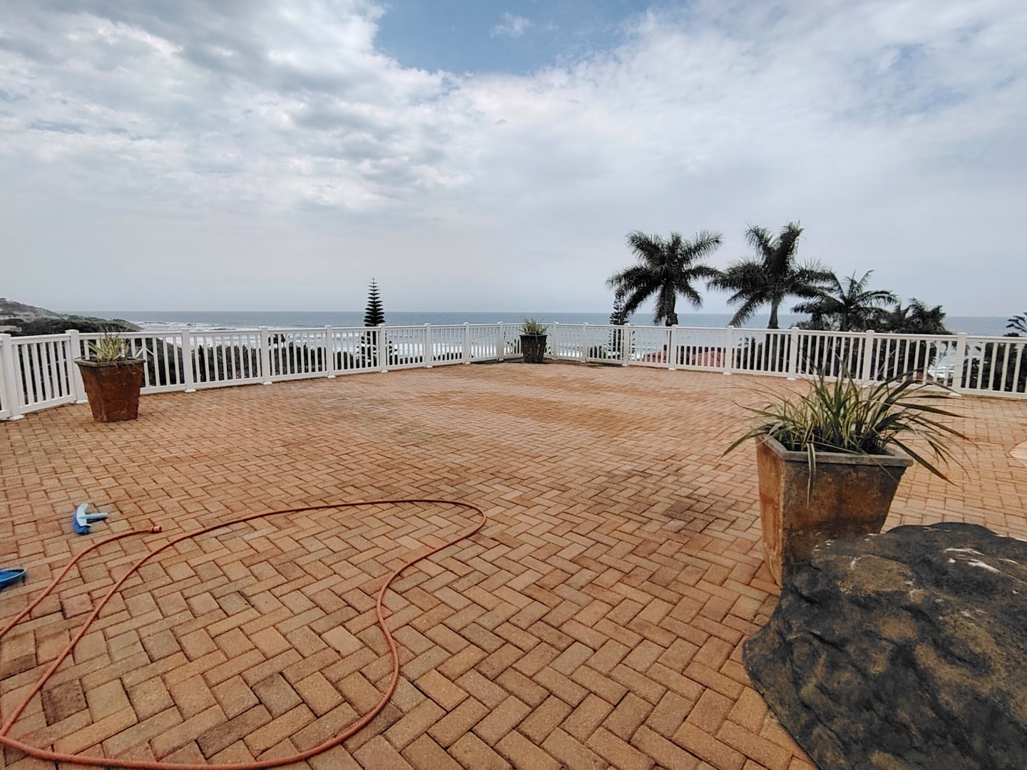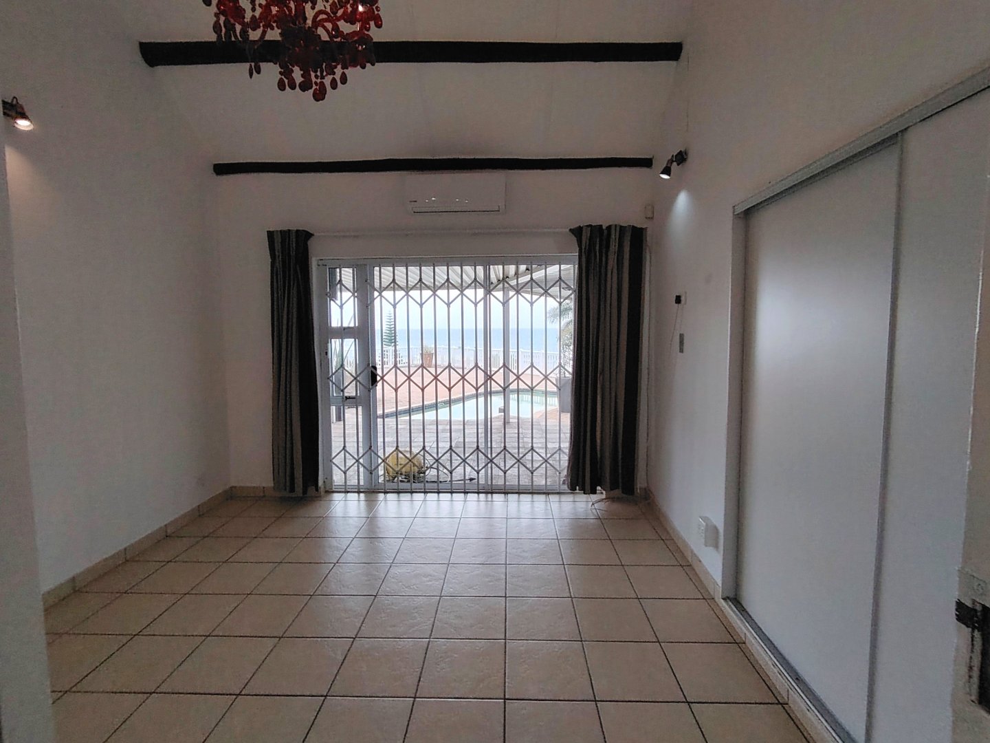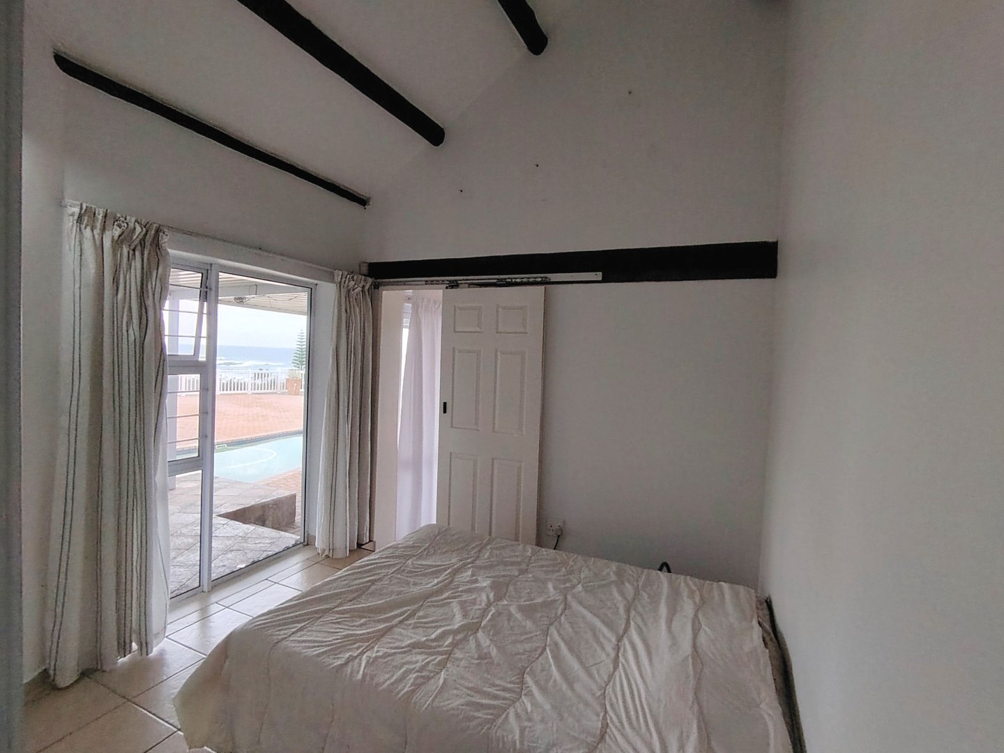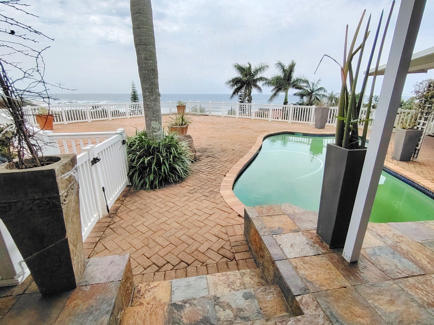 Take a walk through the property .... When entering the property via the electrical gate, the electrical double garages are to the left and the driveway takes you to the back of the home where the flat let is. Let's start with the gorgeous home first. With a few steps to the open plan balcony overlooking the ocean and the side garden where the two Jojo tanks and the borehole is situated. There are additional steps via the grass area to go into the home. When you enter the lounge via the glass stack doors the chandeliers through out the home will take your breath away. I am getting sidetracked again - back to the lounge area, the fiber is visible in the corner and then moving through an archway to the dining room / tv room and another glass sliding door overlooking the pool and balcony area. The first bedroom has a few steps up and the inverter is tucked away in the one walk in cupboard. Moving back to the lounge towards the spectacular kitchen with a red chandelier over the center island with granite tops through out. The electrical glass top and two eye level ovens will keep the Chef of the family busy - the scullery offers a spacious pantry and a laundry area. The cupboard space is the kitchen is a dream kitchen for any Chef and the TV for the cameras are visible while cooking food. All the doors are sea facing and overlooking the pool area. Now we are proceeding towards the rest of the home, down the corridor is the second bedroom to the right overlooking the pool area and all the bedrooms have an under cover patio area to enjoy sunrise. The full family bathroom is to the left and the second bedroom is to the left overlooking the pool and sea view. The third and fourth bedrooms have chandeliers and overlooking the under cover patio with sea views and access to the pool. The entrance hall gives easy access towards the flatlet. Finally the main bedroom is massive with a lot of cupboard space, walk in cupboard, under cover patio and sea view and a full gorgeous bathroom. Now we are moving around the home to the flat let. The entrance hall between the house and flat let gives more privacy to the occupants. Entering the flat let the lounge is big enough for a dining room space and a few steps to the kitchen or you can place a table and chair there. The bedroom has high ceilings and a bathroom with a shower. There is ample open parking for the flat let and for guests. The property is walking distance to the beach. The solar panels will keep your lights on during loadshedding.