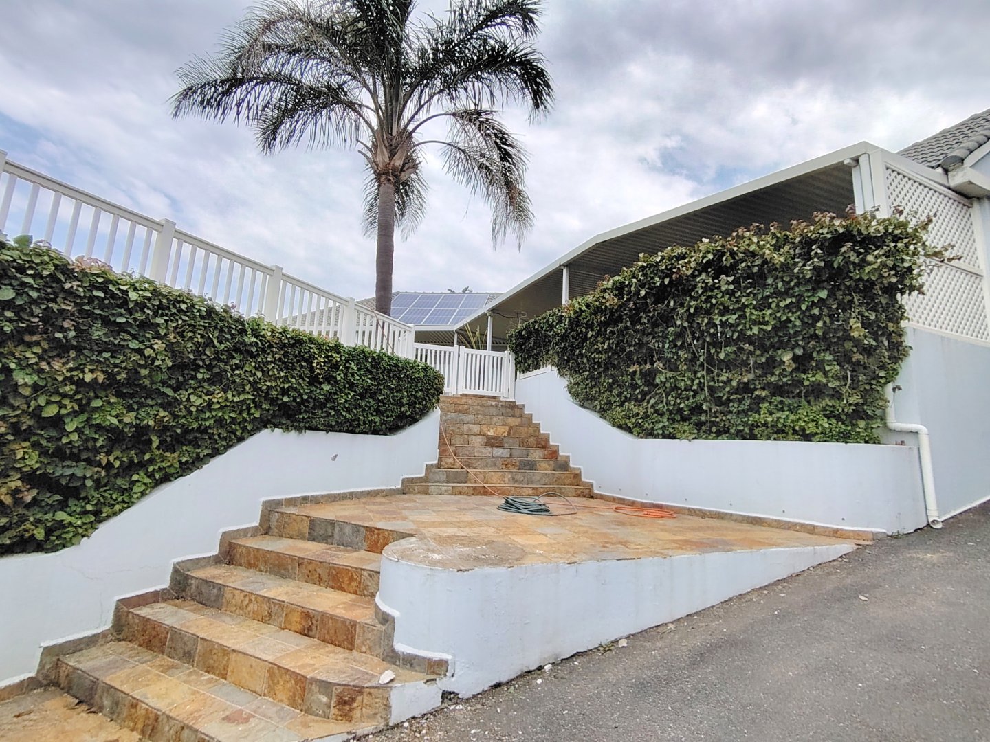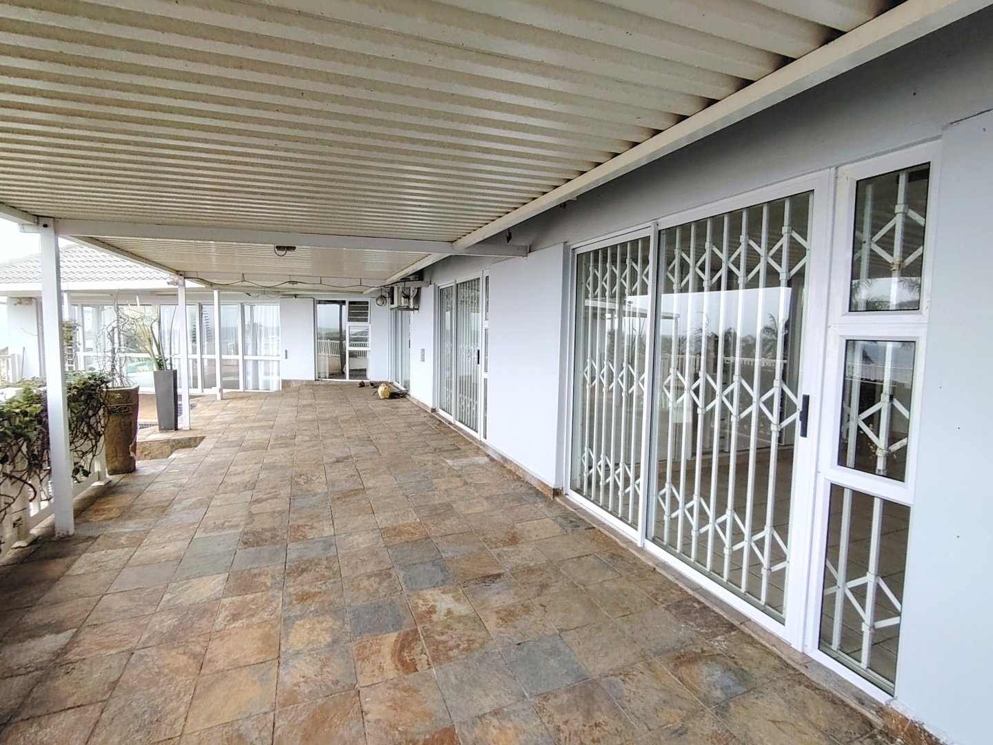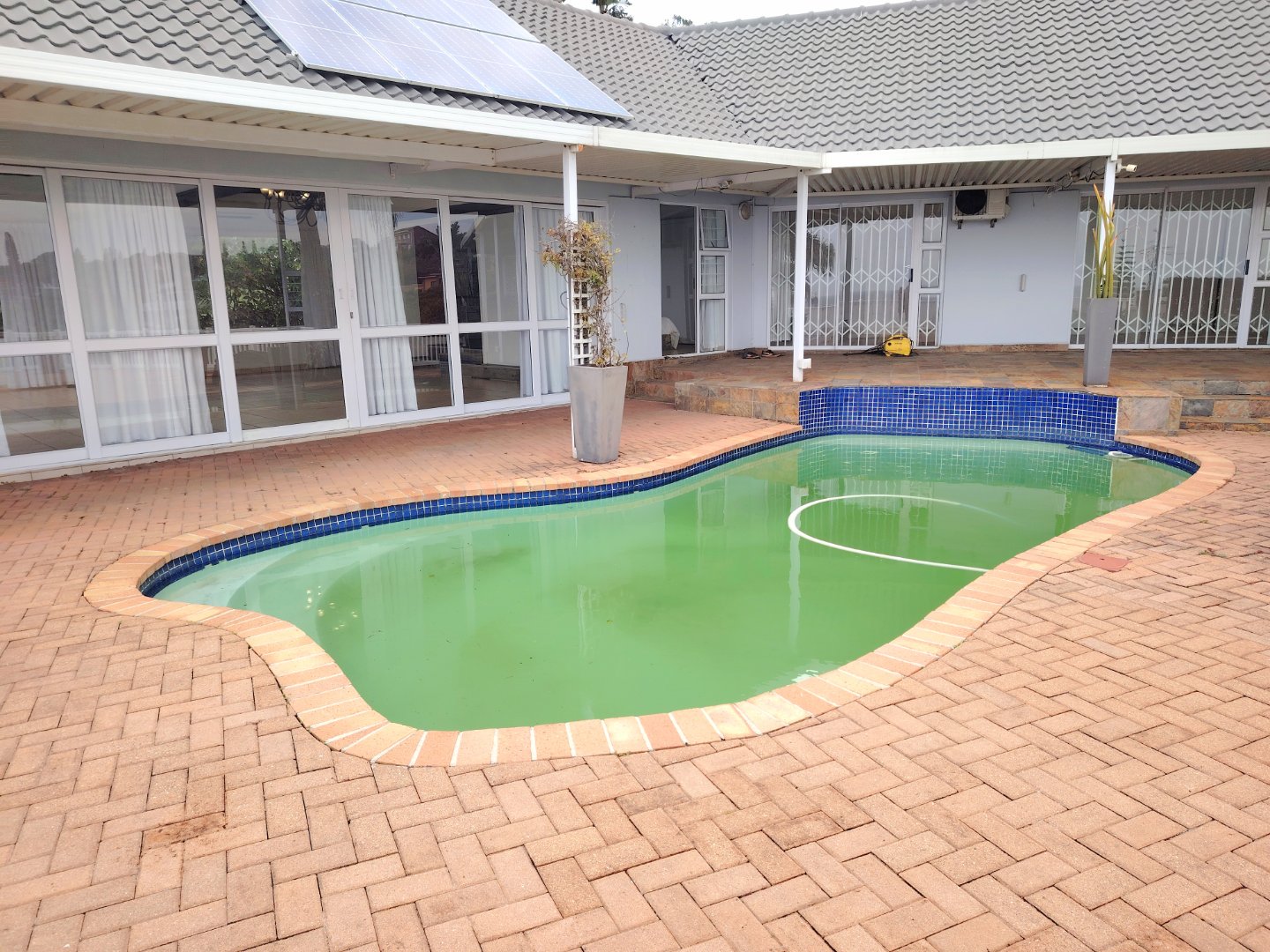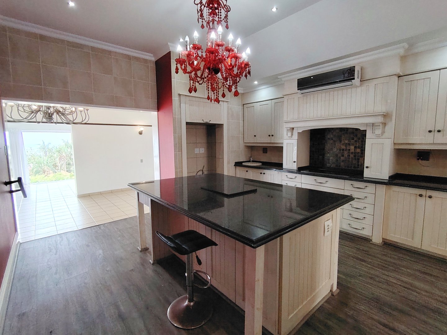 Take a walk through the property .... When entering the property via the electrical gate, the electrical double garages are to the left and the driveway takes you to the back of the home where the flat let is. Let's start with the gorgeous home first. With a few steps to the open plan balcony overlooking the ocean and the side garden where the two Jojo tanks and the borehole is situated. There are additional steps via the grass area to go into the home. When you enter the lounge via the glass stack doors the chandeliers through out the home will take your breath away. I am getting sidetracked again - back to the lounge area, the fiber is visible in the corner and then moving through an archway to the dining room / tv room and another glass sliding door overlooking the pool and balcony area. The first bedroom has a few steps up and the inverter is tucked away in the one walk in cupboard. Moving back to the lounge towards the spectacular kitchen with a red chandelier over the center island with granite tops through out. The electrical glass top and two eye level ovens will keep the Chef of the family busy - the scullery offers a spacious pantry and a laundry area. The cupboard space is the kitchen is a dream kitchen for any Chef and the TV for the cameras are visible while cooking food. All the doors are sea facing and overlooking the pool area. Now we are proceeding towards the rest of the home, down the corridor is the second bedroom to the right overlooking the pool area and all the bedrooms have an under cover patio area to enjoy sunrise. The full family bathroom is to the left and the second bedroom is to the left overlooking the pool and sea view. The third and fourth bedrooms have chandeliers and overlooking the under cover patio with sea views and access to the pool. The entrance hall gives easy access towards the flatlet. Finally the main bedroom is massive with a lot of cupboard space, walk in cupboard, under cover patio and sea view and a full gorgeous bathroom. Now we are moving around the home to the flat let. The entrance hall between the house and flat let gives more privacy to the occupants. Entering the flat let the lounge is big enough for a dining room space and a few steps to the kitchen or you can place a table and chair there. The bedroom has high ceilings and a bathroom with a shower. There is ample open parking for the flat let and for guests. The property is walking distance to the beach. The solar panels will keep your lights on during loadshedding.