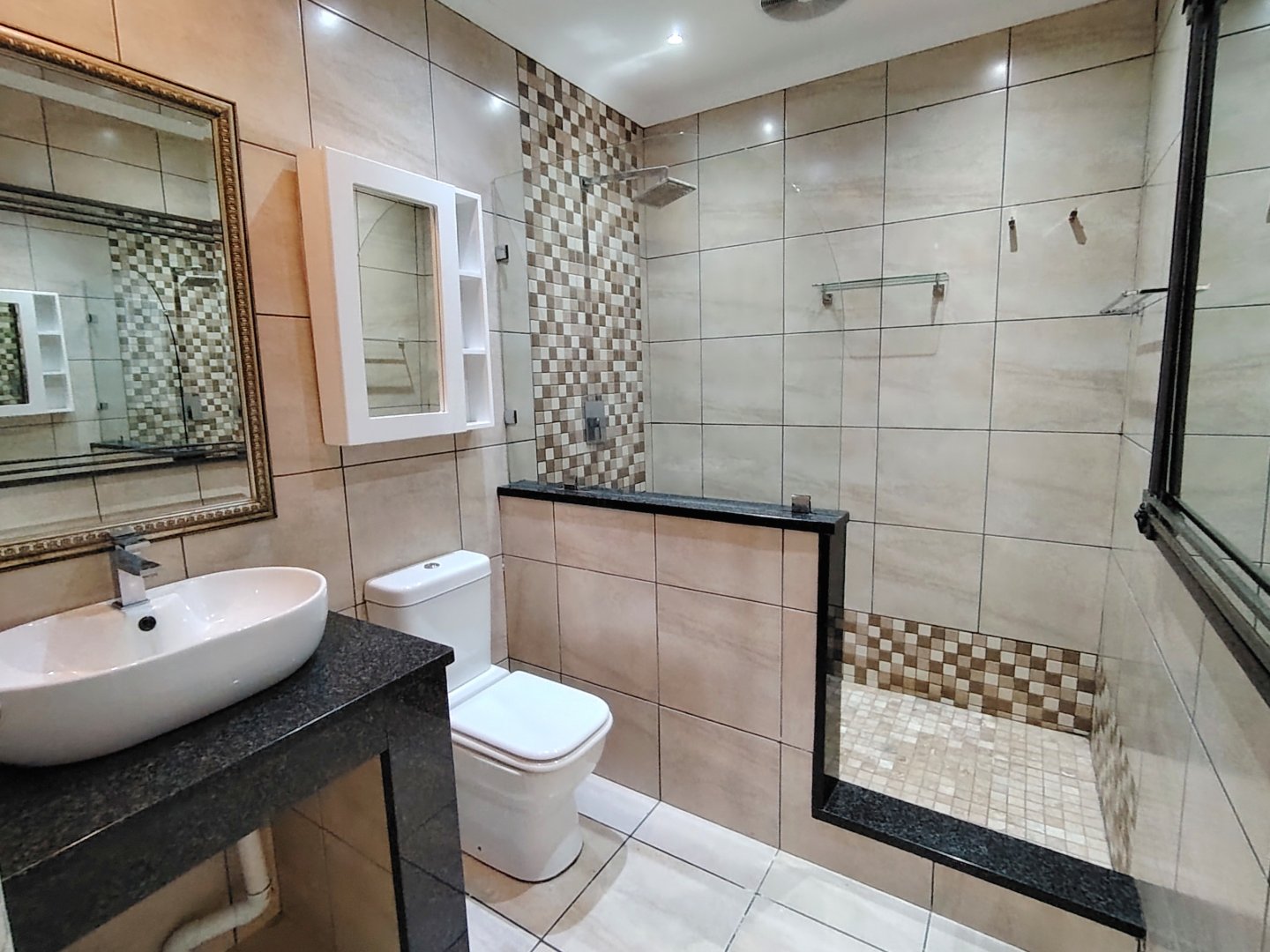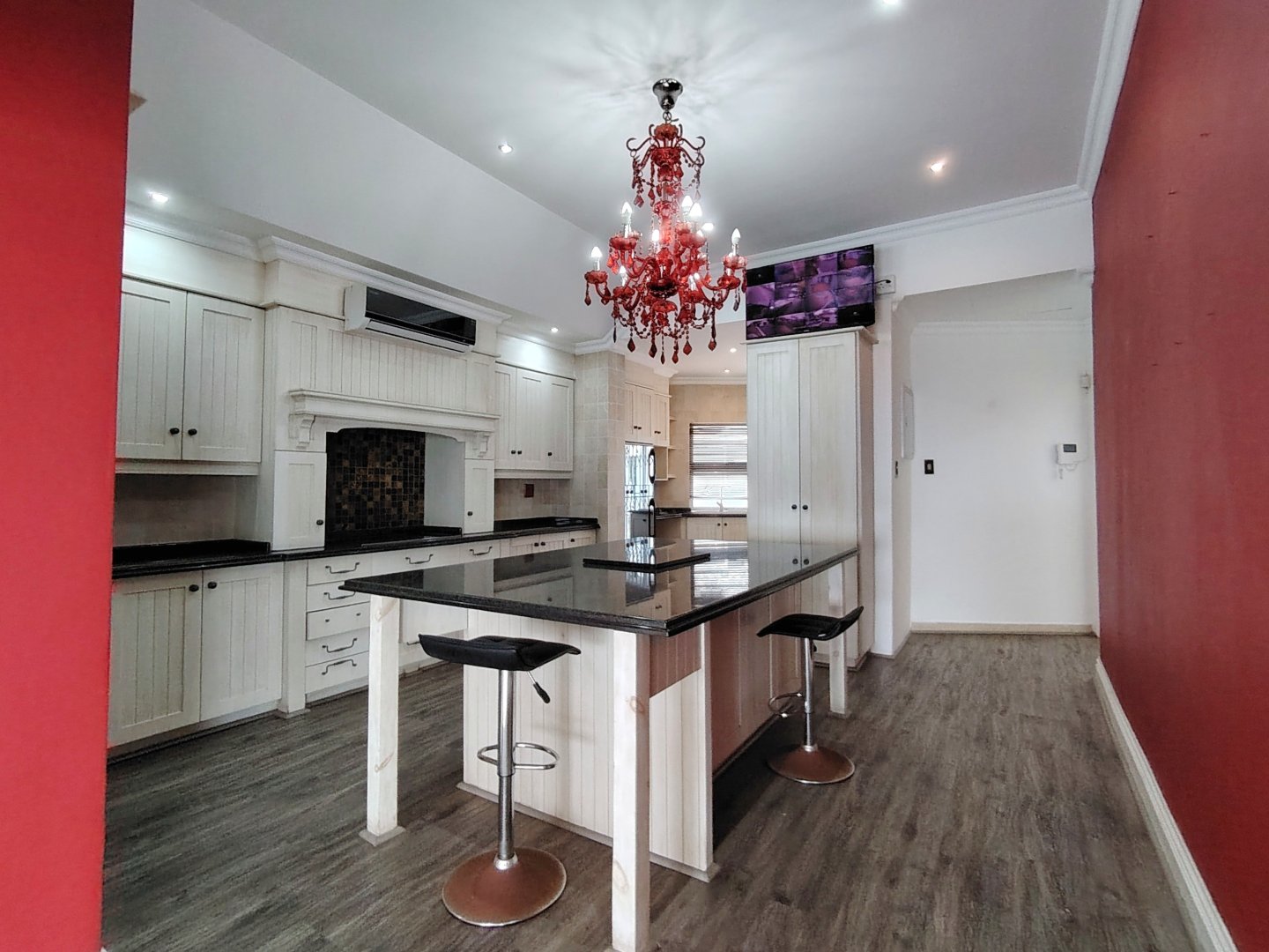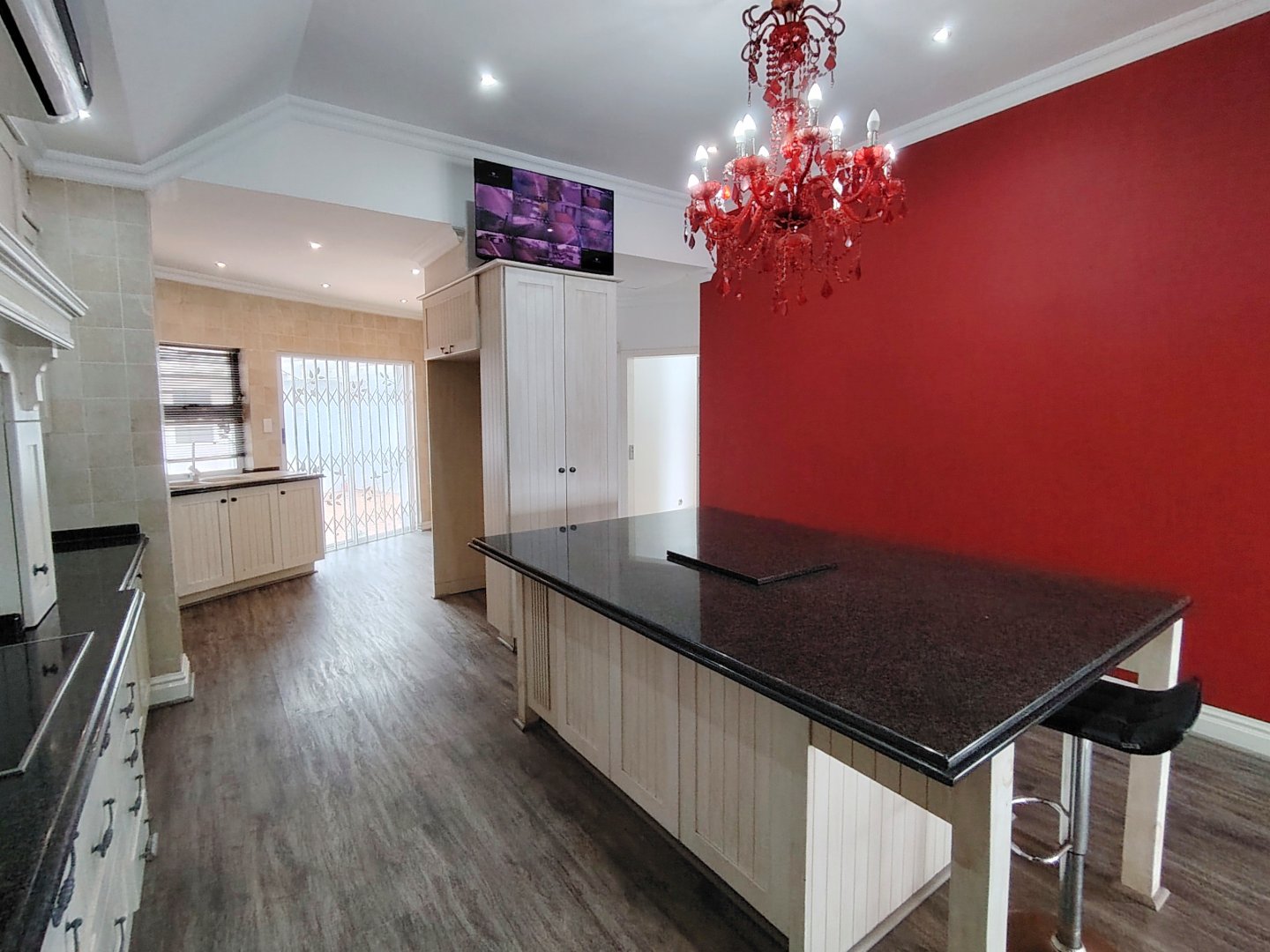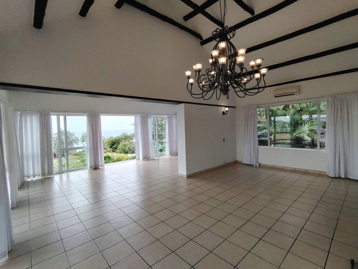 Take a walk through the property .... When entering the property via the electrical gate, the electrical double garages are to the left and the driveway takes you to the back of the home where the flat let is. Let's start with the gorgeous home first. With a few steps to the open plan balcony overlooking the ocean and the side garden where the two Jojo tanks and the borehole is situated. There are additional steps via the grass area to go into the home. When you enter the lounge via the glass stack doors the chandeliers through out the home will take your breath away. I am getting sidetracked again - back to the lounge area, the fiber is visible in the corner and then moving through an archway to the dining room / tv room and another glass sliding door overlooking the pool and balcony area. The first bedroom has a few steps up and the inverter is tucked away in the one walk in cupboard. Moving back to the lounge towards the spectacular kitchen with a red chandelier over the center island with granite tops through out. The electrical glass top and two eye level ovens will keep the Chef of the family busy - the scullery offers a spacious pantry and a laundry area. The cupboard space is the kitchen is a dream kitchen for any Chef and the TV for the cameras are visible while cooking food. All the doors are sea facing and overlooking the pool area. Now we are proceeding towards the rest of the home, down the corridor is the second bedroom to the right overlooking the pool area and all the bedrooms have an under cover patio area to enjoy sunrise. The full family bathroom is to the left and the second bedroom is to the left overlooking the pool and sea view. The third and fourth bedrooms have chandeliers and overlooking the under cover patio with sea views and access to the pool. The entrance hall gives easy access towards the flatlet. Finally the main bedroom is massive with a lot of cupboard space, walk in cupboard, under cover patio and sea view and a full gorgeous bathroom. Now we are moving around the home to the flat let. The entrance hall between the house and flat let gives more privacy to the occupants. Entering the flat let the lounge is big enough for a dining room space and a few steps to the kitchen or you can place a table and chair there. The bedroom has high ceilings and a bathroom with a shower. There is ample open parking for the flat let and for guests. The property is walking distance to the beach. The solar panels will keep your lights on during loadshedding.