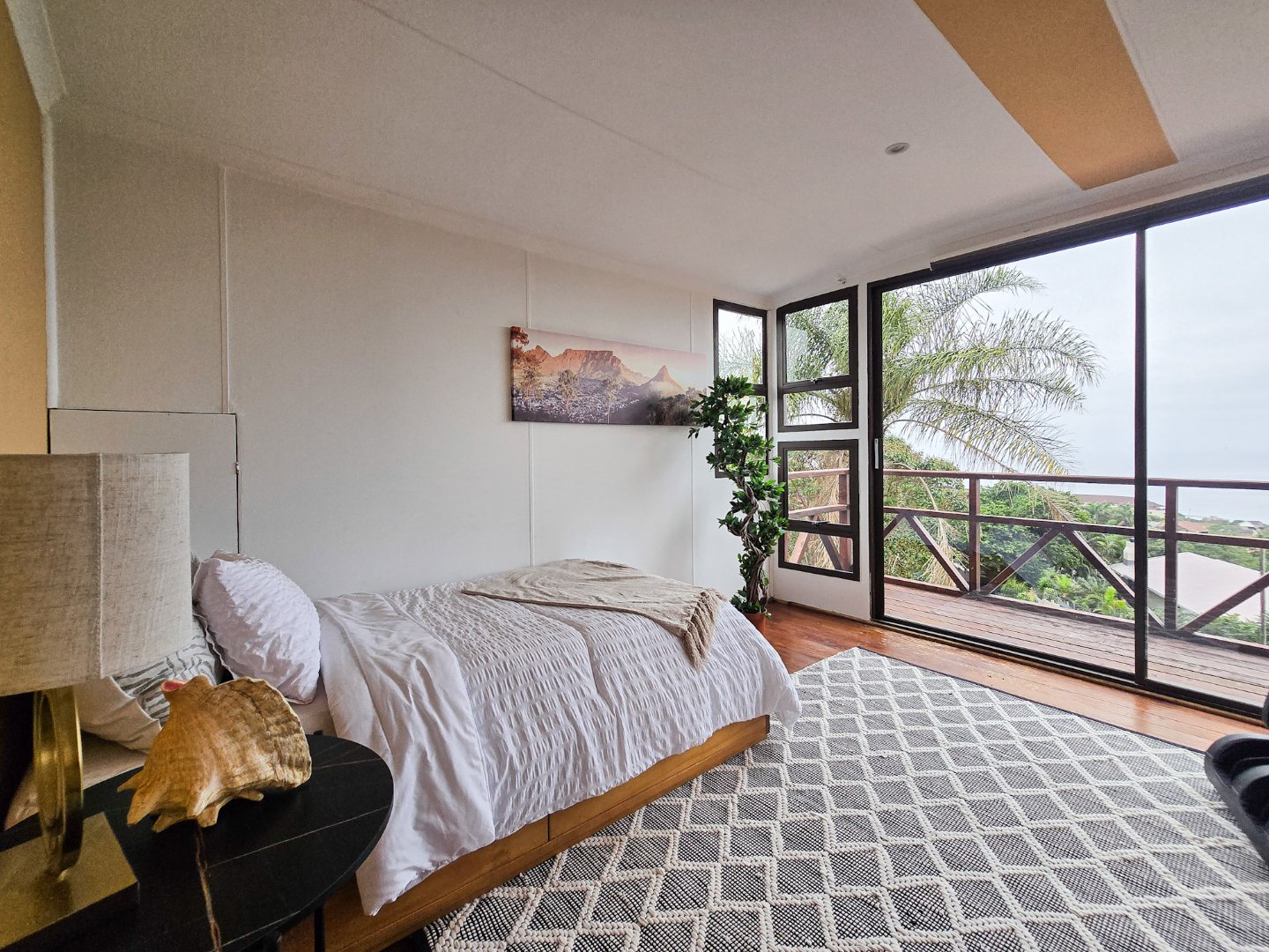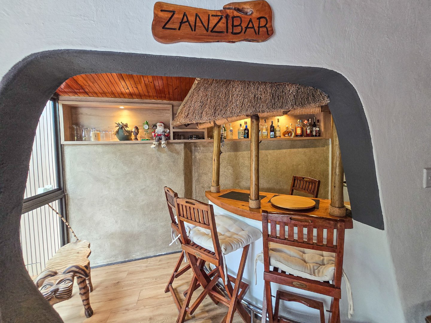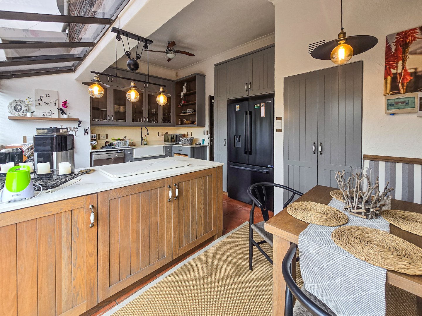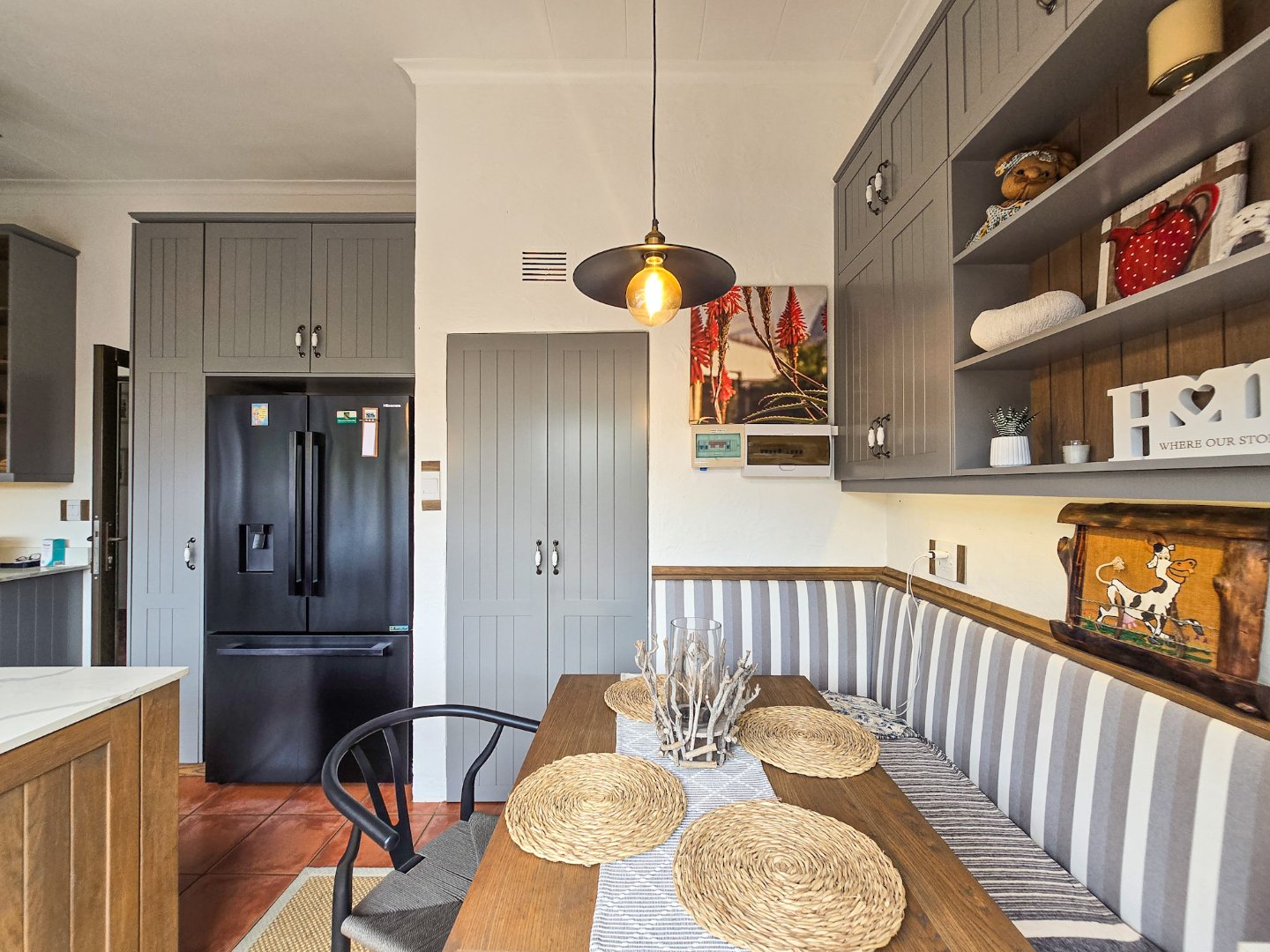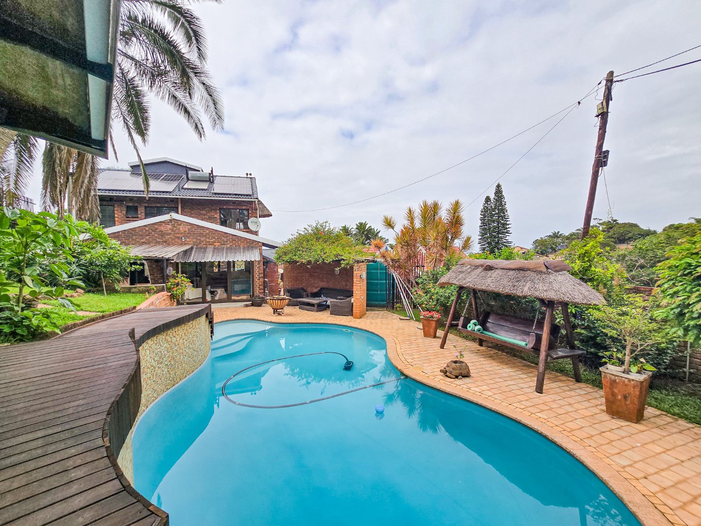 Perched to capture panoramic sea views, this home is waiting for a new owner. On the bottom level, you’ll find two lounges, the first lounge treats you to sea views, while the second opens directly onto the inviting pool area. A stylish bar is designed off the lounge, and the built-in braai and pizza oven is off this lounge as well. Step out to the pool area where a lovely pool and a storeroom complete the outdoor experience. The level also features a lovely kitchen with a 5-plate gas hob, granite tops, and a fairly new designer layout. Skylights are in the kitchen for natural light, complemented by a ceiling fan and a built-in sitting area for casual meals. A convenient toilet and basin on this level adds to everyday practicality.