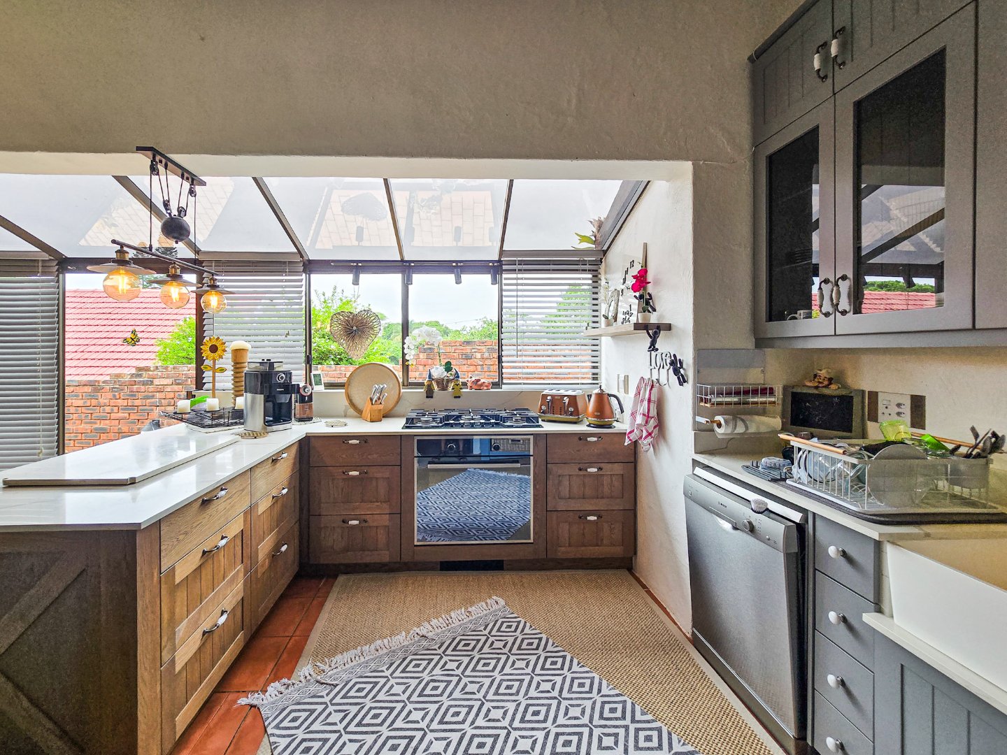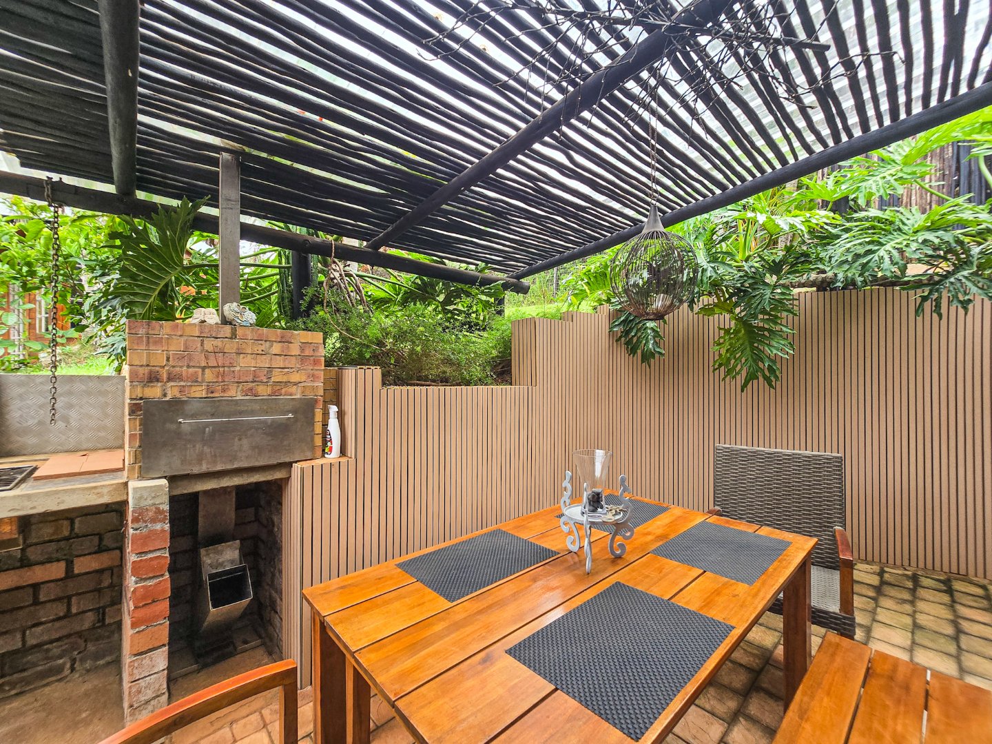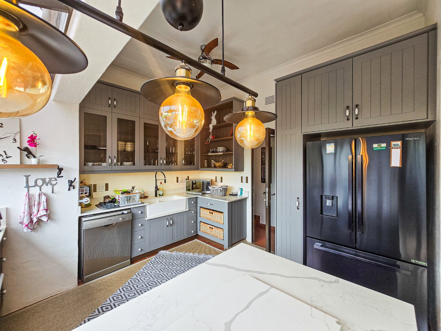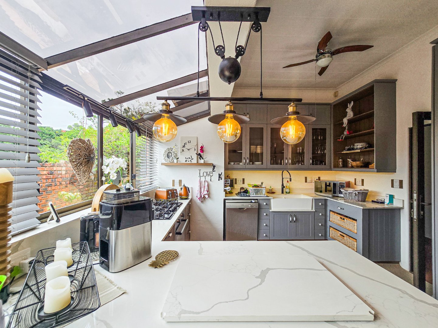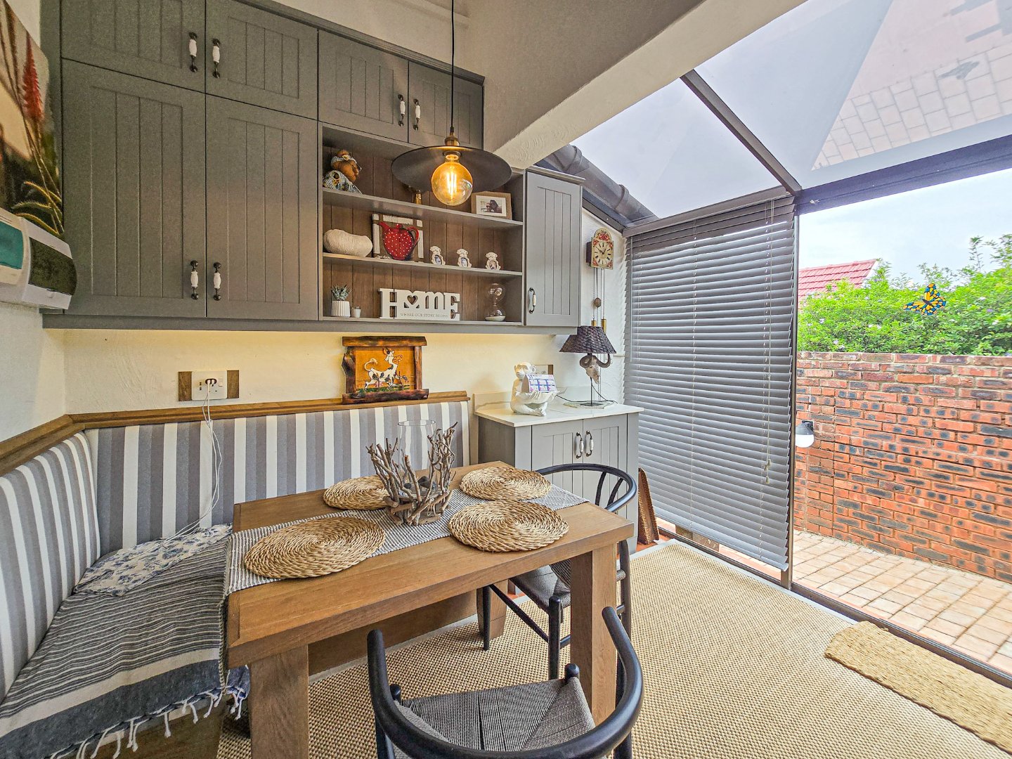 Perched to capture panoramic sea views, this home is waiting for a new owner. On the bottom level, you’ll find two lounges, the first lounge treats you to sea views, while the second opens directly onto the inviting pool area. A stylish bar is designed off the lounge, and the built-in braai and pizza oven is off this lounge as well. Step out to the pool area where a lovely pool and a storeroom complete the outdoor experience. The level also features a lovely kitchen with a 5-plate gas hob, granite tops, and a fairly new designer layout. Skylights are in the kitchen for natural light, complemented by a ceiling fan and a built-in sitting area for casual meals. A convenient toilet and basin on this level adds to everyday practicality.