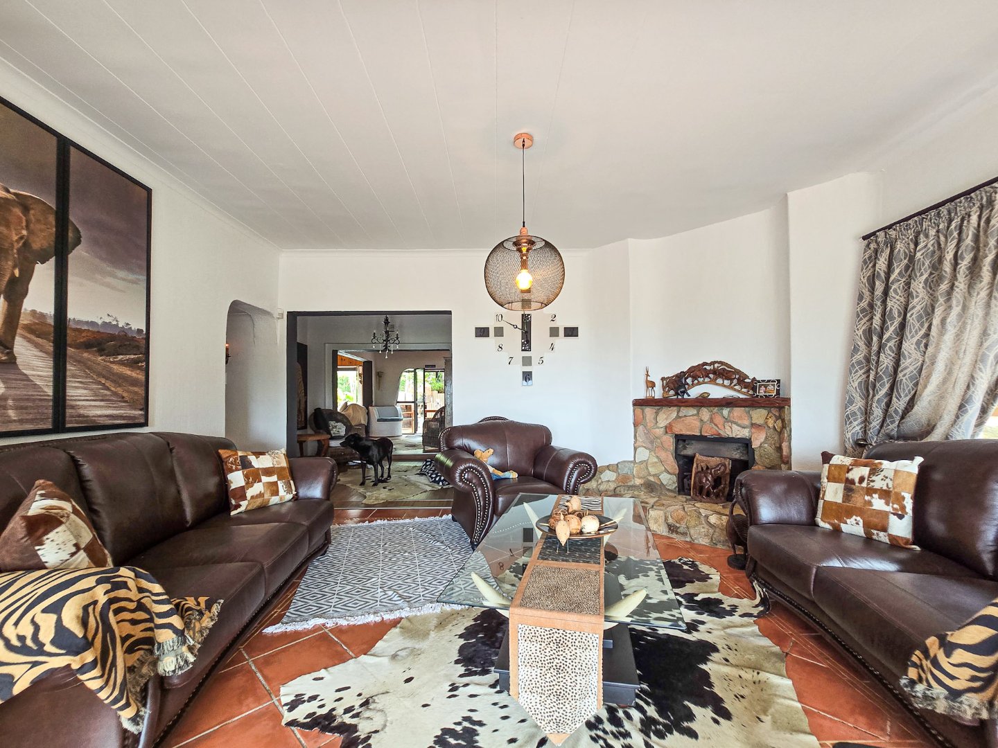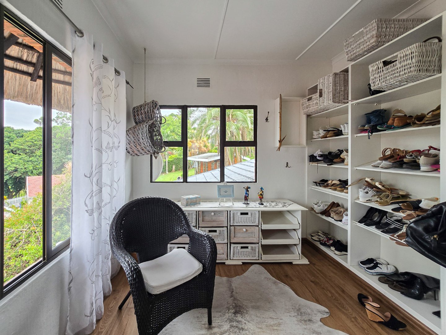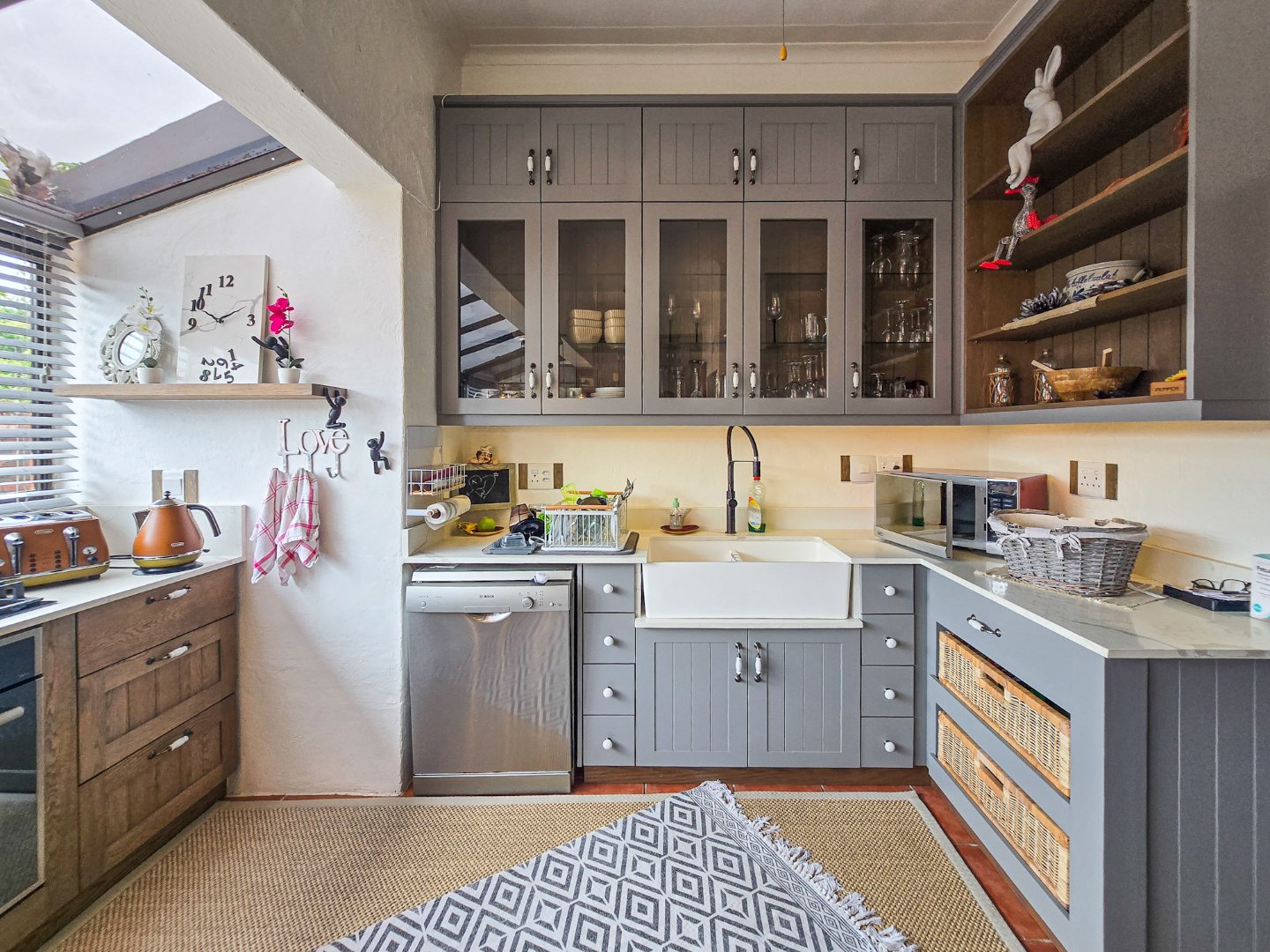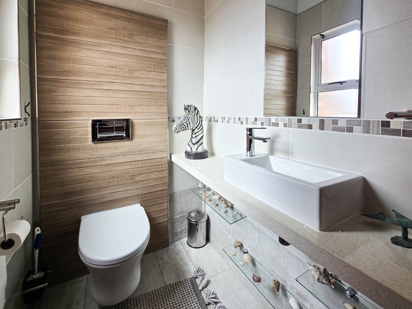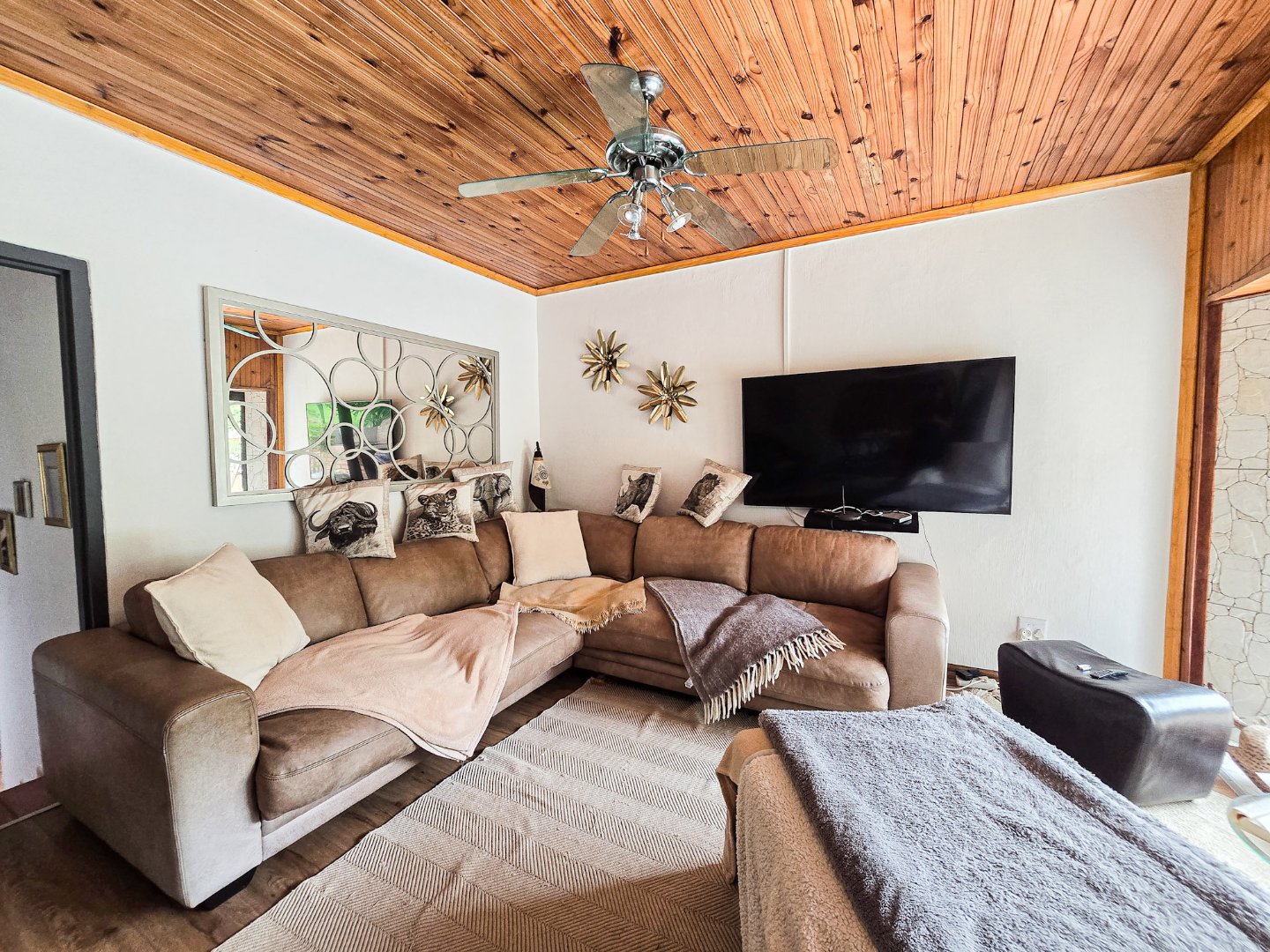 Perched to capture panoramic sea views, this home is waiting for a new owner. On the bottom level, you’ll find two lounges, the first lounge treats you to sea views, while the second opens directly onto the inviting pool area. A stylish bar is designed off the lounge, and the built-in braai and pizza oven is off this lounge as well. Step out to the pool area where a lovely pool and a storeroom complete the outdoor experience. The level also features a lovely kitchen with a 5-plate gas hob, granite tops, and a fairly new designer layout. Skylights are in the kitchen for natural light, complemented by a ceiling fan and a built-in sitting area for casual meals. A convenient toilet and basin on this level adds to everyday practicality.