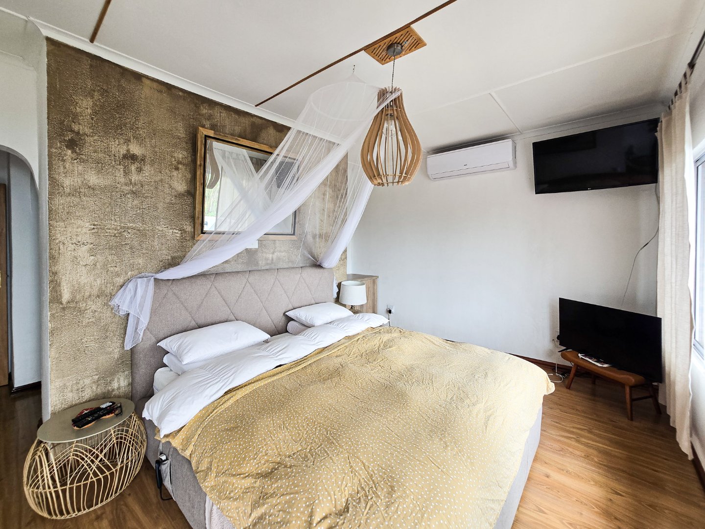 Ascending to the second floor, you’ll discover two generous bedrooms and two modern bathrooms. The main bedroom is expansive and private, boasting a balcony, breathtaking sea views, air conditioning, ample wardrobe space, and an en-suite. The second bedroom also offers sea views, a walk-in cupboard, and access to the modern bathroom serving this level.