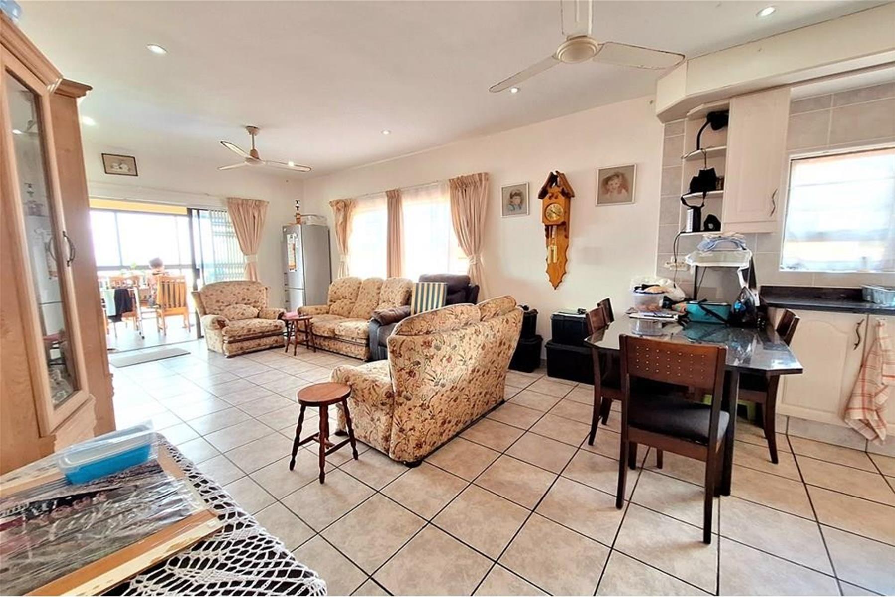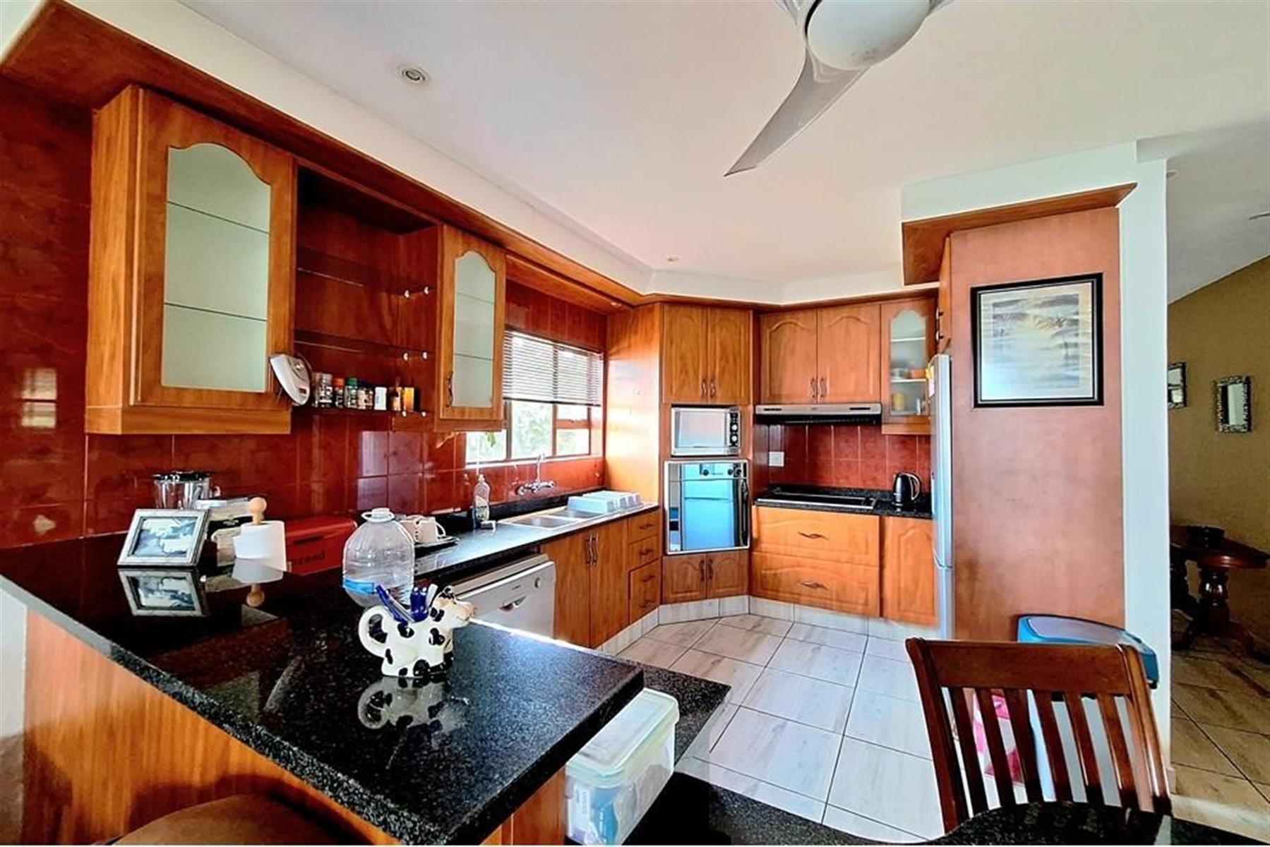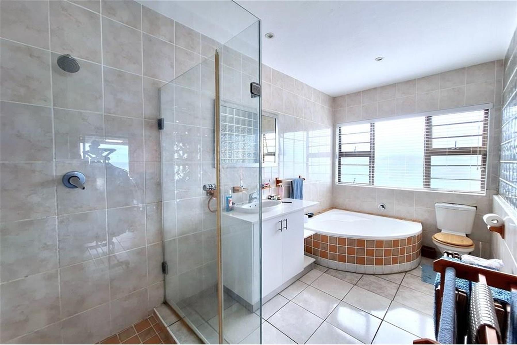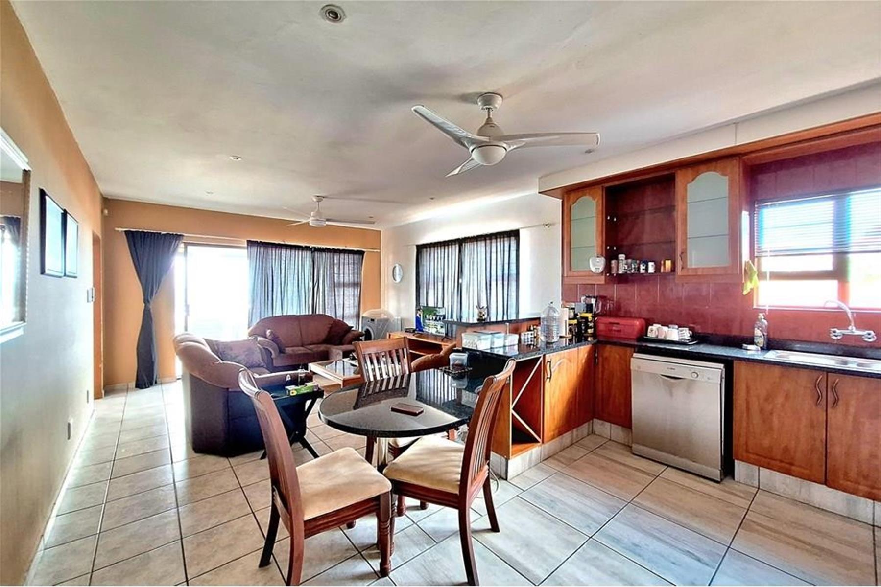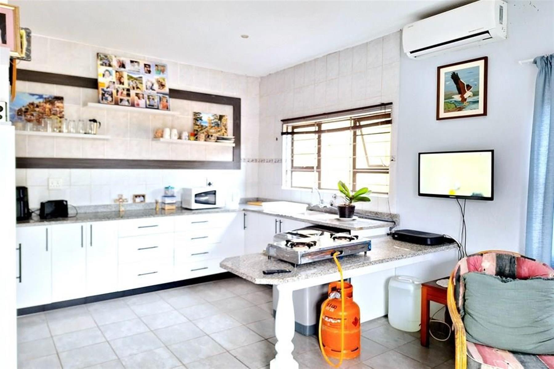 The main double-storey building boasts two generously sized 2-bedroom, 2-bathroom apartments—each with main en-suite bathrooms and breath-taking sea views. The downstairs unit features a large, enclosed veranda, while the upstairs unit offers an open veranda, perfect for enjoying the coastal breeze. Inside, you`ll find a seamless open-plan layout connecting the lounge/dining area to a well-equipped kitchen with ample built-in cupboards, an eye-level oven, and a hob.