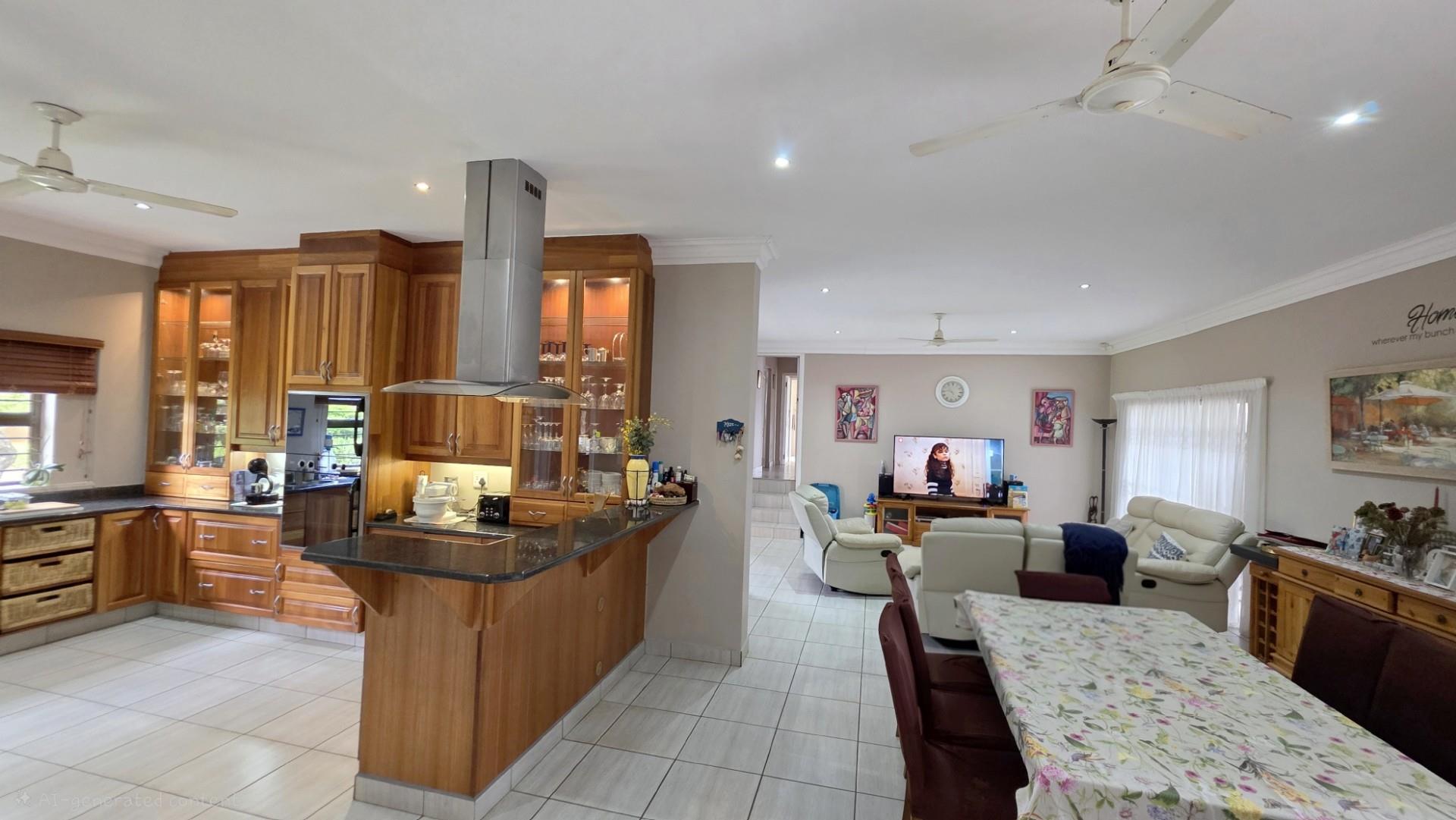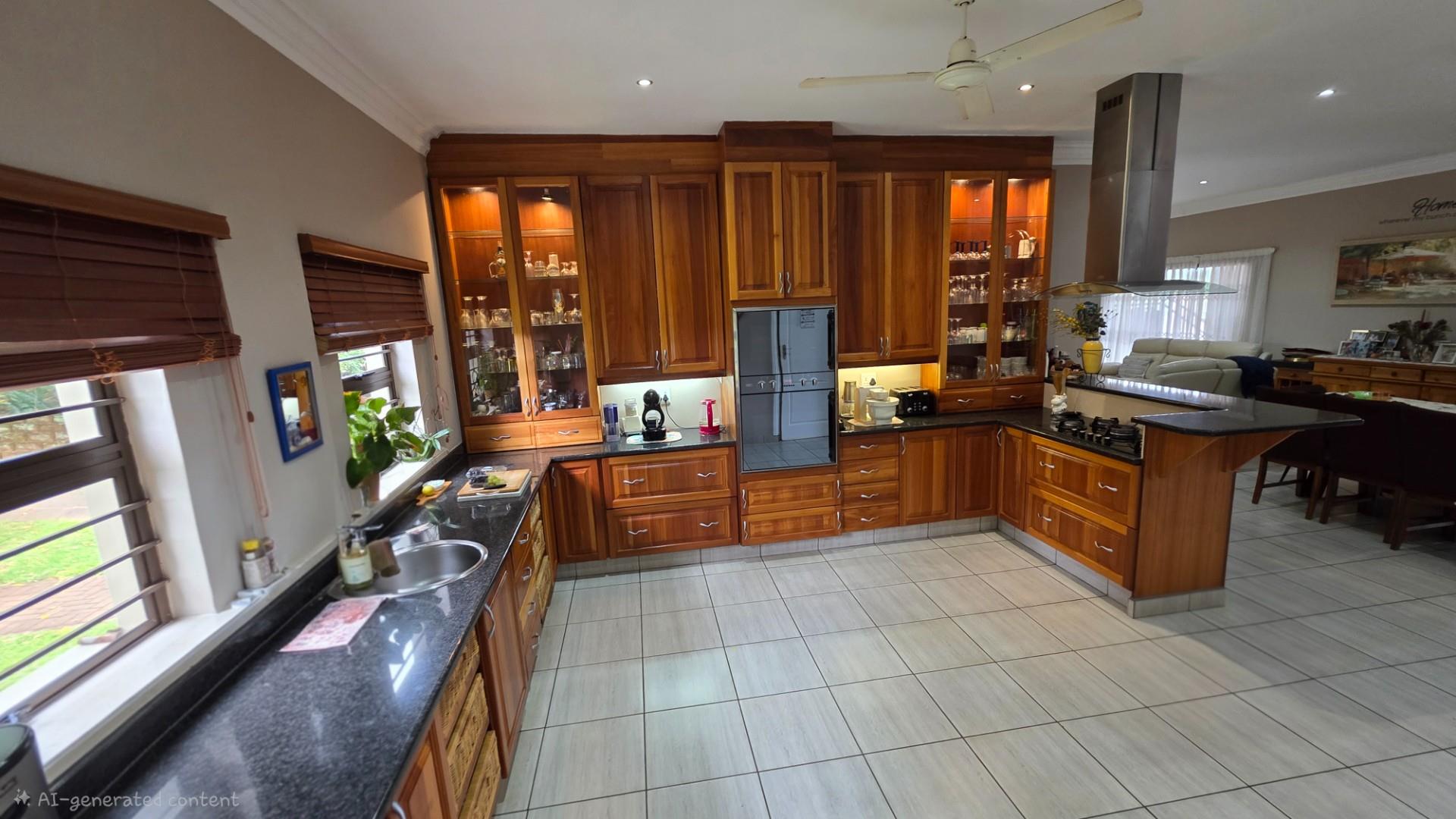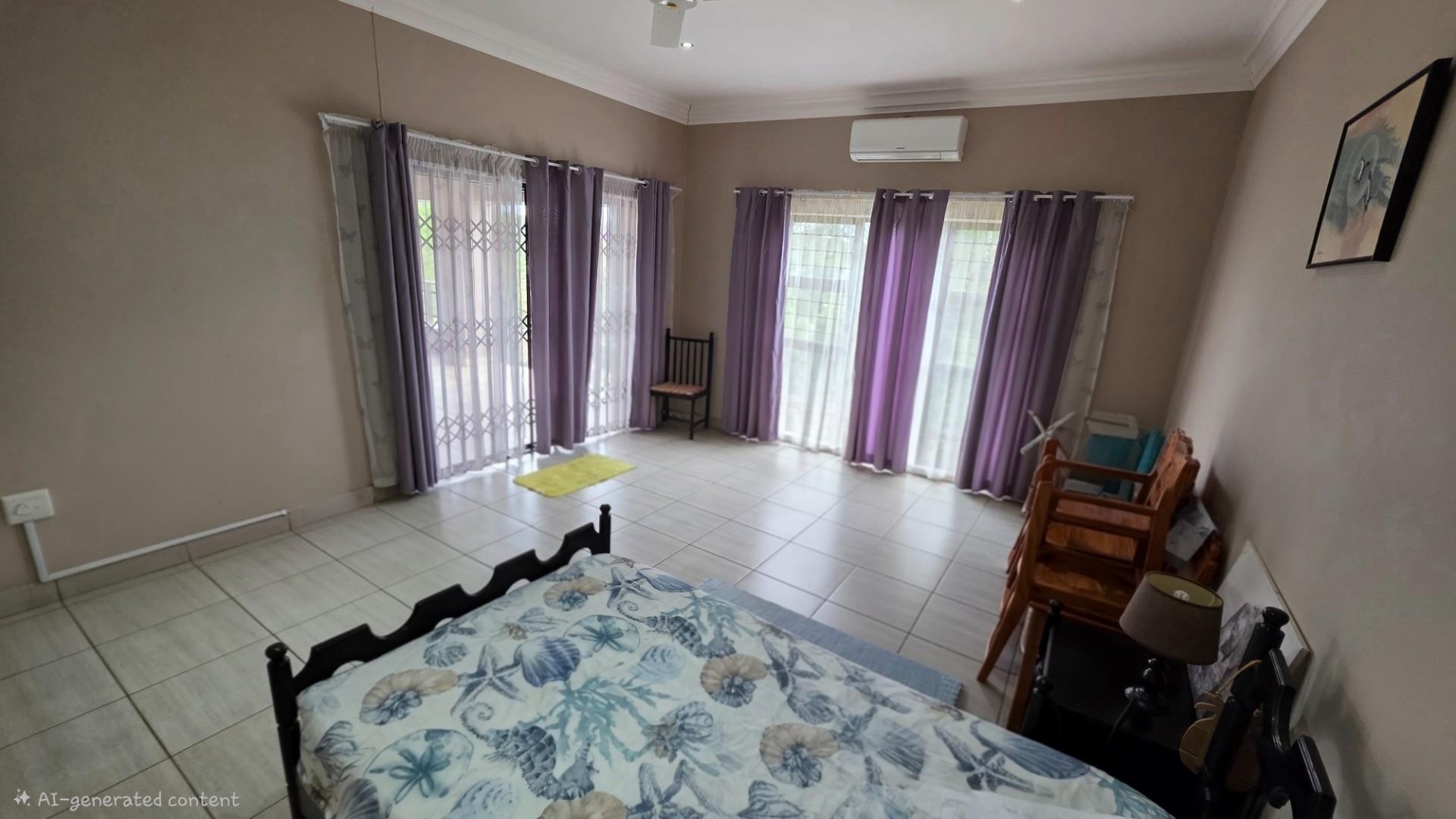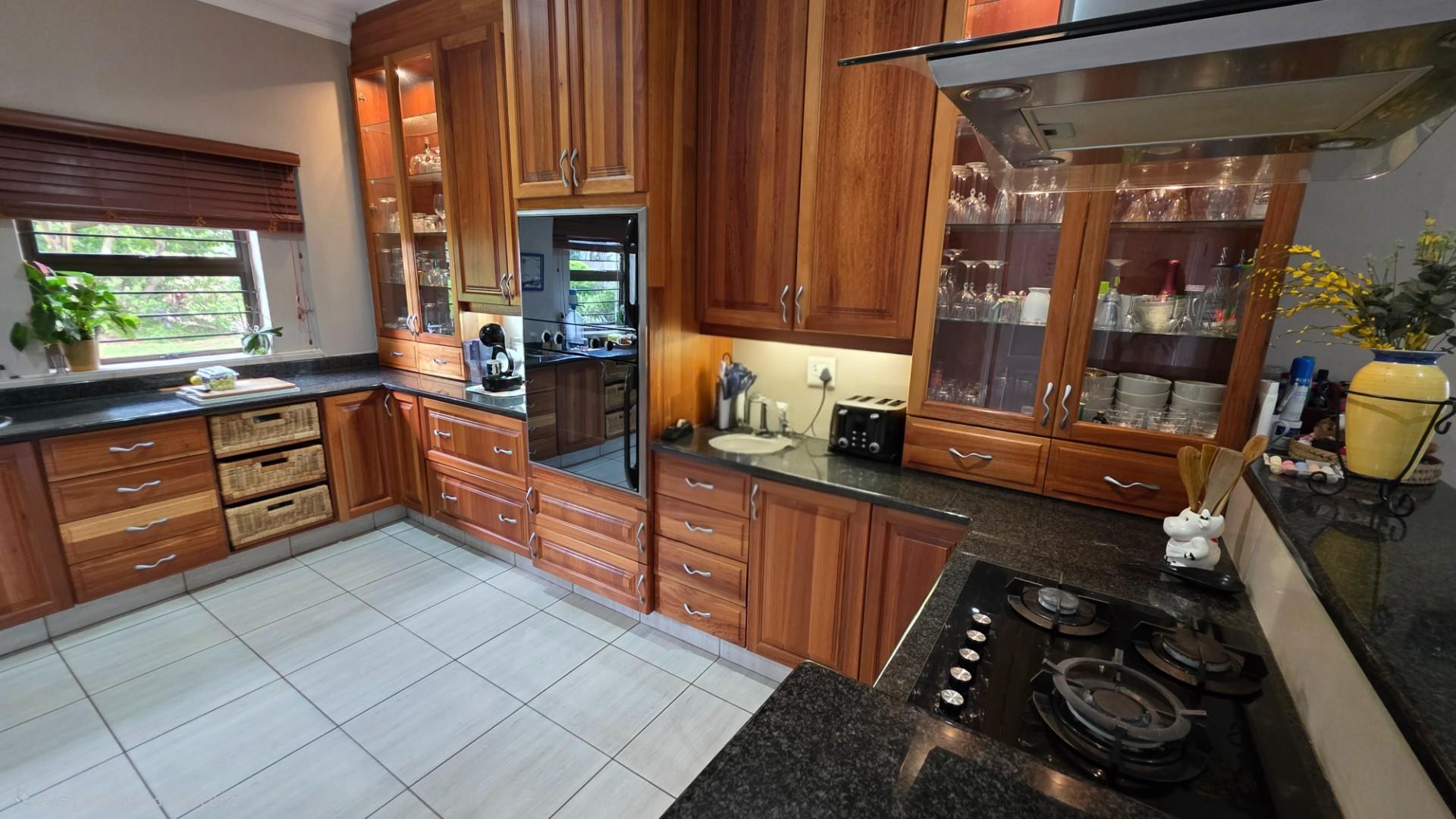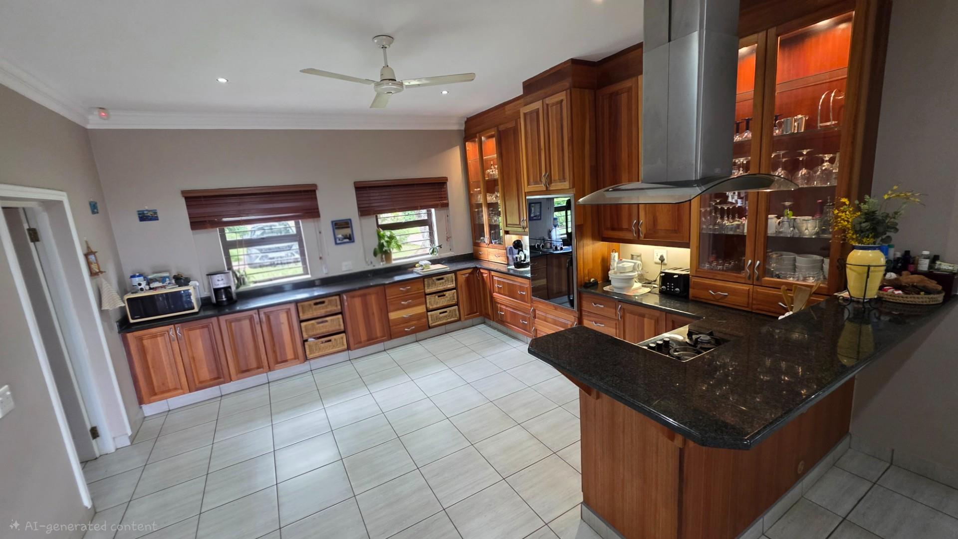 Picturesque home in a tranquil and idyllic Ramsgate. This home of grandeur proportions is situated at the end of a quiet street, surrounded by forestry and blue ocean vistas. The beautiful entrance hall leads you into an immaculately maintained home. with open plan lounge and dining room area, both with sliding doors offering access directly onto the undercover patio and maximises airflow through the home in the very humid months. In fact that is what makes this home so functional. It has been carefully designed and thought out to ensure maximum comfort. The kitchen is the absolute heart of this home. The mesmerizing dark wood cabinetry, with more than ample storage space, crisp granite counter tops, extractor fan, breakfast nook and an additional extension to the kitchen as a scullery which allows all of your bigger appliances to be separate from the main kitchen.
