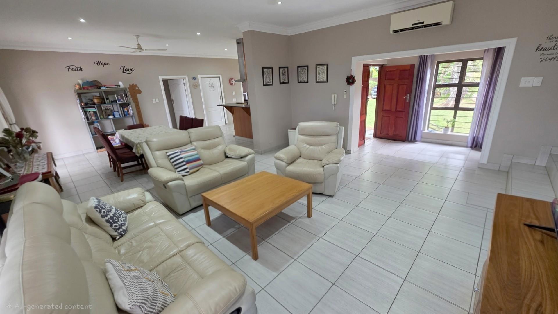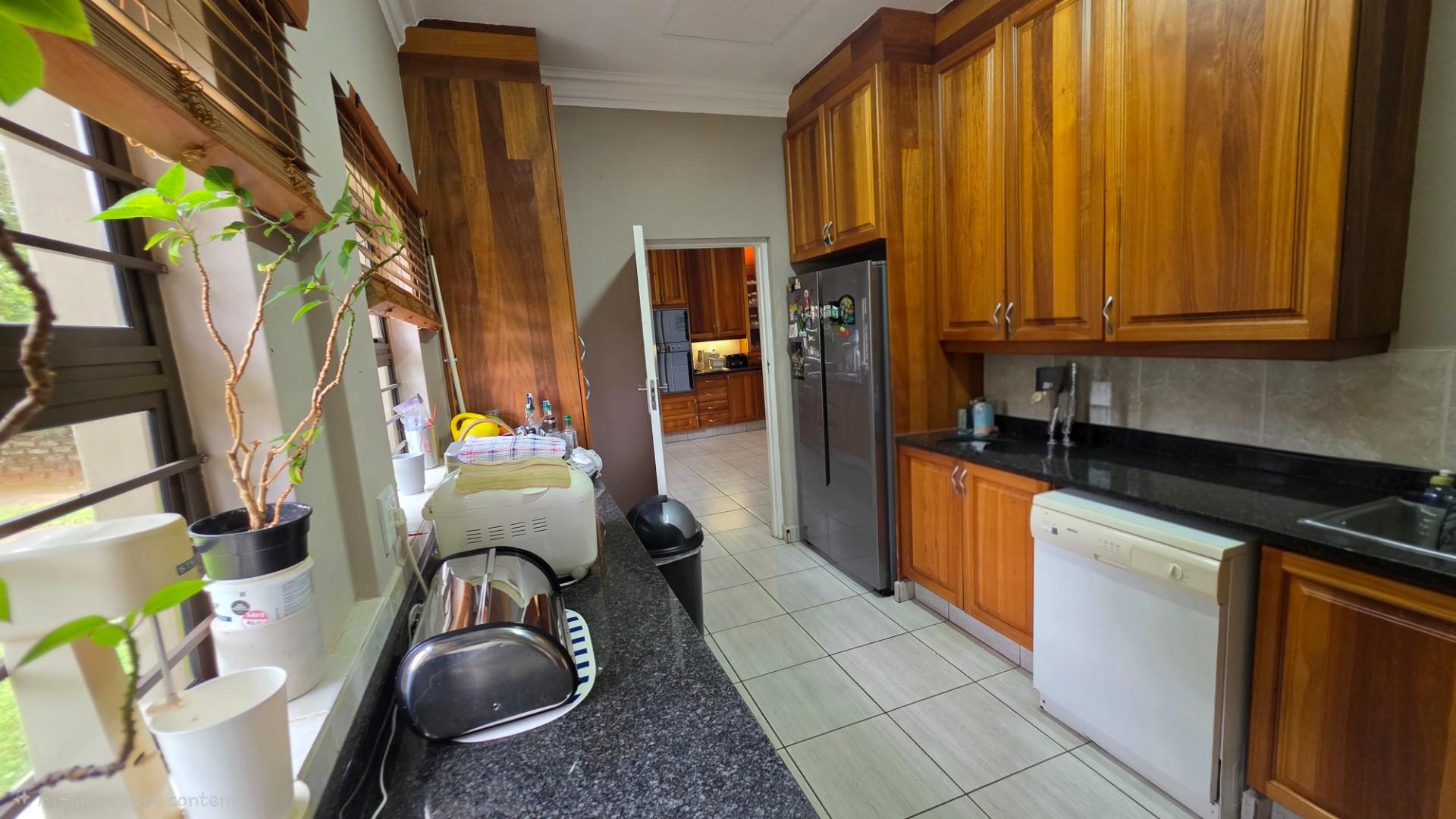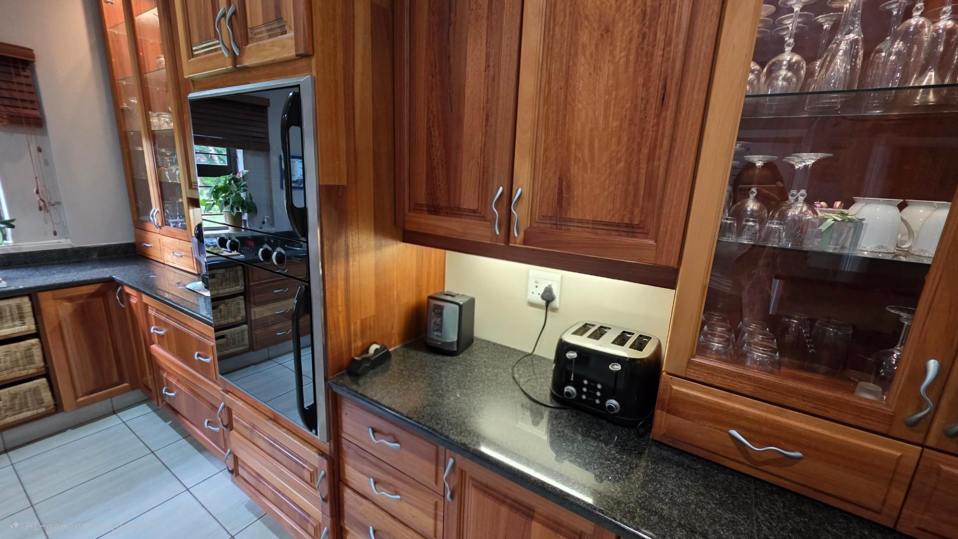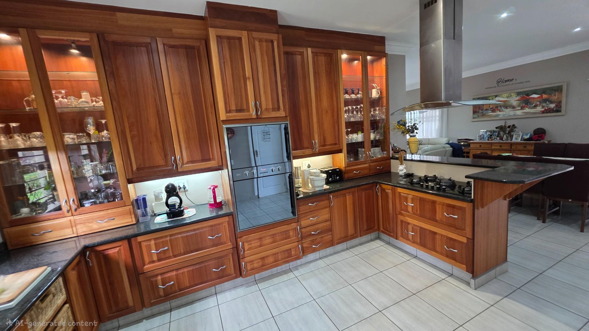 Picturesque home in a tranquil and idyllic Ramsgate. This home of grandeur proportions is situated at the end of a quiet street, surrounded by forestry and blue ocean vistas. The beautiful entrance hall leads you into an immaculately maintained home. with open plan lounge and dining room area, both with sliding doors offering access directly onto the undercover patio and maximises airflow through the home in the very humid months. In fact that is what makes this home so functional. It has been carefully designed and thought out to ensure maximum comfort. The kitchen is the absolute heart of this home. The mesmerizing dark wood cabinetry, with more than ample storage space, crisp granite counter tops, extractor fan, breakfast nook and an additional extension to the kitchen as a scullery which allows all of your bigger appliances to be separate from the main kitchen.