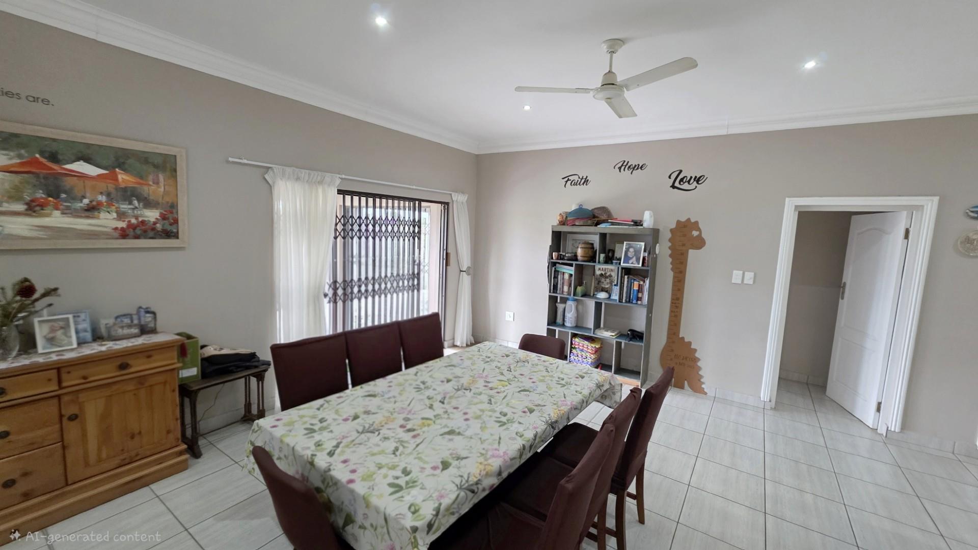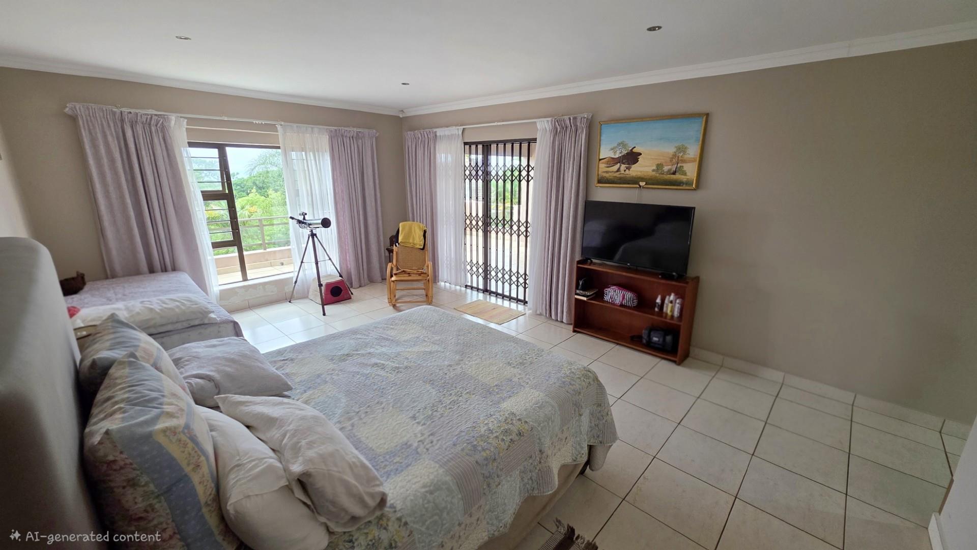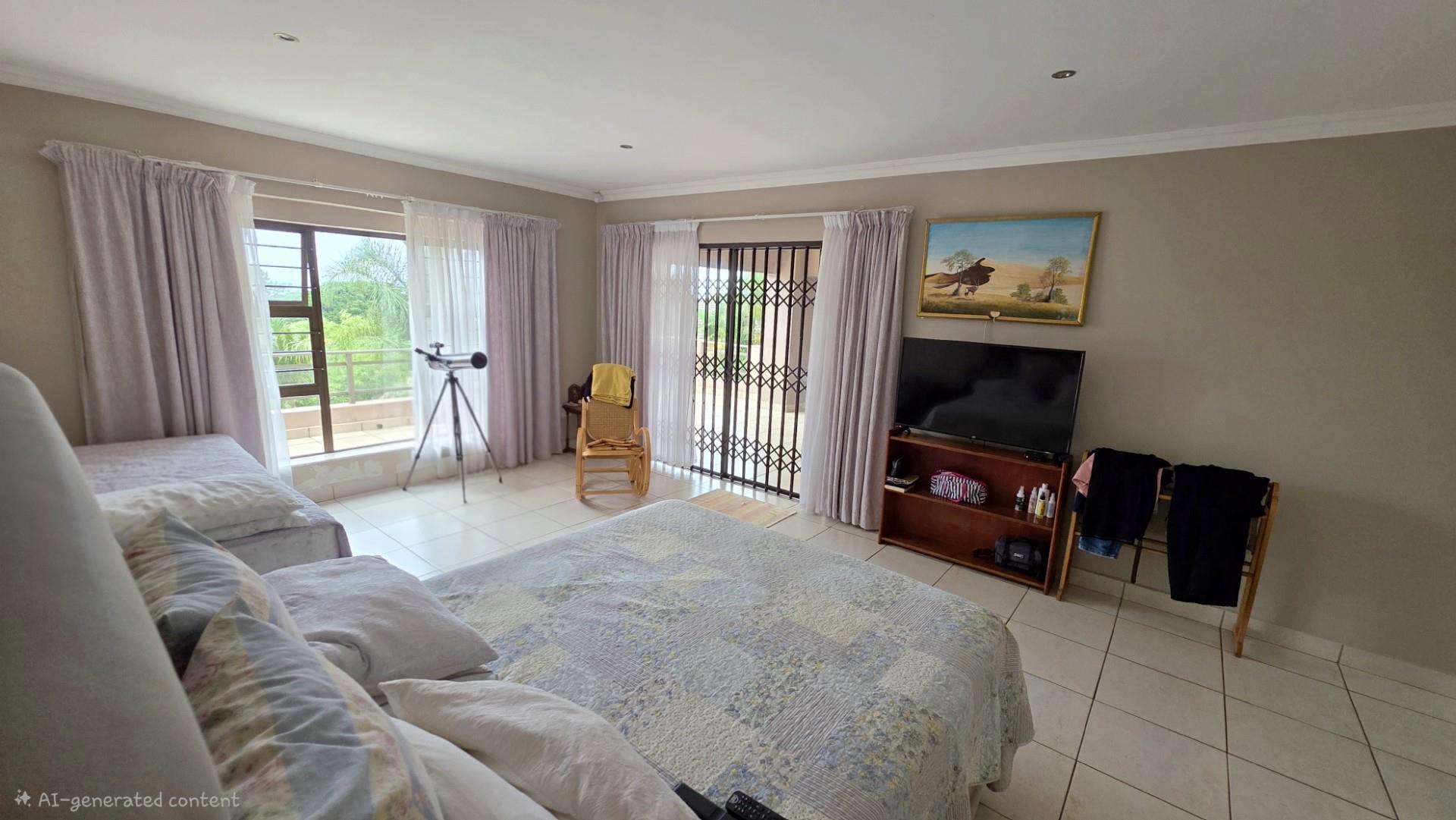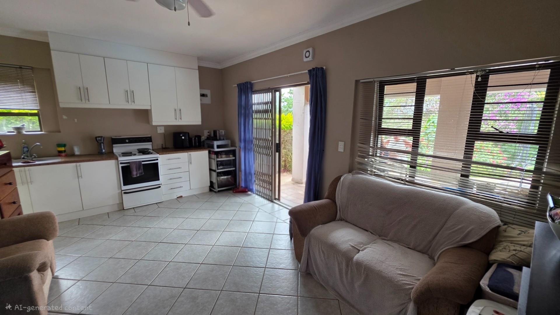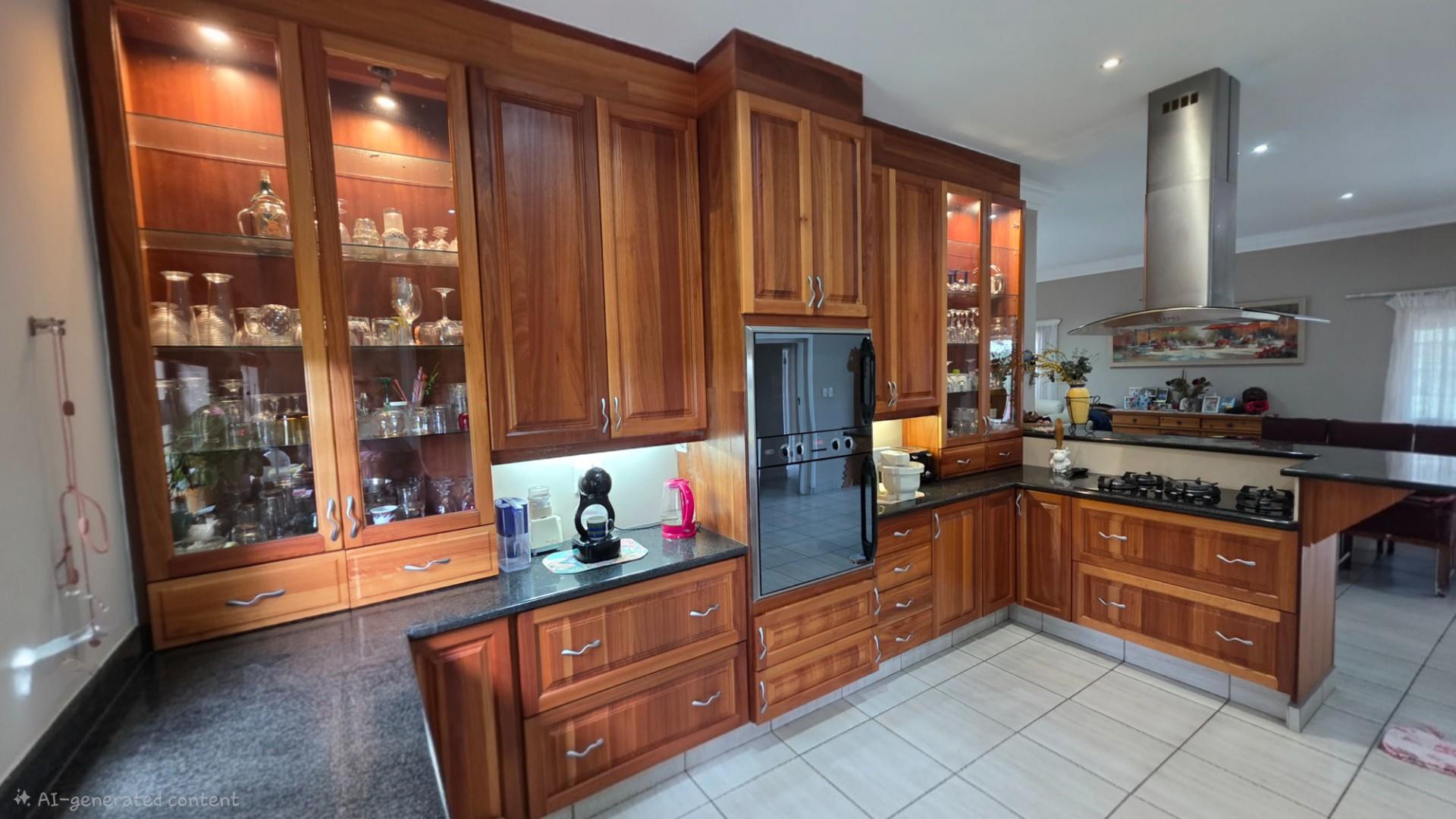 Picturesque home in a tranquil and idyllic Ramsgate. This home of grandeur proportions is situated at the end of a quiet street, surrounded by forestry and blue ocean vistas. The beautiful entrance hall leads you into an immaculately maintained home. with open plan lounge and dining room area, both with sliding doors offering access directly onto the undercover patio and maximises airflow through the home in the very humid months. In fact that is what makes this home so functional. It has been carefully designed and thought out to ensure maximum comfort. The kitchen is the absolute heart of this home. The mesmerizing dark wood cabinetry, with more than ample storage space, crisp granite counter tops, extractor fan, breakfast nook and an additional extension to the kitchen as a scullery which allows all of your bigger appliances to be separate from the main kitchen.