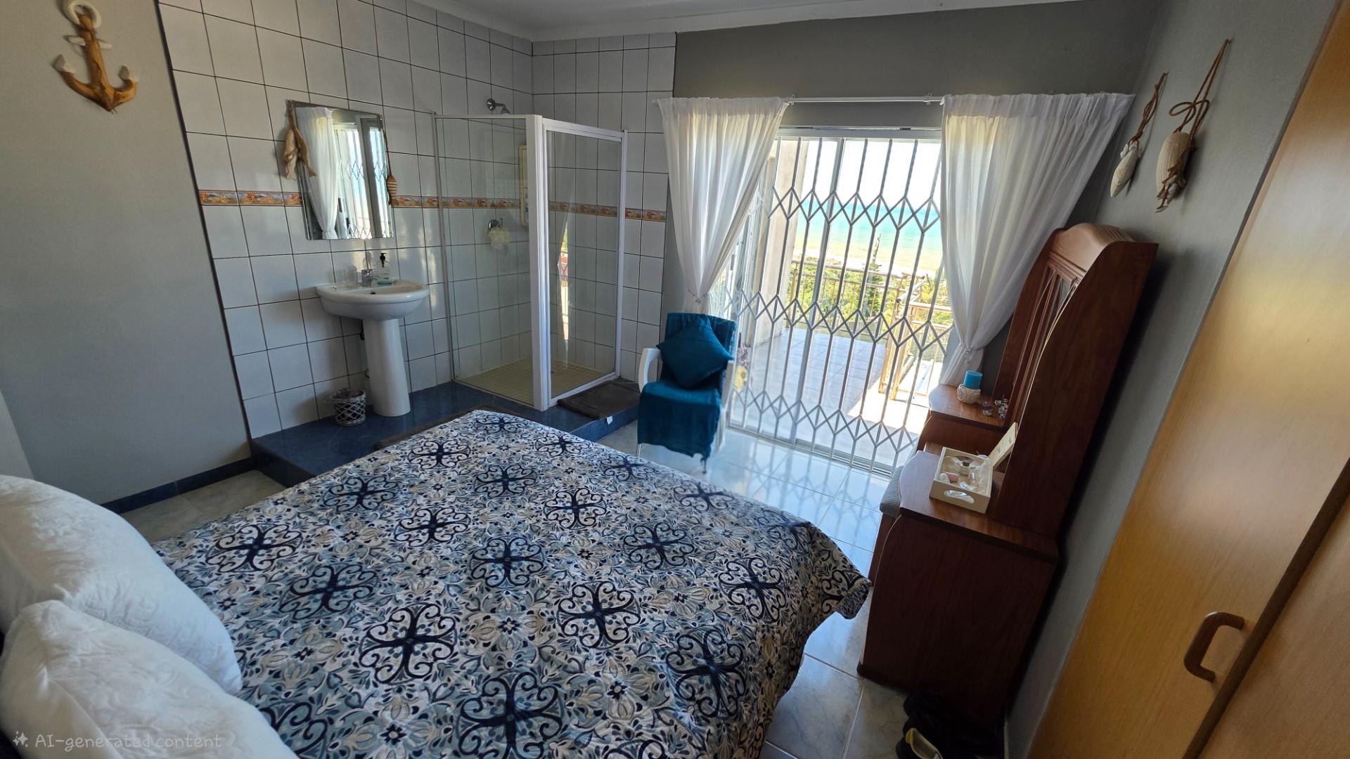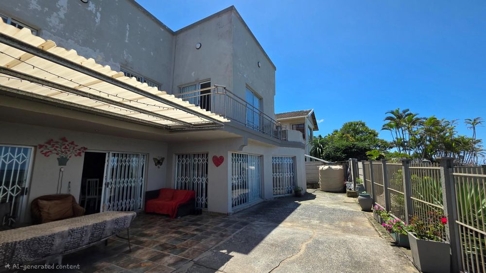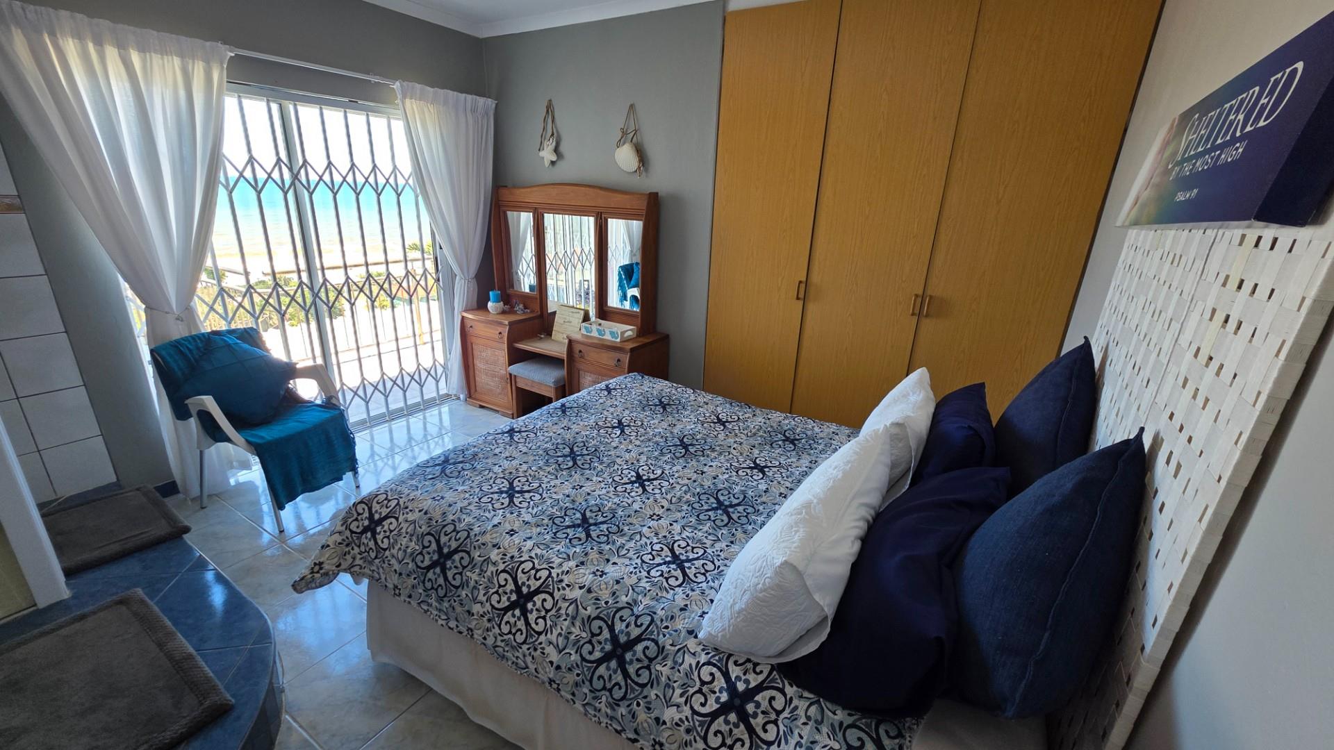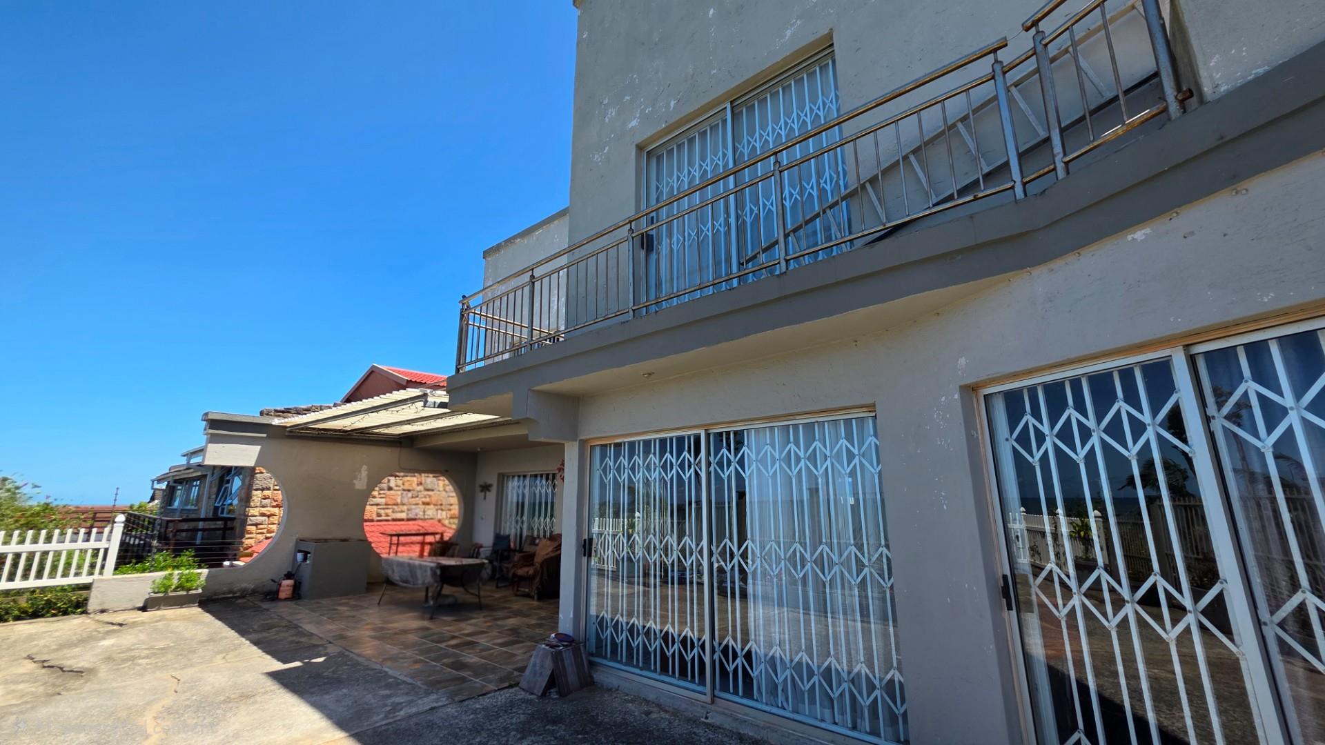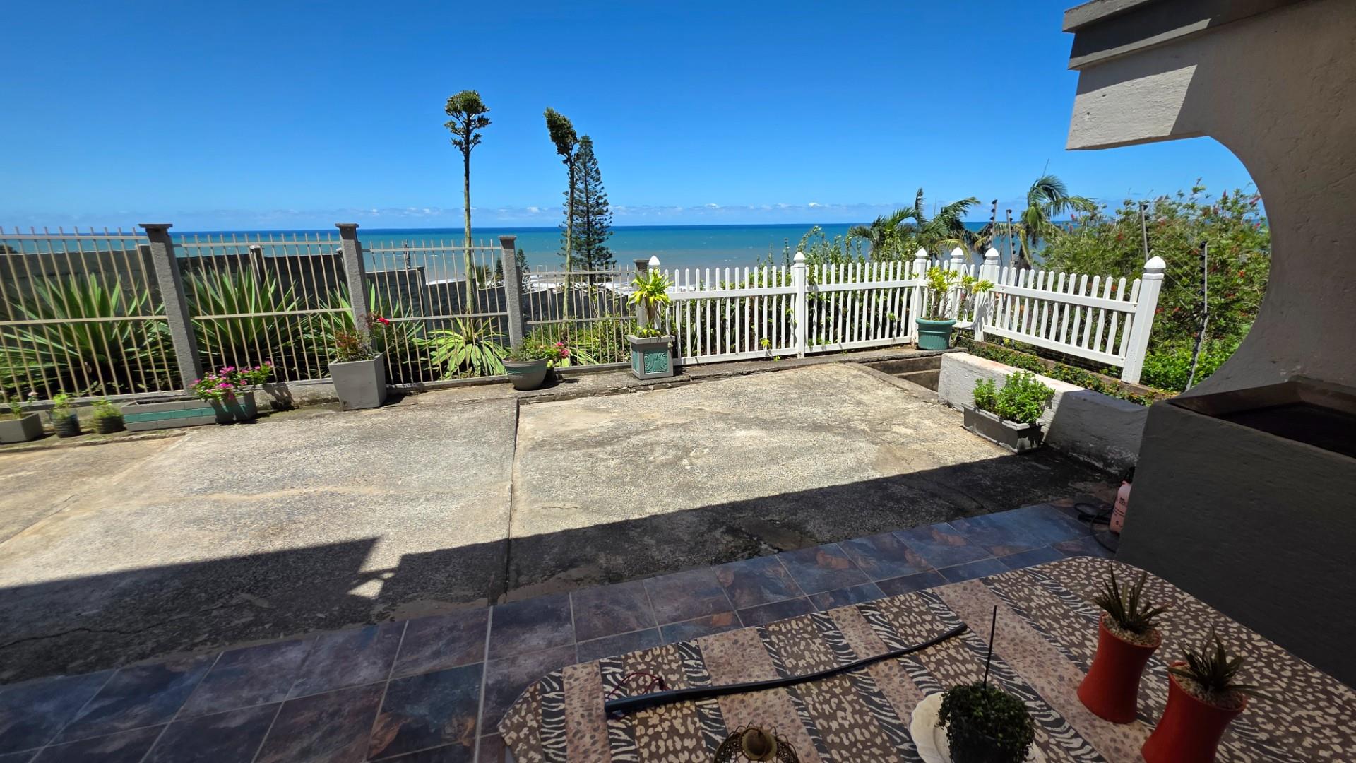 Outdoor living is a highlight in this home, with a tiled pathway, patio, and built-in braai creating the perfect space for entertaining. The balcony offers magnificent ocean views, while the private, landscaped garden is framed by a high perimeter wall with decorative elements for added privacy and charm.