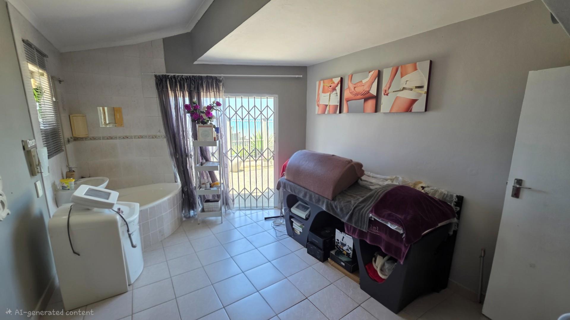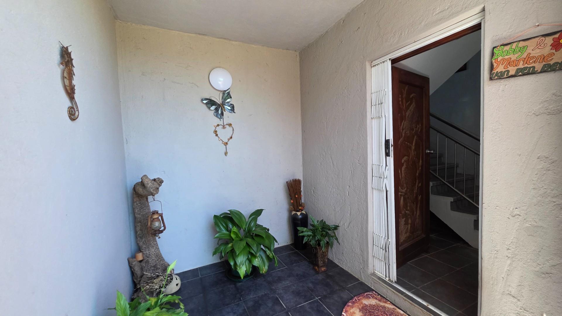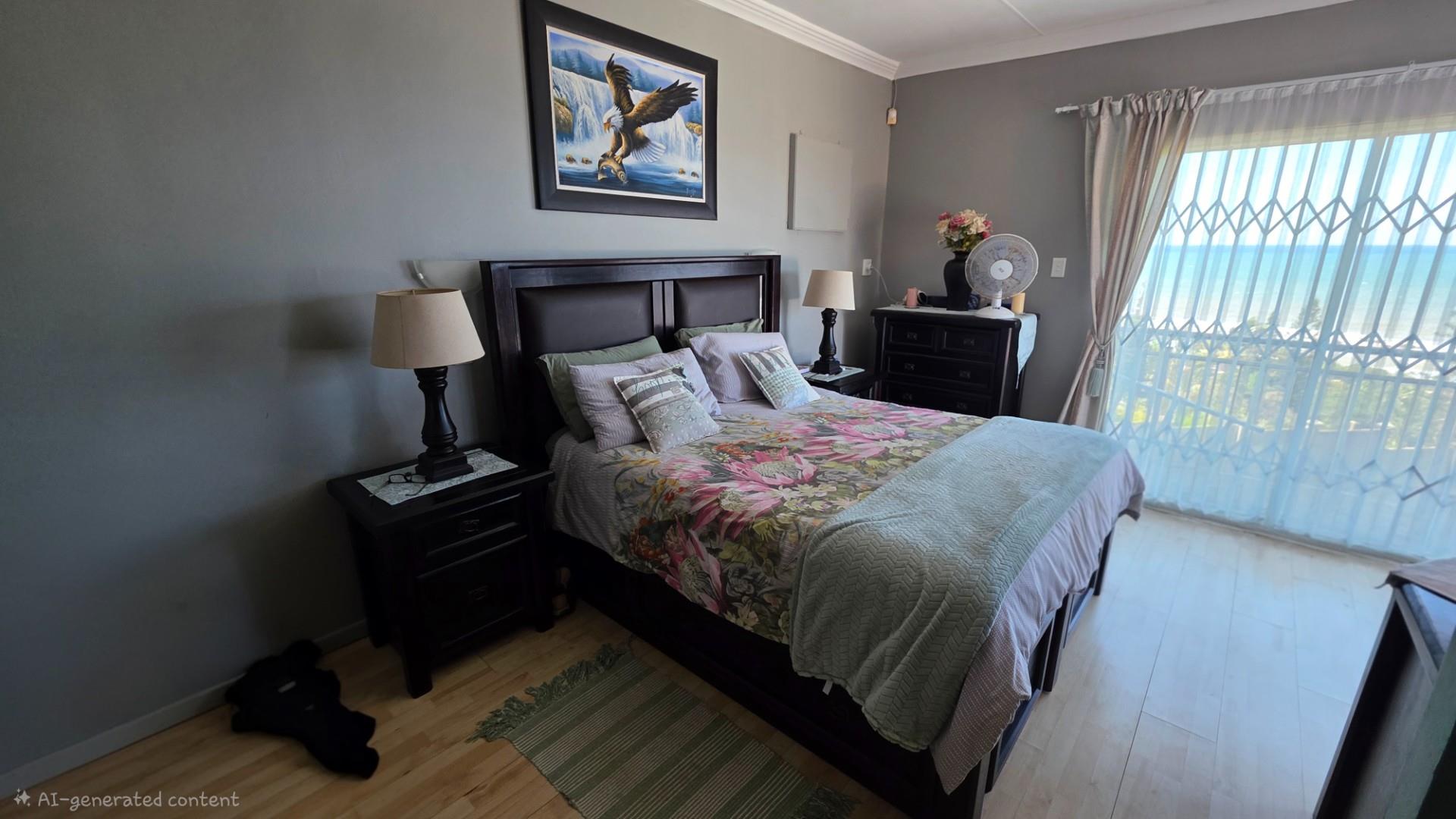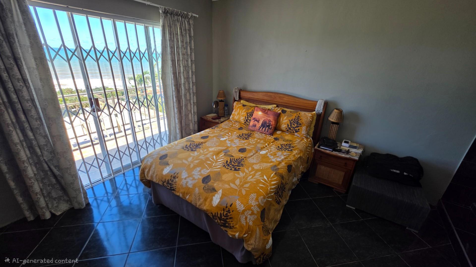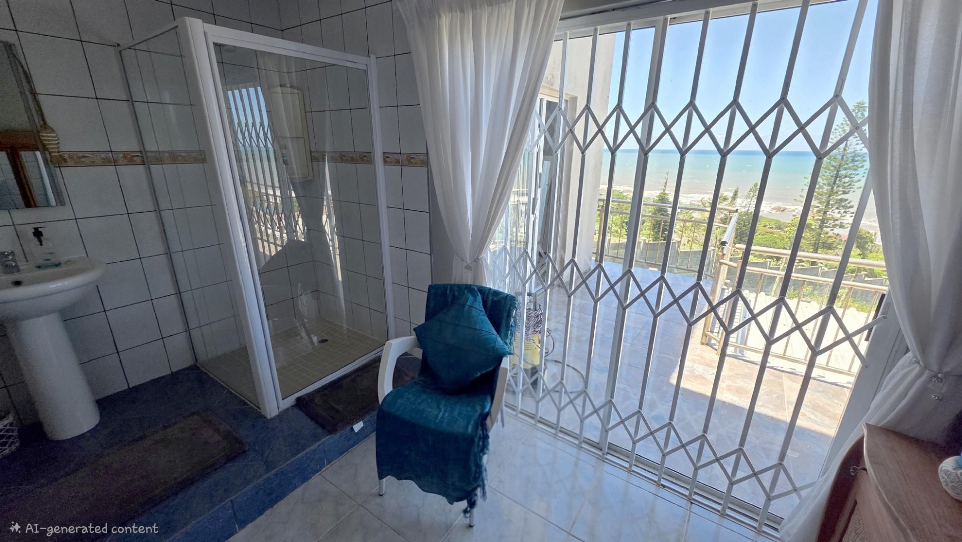 Outdoor living is a highlight in this home, with a tiled pathway, patio, and built-in braai creating the perfect space for entertaining. The balcony offers magnificent ocean views, while the private, landscaped garden is framed by a high perimeter wall with decorative elements for added privacy and charm.
