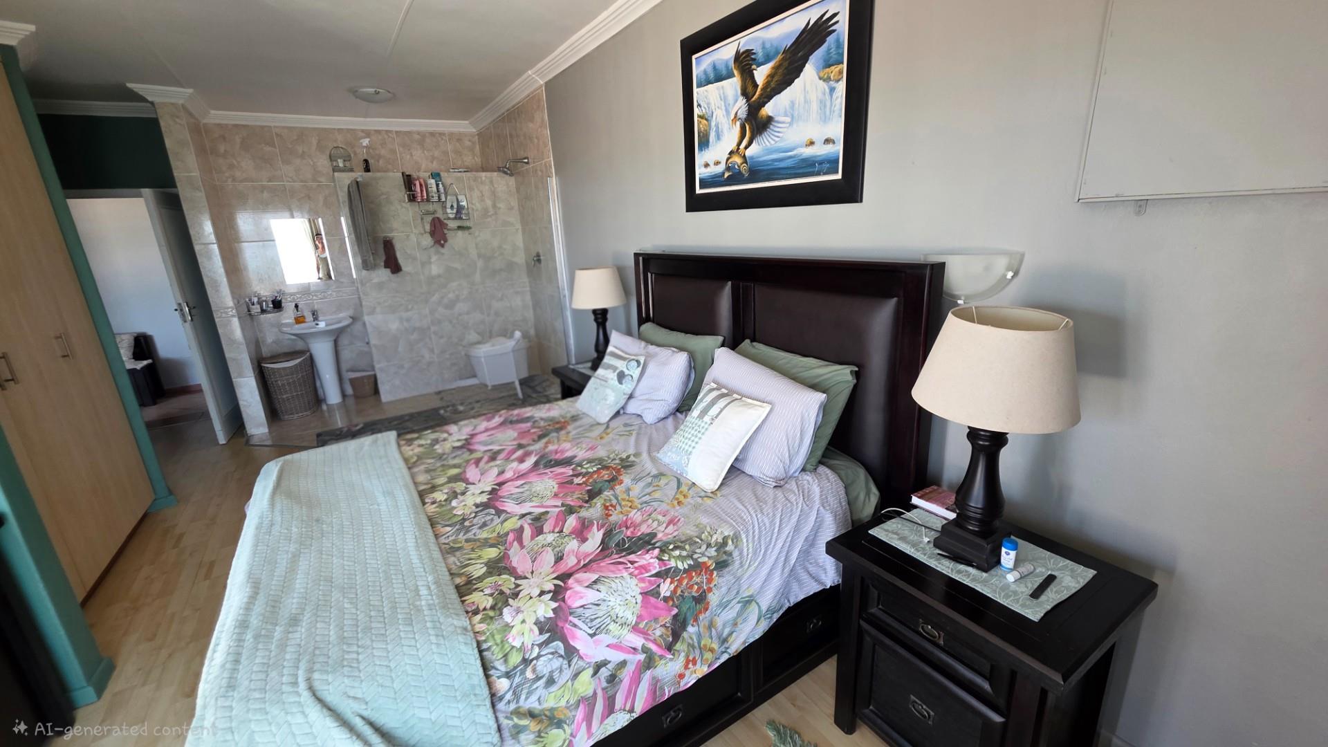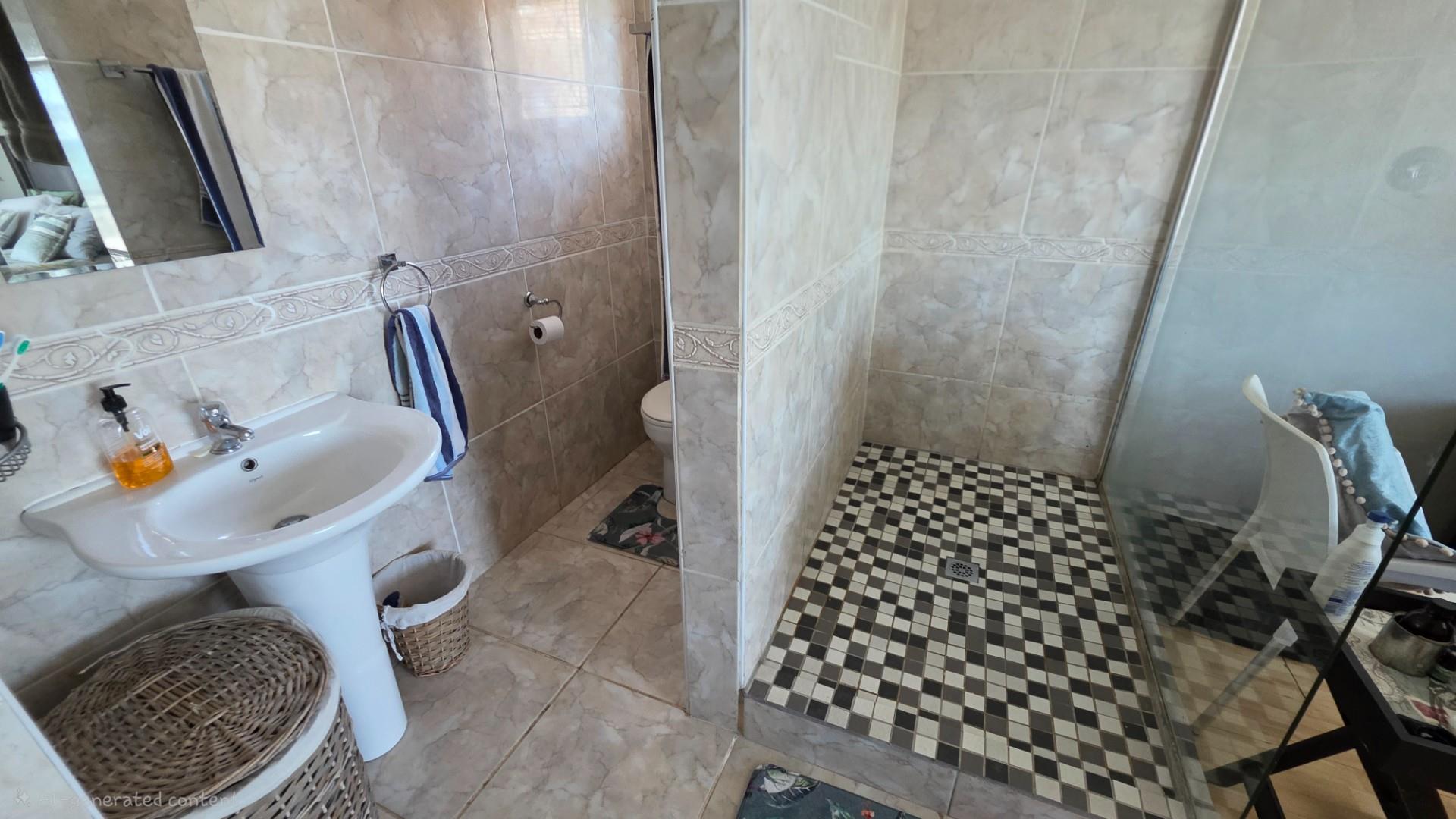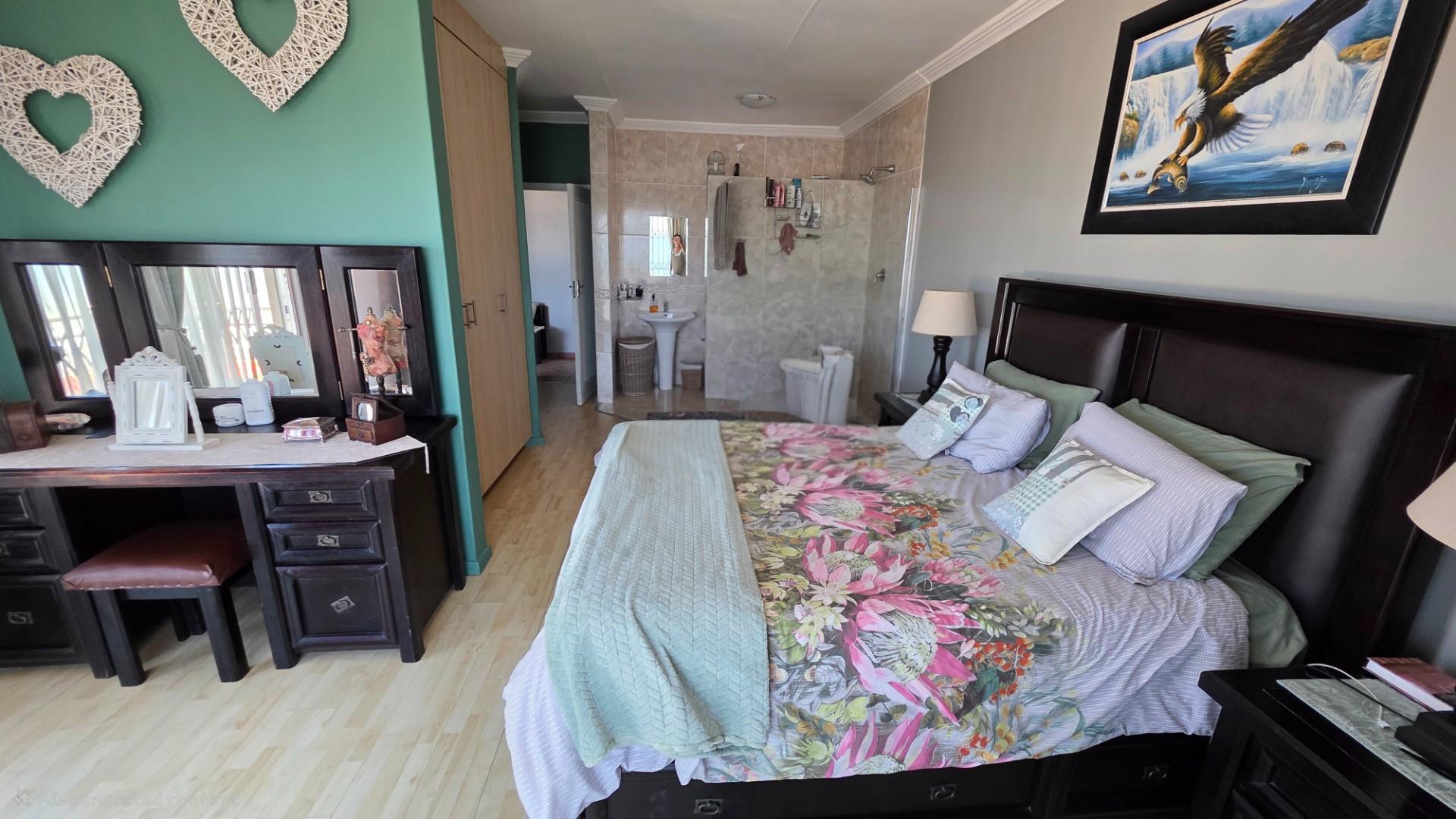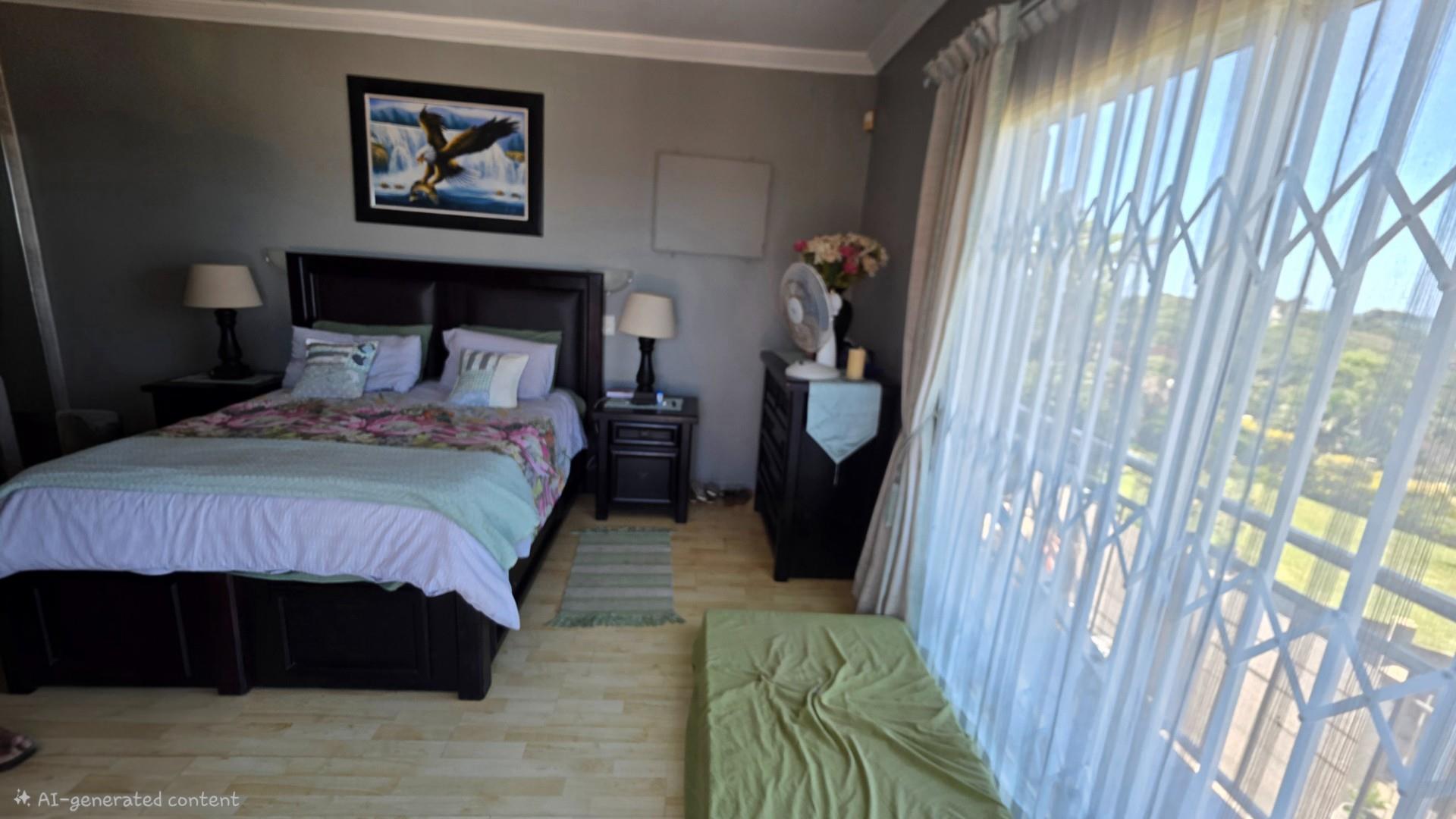 Outdoor living is a highlight in this home, with a tiled pathway, patio, and built-in braai creating the perfect space for entertaining. The balcony offers magnificent ocean views, while the private, landscaped garden is framed by a high perimeter wall with decorative elements for added privacy and charm.