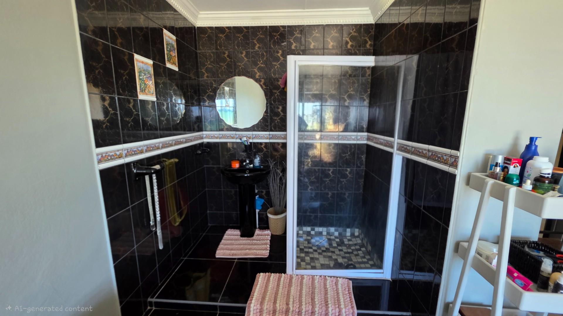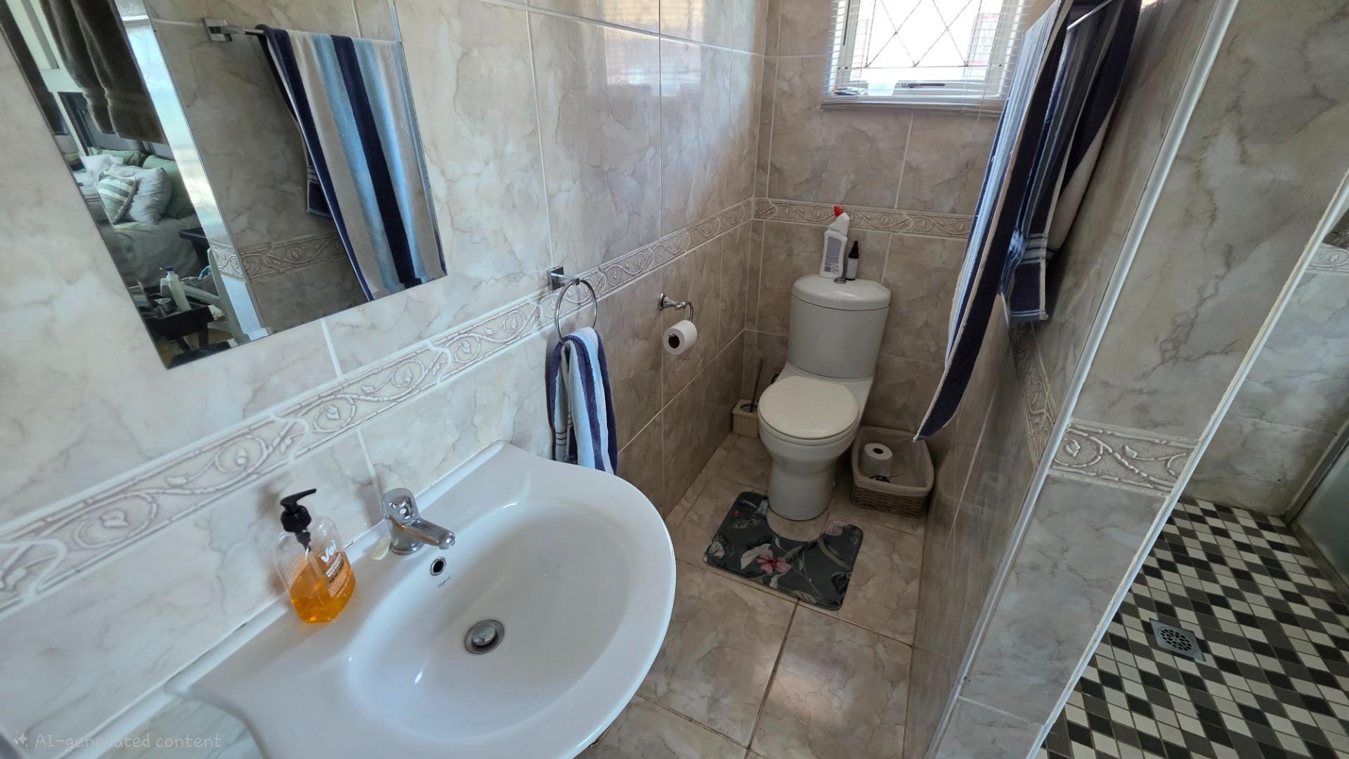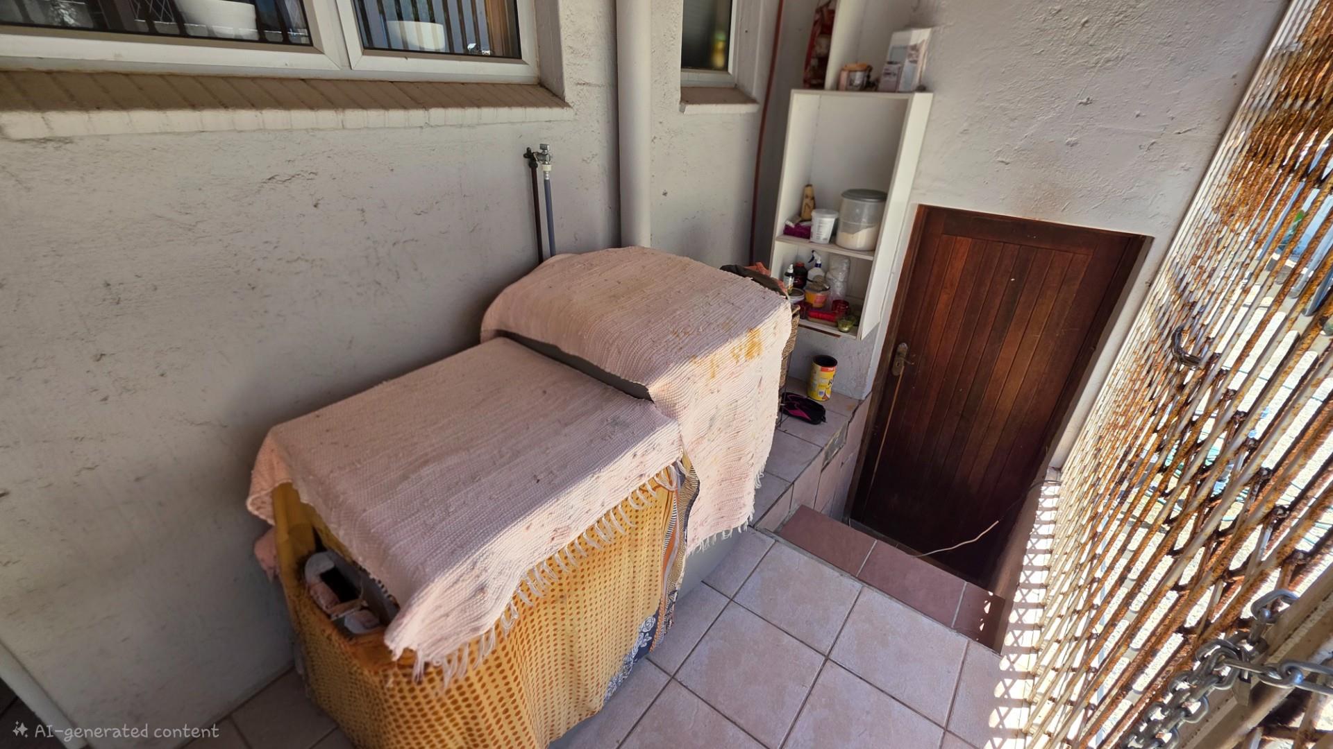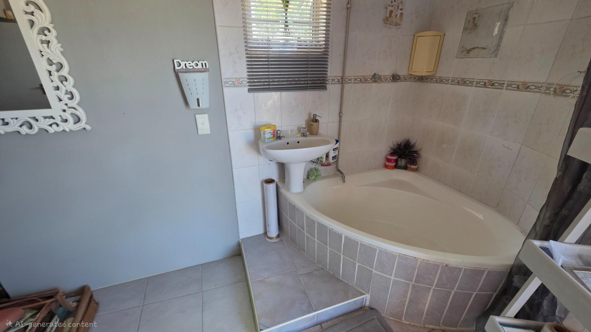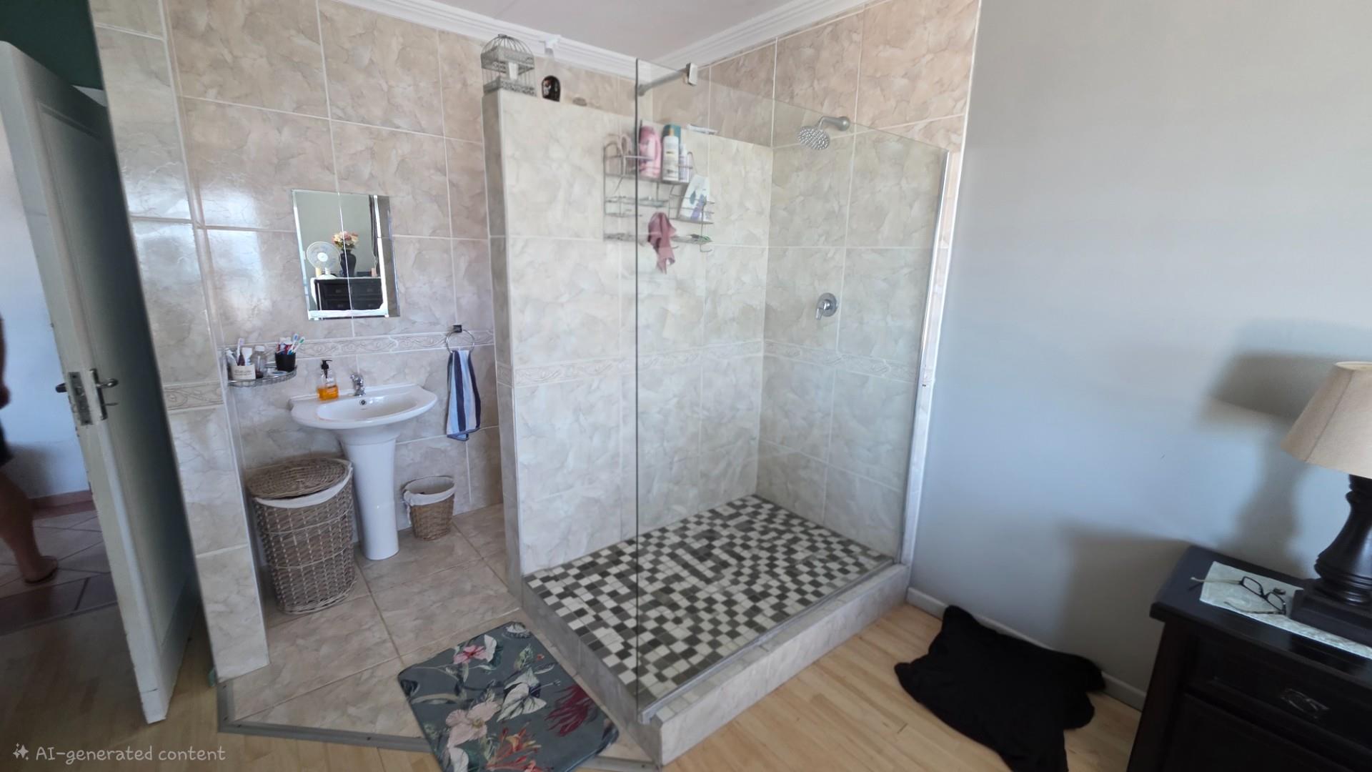 Outdoor living is a highlight in this home, with a tiled pathway, patio, and built-in braai creating the perfect space for entertaining. The balcony offers magnificent ocean views, while the private, landscaped garden is framed by a high perimeter wall with decorative elements for added privacy and charm.