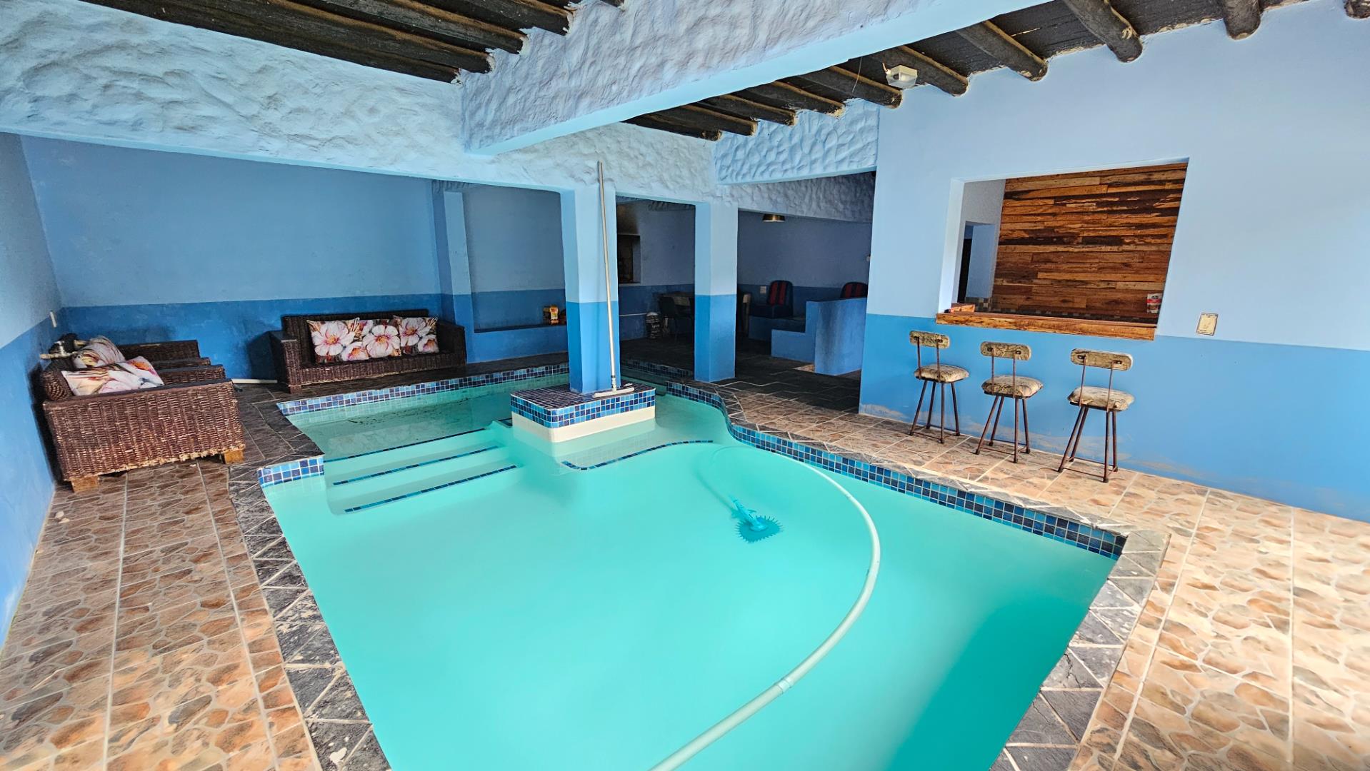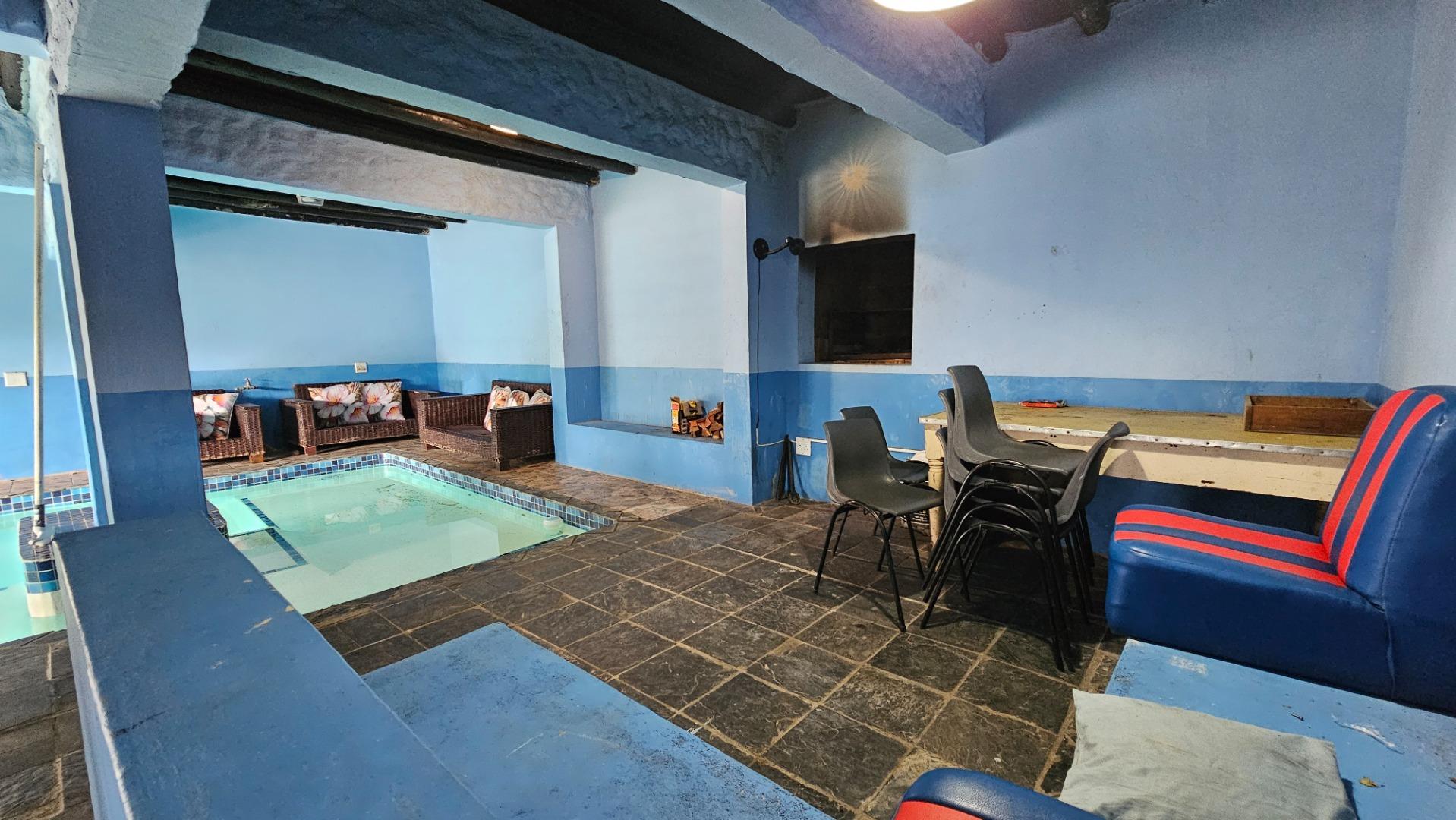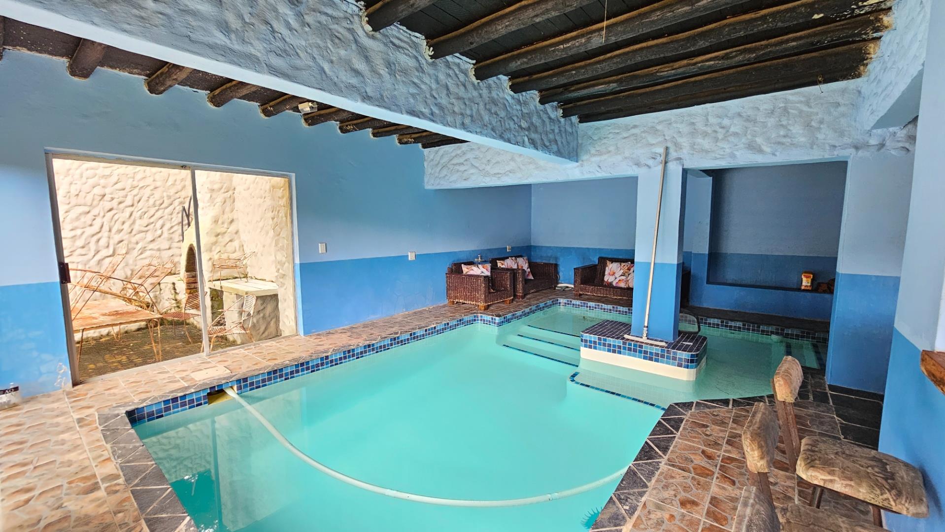 Main House Features: 2 Bedrooms, 1 Bathroom, Spacious kitchen, Dining area.Indoor swimming pool with additional downstairs toilet and shower/bath.Excellent entertainment space, Outdoor braai area. Large garden – perfect for children and pets