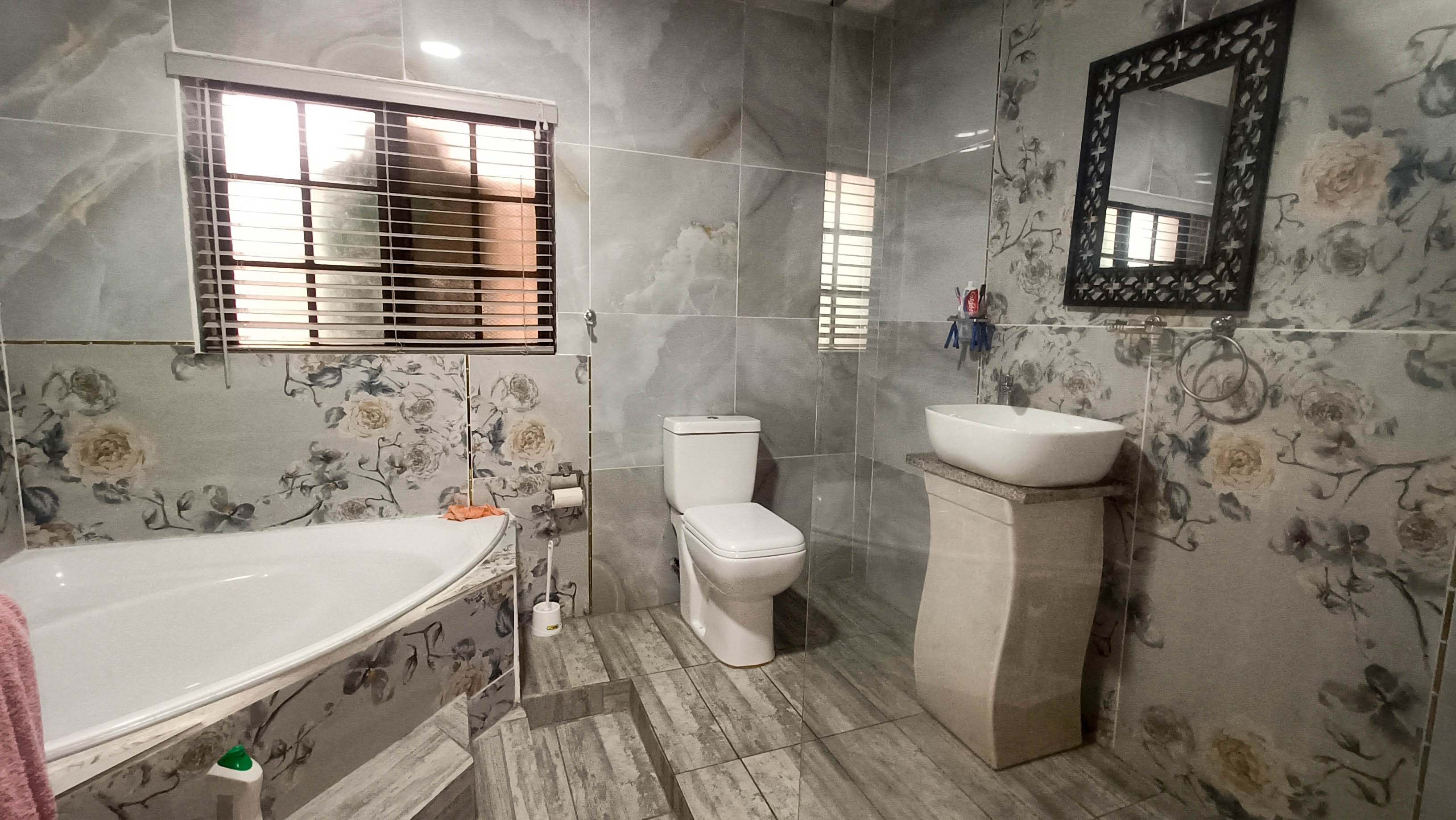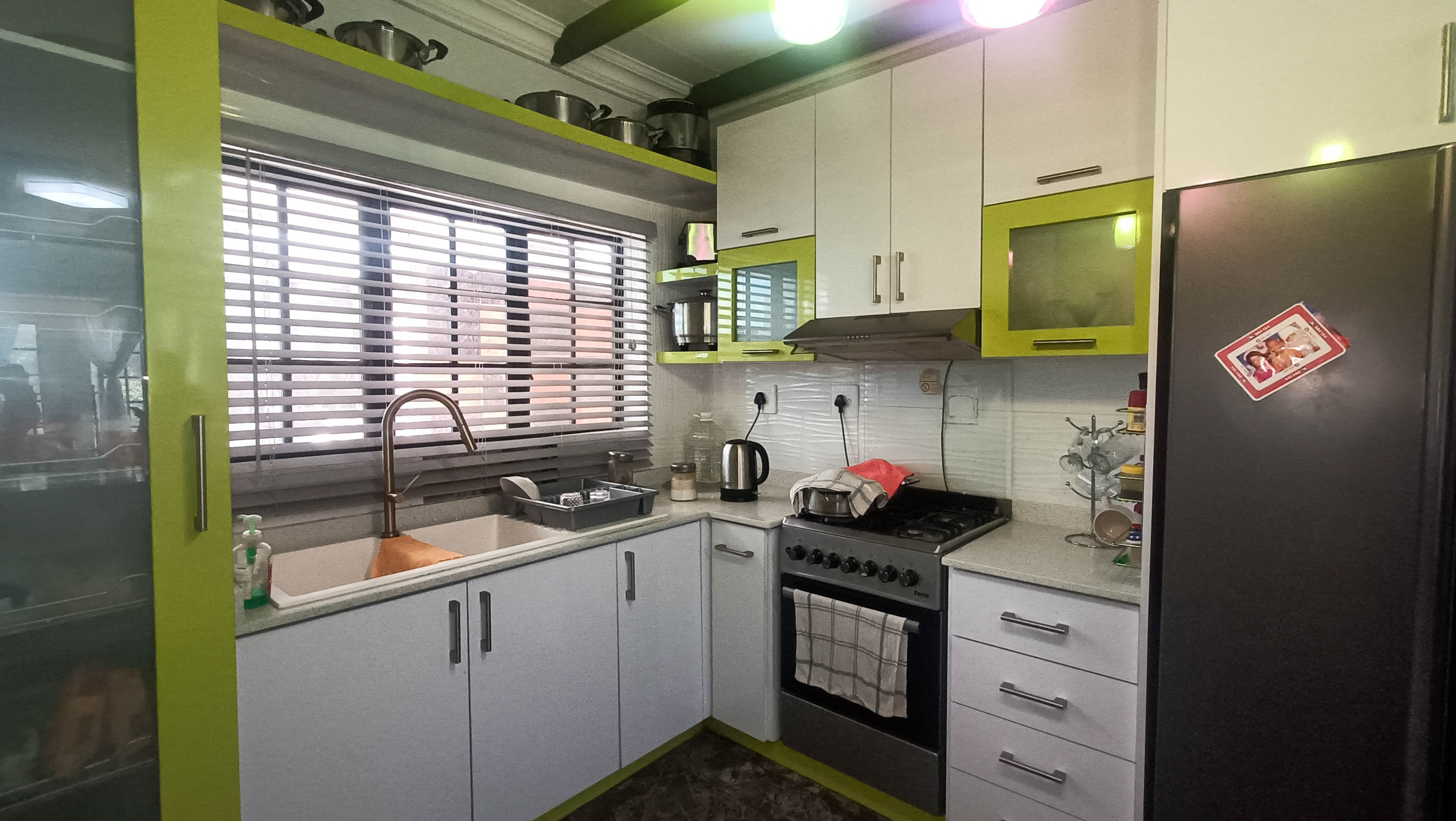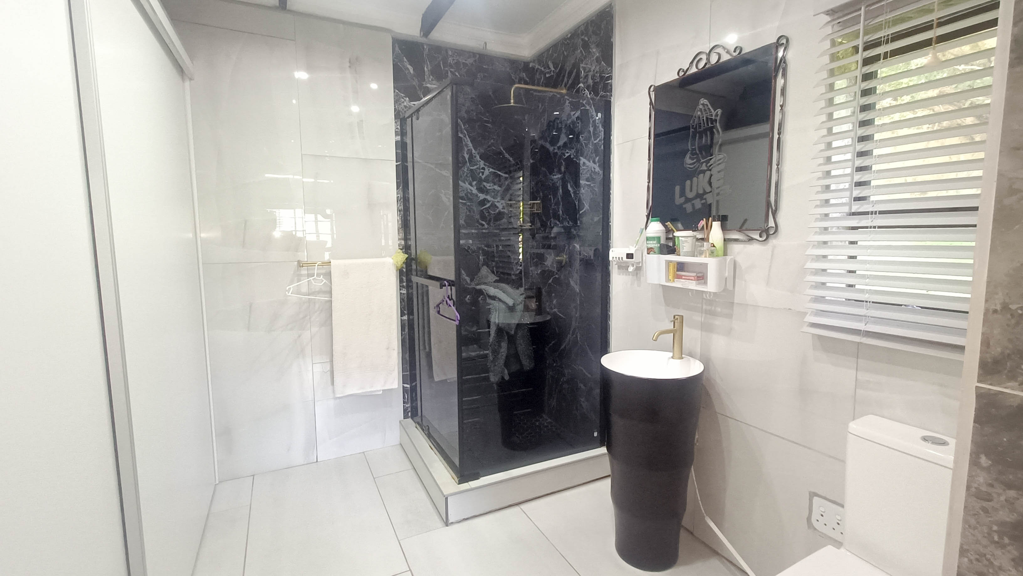 At the back of the home, you'll find a self-contained bachelor flat, which can serve as an additional bedroom for a family member or function as a separate rental unit. This flat includes a bedroom, kitchen, and ensuite bathroom and is conveniently located near the outdoor lounge and braai area.