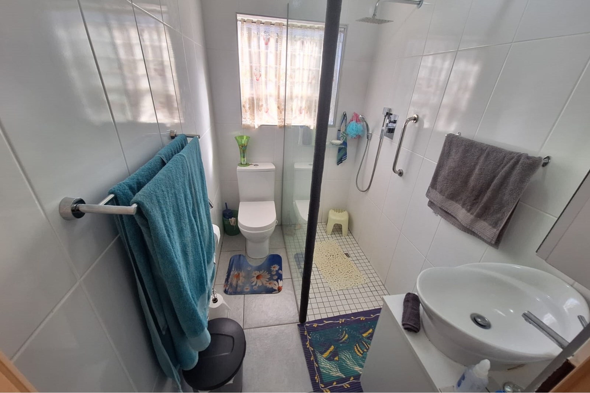 The bathroom boasts contemporary finishes, including a sleek walk-in shower, basin, and toilet—designed with both functionality and elegance in mind.