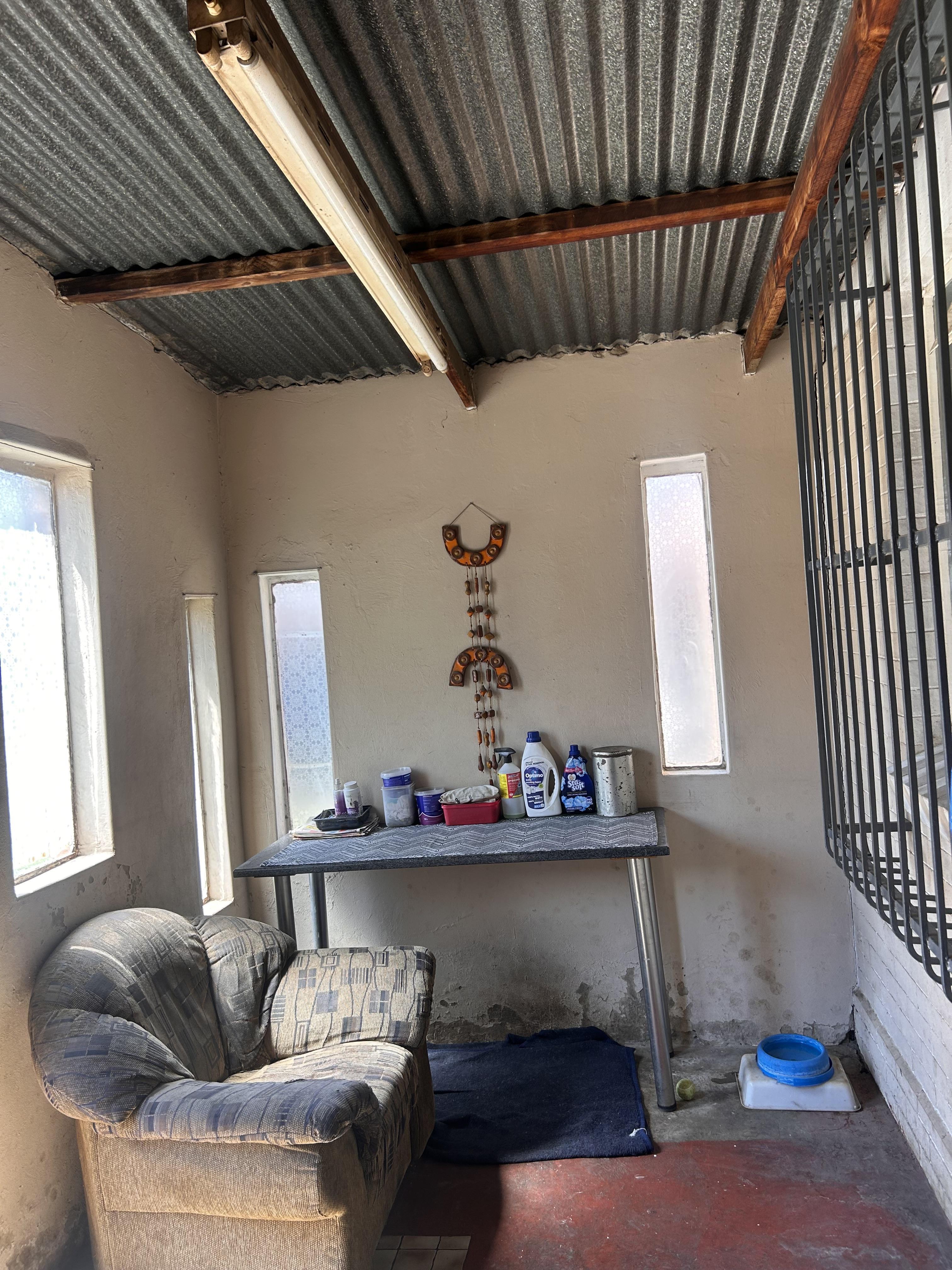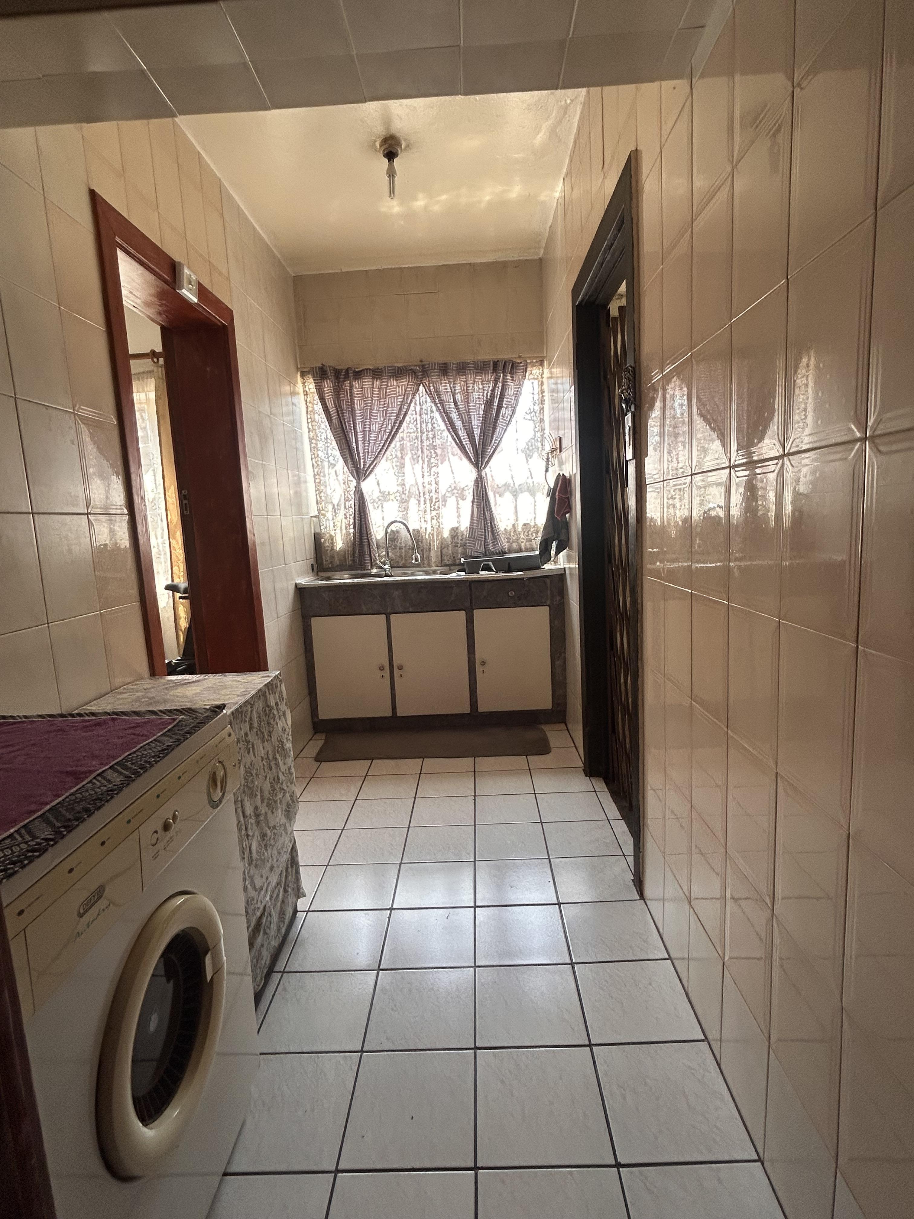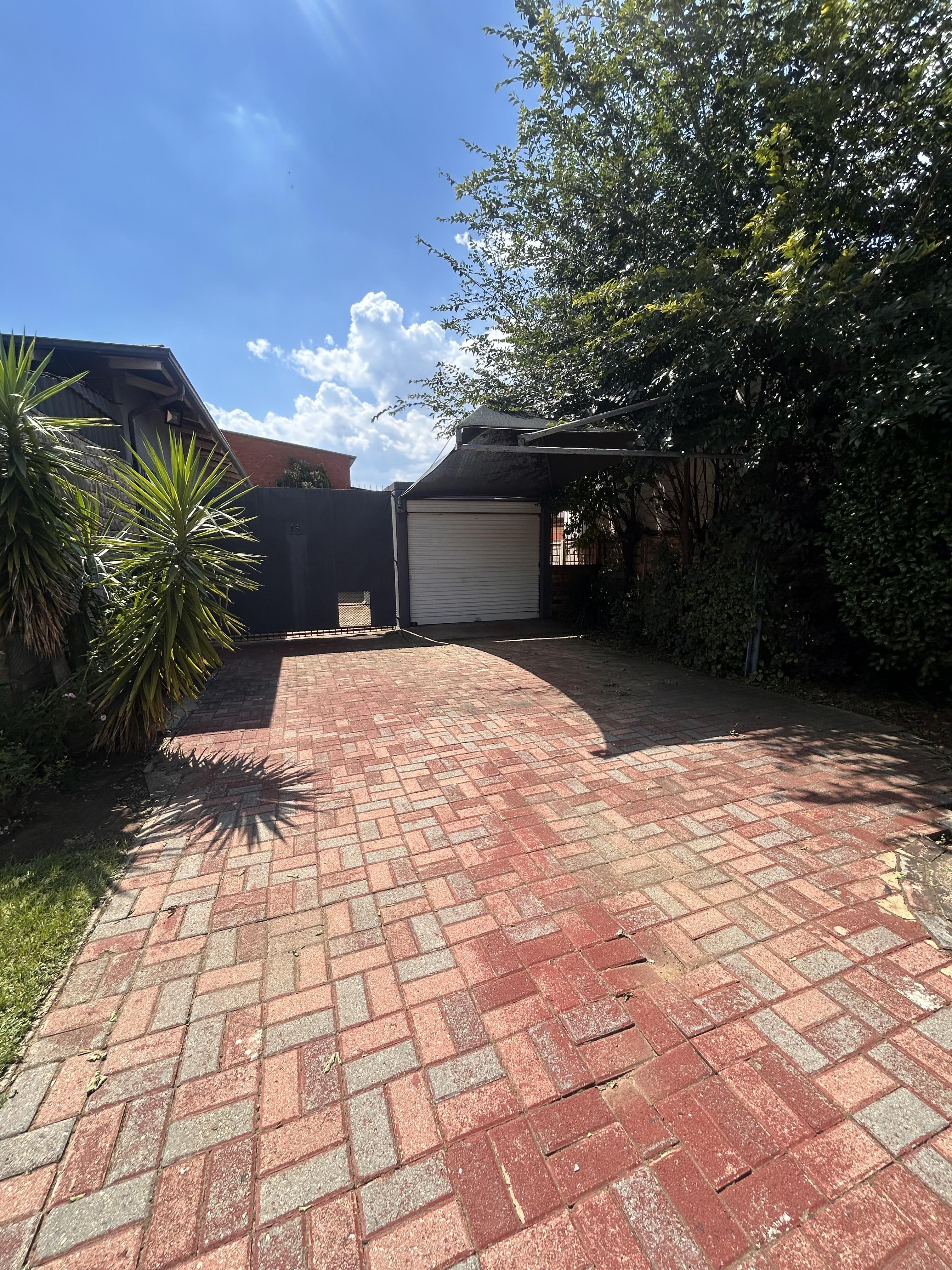 The yard is neat and spacious, with a well-kept garden and paved areas, all secured with perimeter fencing and burglar bars for peace of mind.