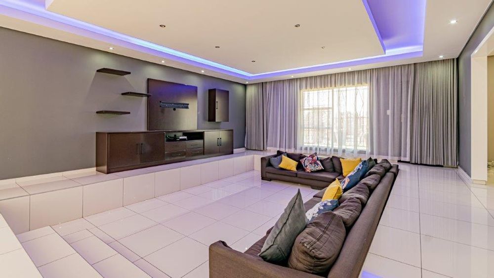 The second lounge is positioned next to the TV lounge and flows effortlessly into the open-plan dining room and kitchen. The kitchen is a chef's delight, featuring sleek granite countertops, a gas stove, an electric oven, and a breakfast nook/island. It offers ample space for three appliances and a double-door fridge. Stacker doors from the dining room also lead out to a covered patio, providing a perfect blend of indoor and outdoor living as you overlook the garden and pool.