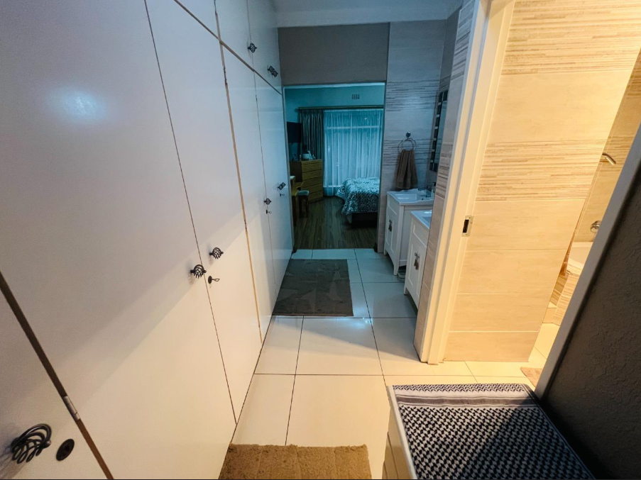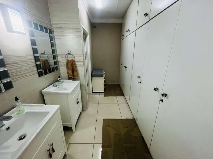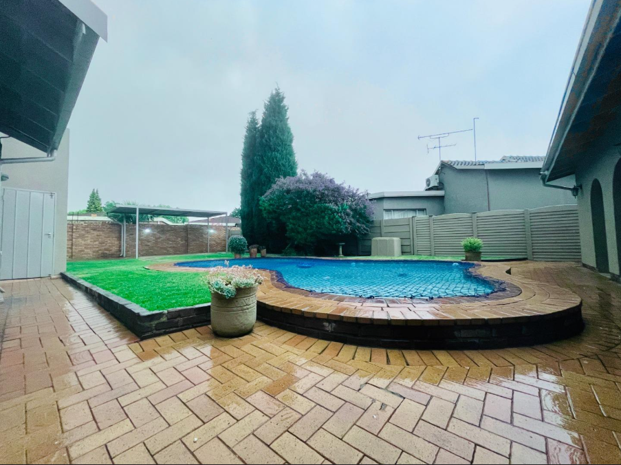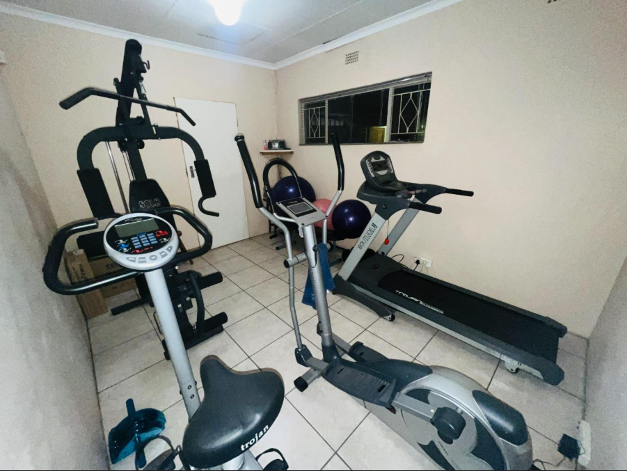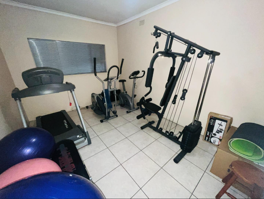 Outdoor living is a highlight, with a private pool, entertainment patio, and built-in braai surrounded by a well-established garden. A dedicated gym adds convenience for fitness enthusiasts.
