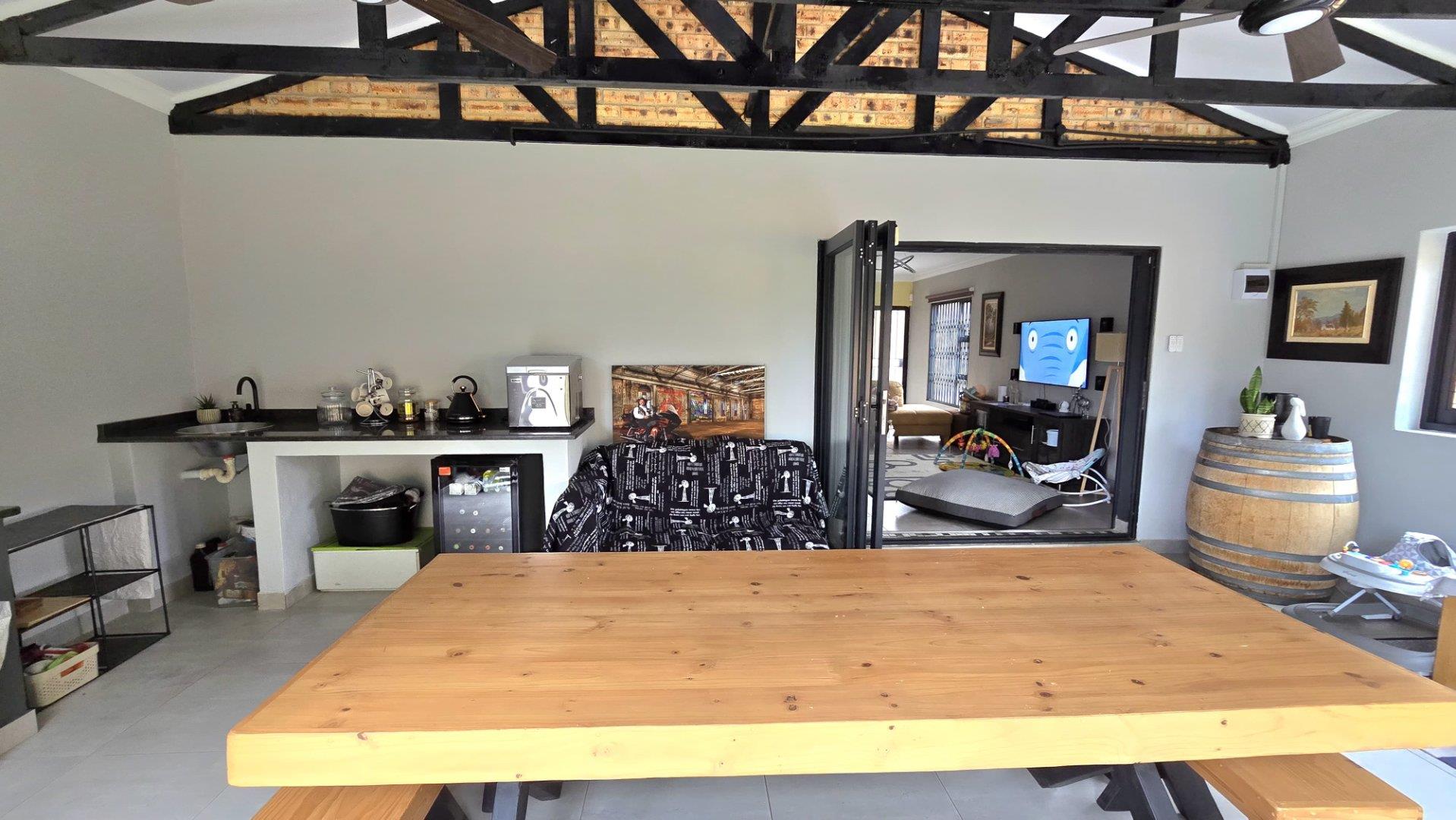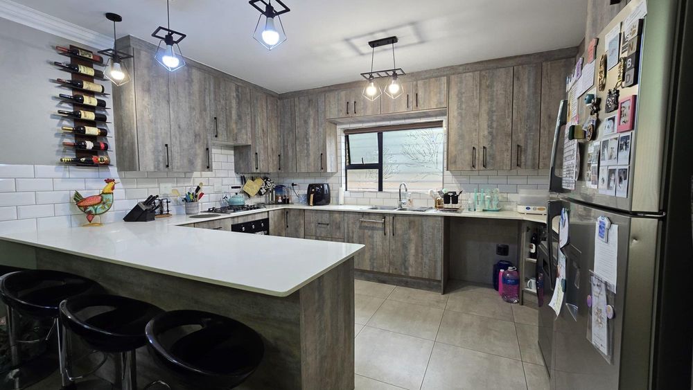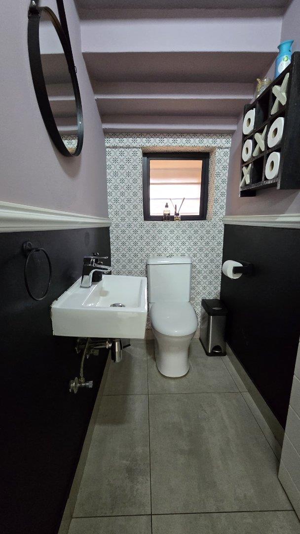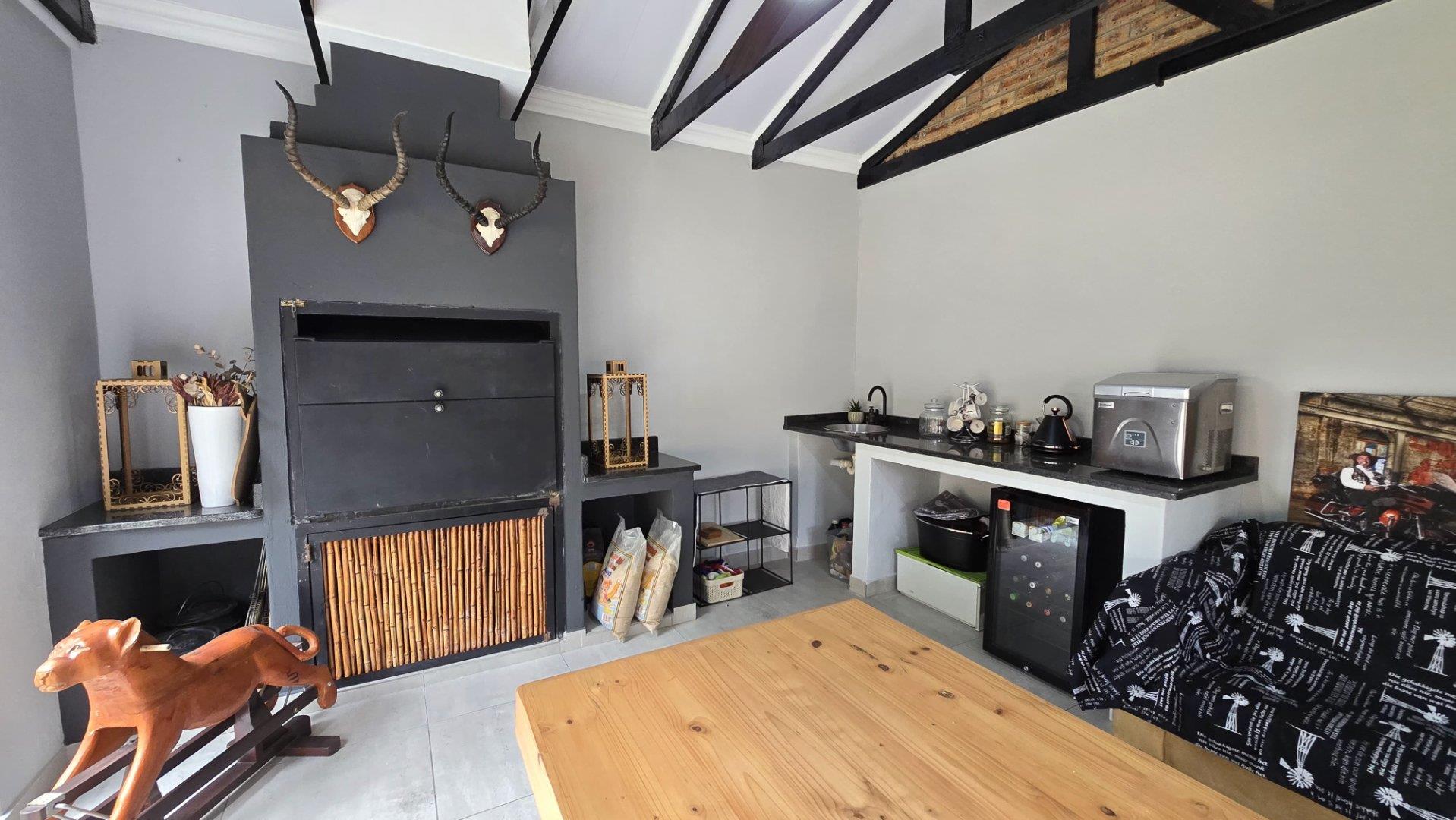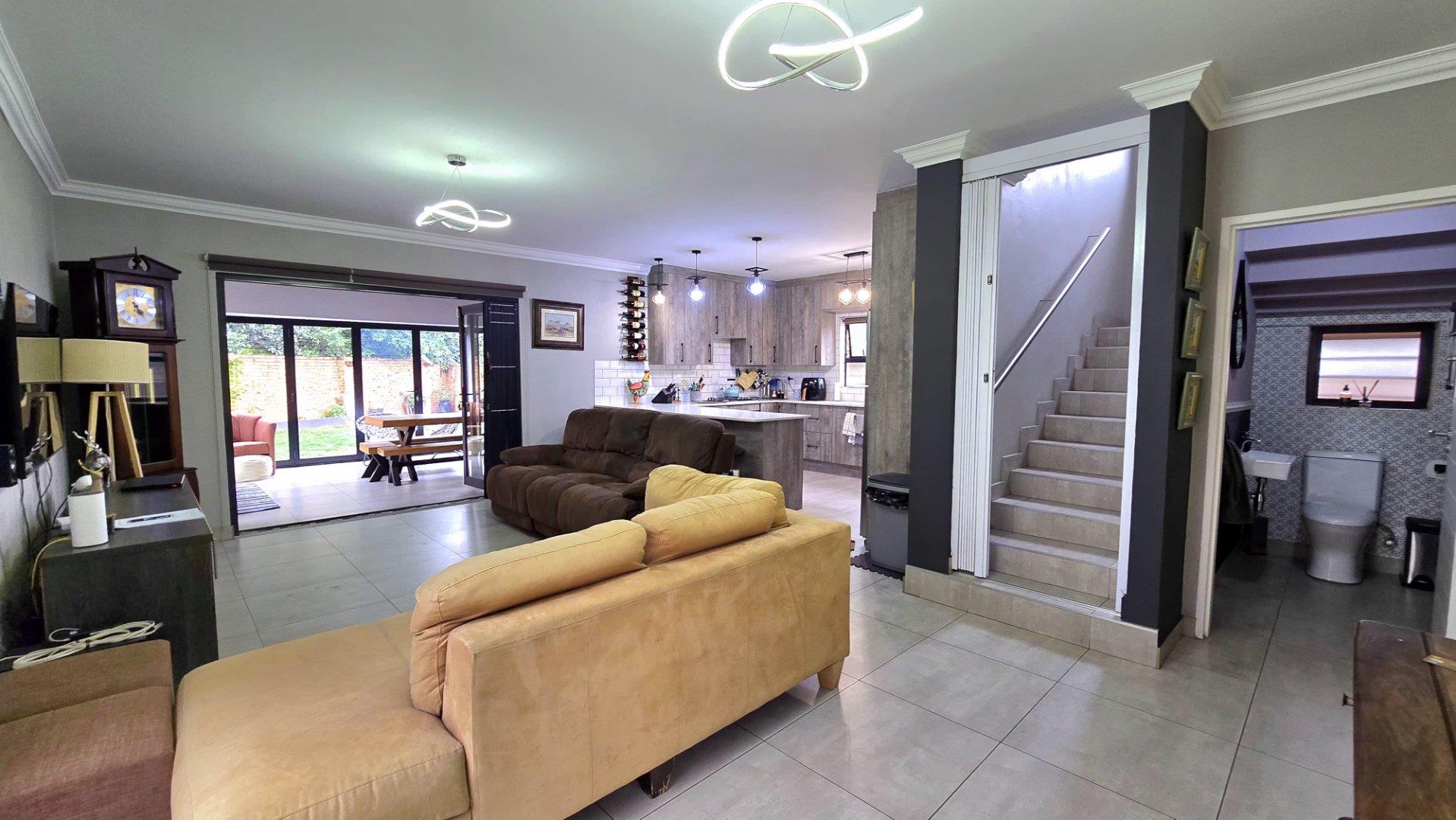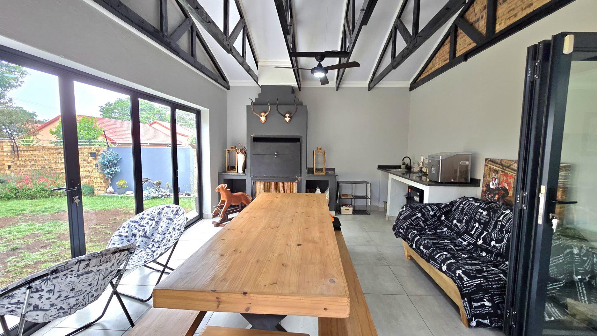 Step inside to discover the heart of this home: an open-plan kitchen and lounge area that epitomizes contemporary elegance. With sleek Caesarstone countertops, a gas stove, and a convenient breakfast nook, this space is perfect for both casual meals and hosting guests. The kitchen and lounge seamlessly flow into a charming dining area, which opens up to a spacious enclosed patio through stacker doors. This patio is an entertainer's delight, featuring a built-in braai area and offering stunning views of the impeccably maintained garden. For added convenience, a guest toilet is situated on the ground floor.