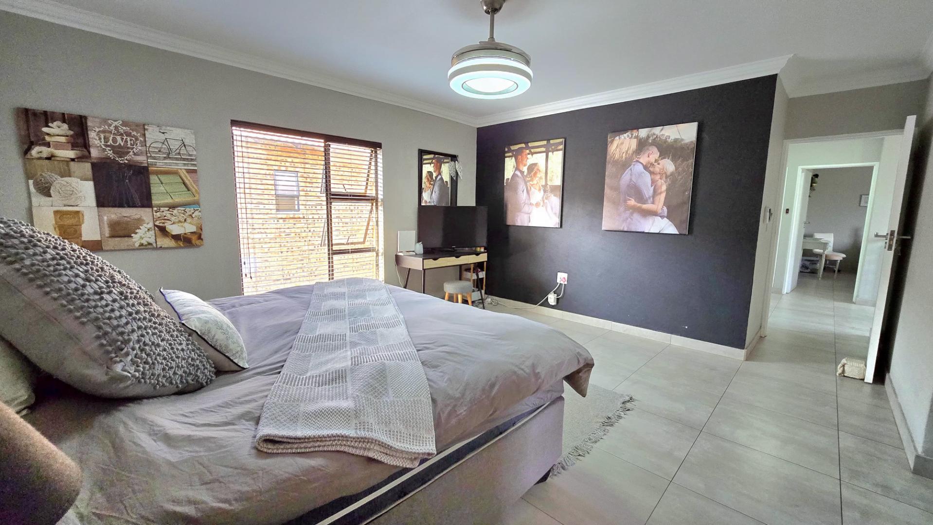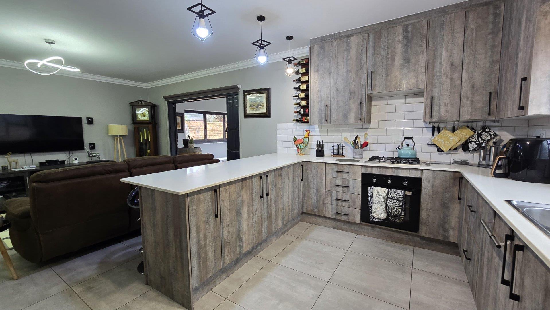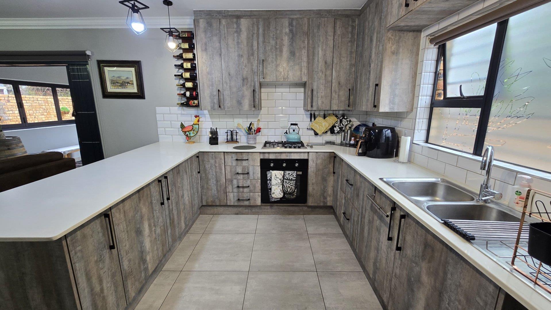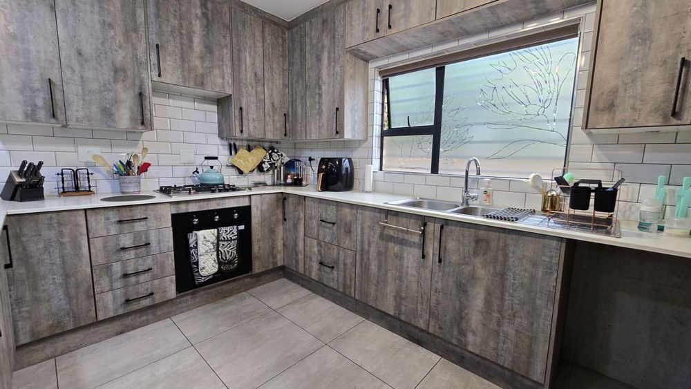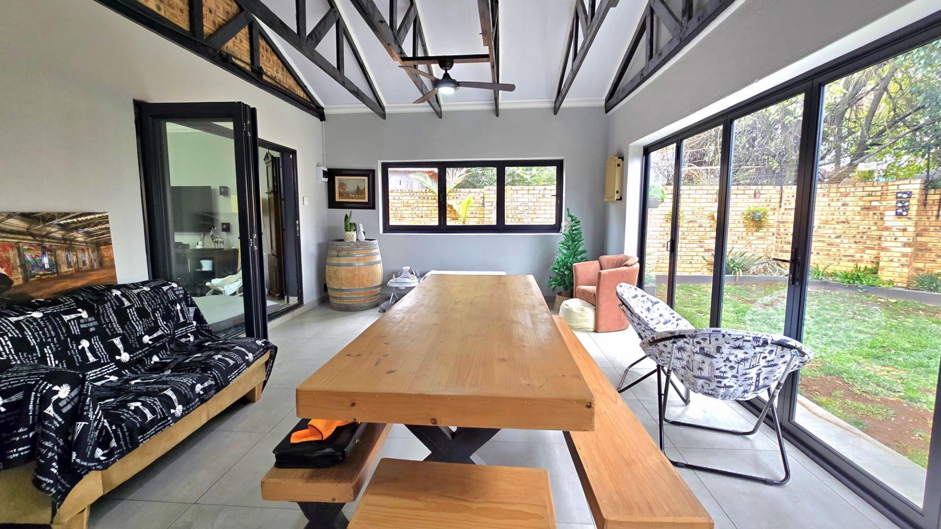 Step inside to discover the heart of this home: an open-plan kitchen and lounge area that epitomizes contemporary elegance. With sleek Caesarstone countertops, a gas stove, and a convenient breakfast nook, this space is perfect for both casual meals and hosting guests. The kitchen and lounge seamlessly flow into a charming dining area, which opens up to a spacious enclosed patio through stacker doors. This patio is an entertainer's delight, featuring a built-in braai area and offering stunning views of the impeccably maintained garden. For added convenience, a guest toilet is situated on the ground floor.