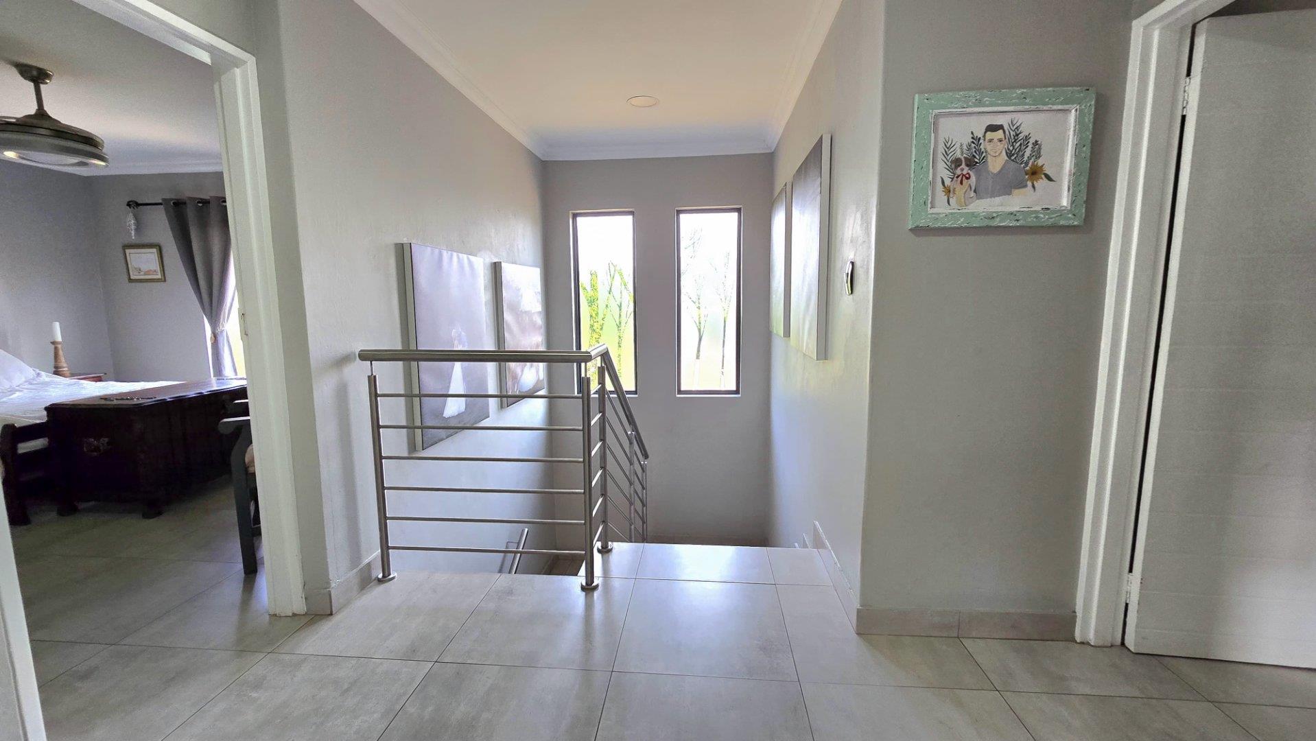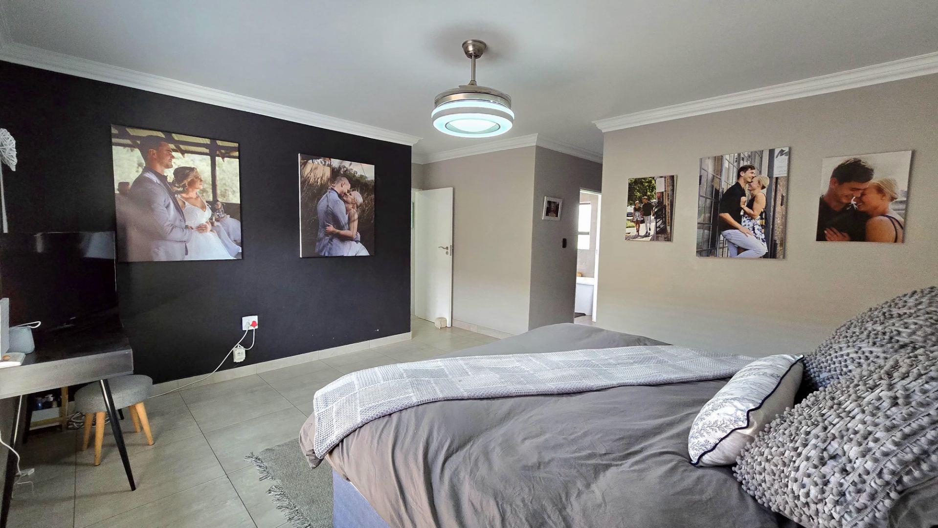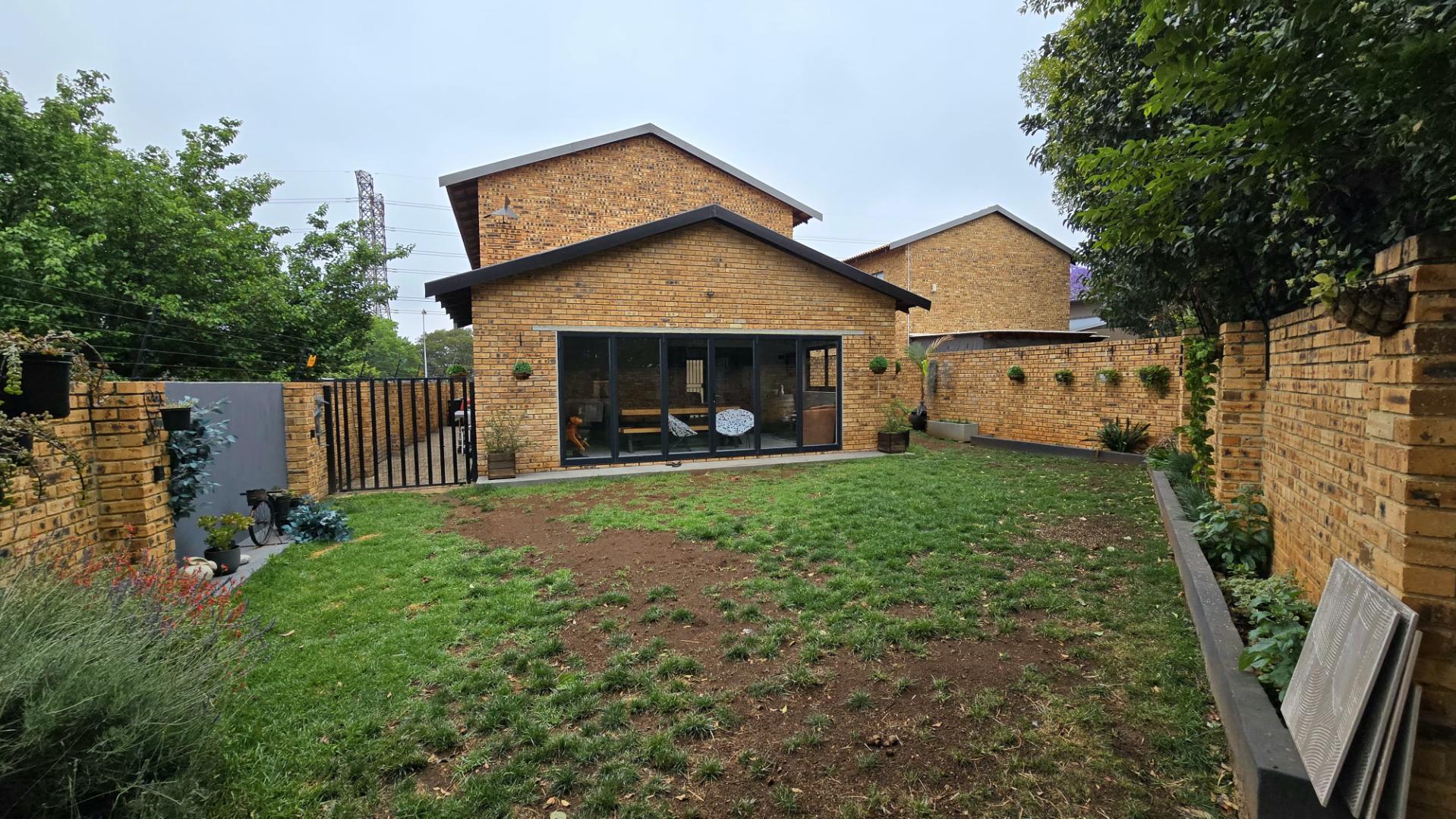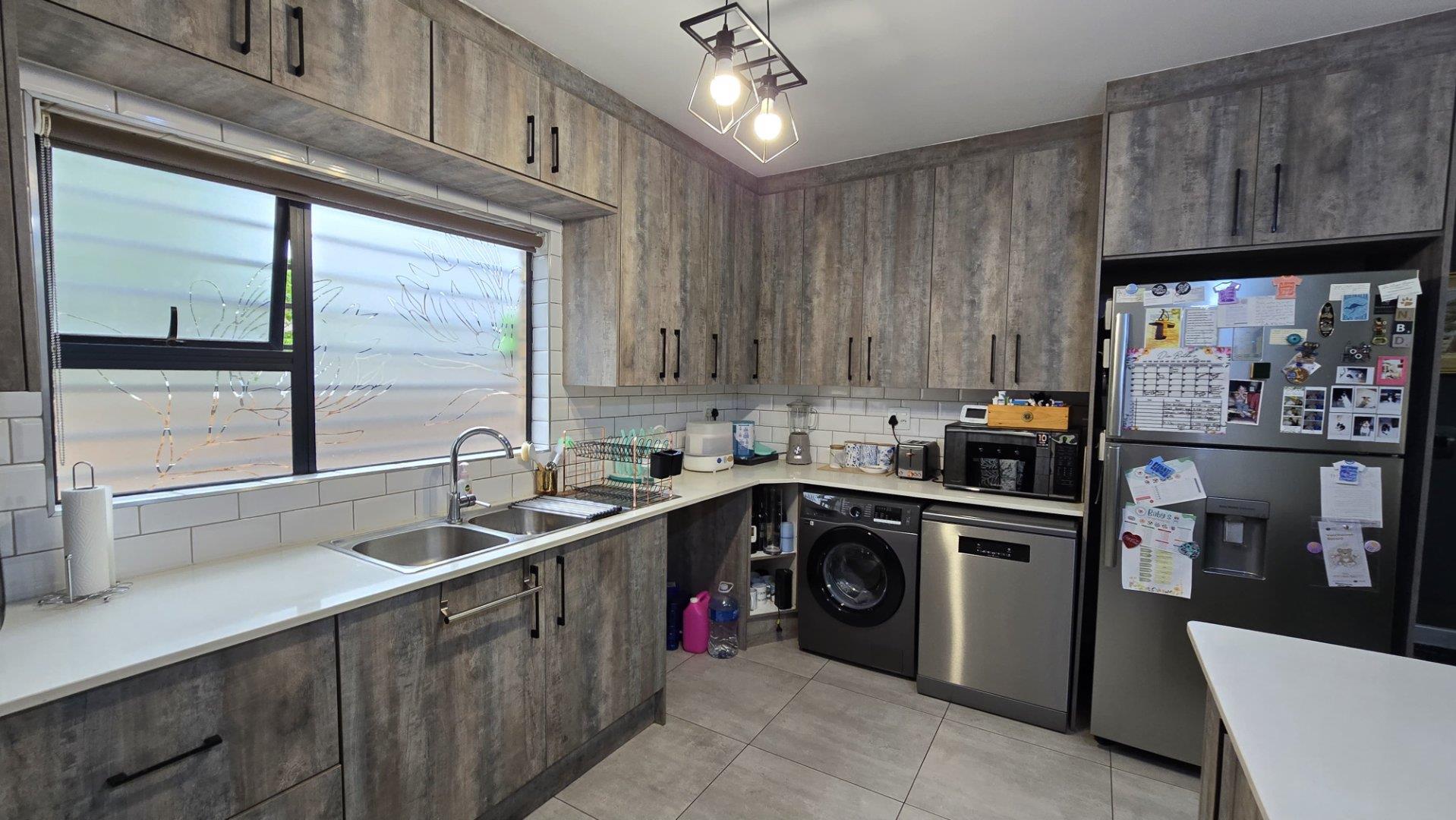 Step inside to discover the heart of this home: an open-plan kitchen and lounge area that epitomizes contemporary elegance. With sleek Caesarstone countertops, a gas stove, and a convenient breakfast nook, this space is perfect for both casual meals and hosting guests. The kitchen and lounge seamlessly flow into a charming dining area, which opens up to a spacious enclosed patio through stacker doors. This patio is an entertainer's delight, featuring a built-in braai area and offering stunning views of the impeccably maintained garden. For added convenience, a guest toilet is situated on the ground floor.