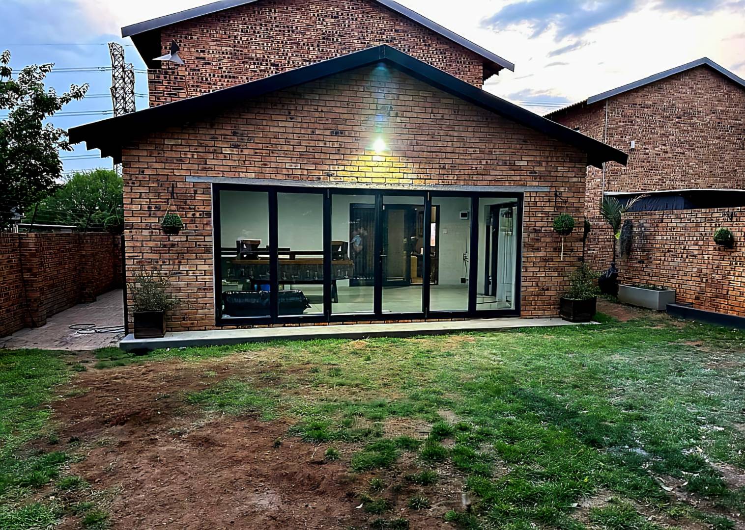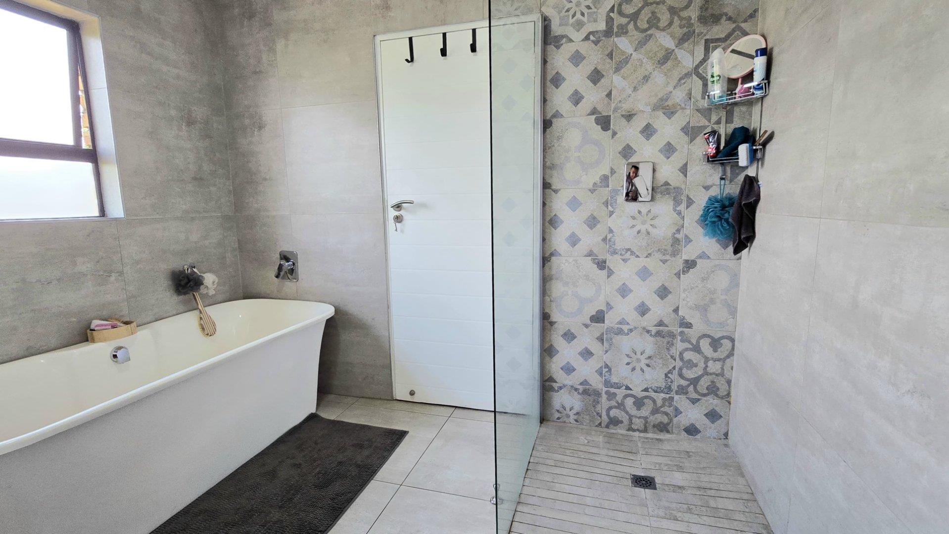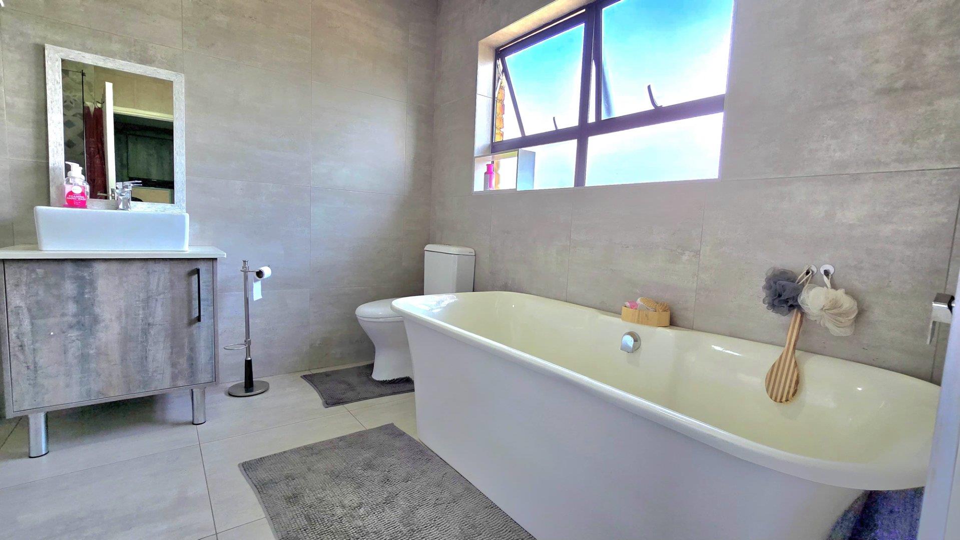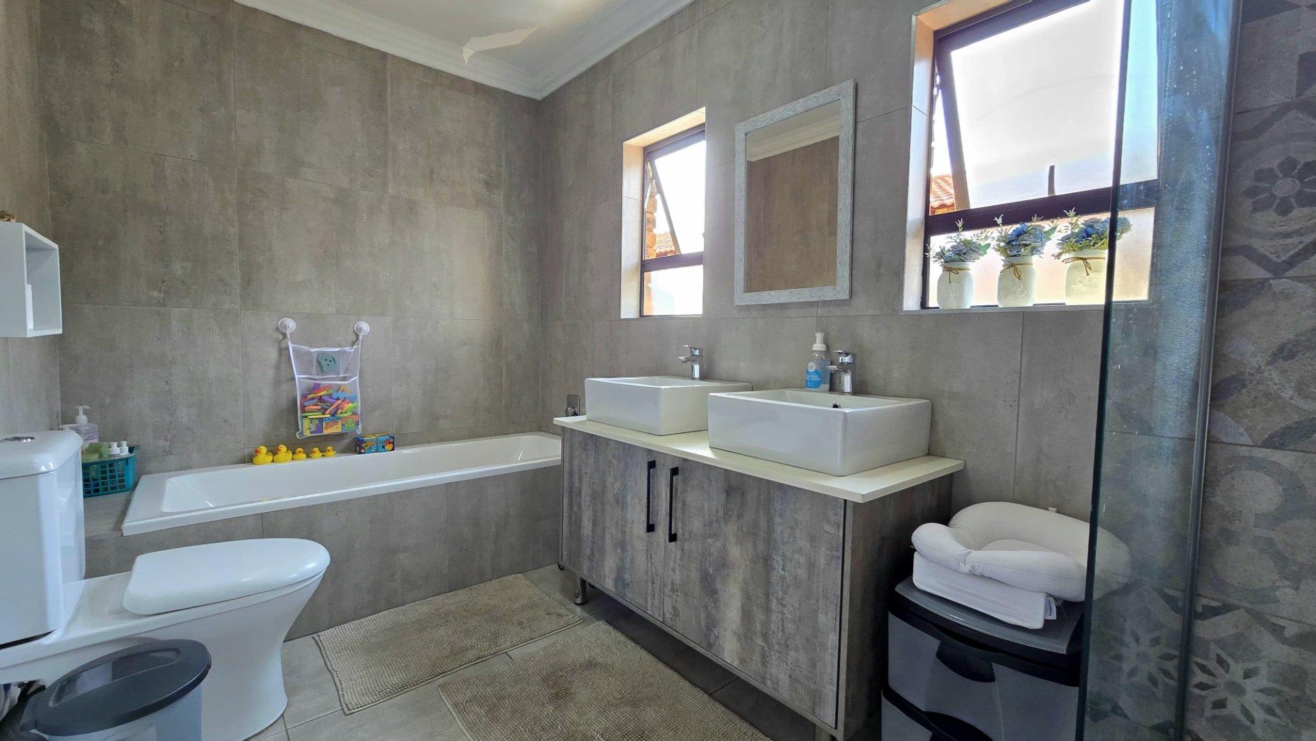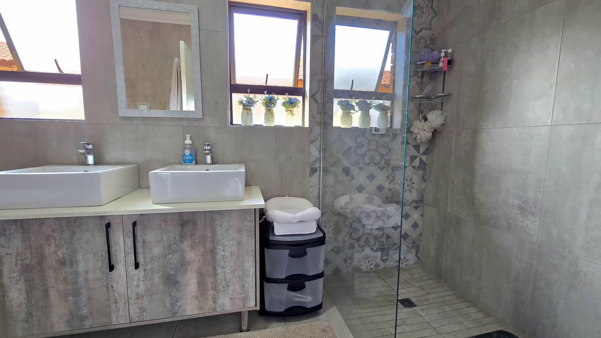 Step inside to discover the heart of this home: an open-plan kitchen and lounge area that epitomizes contemporary elegance. With sleek Caesarstone countertops, a gas stove, and a convenient breakfast nook, this space is perfect for both casual meals and hosting guests. The kitchen and lounge seamlessly flow into a charming dining area, which opens up to a spacious enclosed patio through stacker doors. This patio is an entertainer's delight, featuring a built-in braai area and offering stunning views of the impeccably maintained garden. For added convenience, a guest toilet is situated on the ground floor.
