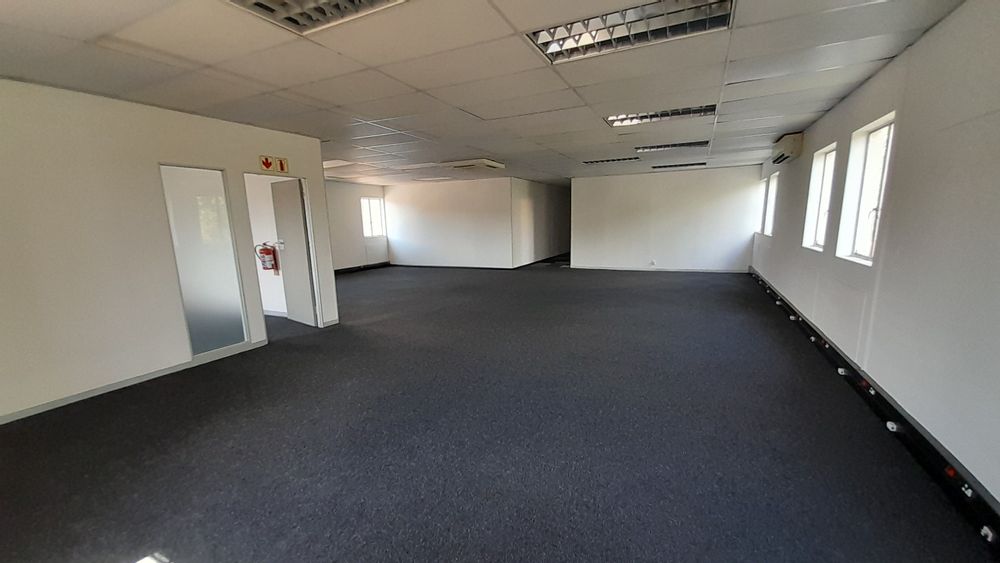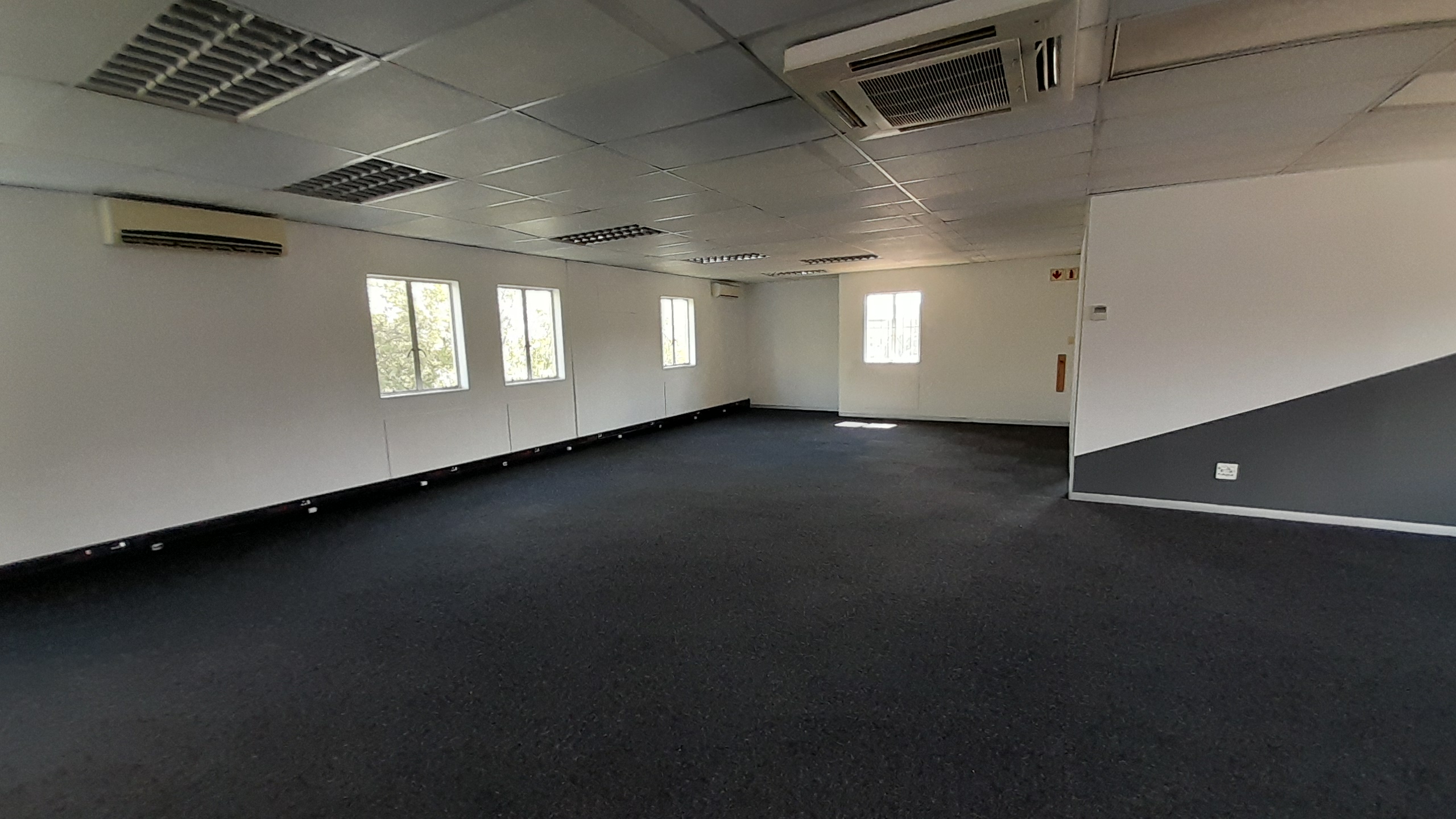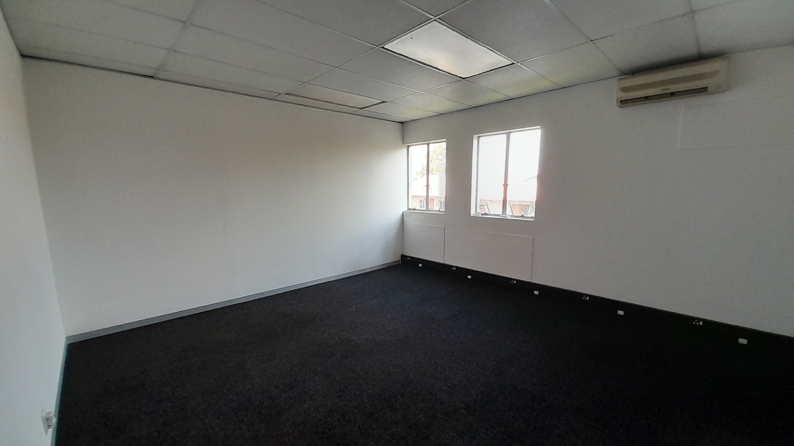 The layout comprises one boardroom, two closed offices, and a spacious open-plan area. The unit features carpet flooring throughout, central air conditioning, and excellent natural light from large perimeter windows, creating a bright and comfortable working environment. Communal ablutions and a shared kitchen are available within the building, which is multi-tenanted and fibre-ready for high-speed internet connectivity.