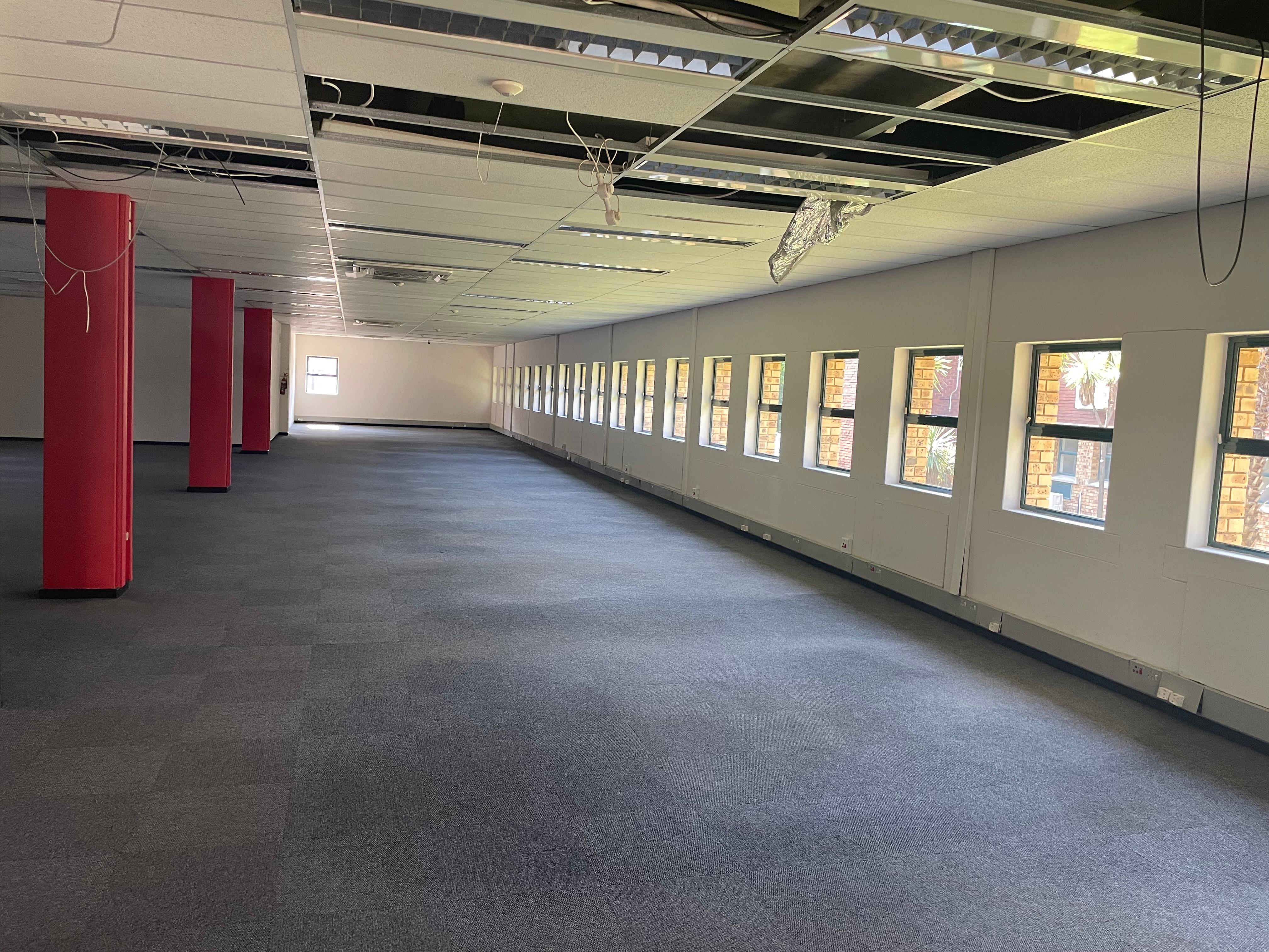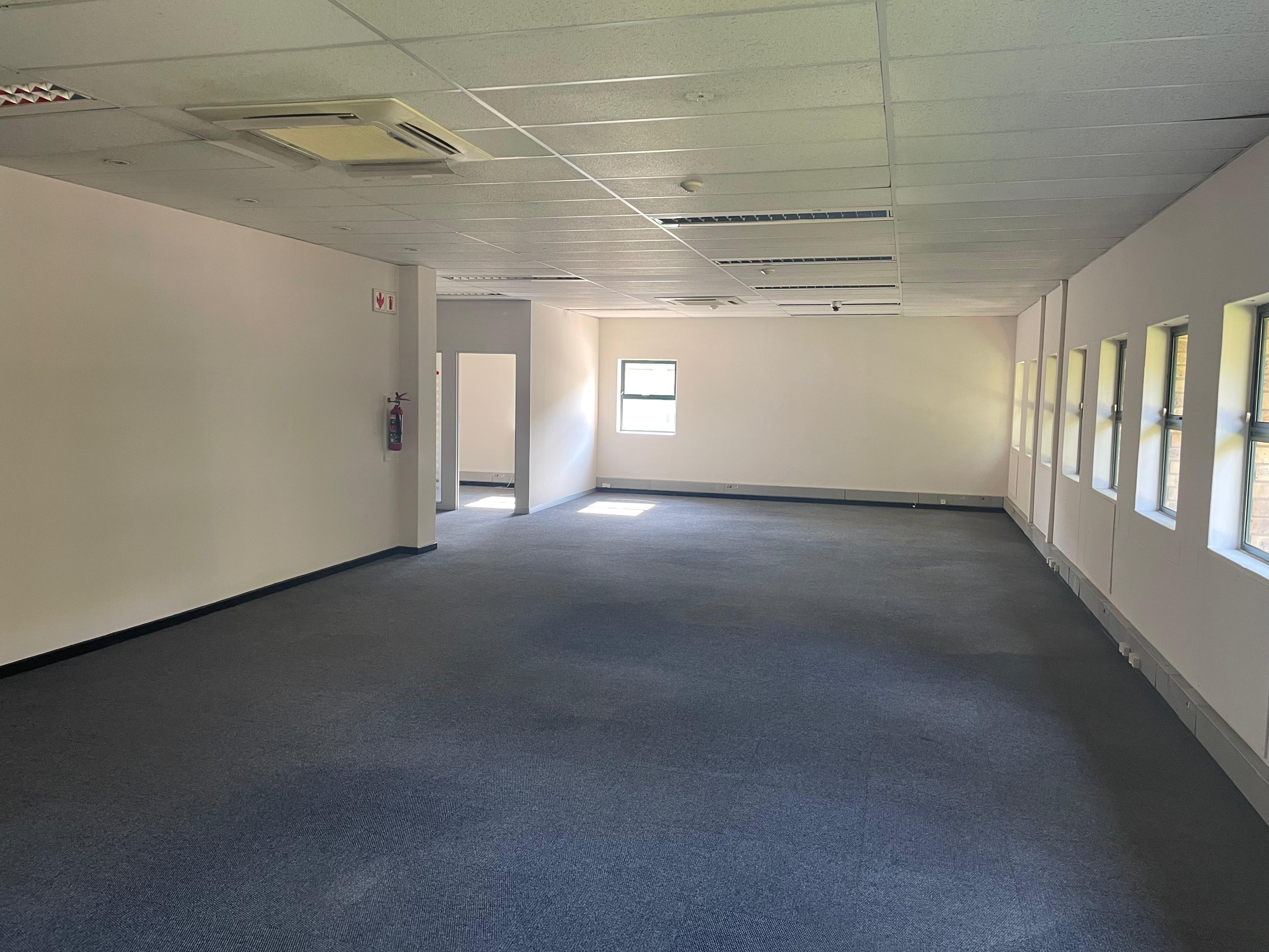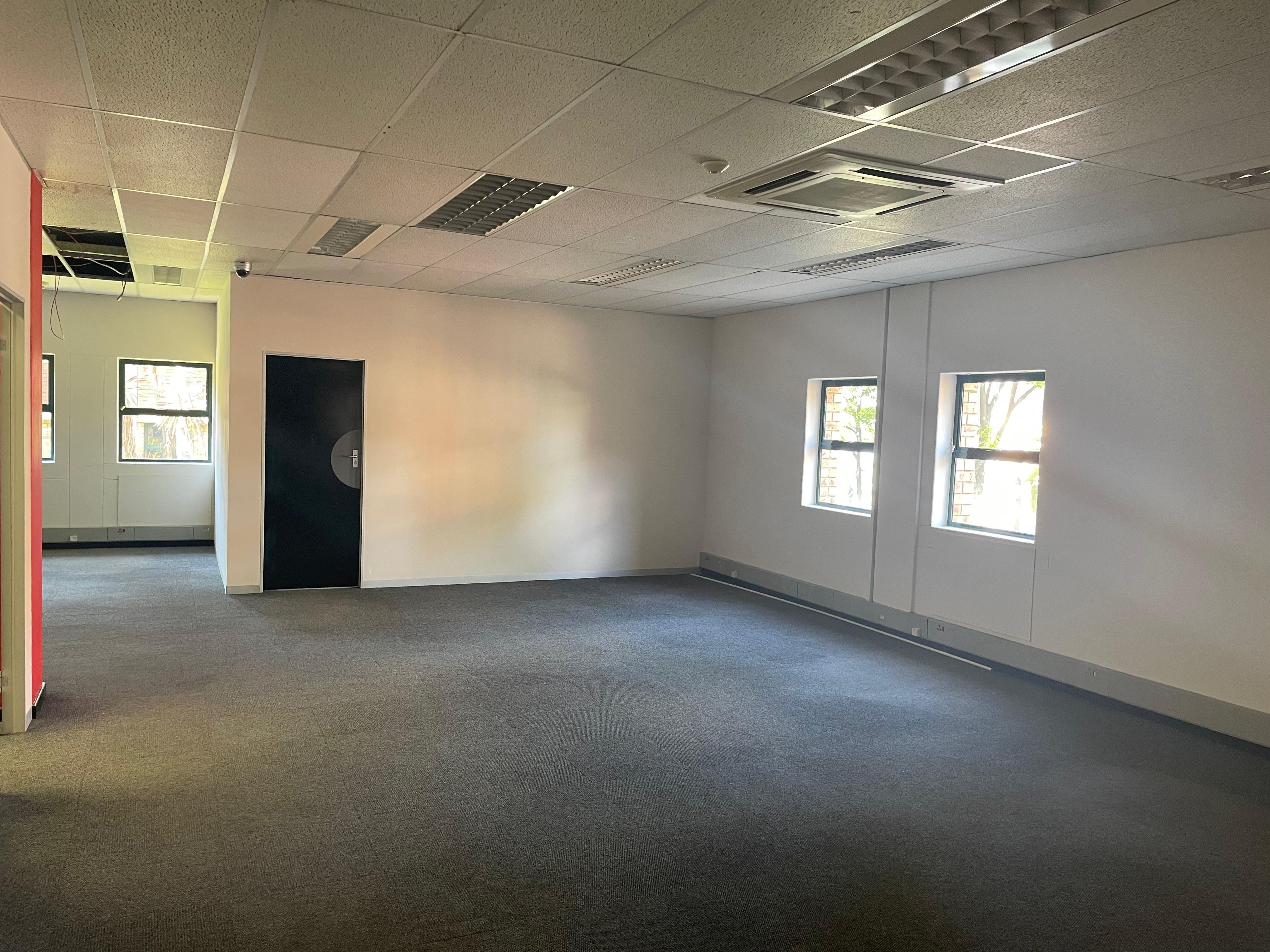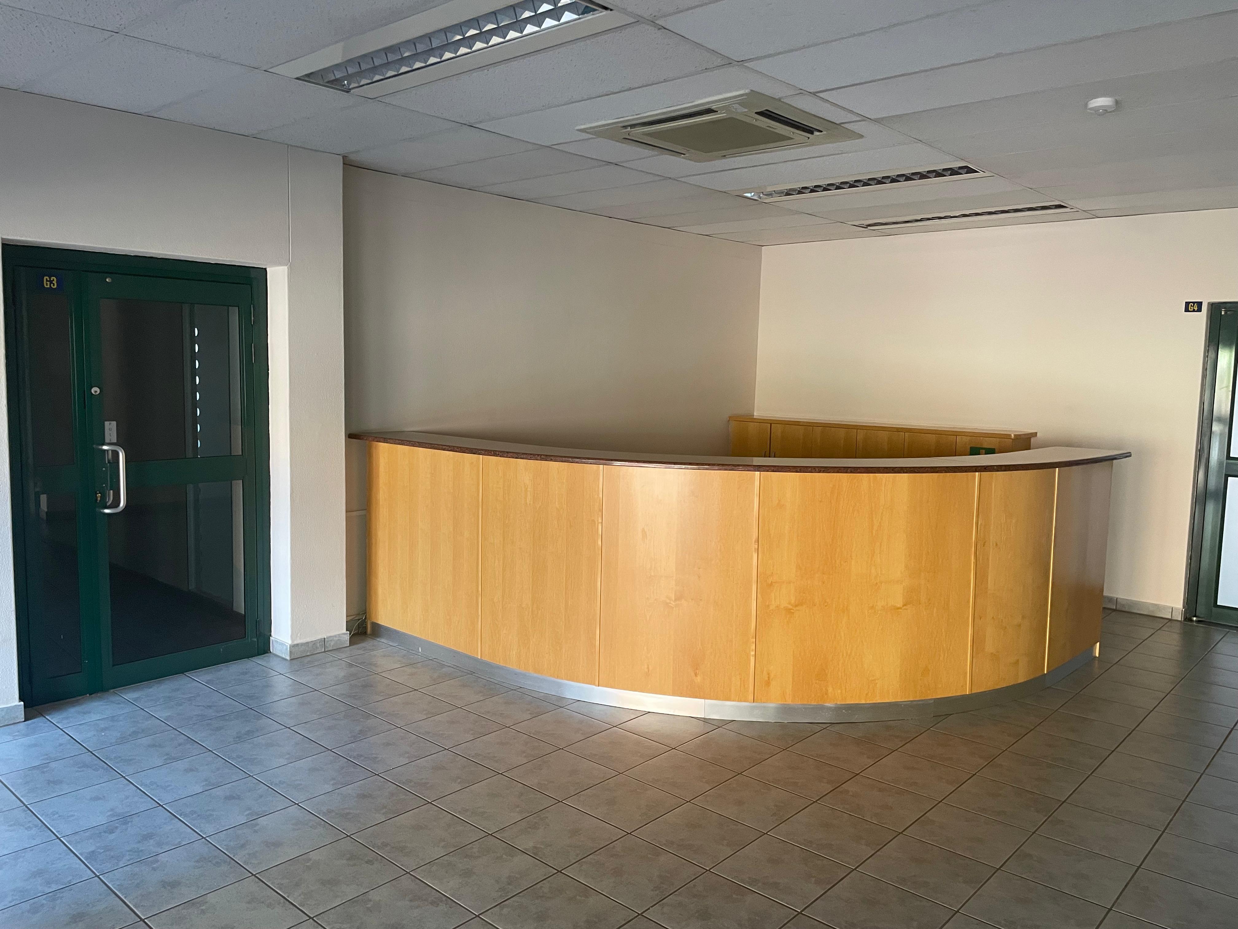 The space includes a welcoming reception area, open-plan and private offices, boardroom facilities, a kitchenette, and private ablutions. Large windows provide excellent natural light throughout, creating a bright and productive work environment.
