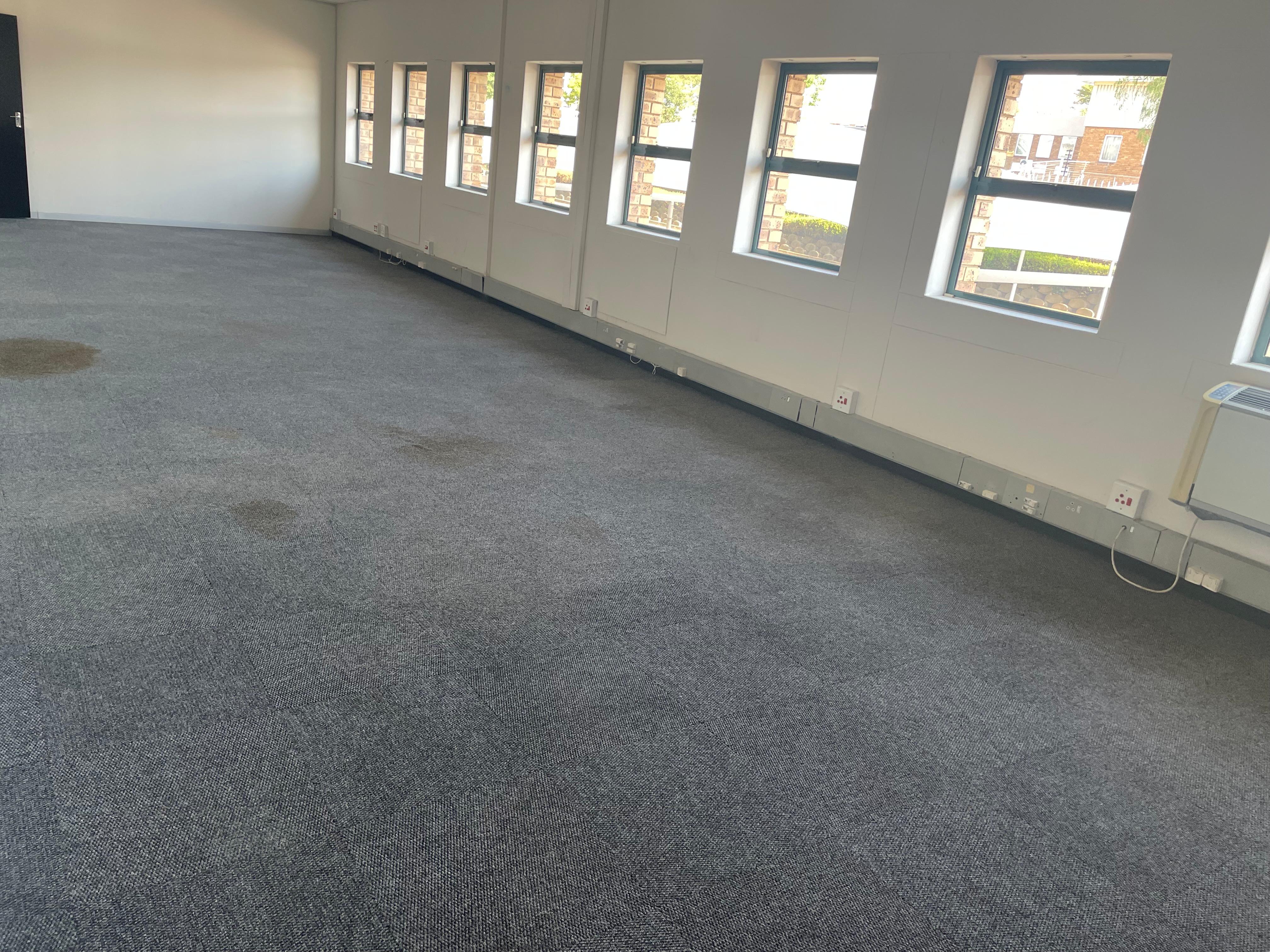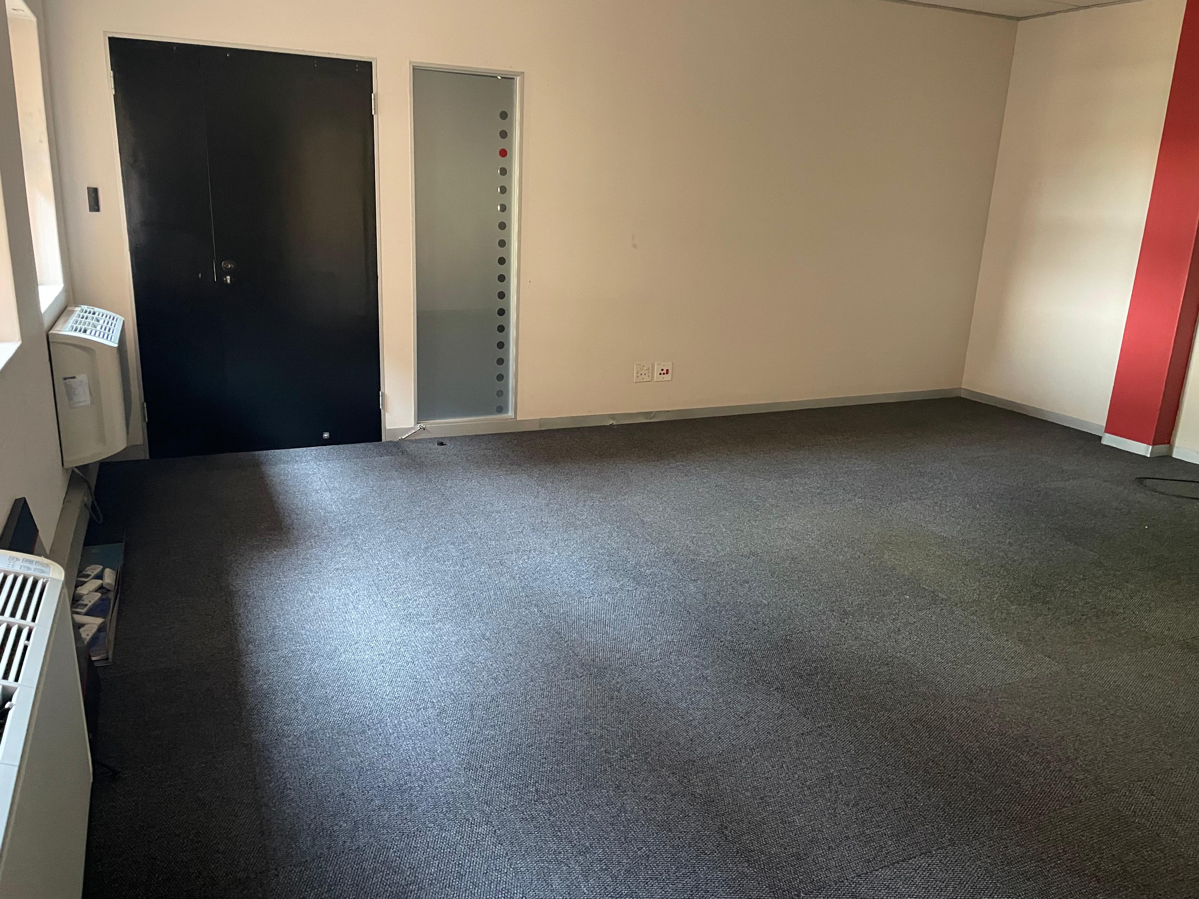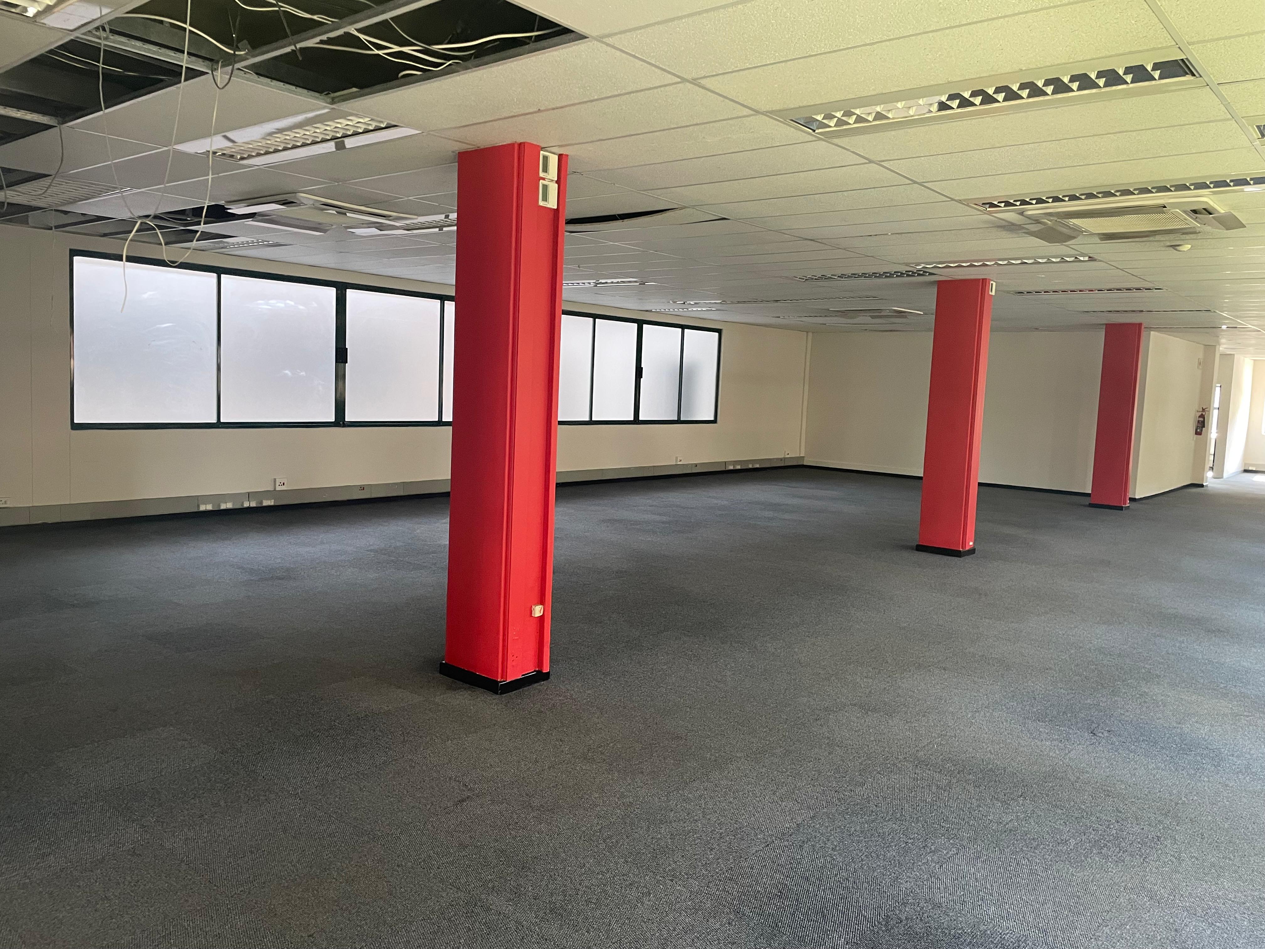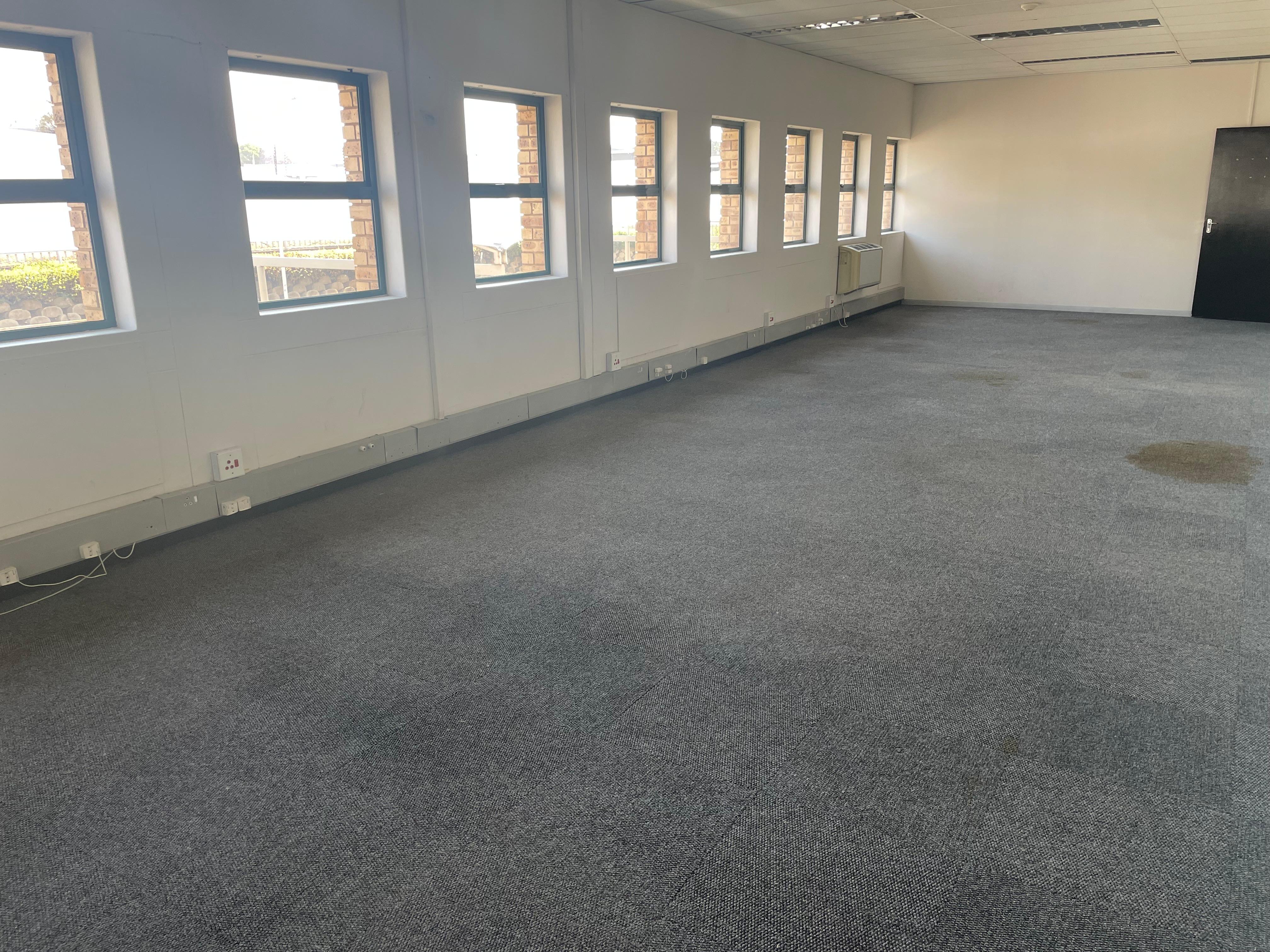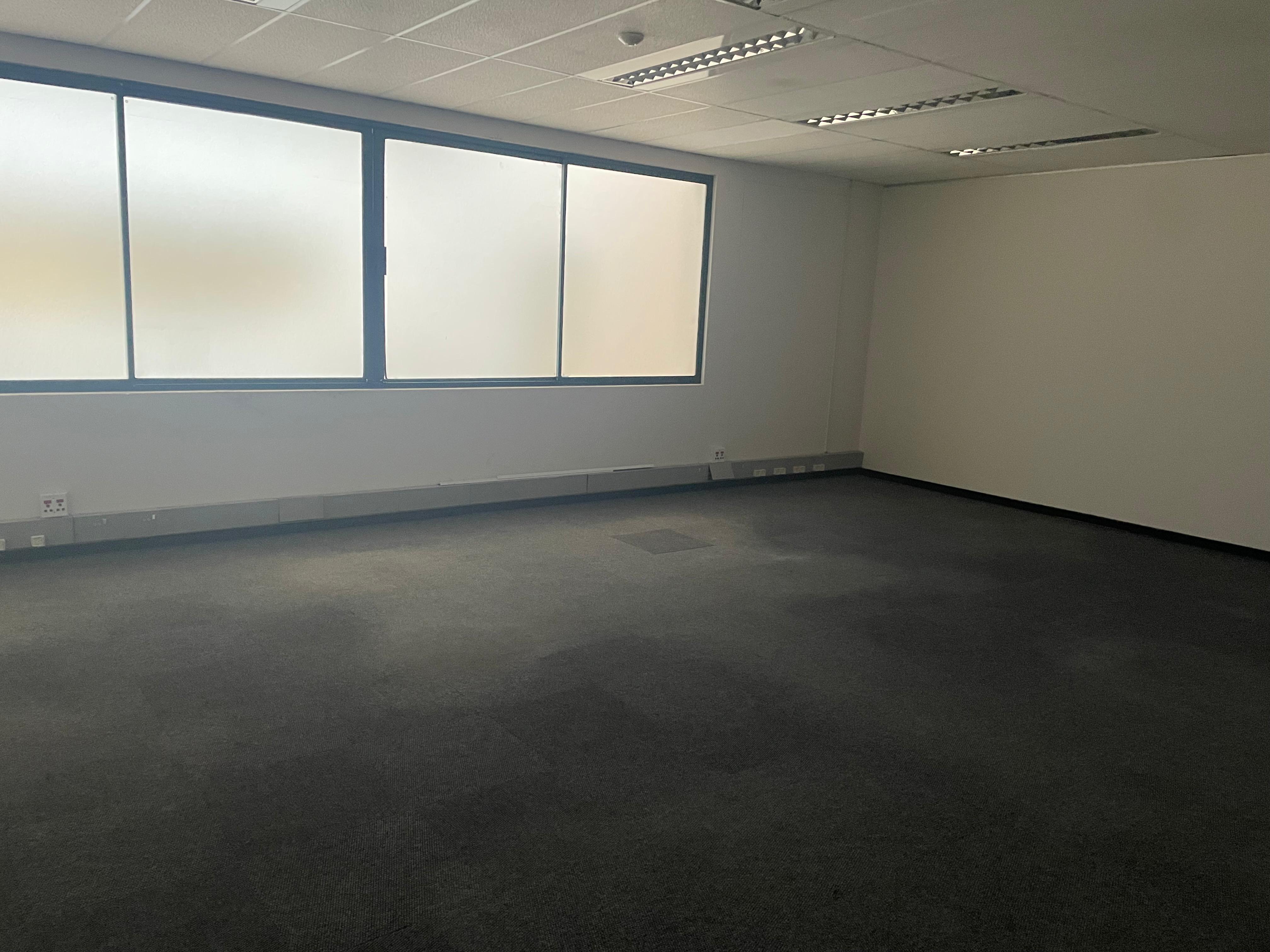 The space includes a welcoming reception area, open-plan and private offices, boardroom facilities, a kitchenette, and private ablutions. Large windows provide excellent natural light throughout, creating a bright and productive work environment.