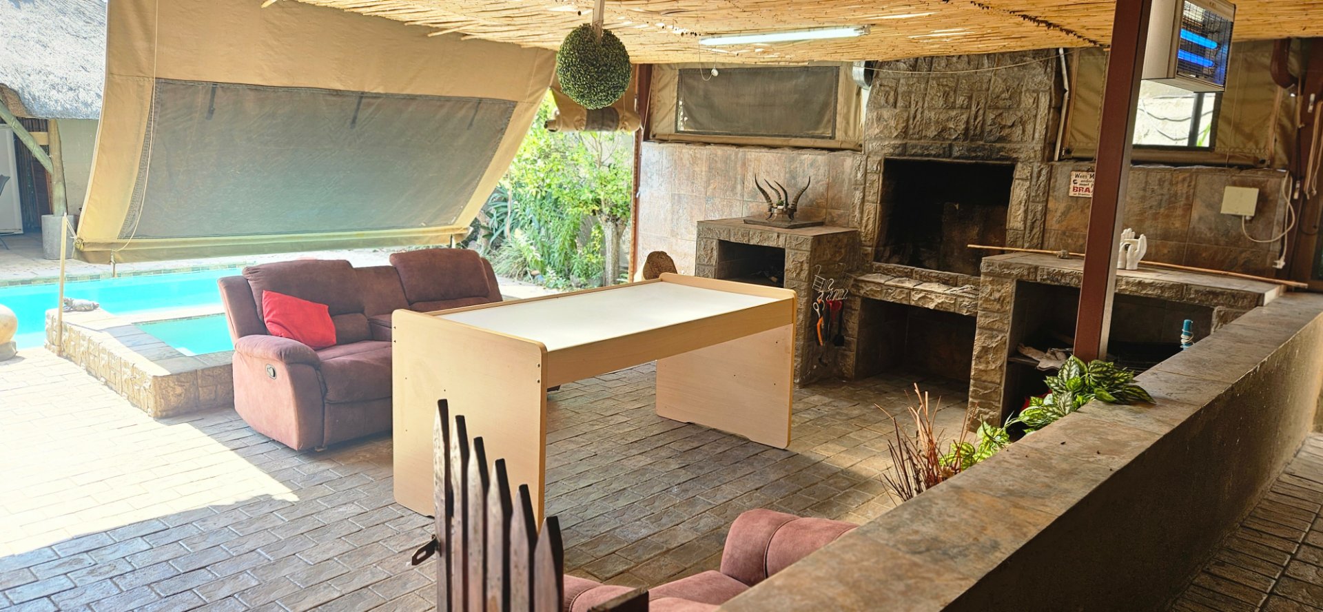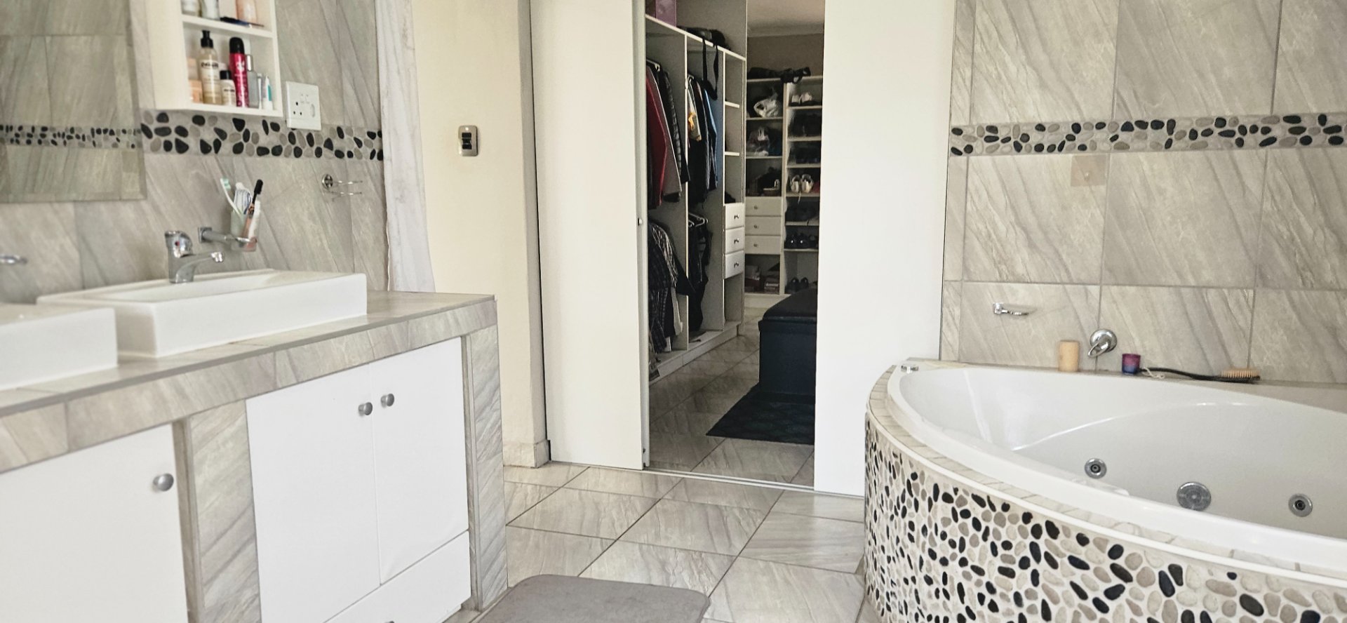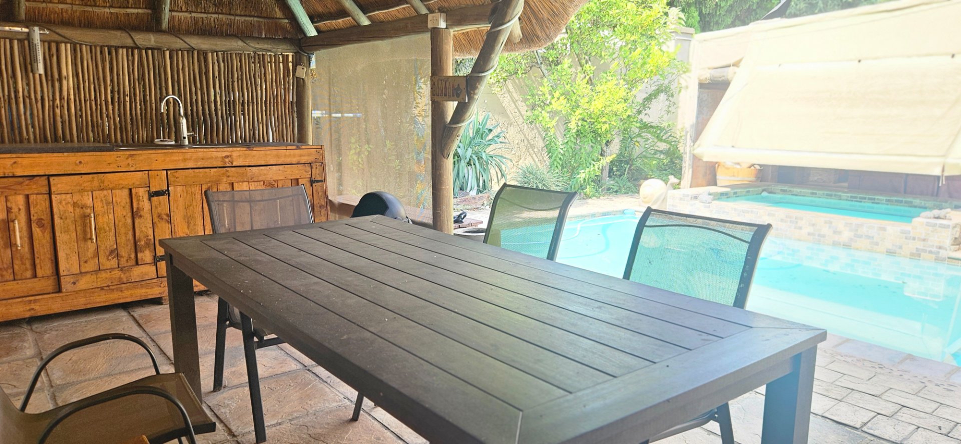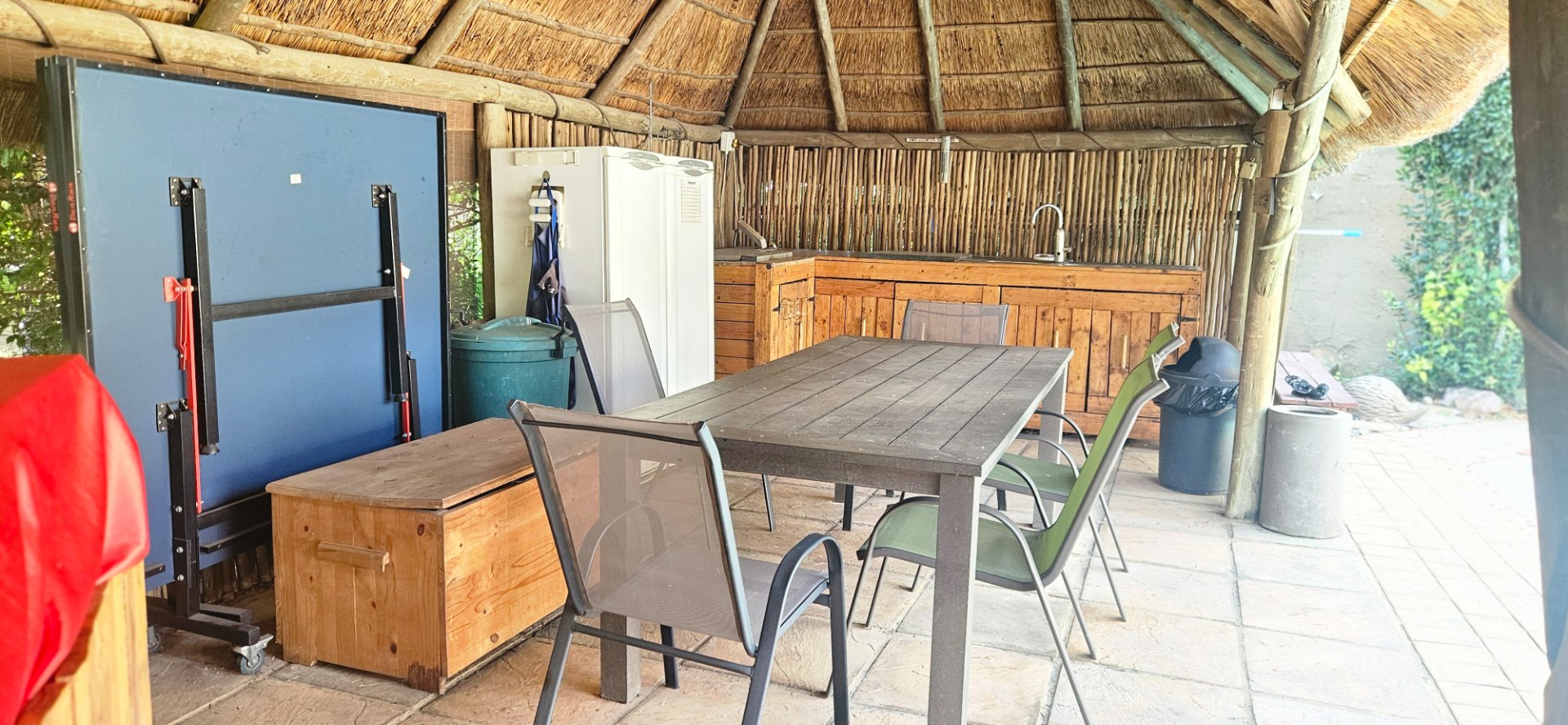 Outside is an entertainer’s dream, offering a pool with jacuzzi, a large lapa with built-in basin and prep area, a fridge and freezer, and a tap with heated water. The covered patio includes canvas shade covers, as well as a built-in braai area with countertops, ideal for hosting. Additional outdoor features include a courtyard with a fountain and a separate outside cabin suitable for domestic quarters.