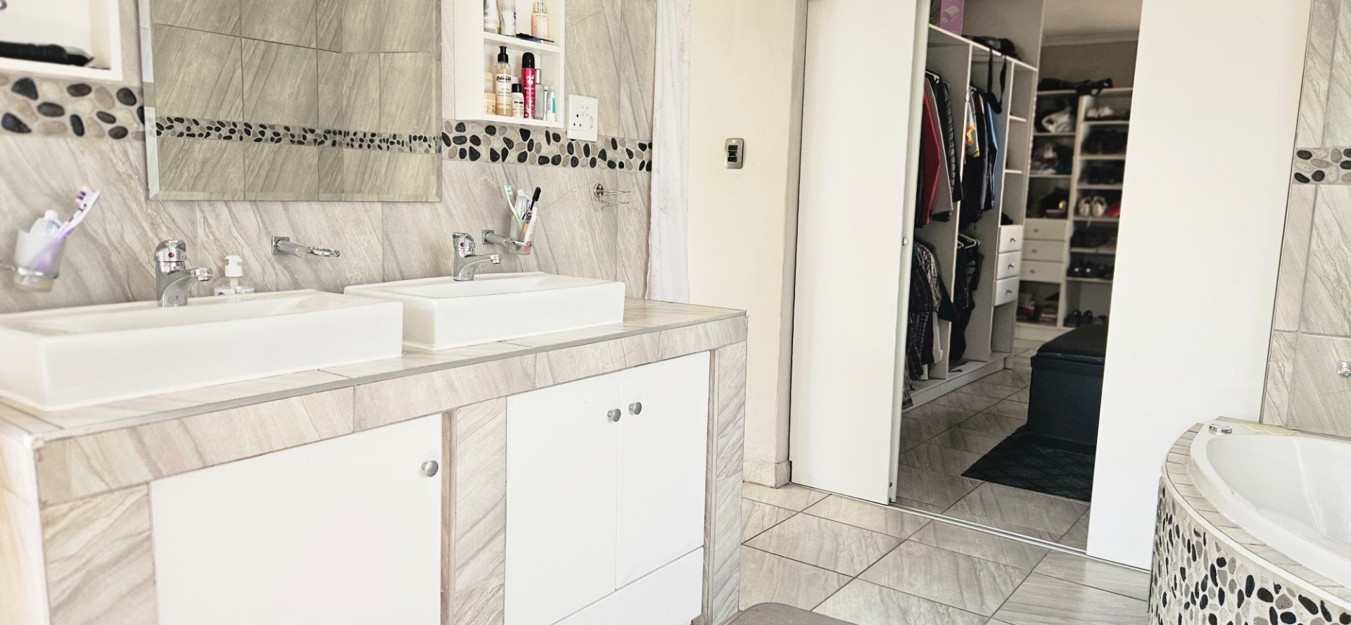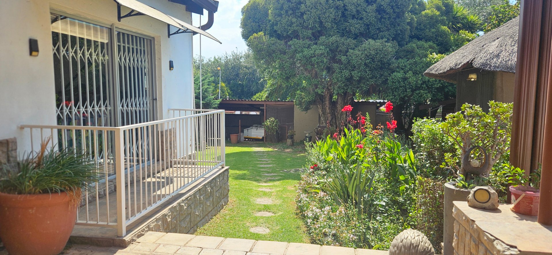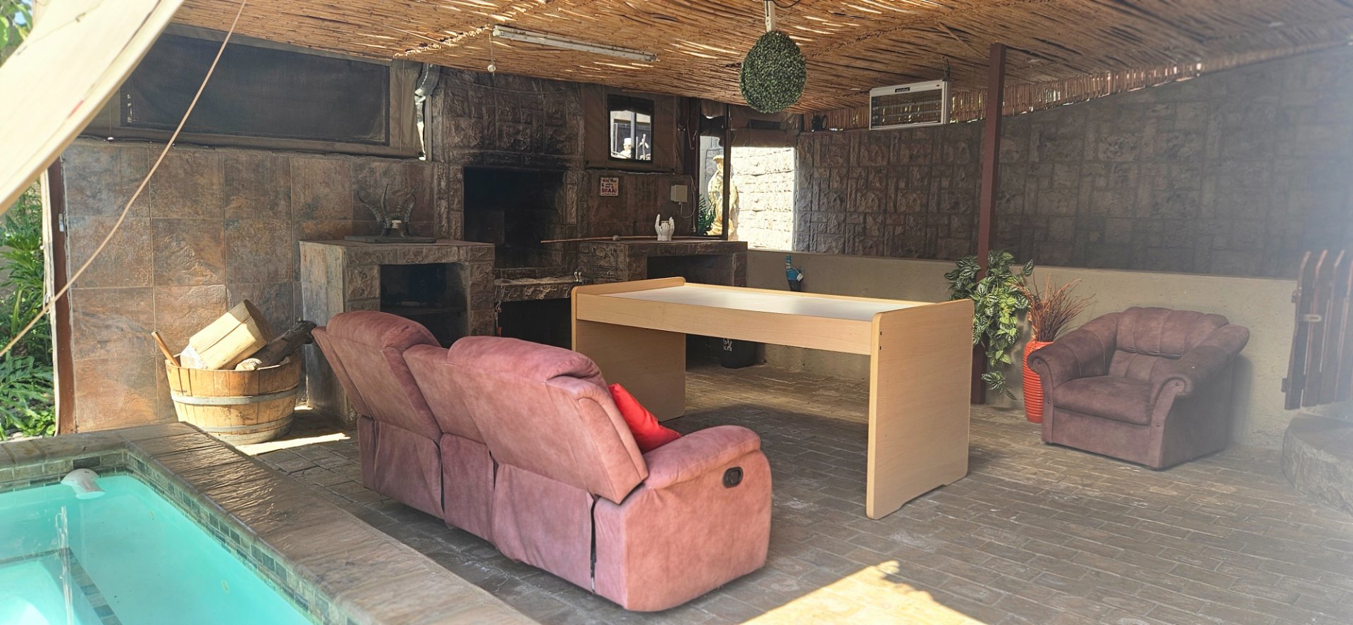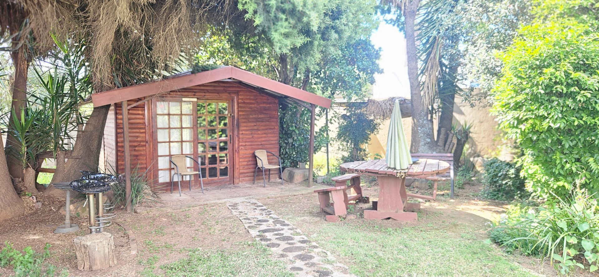 Outside is an entertainer’s dream, offering a pool with jacuzzi, a large lapa with built-in basin and prep area, a fridge and freezer, and a tap with heated water. The covered patio includes canvas shade covers, as well as a built-in braai area with countertops, ideal for hosting. Additional outdoor features include a courtyard with a fountain and a separate outside cabin suitable for domestic quarters.