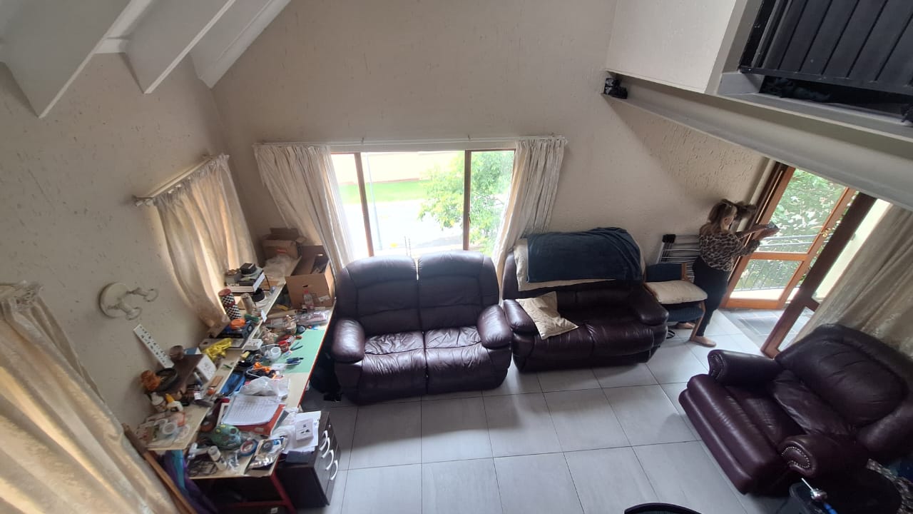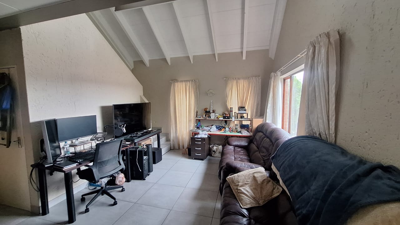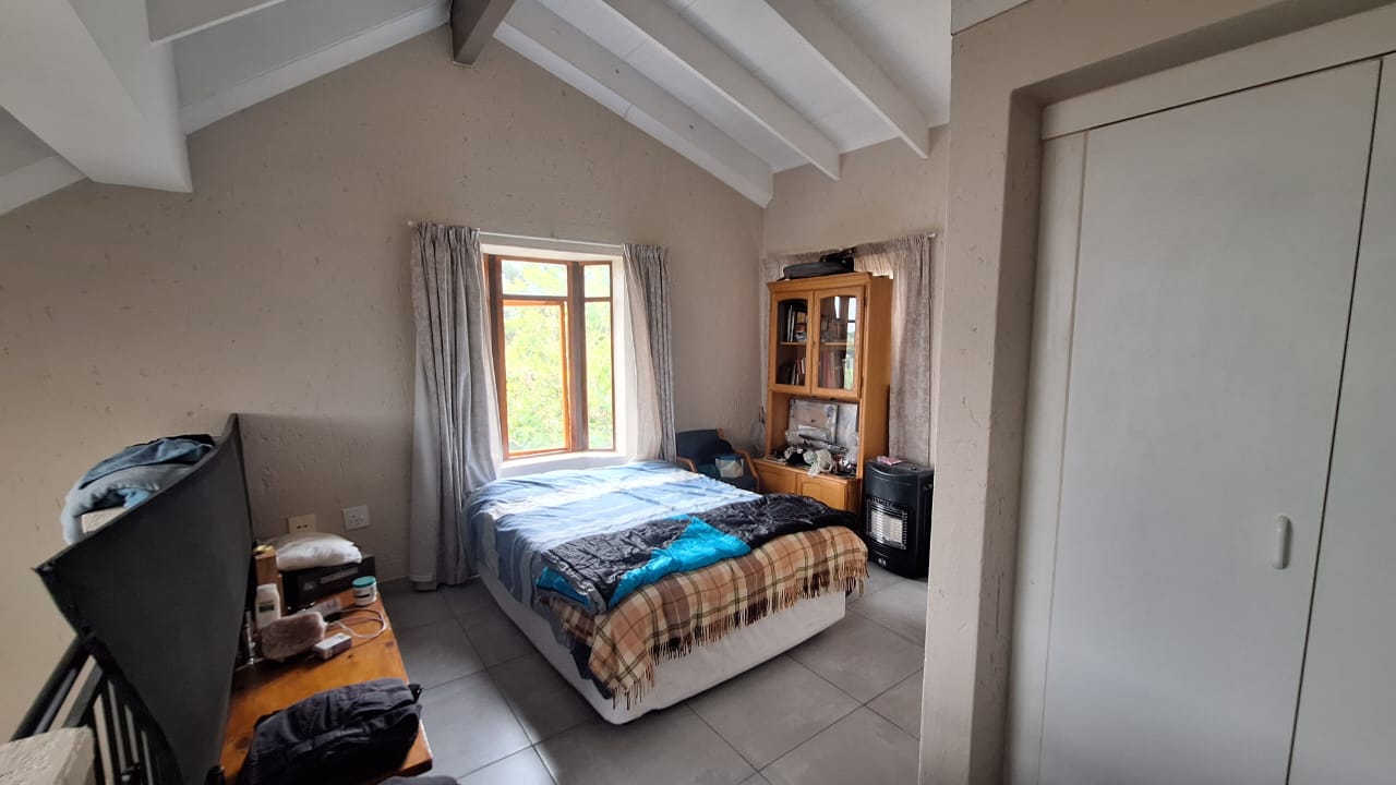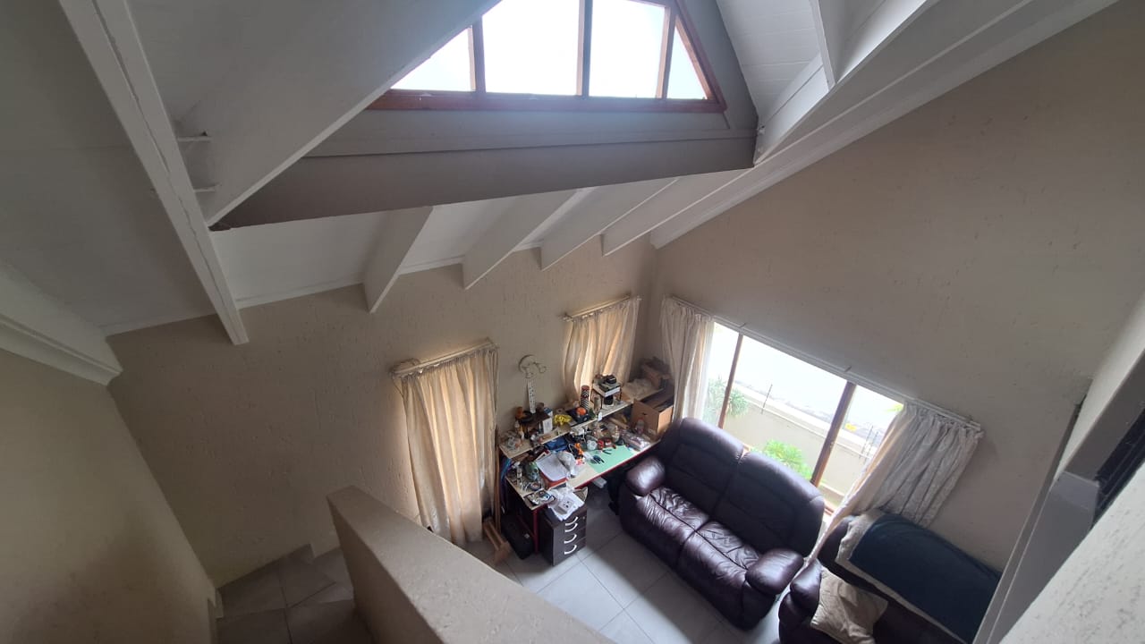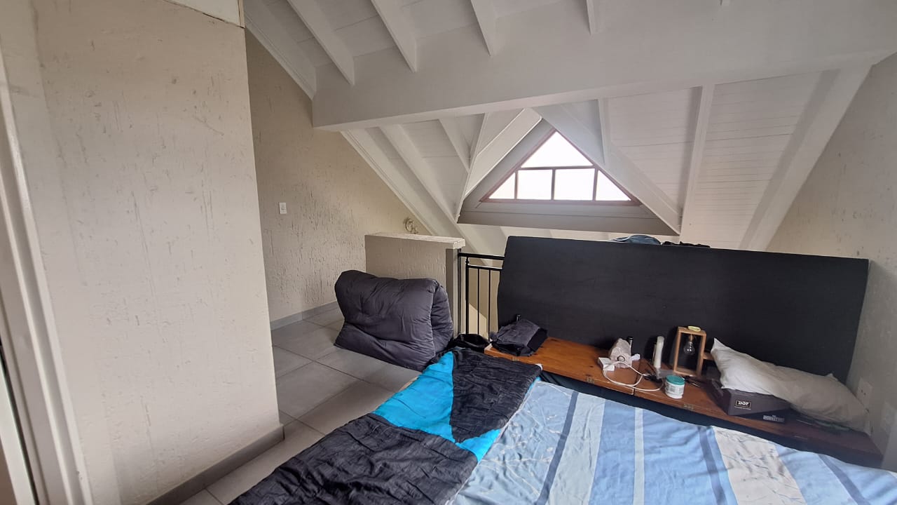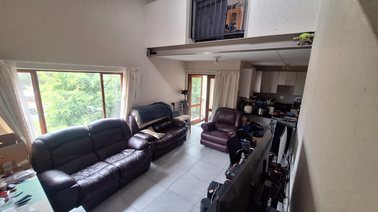 The open - plan lounge area creates a warm living space and flows out onto a charming balcony - ideal for enjoying your morning coffee or unwinding after a long day. Upstairs , you will find a spacious loft - style main bedroom offering privacy and comfort.The bedroom includes generous built - in cupboards for ample storage and an en -suite bathroom fitted with a bath { with curtain rail } , basin and toilet.