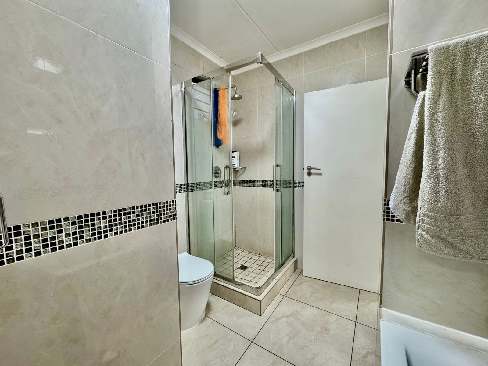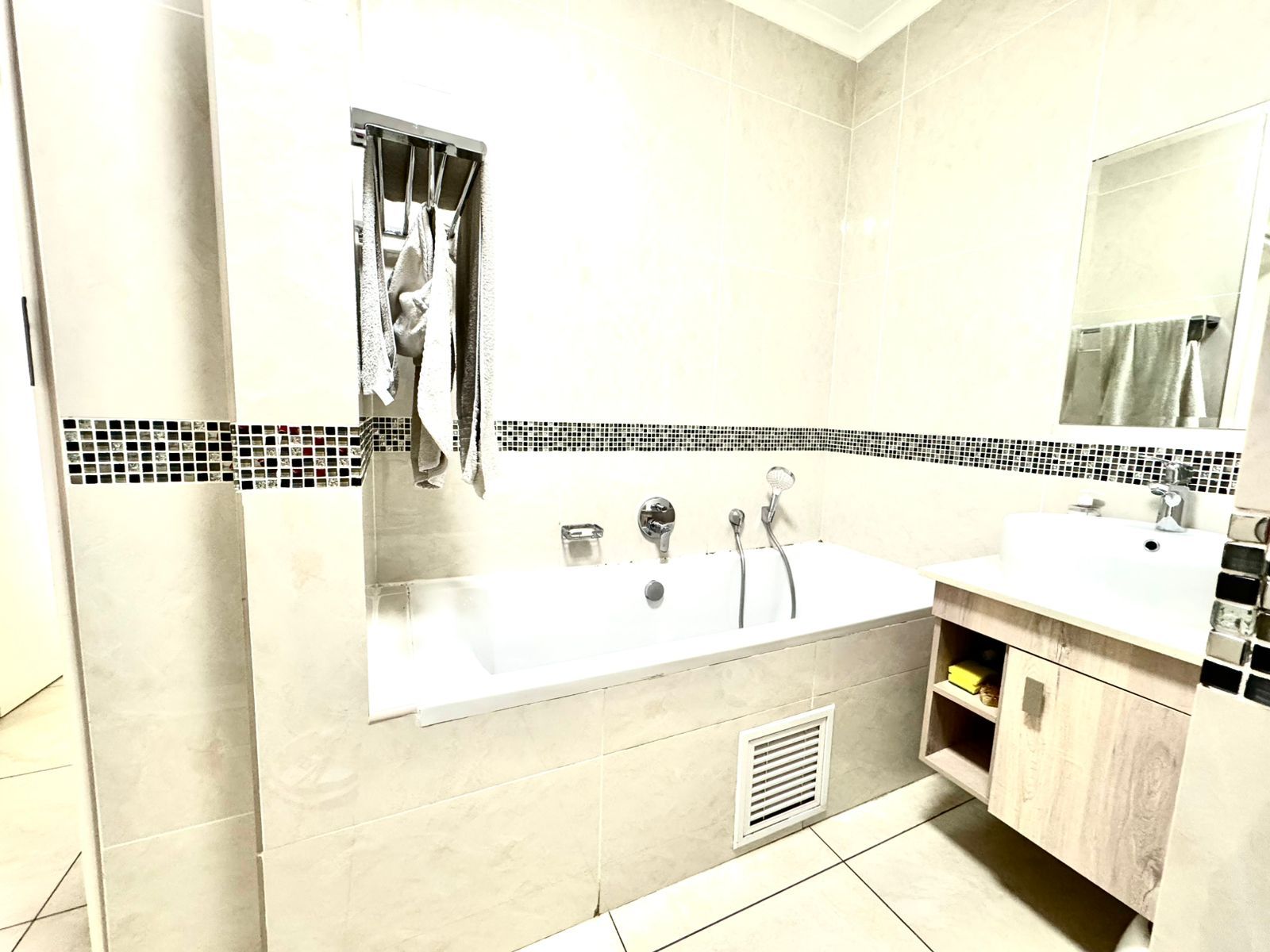 The full bathroom is elegantly finished, complete with a bath, shower, basin, and toilet, offering a touch of everyday luxury. Tiled floors throughout add a modern, clean aesthetic touch and make upkeep a breeze.