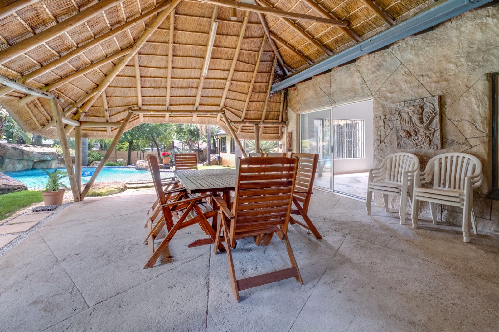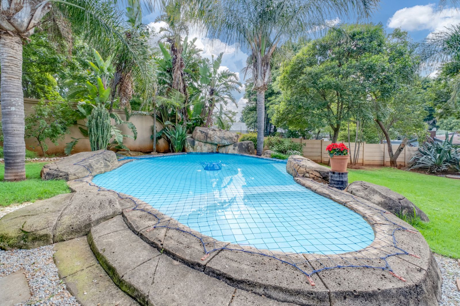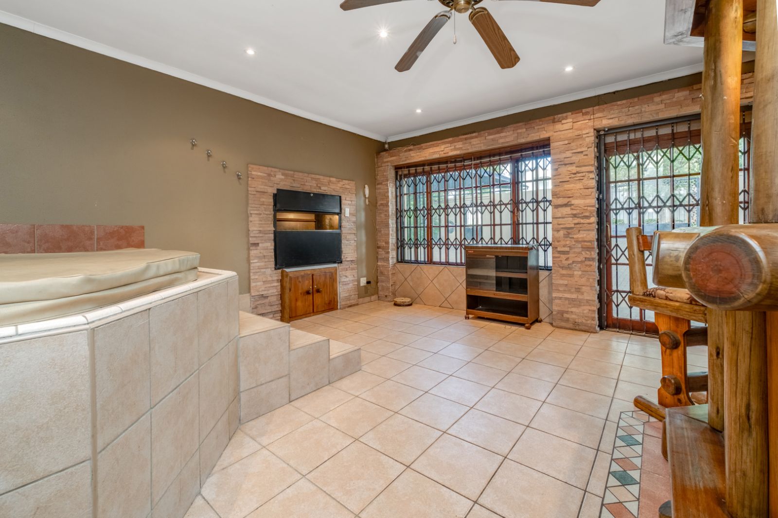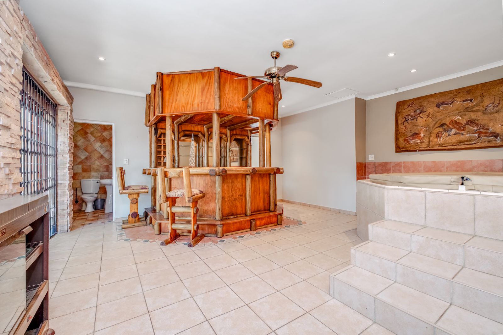 A standout feature of the property is the bespoke entertainment wing, offering a fully equipped bar, jacuzzi, and gas/wood built-in braai — an ideal setting for hosting in style. Outdoor living is equally impressive, with a resort-style pool, boma, and an elegant Lapa fitted with built-in electric braai with rotisserie, all set within a beautifully landscaped garden enhanced by tranquil water features.