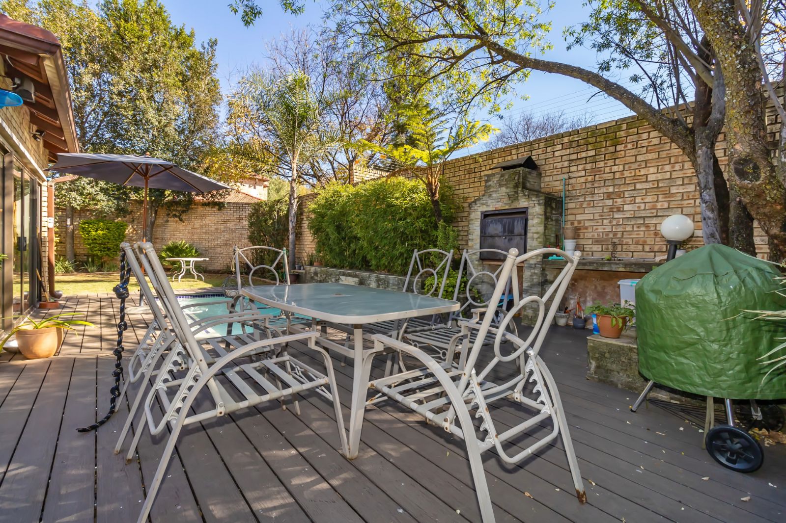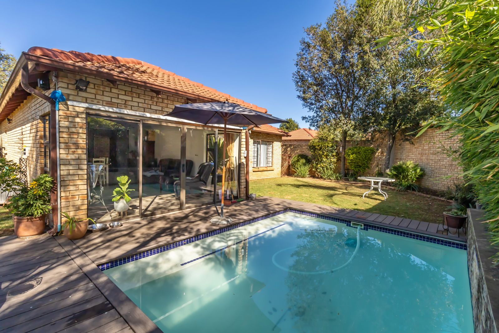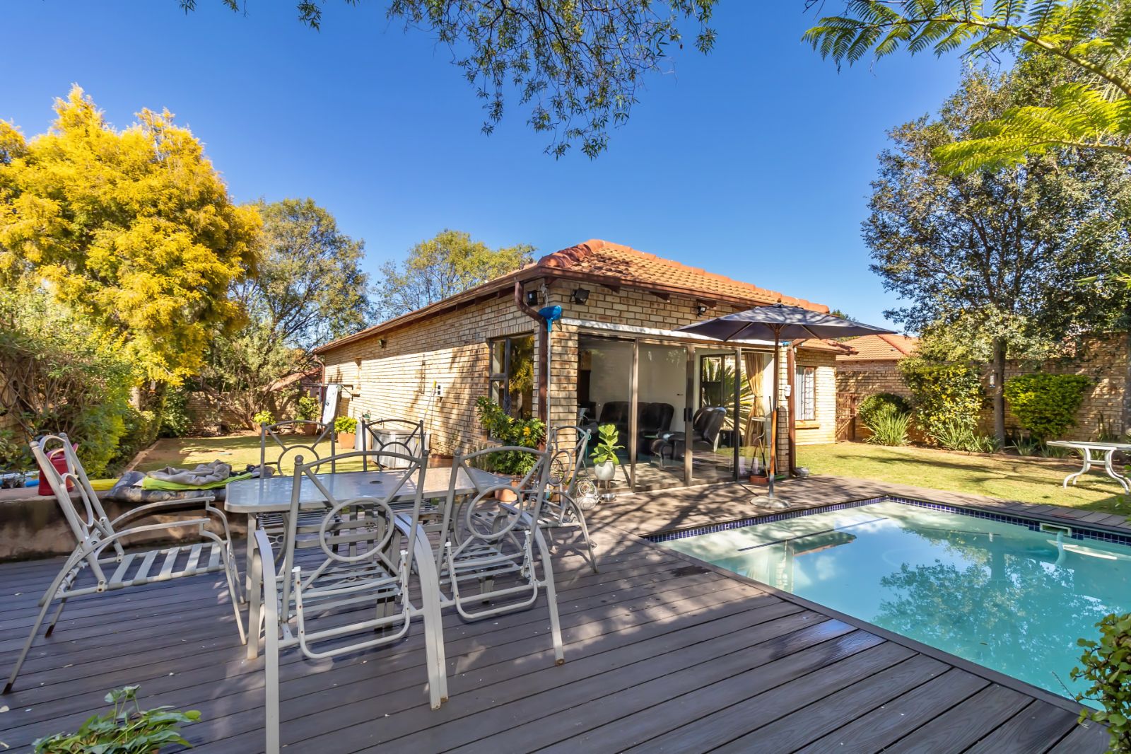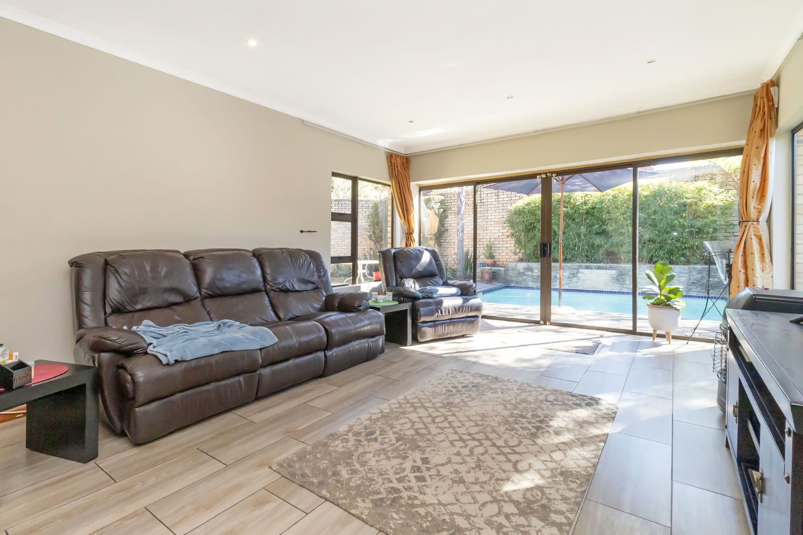 aluminium sliding doors overlooking a nice size garden, a built in braai and a sparkling swimming pool.