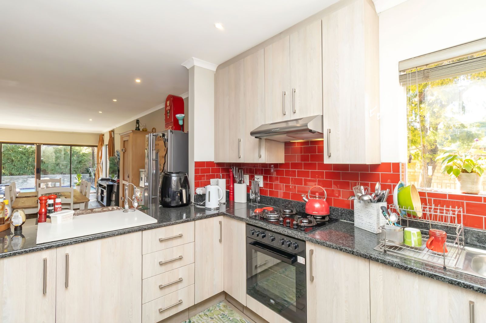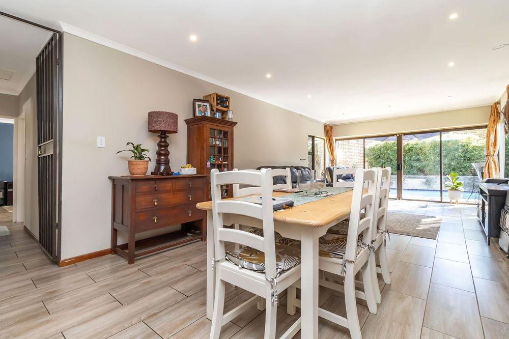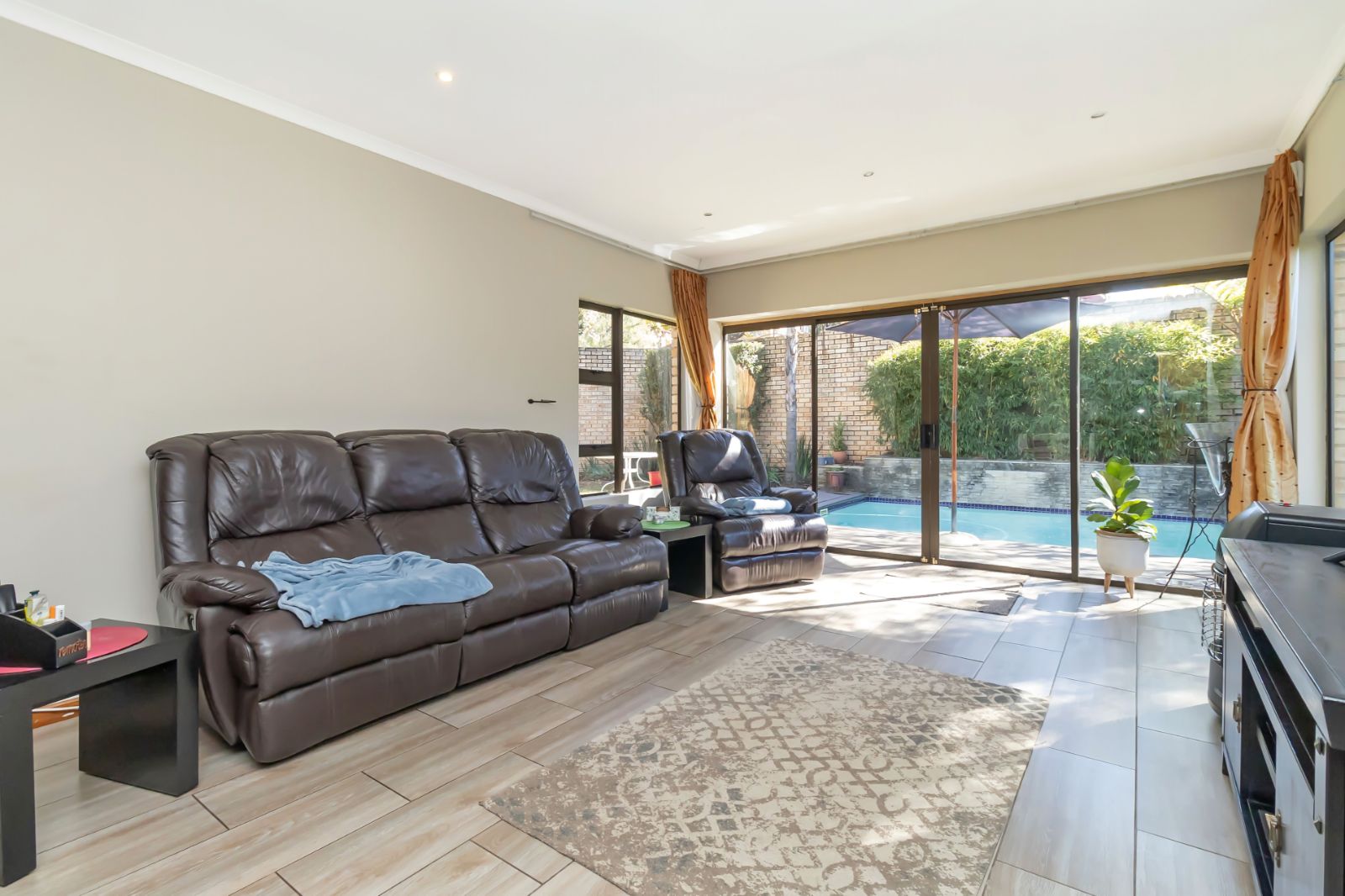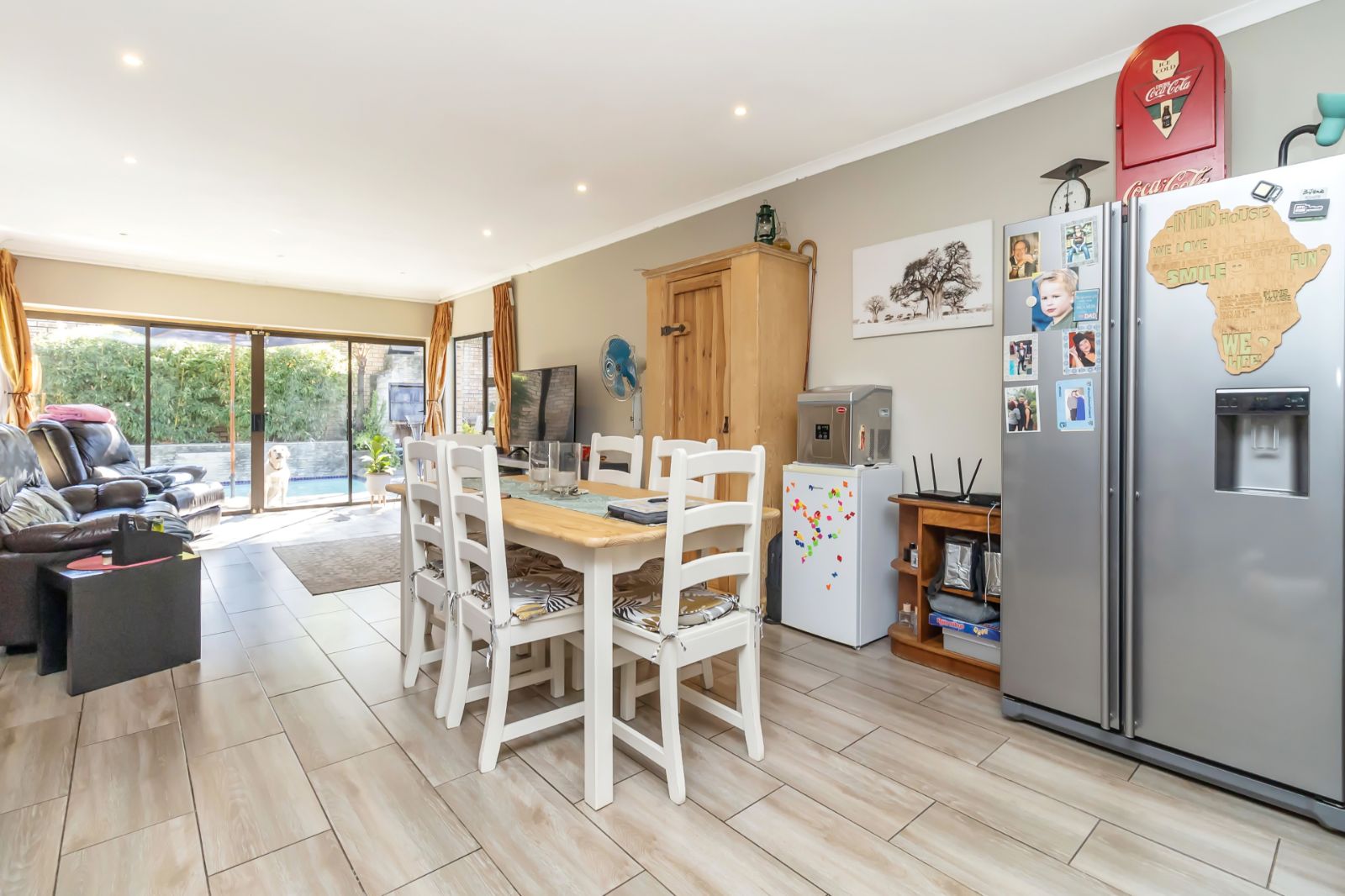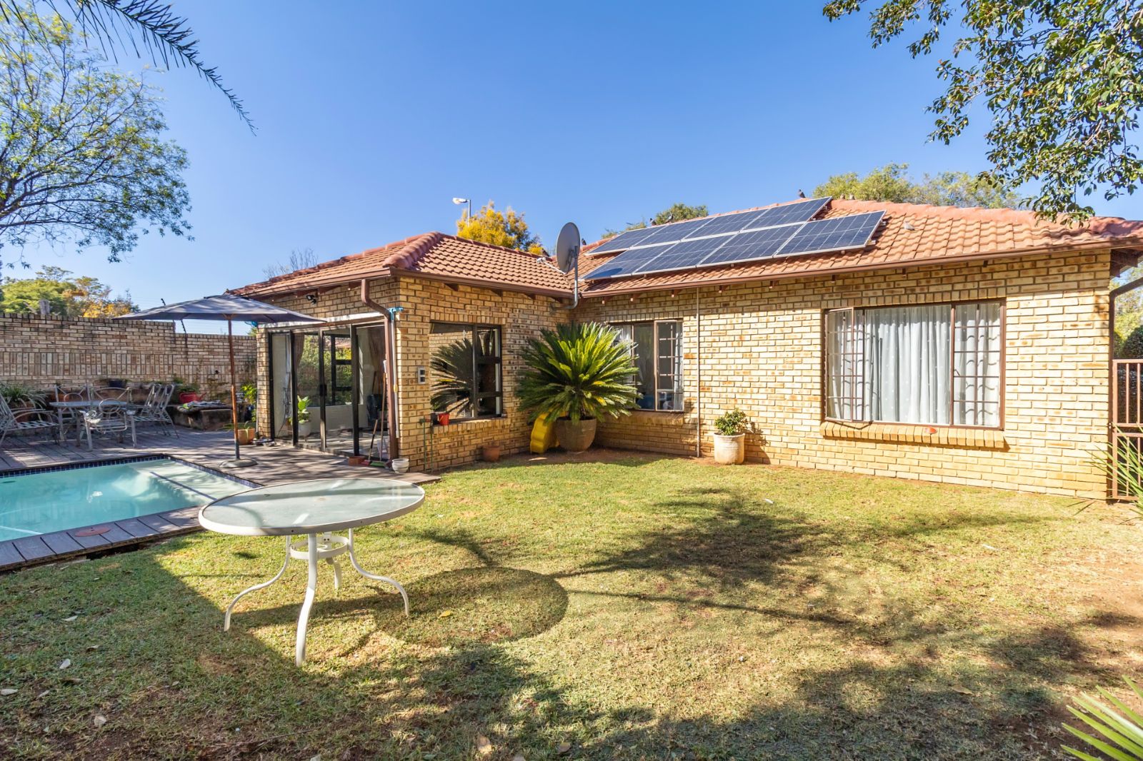 aluminium sliding doors overlooking a nice size garden, a built in braai and a sparkling swimming pool.