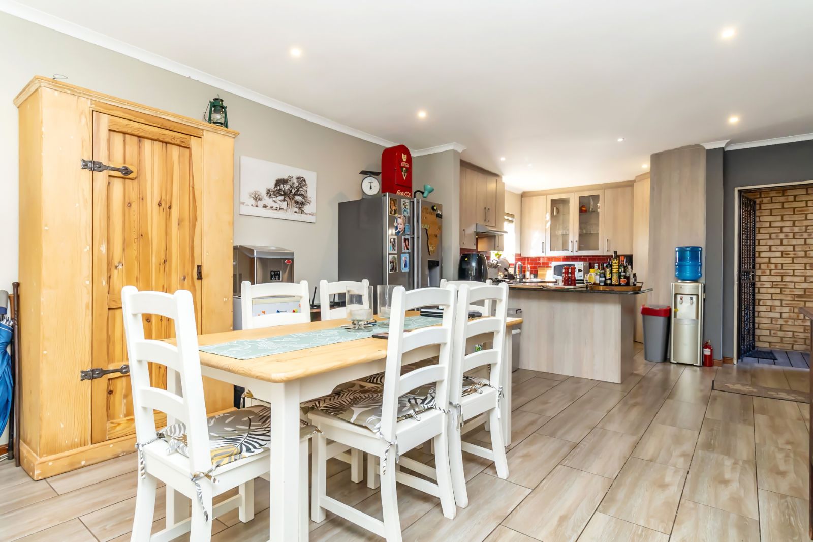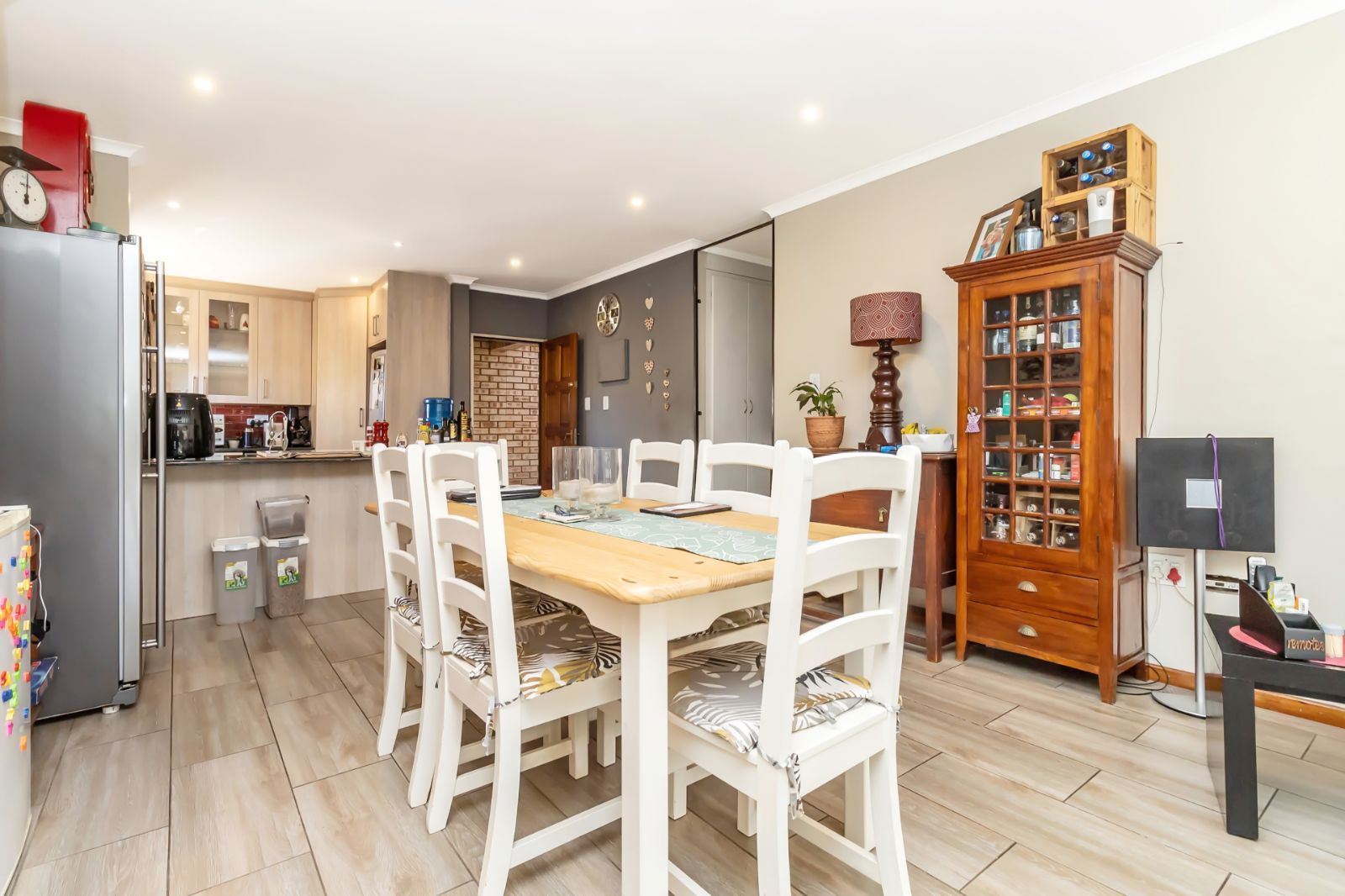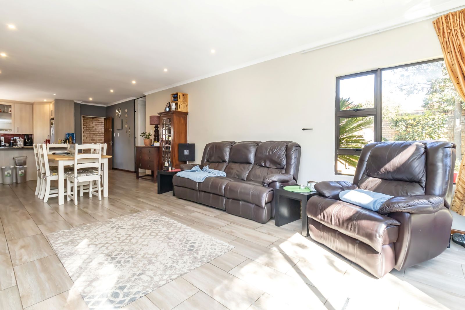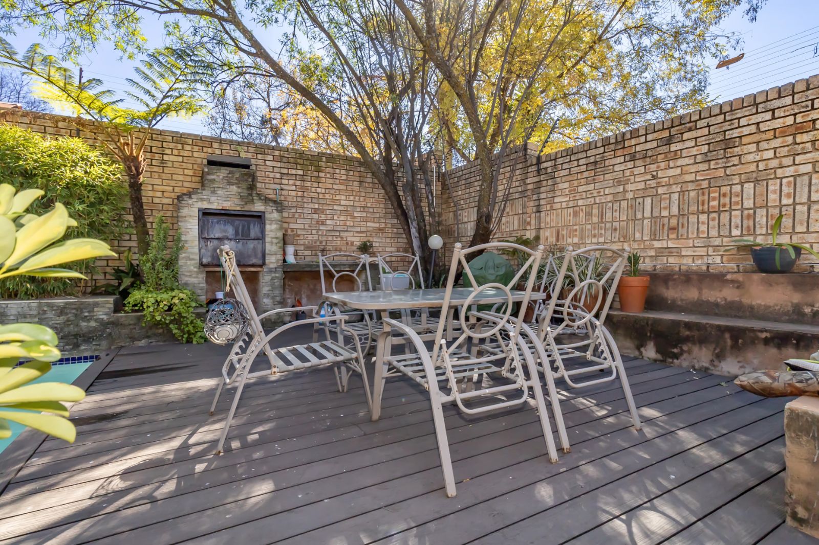aluminium sliding doors overlooking a nice size garden, a built in braai and a sparkling swimming pool.